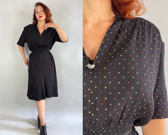 1950s Bavarian Beauty Dress | Vintage 50s Black Green and Red Novelty Hearts & Flowers Cotton Traditional Folk Dirndl w/Puff Sleeves | Small