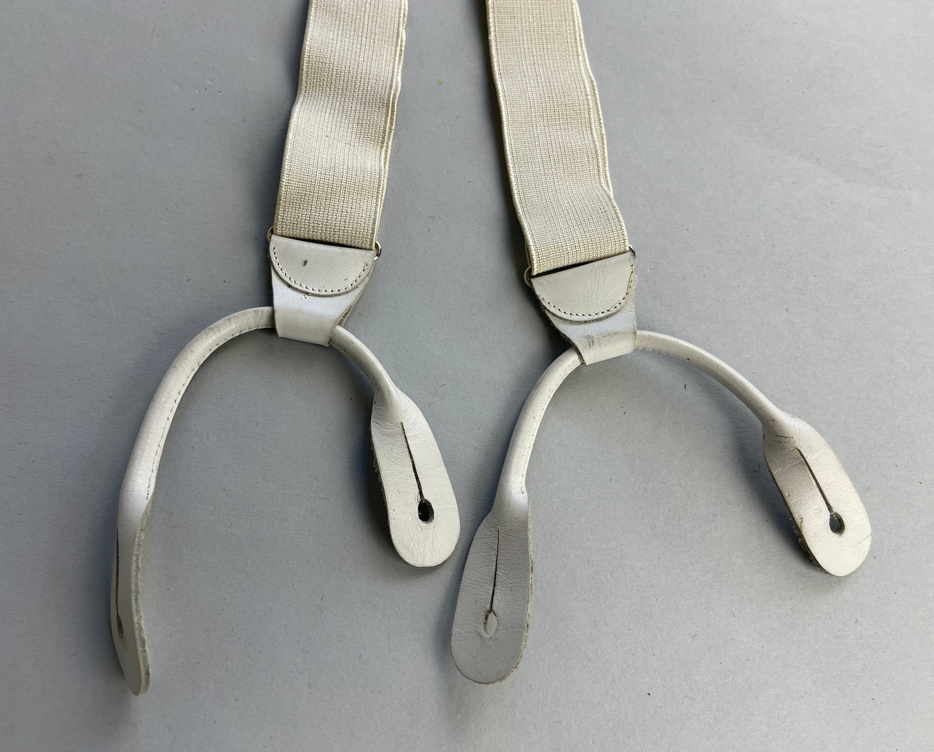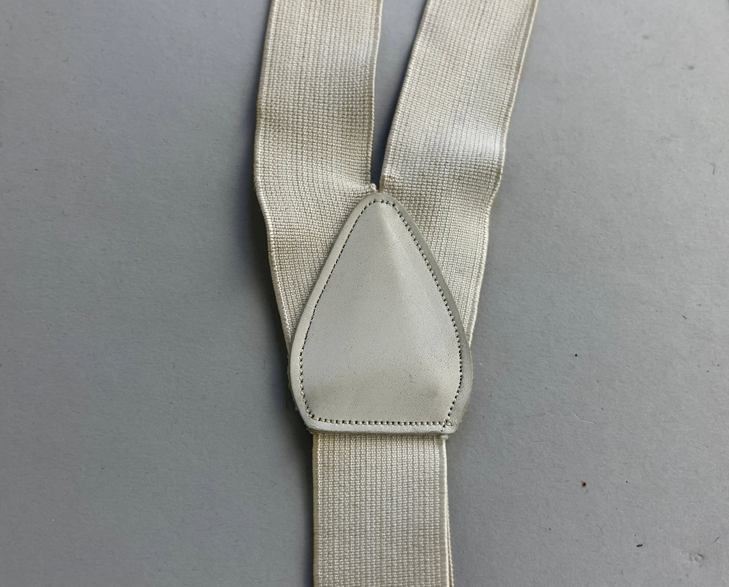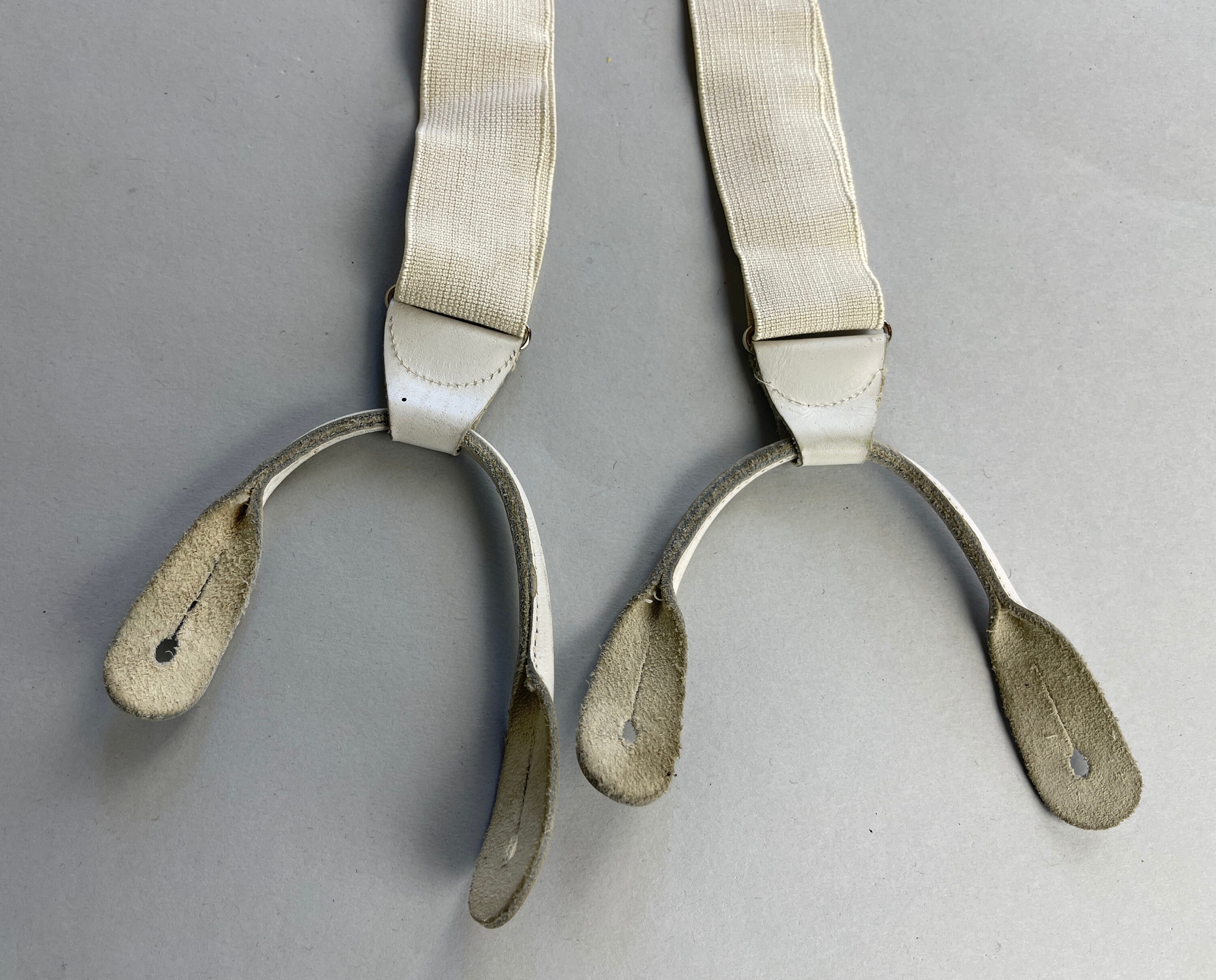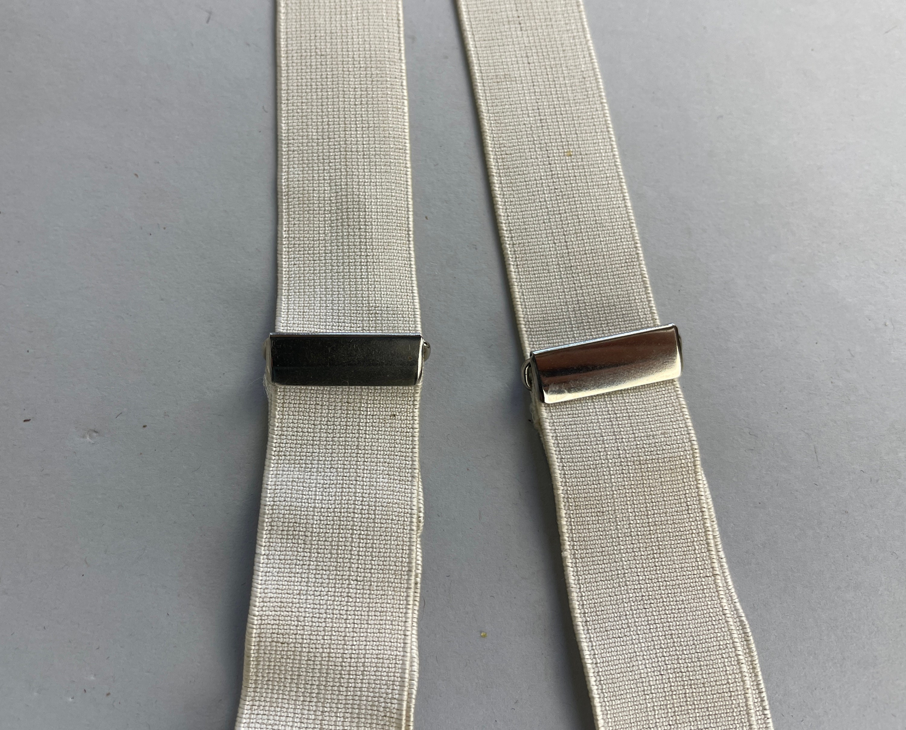 These fabulous 1940’s braces will give you the finished look for your favorite golden era ensemble! Suspenders are made of white elastic, and feature chrome sliders, leather button loops at front and center back fasteners, and Y-back formation with a re-enforced elastic back. These suspenders are in great vintage condition with some light expected wear from age.