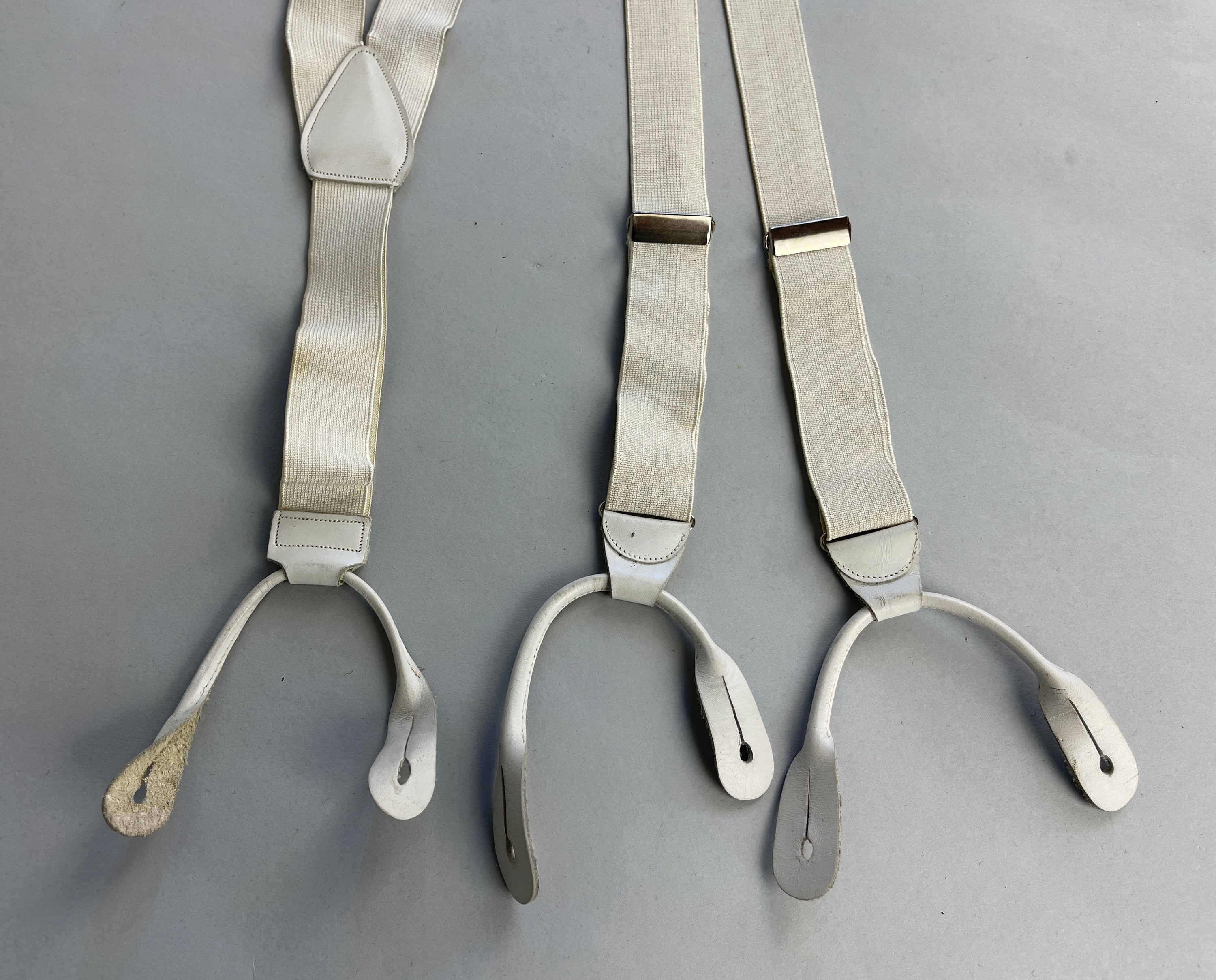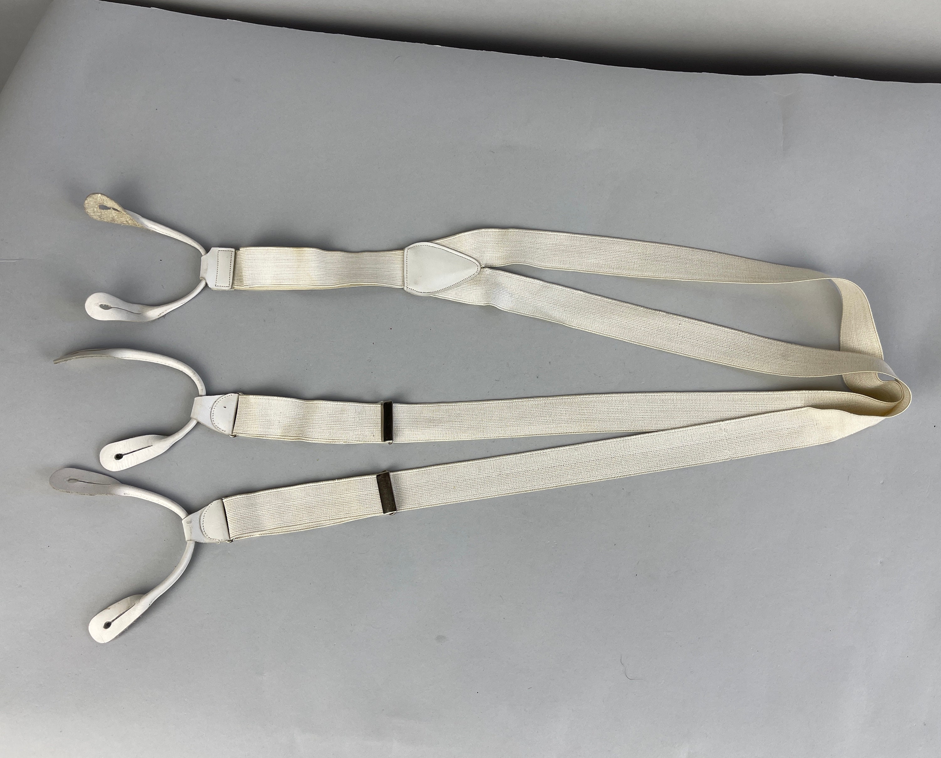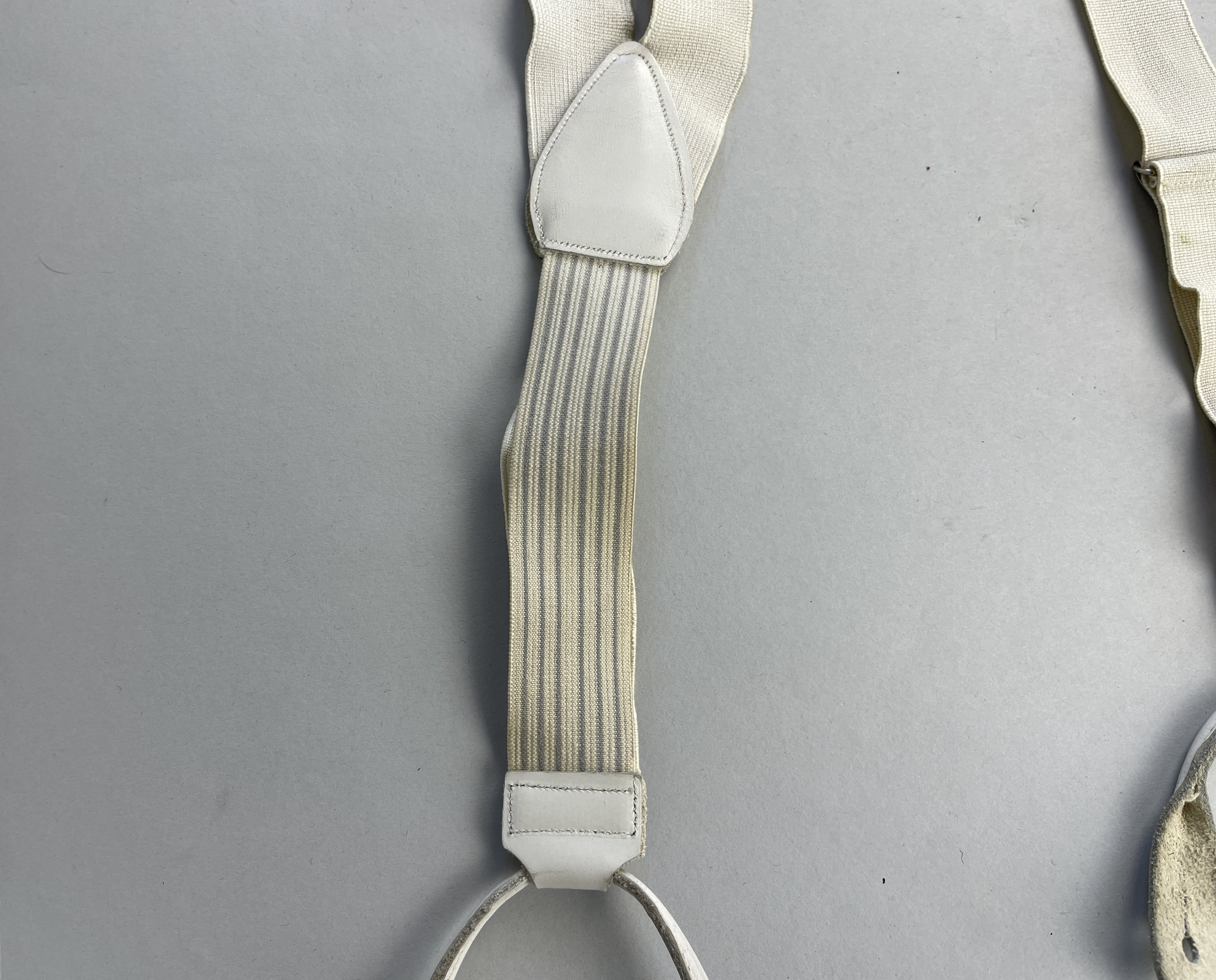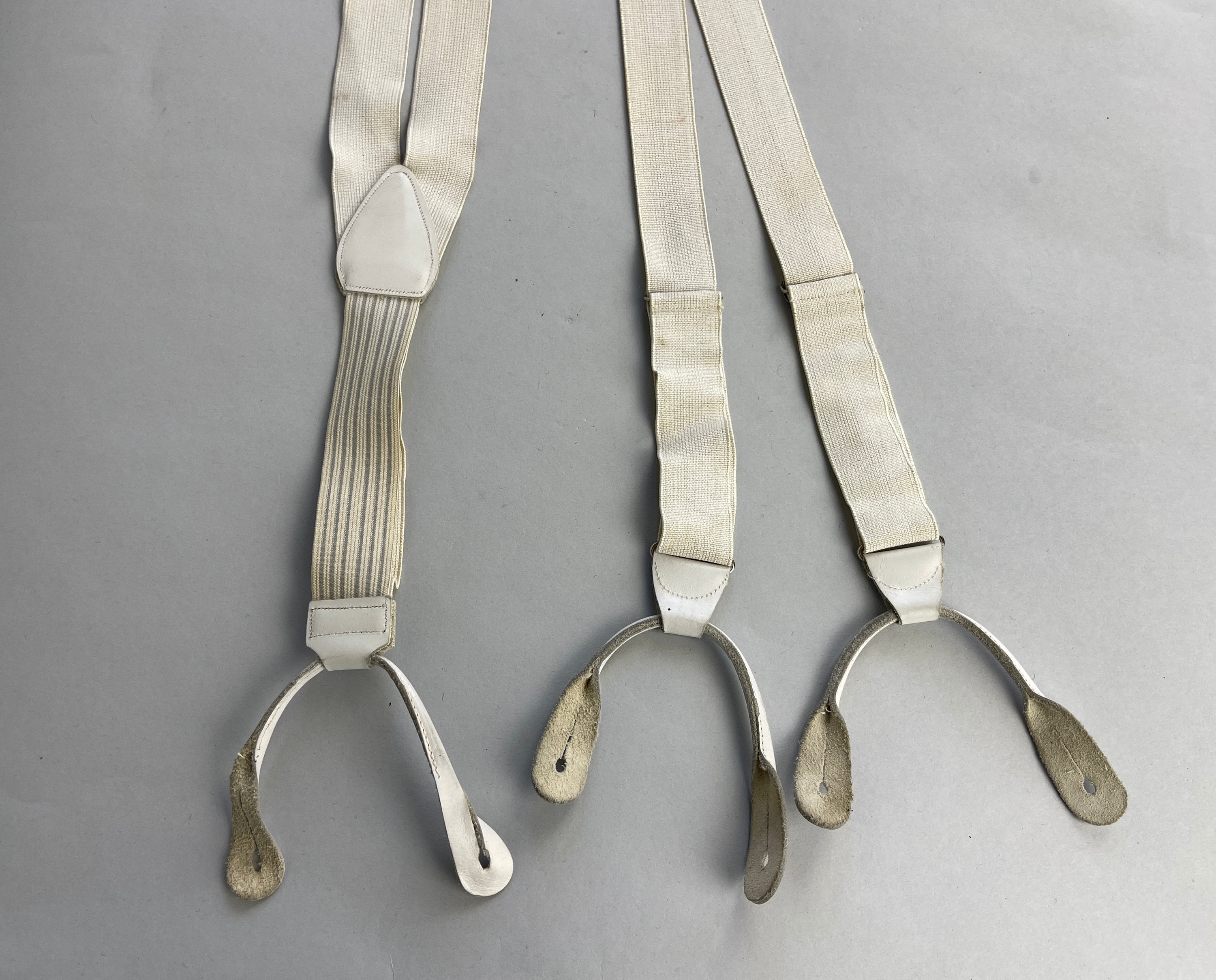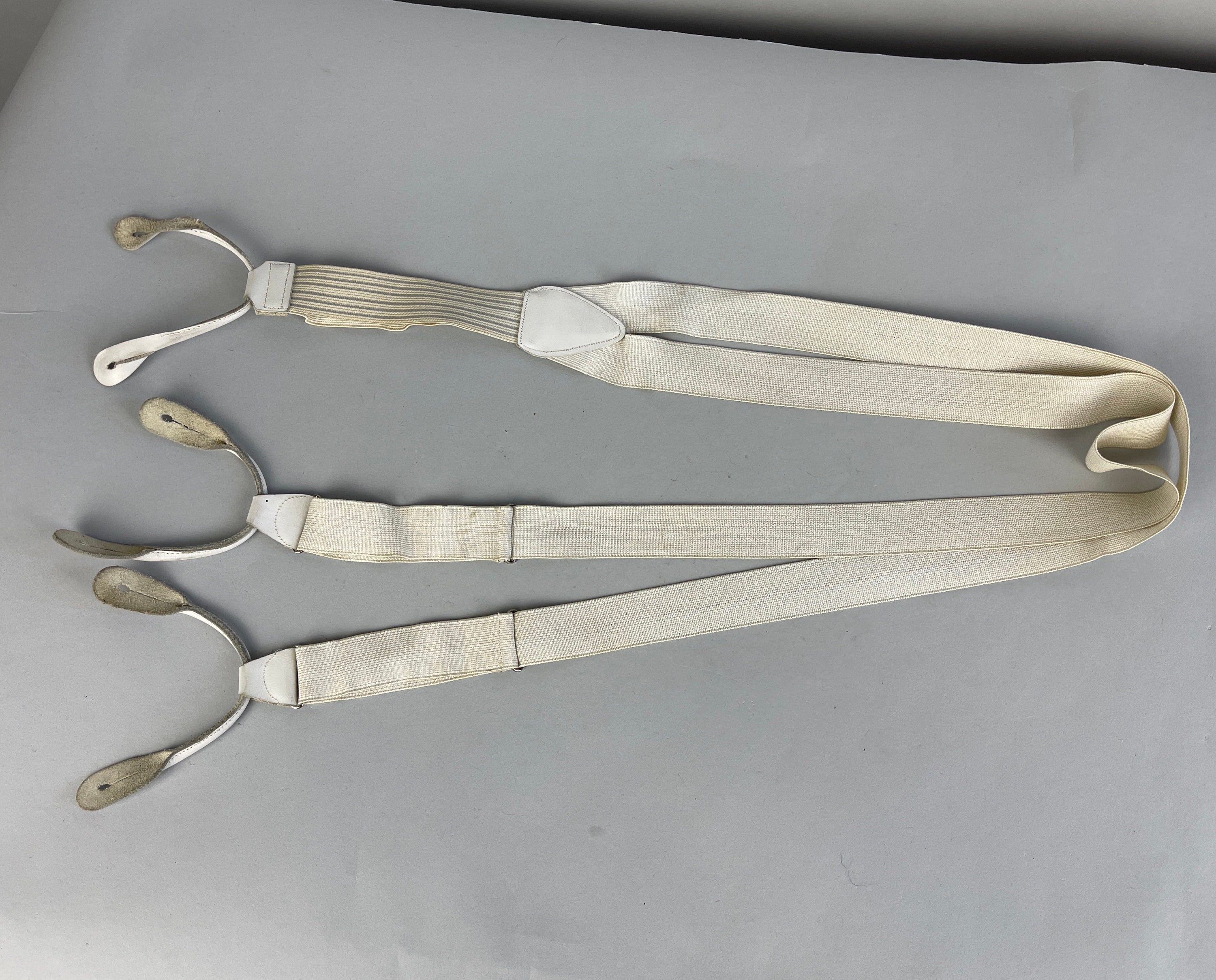 These fabulous 1940’s braces will give you the finished look for your favorite golden era ensemble! Suspenders are made of white elastic, and feature chrome sliders, leather button loops at front and center back fasteners, and Y-back formation with a re-enforced elastic back. These suspenders are in great vintage condition with some light expected wear from age.