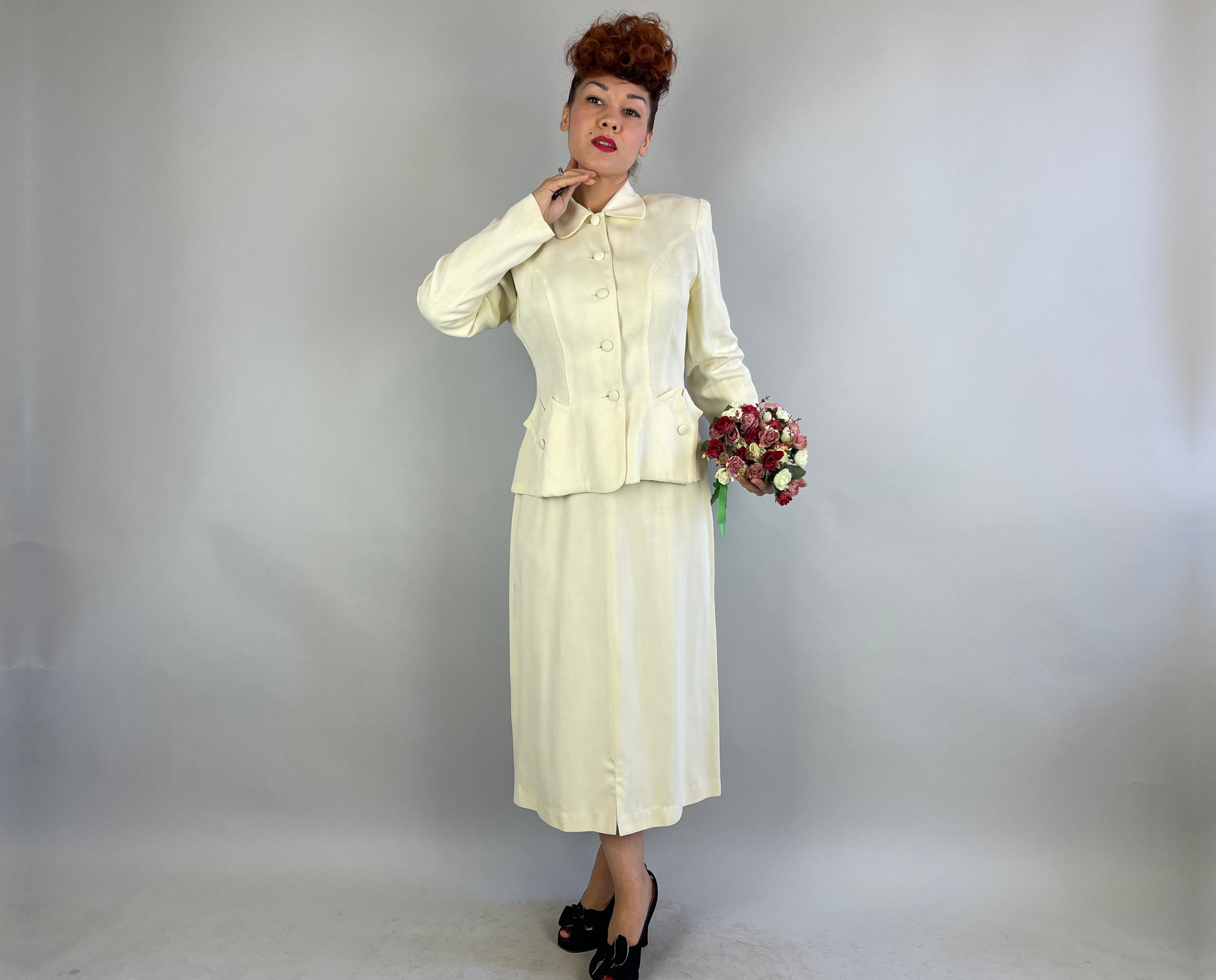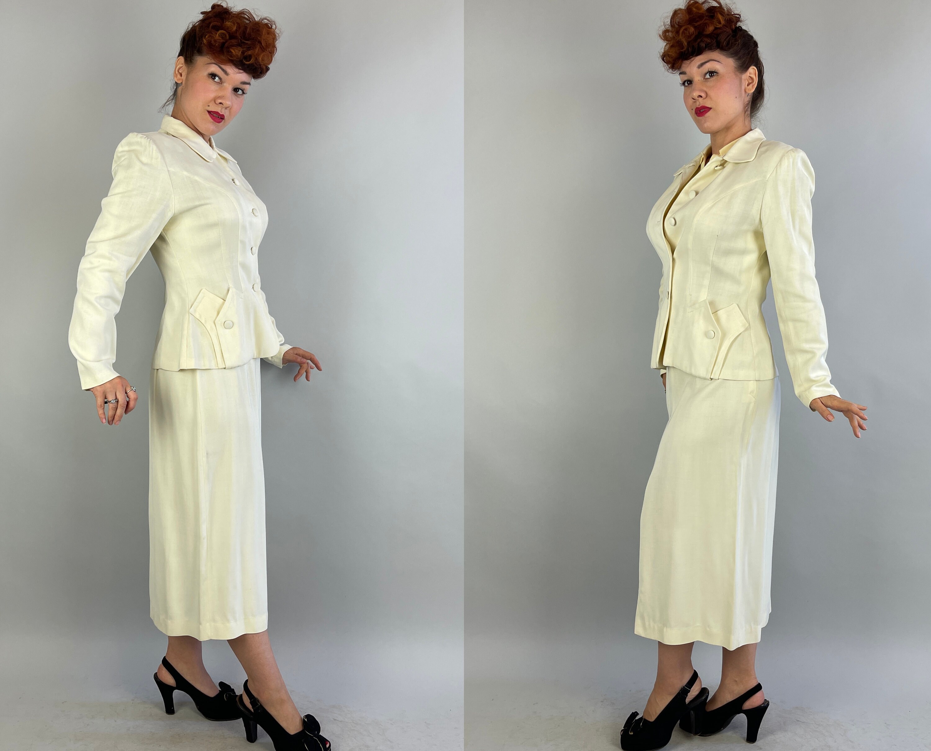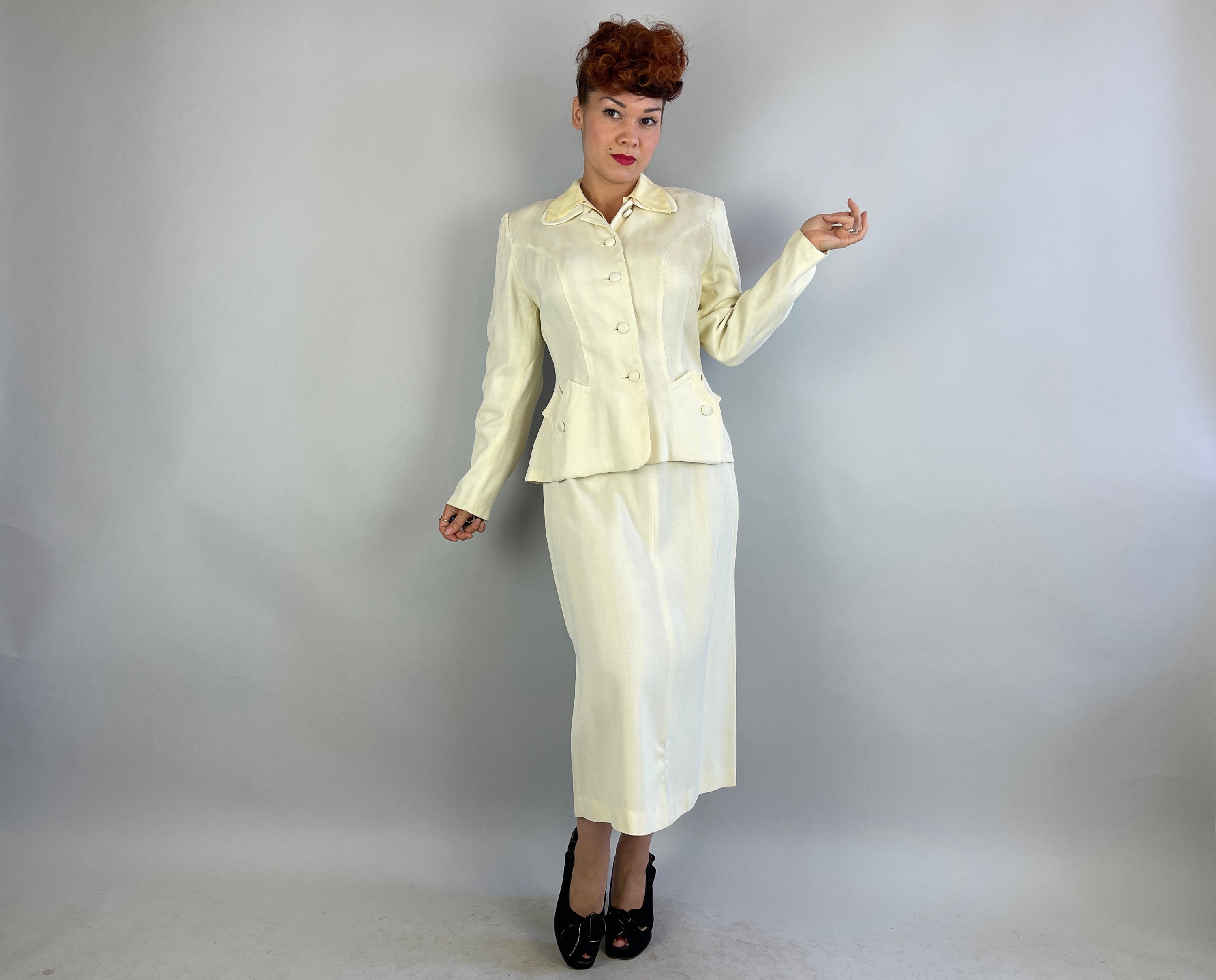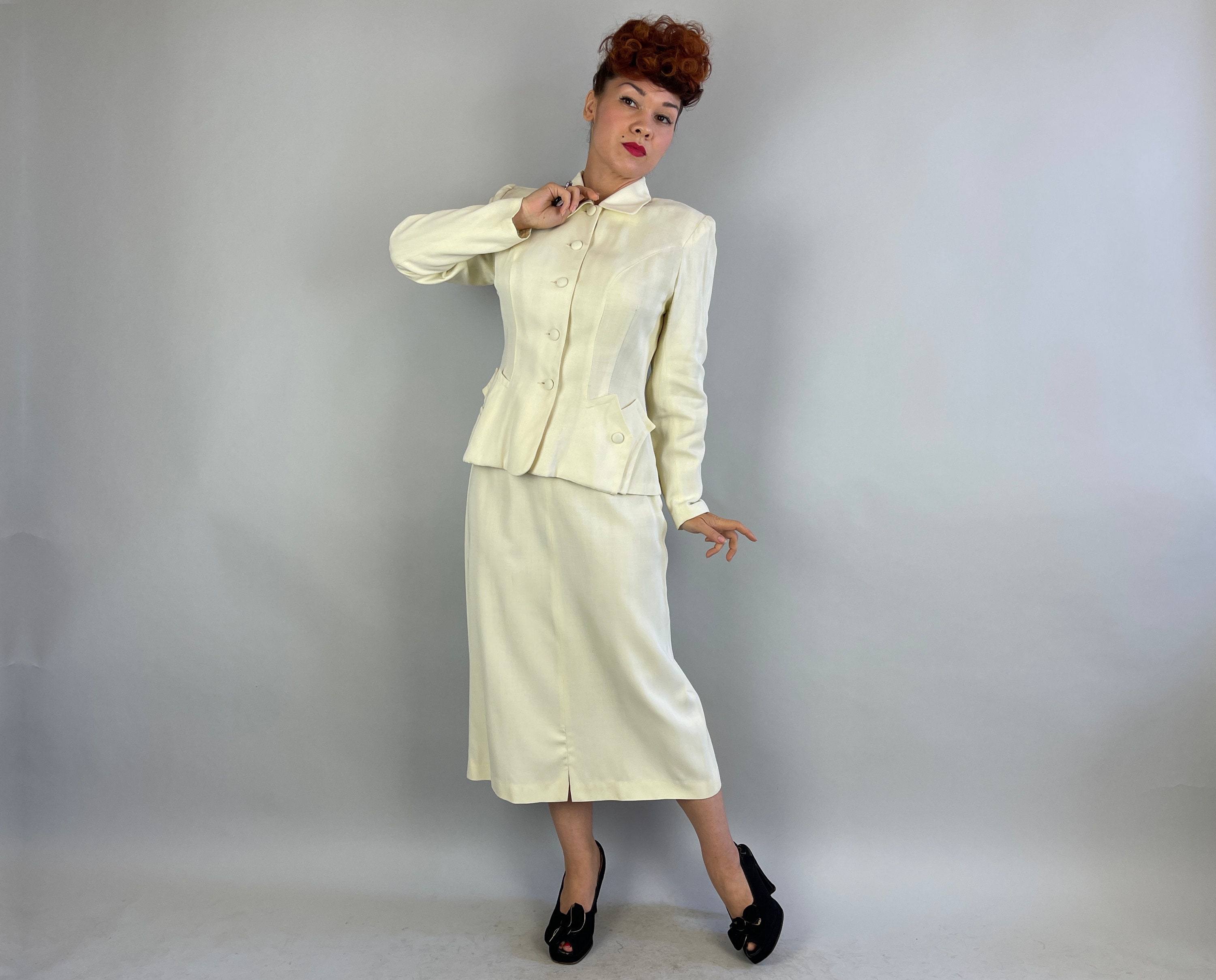 You'll make a smart statement in this classic 1940’s suit! Made of cream white wool in a summer weight and both pieces are unlined. The jacket features a rounded collar, self fabric buttons, padded and gathered shoulders, elegant seaming, and pockets created by layered peaks. The straight cut skirt has a petite front slit and metal zipper on the side. This suit is in great vintage condition, with no stains, holes, or odors to note.