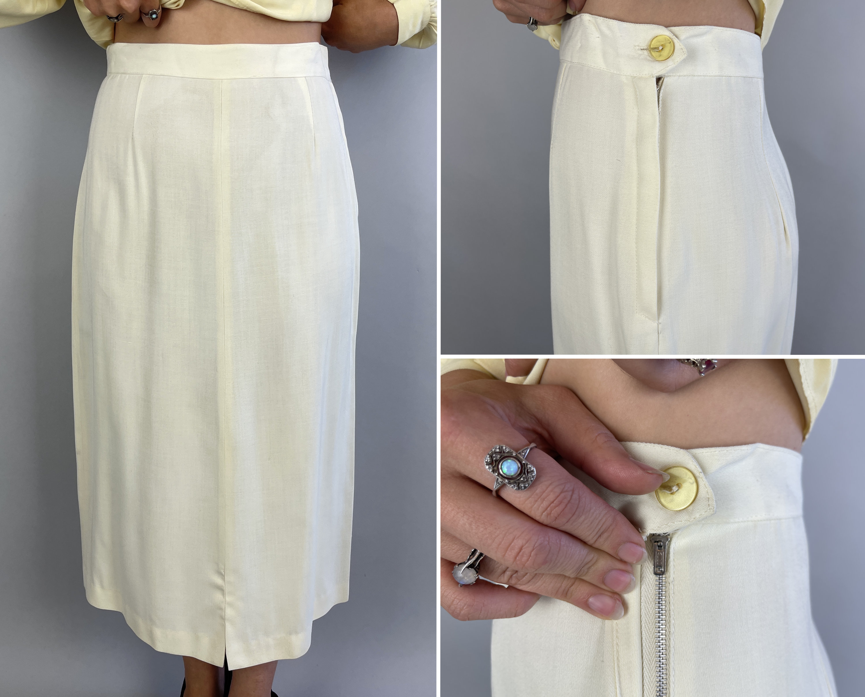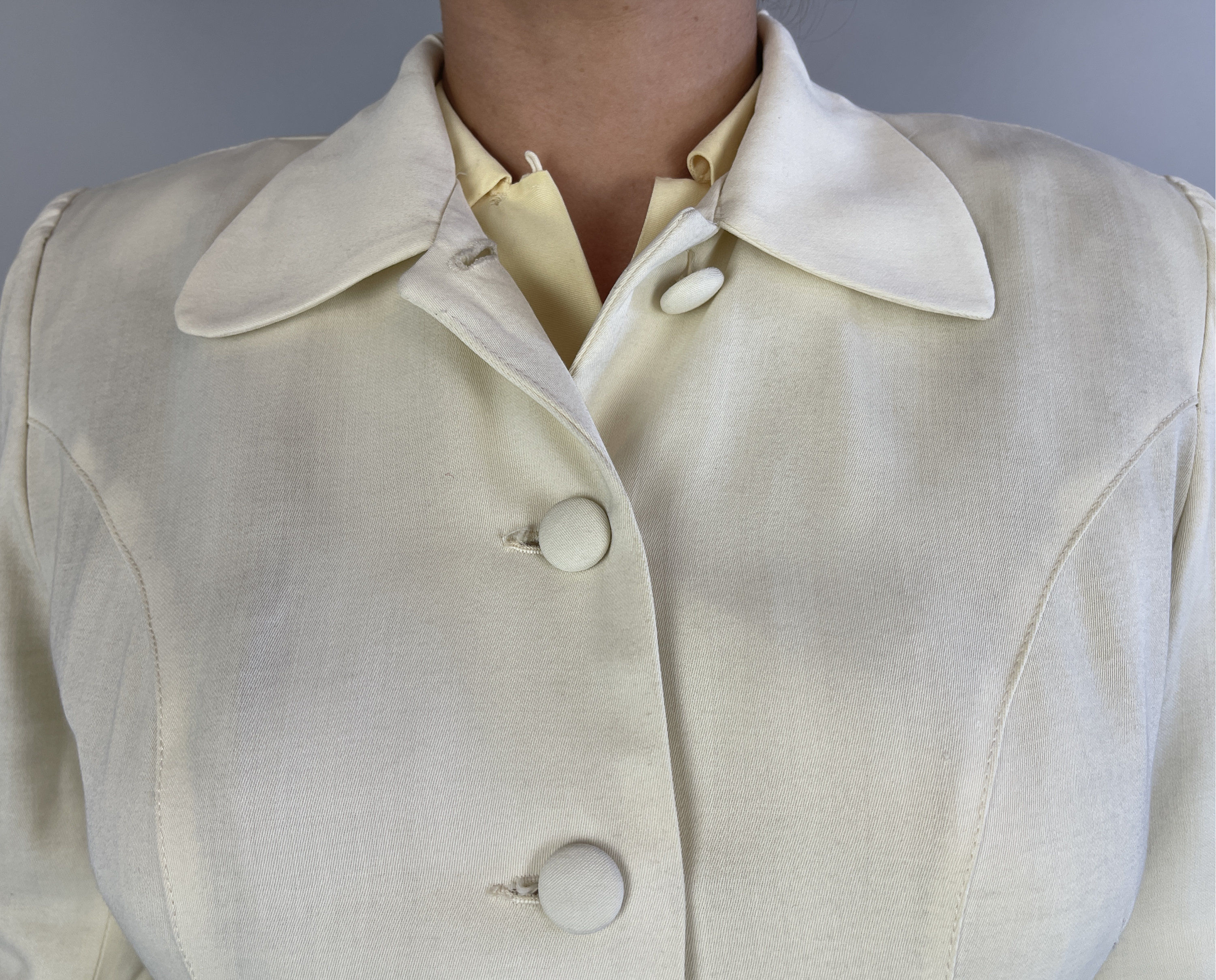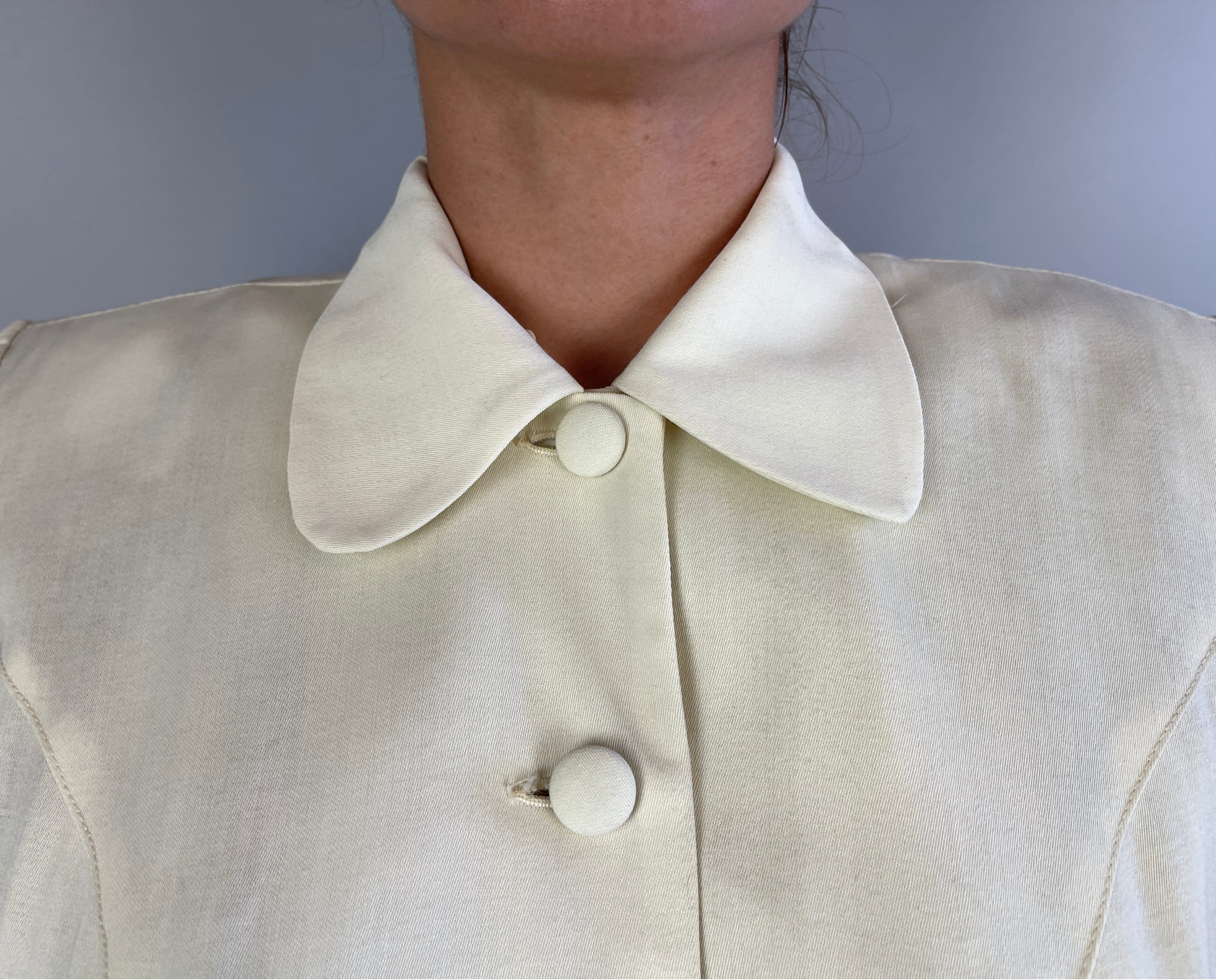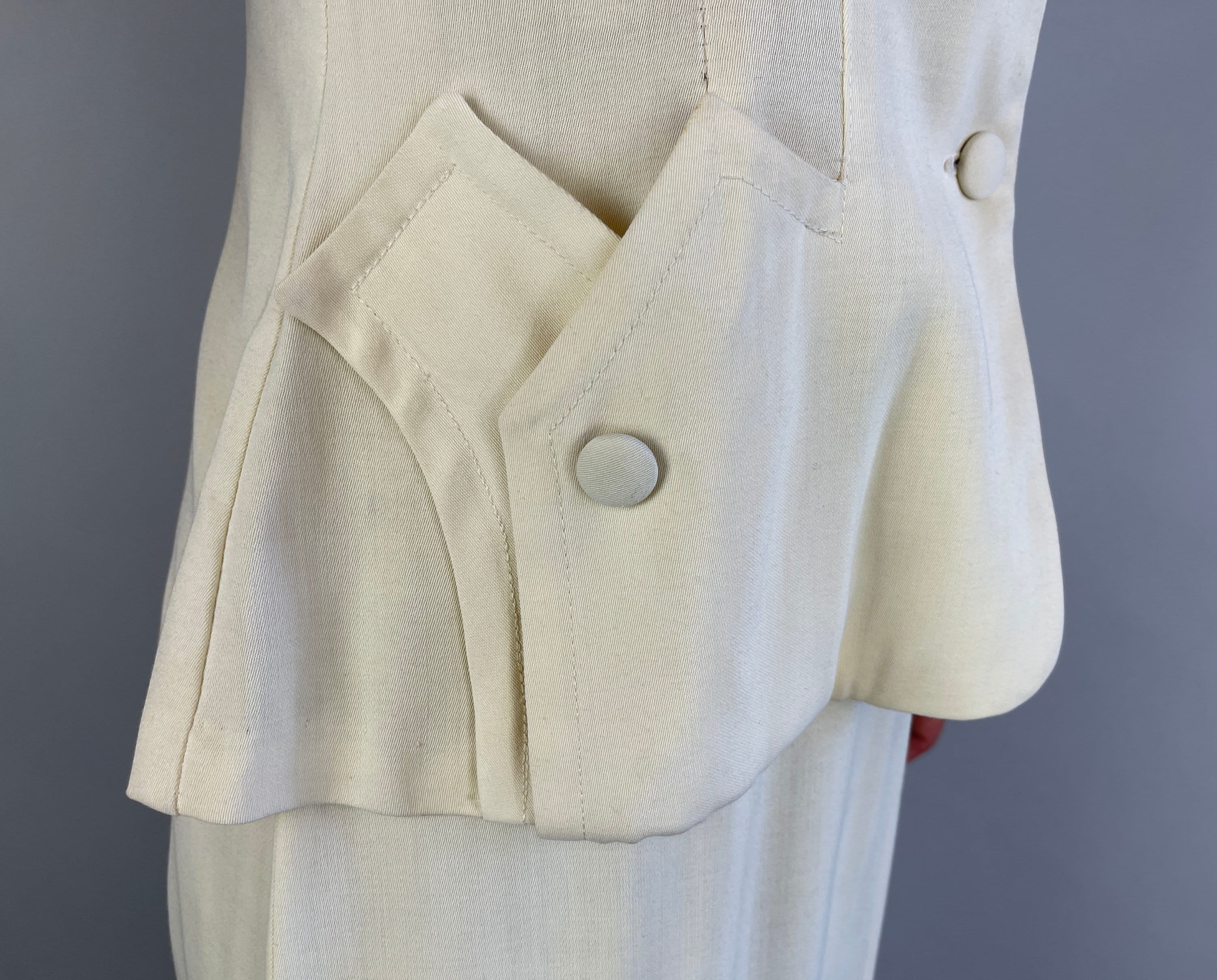 You'll make a smart statement in this classic 1940’s suit! Made of cream white wool in a summer weight and both pieces are unlined. The jacket features a rounded collar, self fabric buttons, padded and gathered shoulders, elegant seaming, and pockets created by layered peaks. The straight cut skirt has a petite front slit and metal zipper on the side. This suit is in great vintage condition, with no stains, holes, or odors to note.