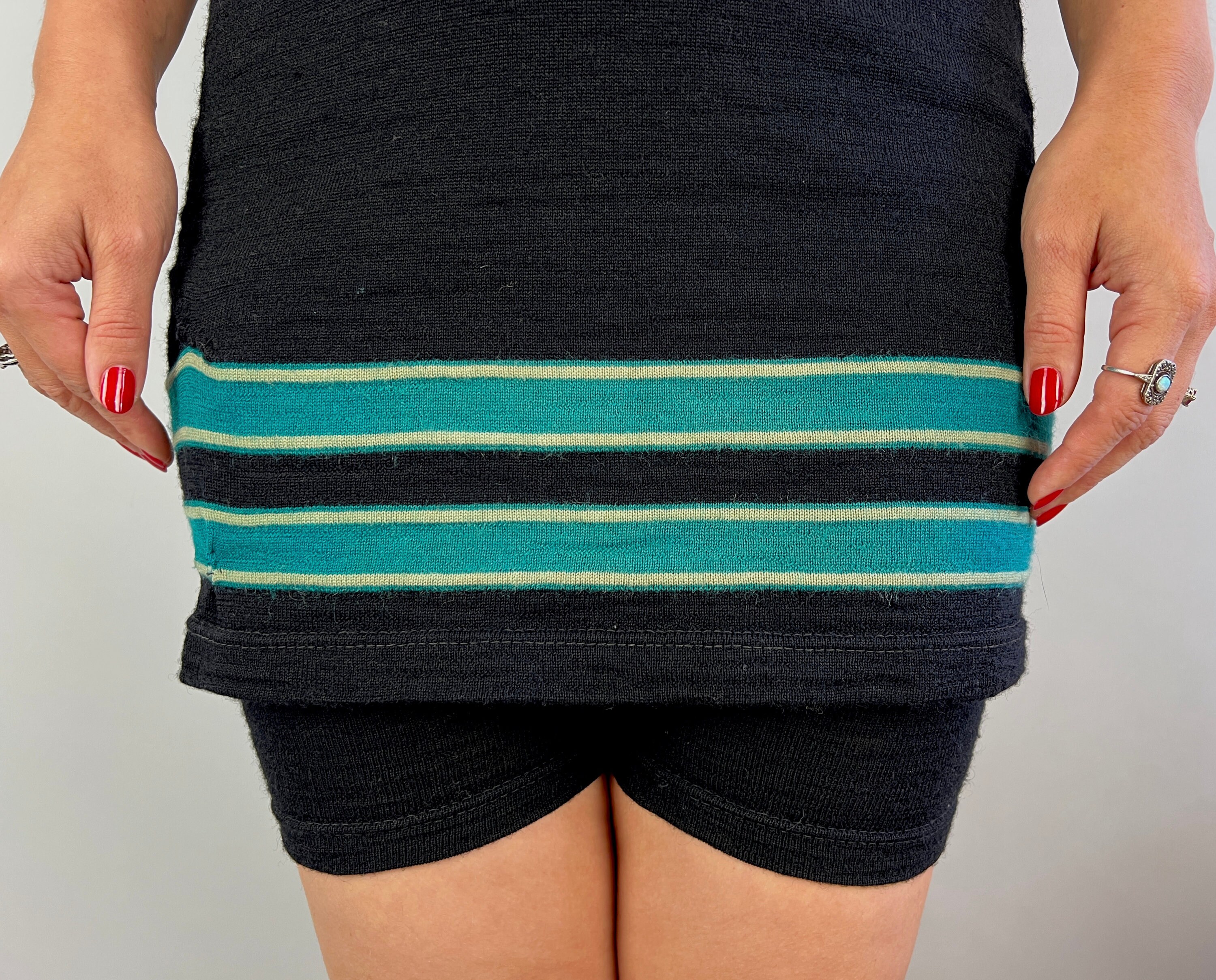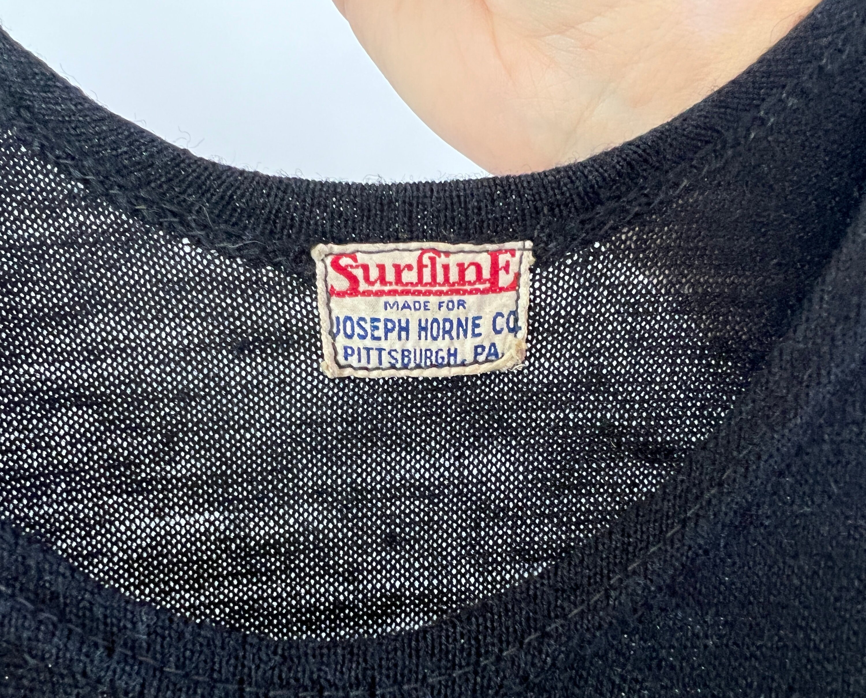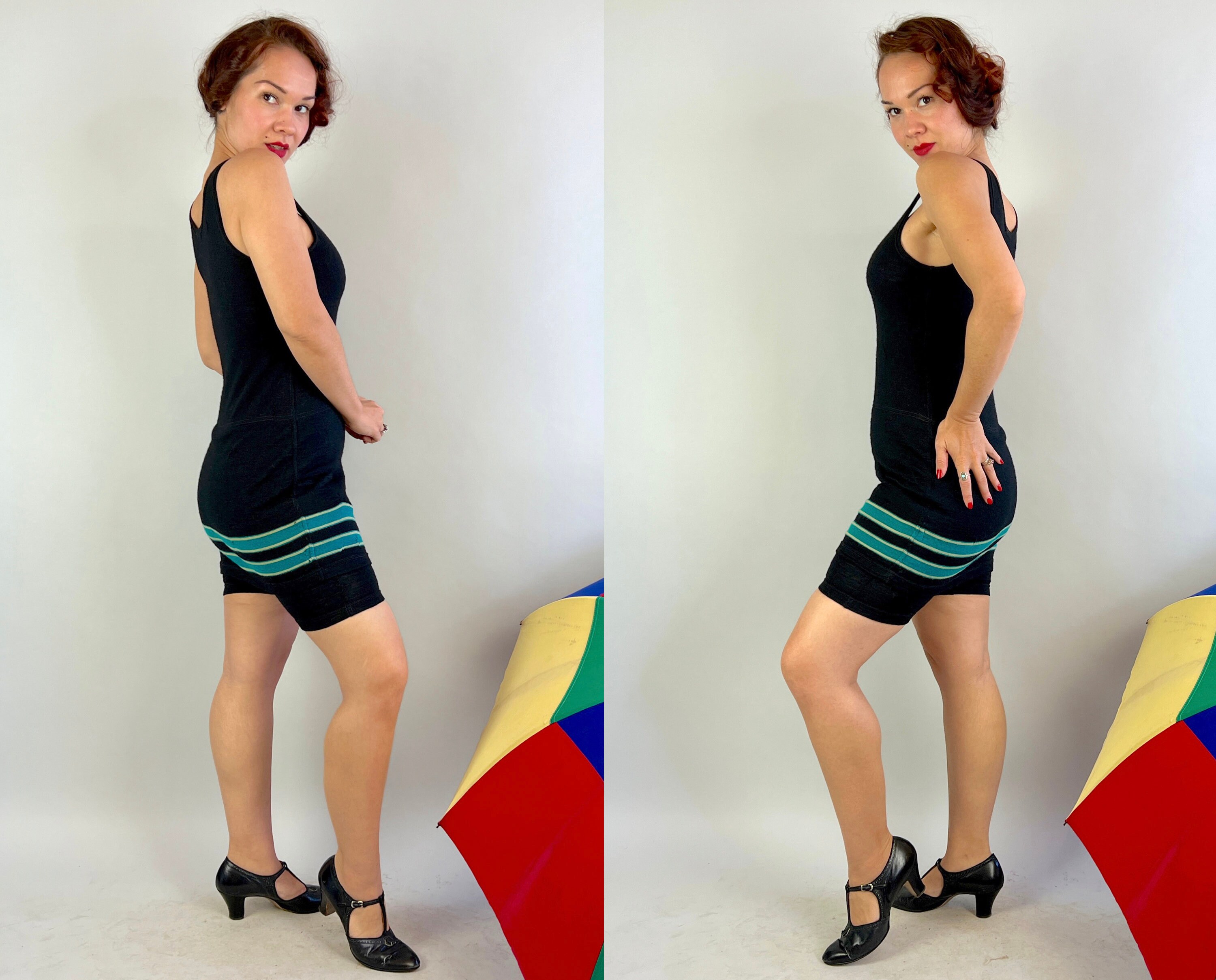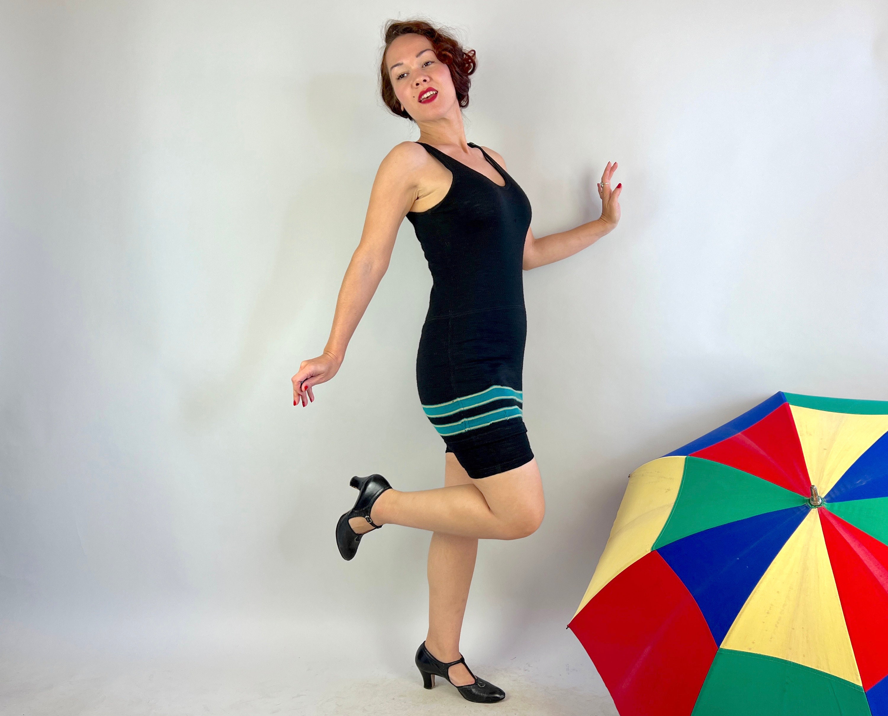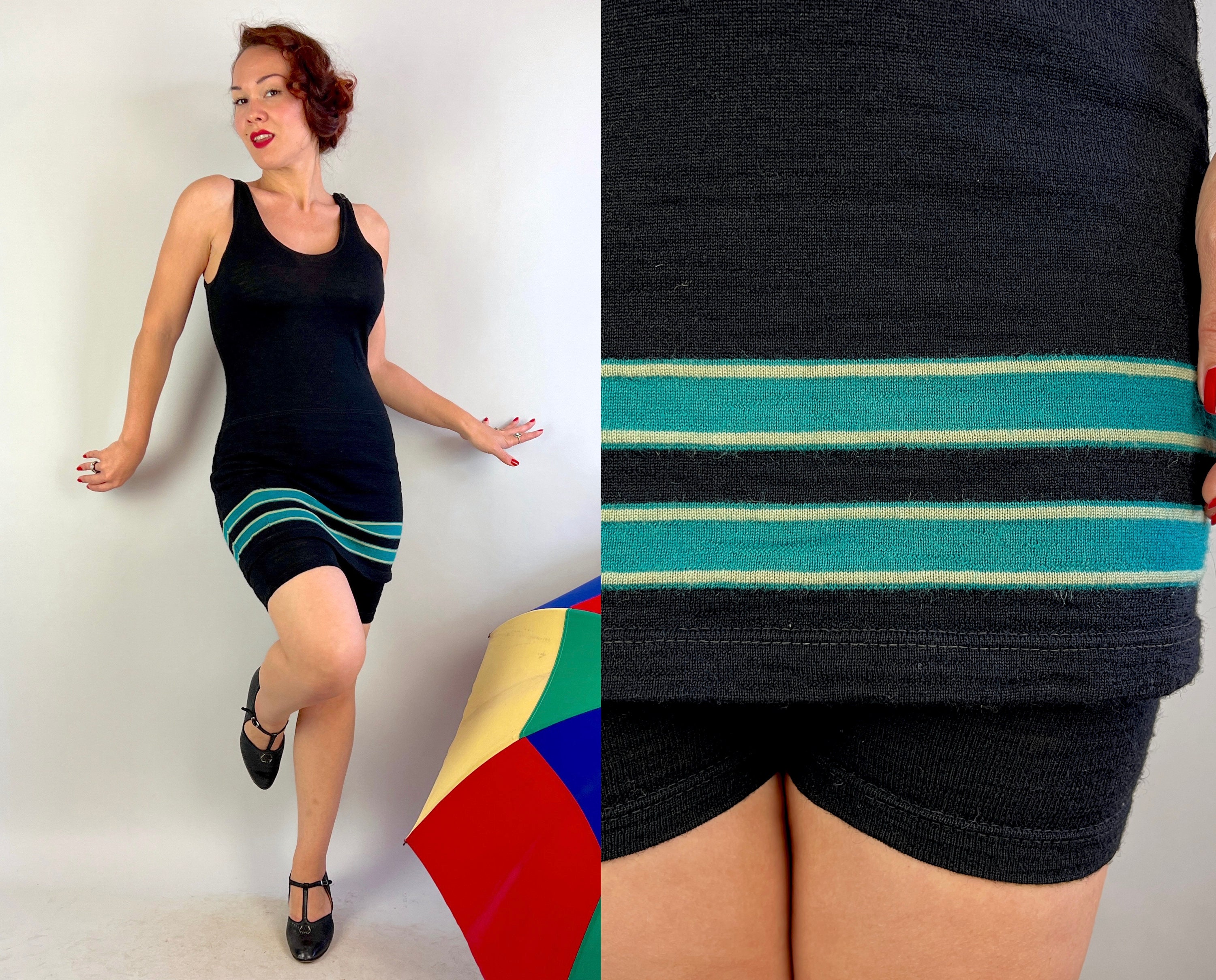 Be a bewitching bathing beauty in this 1920s one piece bathing suit! Classic black wool with horizontal teal and white stripes along the skirt. Featuring classic details such as the button closure over the left shoulder and shorts underneath with a button flap pocket! By "Surfline for Joseph Horne" in Pittsburgh, PA. This swimsuit is in great vintage condition, with a few subtle period mends and two small marks on the back but no holes or odors to note.