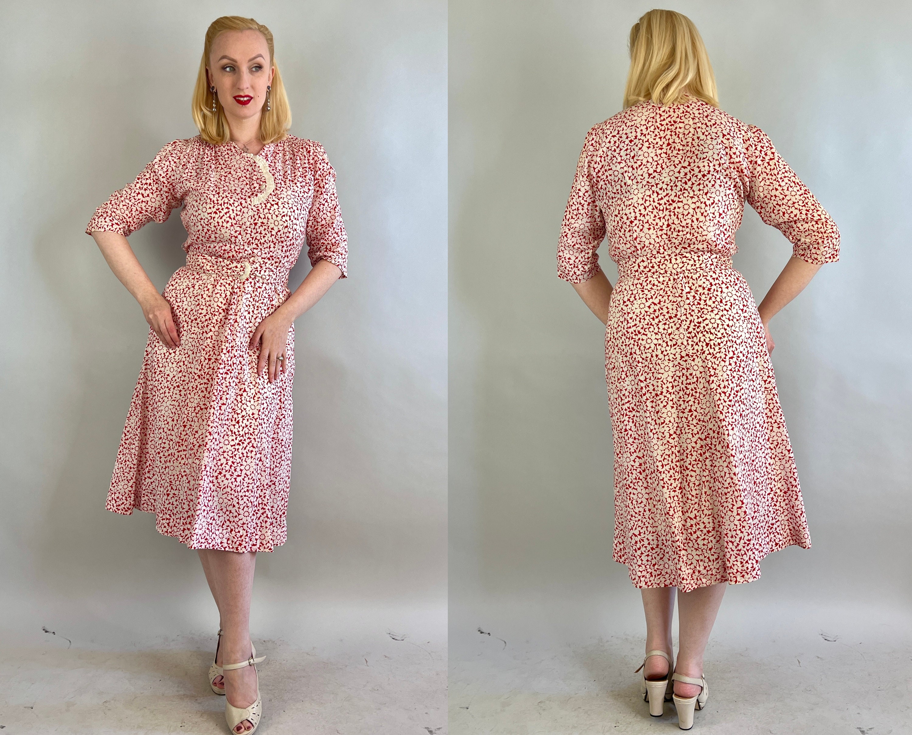 This is a fabulous vintage 30s frock for frolicking in the flowers! Made of a soft lightweight cotton with an allover abstract floral print in white and candy apple red. There is a cute white ruffle and button detail at the front neckline and small gathers at the shoulders, plus a matching fabric belt with white buckle. Closes up the side with metal snaps. This dress is in great vintage condition, with no holes, stains, odors to note.