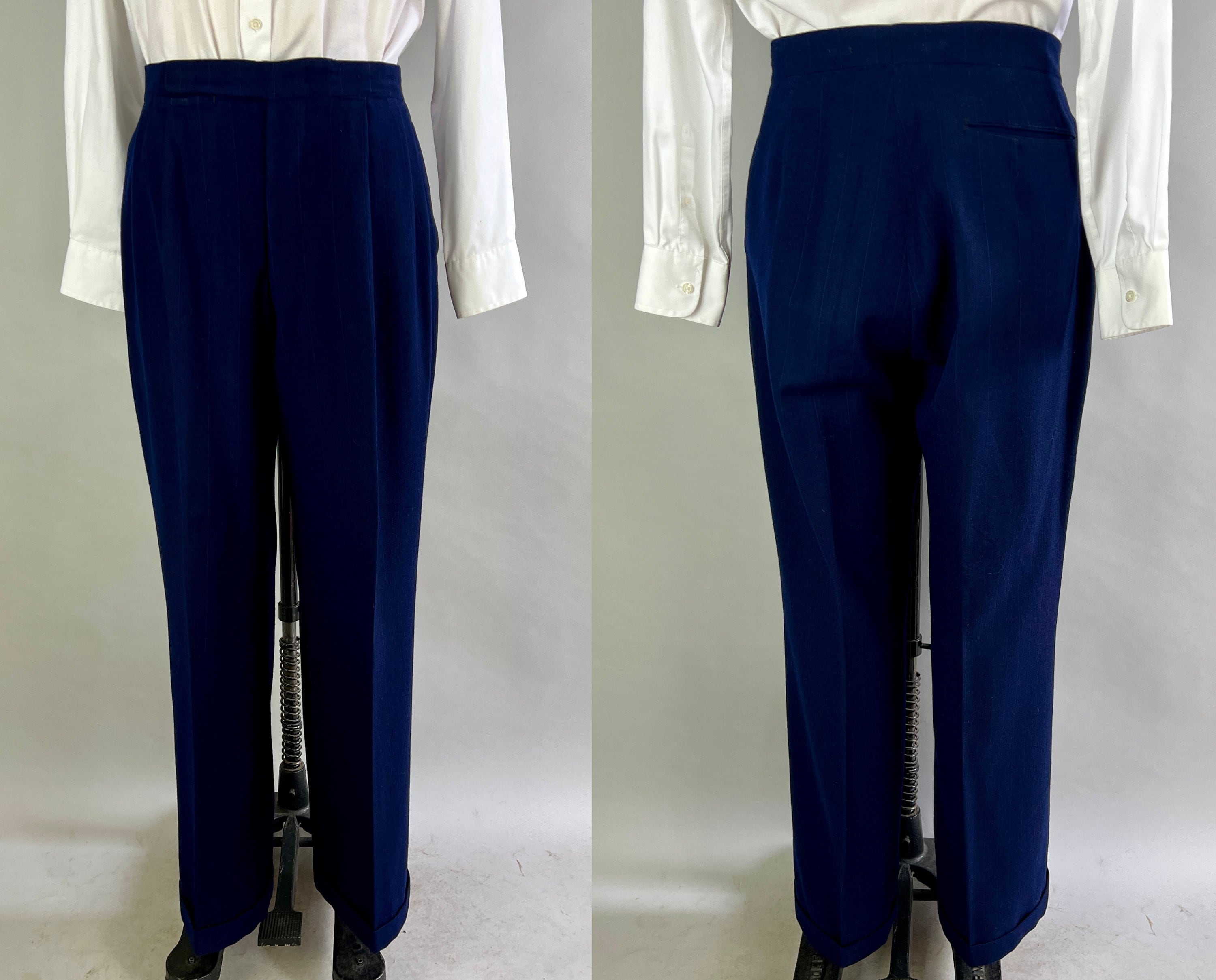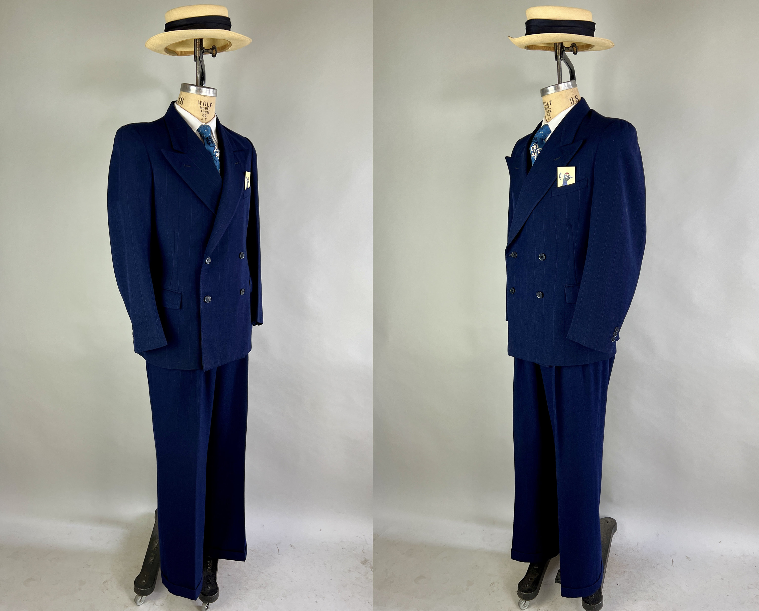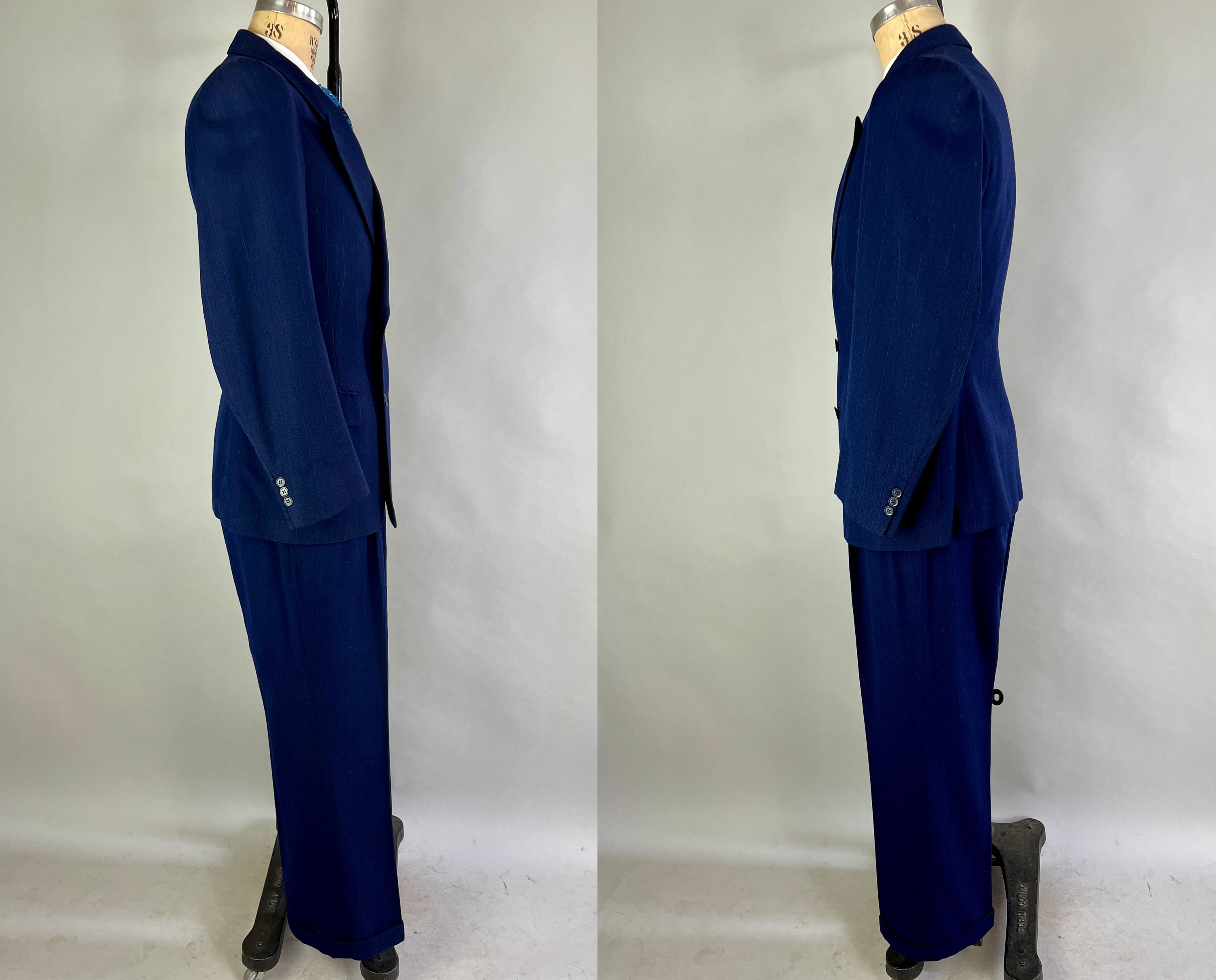 Look like a success in this fabulous suit dated March 30 1950! This double breasted midnight blue wool suit has navy and electric blue pinstripes for a sleek professional look. The jacket features peak lapels, double breasted closure, padded shoulders, ventless back, full lining, one inner pocket, flap hip pockets, and a welted chest pocket. The waistcoat has four welted pockets, five button closure, and back adjuster. The matching trousers have a pleated front, four welted pockets, inner suspenders buttons, cuffed hems, and button fly. From "Schneideman & Sons". This suit is in great vintage condition, with no holes, stains, odors to note.
