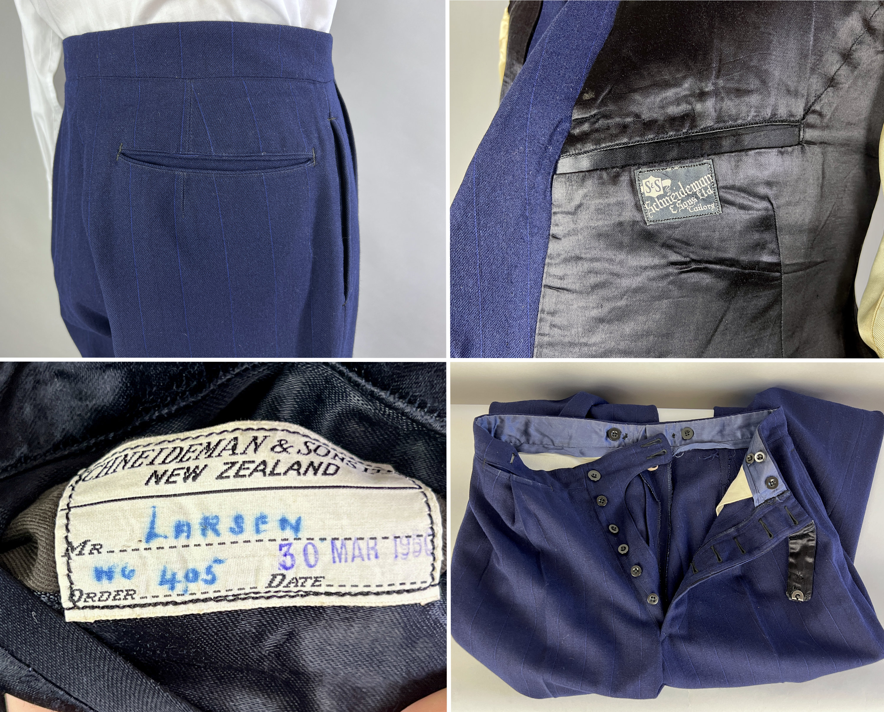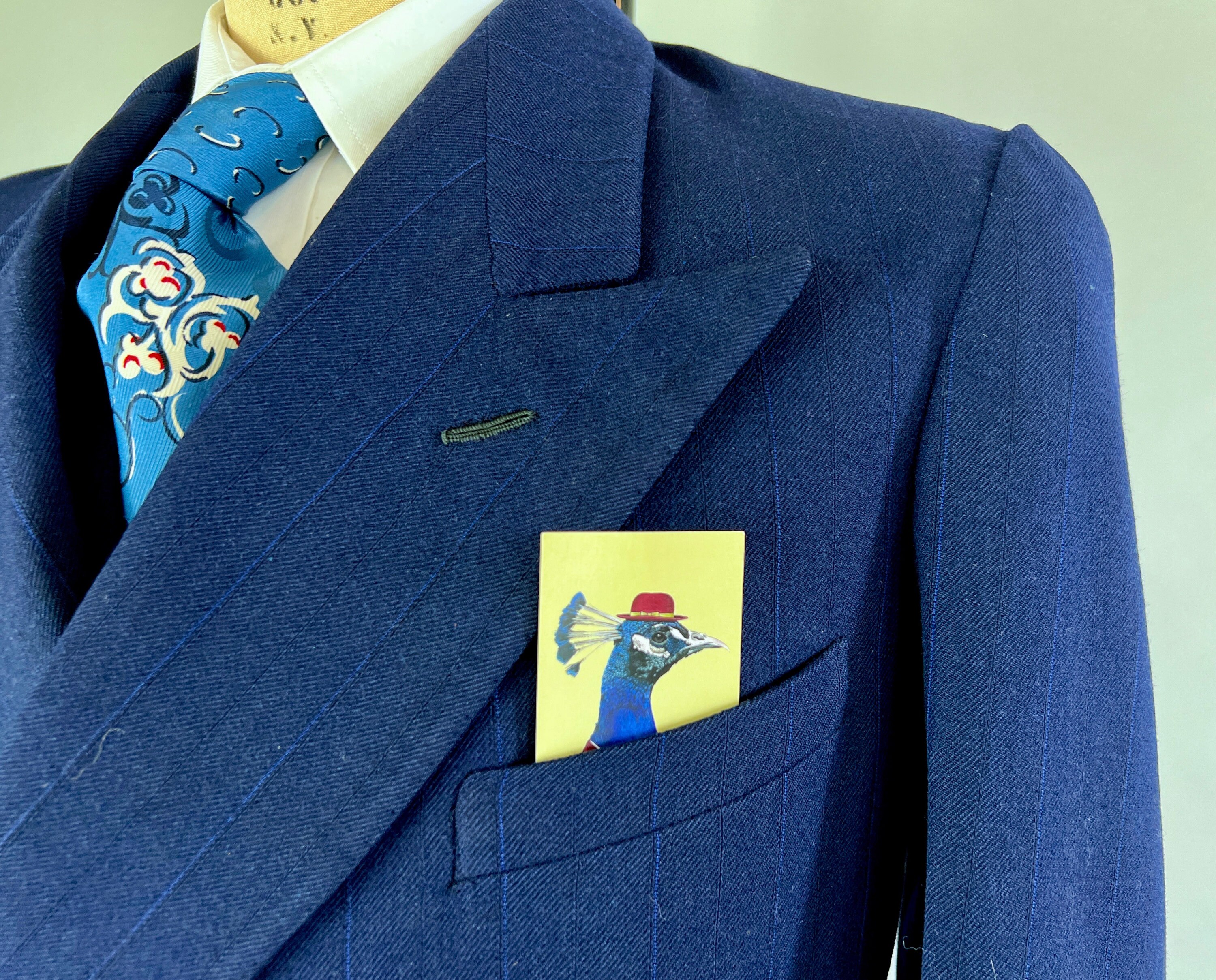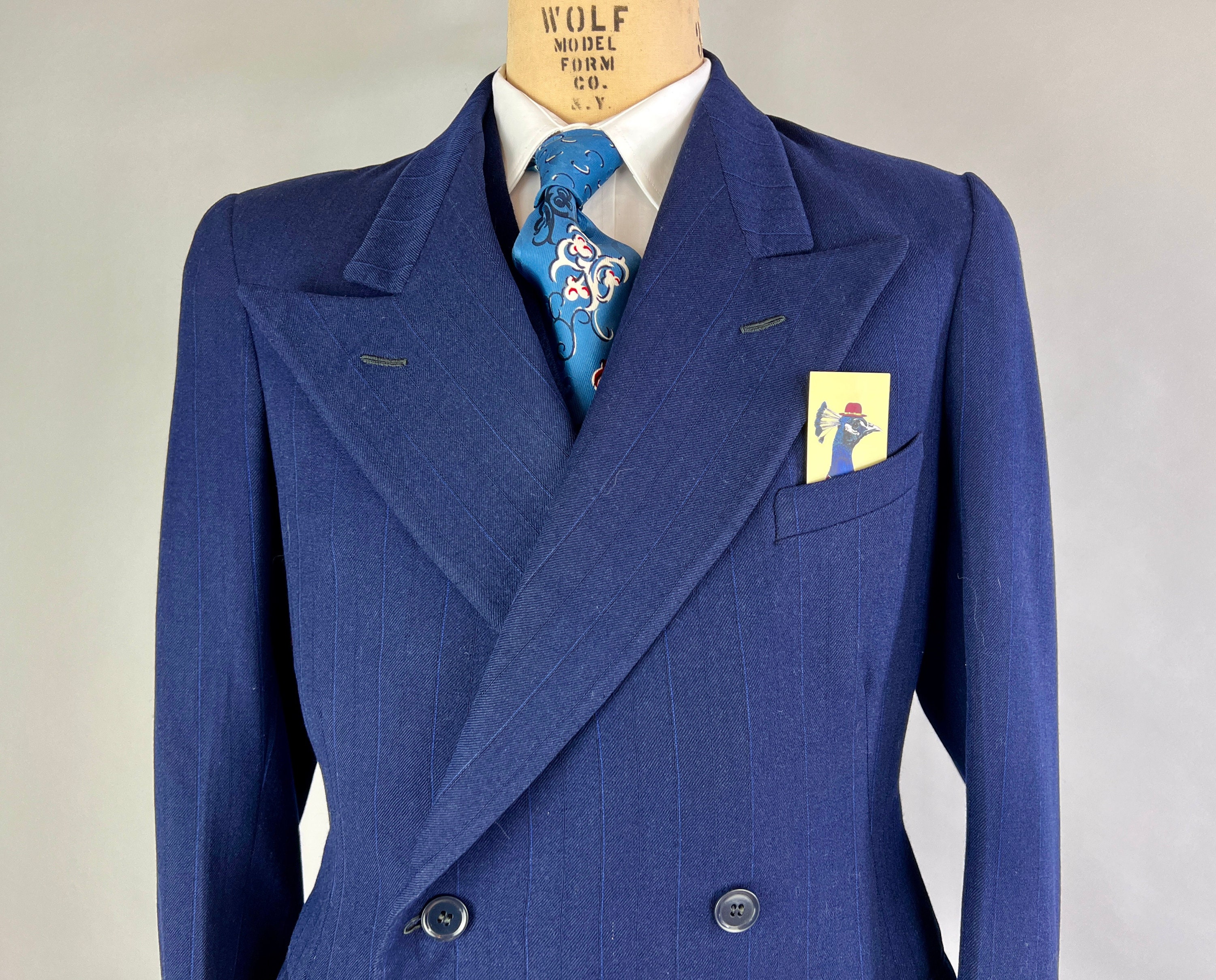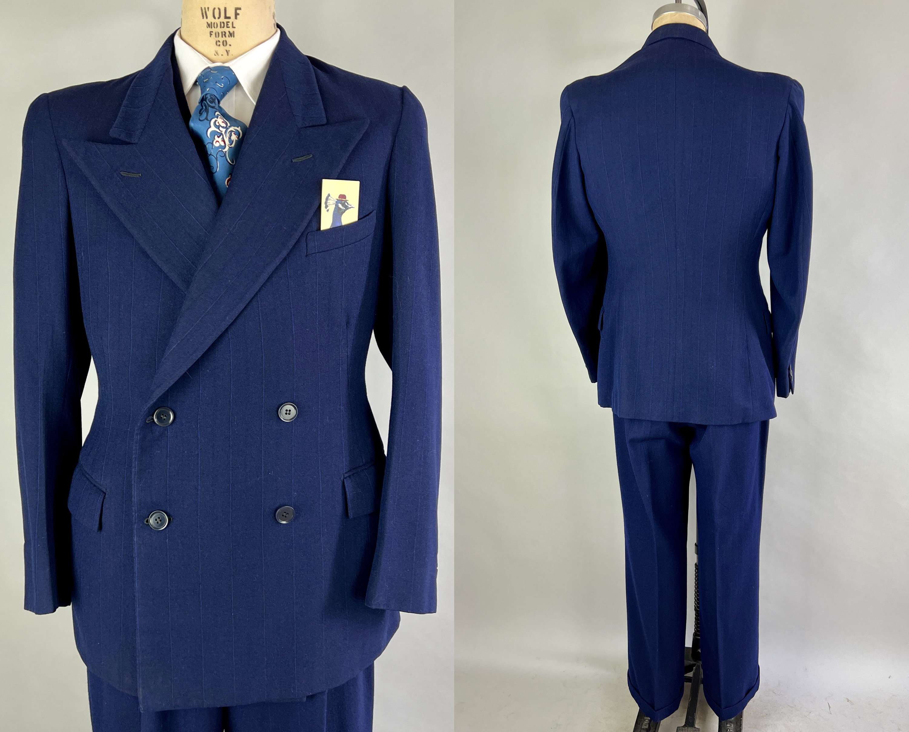 Look like a success in this fabulous suit dated March 30 1950! This double breasted midnight blue wool suit has navy and electric blue pinstripes for a sleek professional look. The jacket features peak lapels, double breasted closure, padded shoulders, ventless back, full lining, one inner pocket, flap hip pockets, and a welted chest pocket. The waistcoat has four welted pockets, five button closure, and back adjuster. The matching trousers have a pleated front, four welted pockets, inner suspenders buttons, cuffed hems, and button fly. From "Schneideman & Sons". This suit is in great vintage condition, with no holes, stains, odors to note.