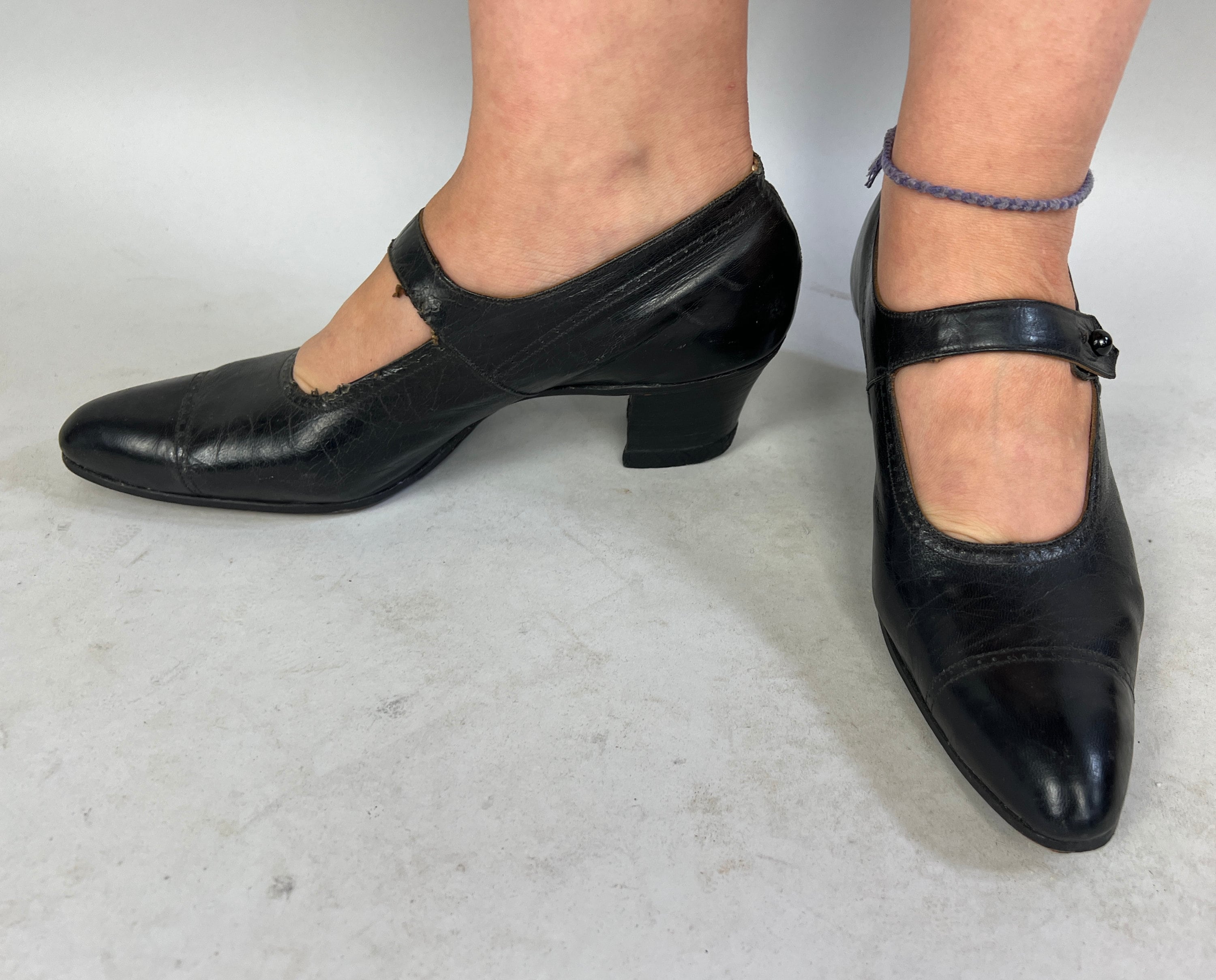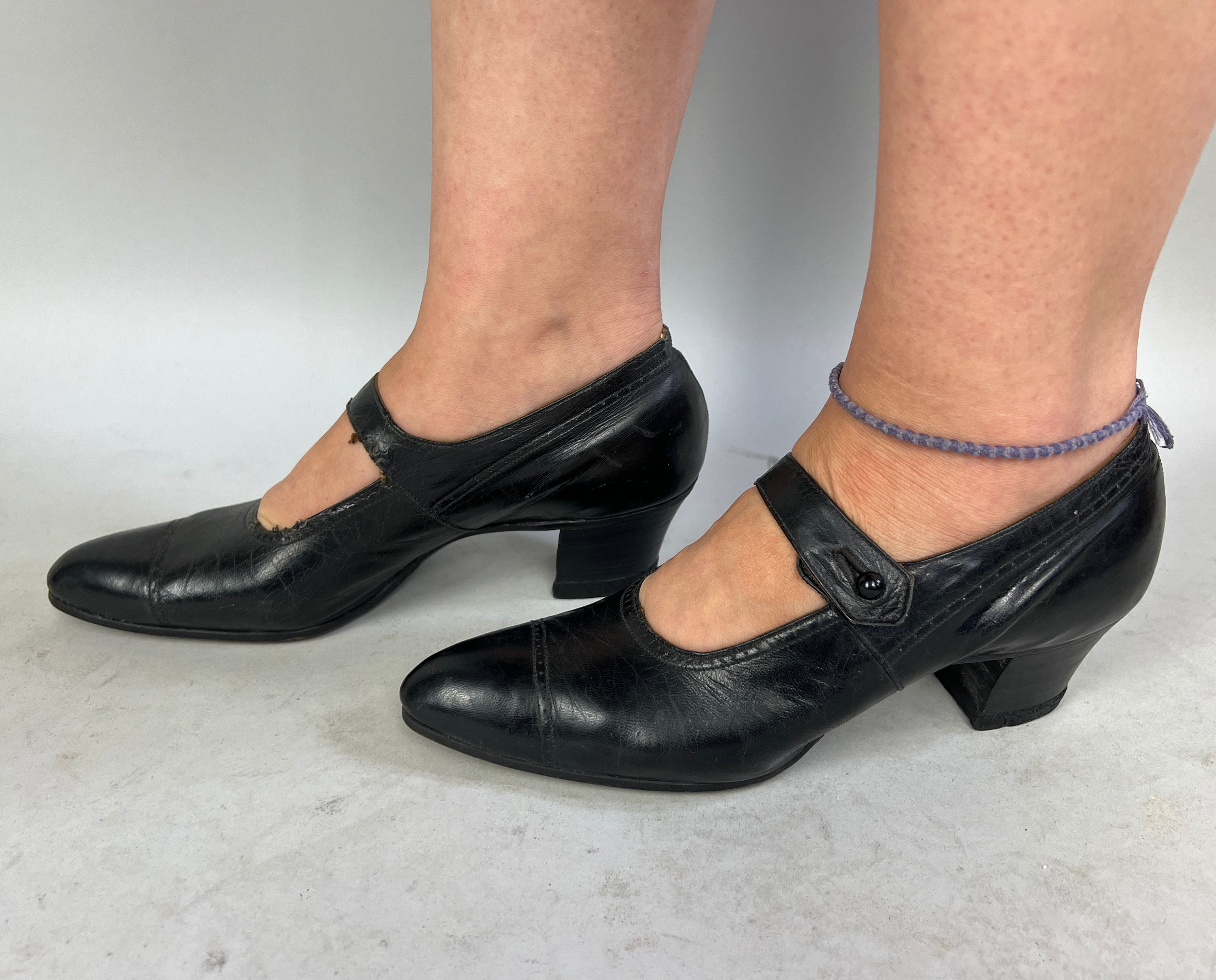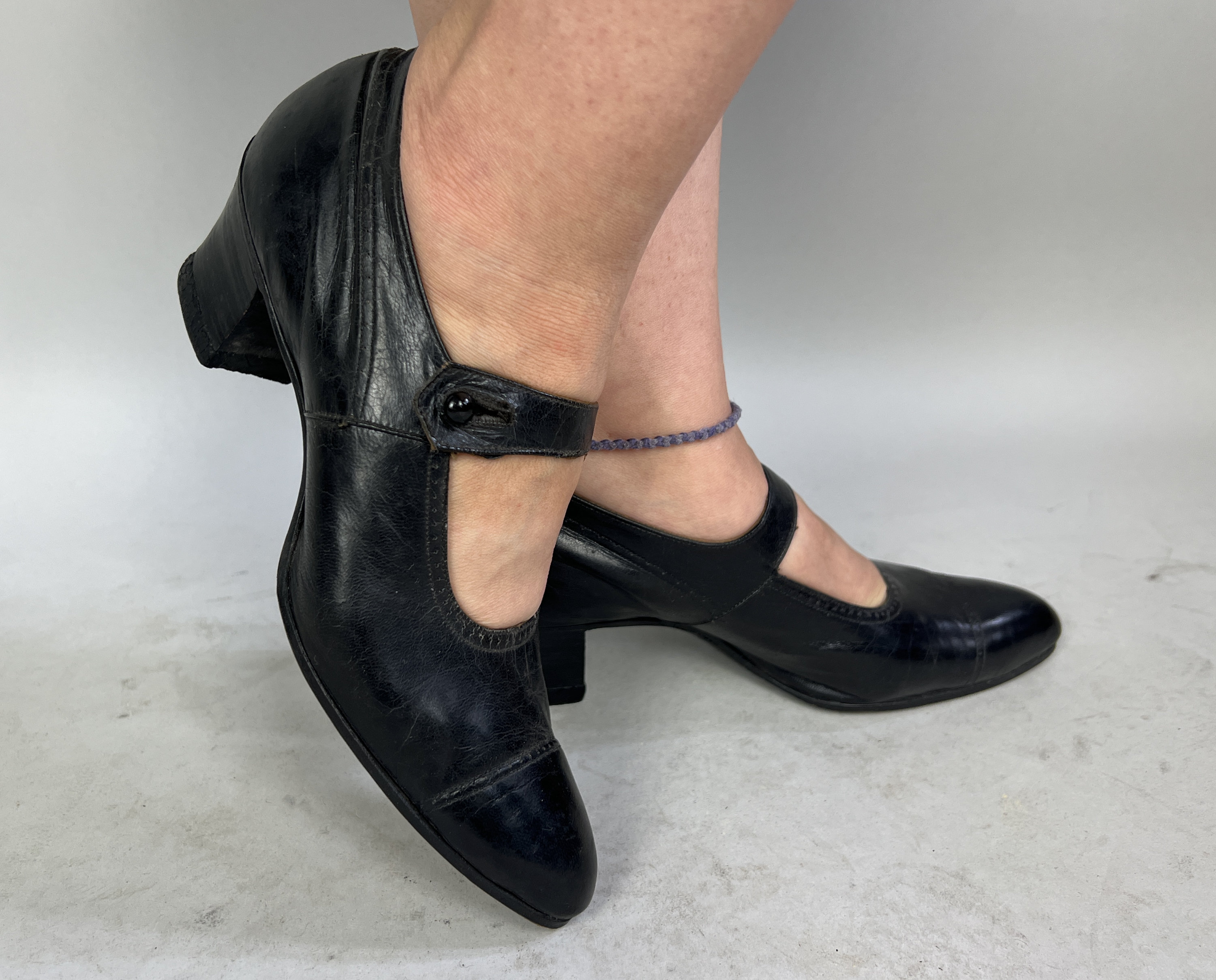 The perfect match to your deco dresses, these 1920’s shoes are basics at their best! These black leather Mary Janes feature a button strap and pointy cap toe. A comfortable low stacked heel make these a smart choice. These shoes are in great vintage condition with only minor signs of wear.