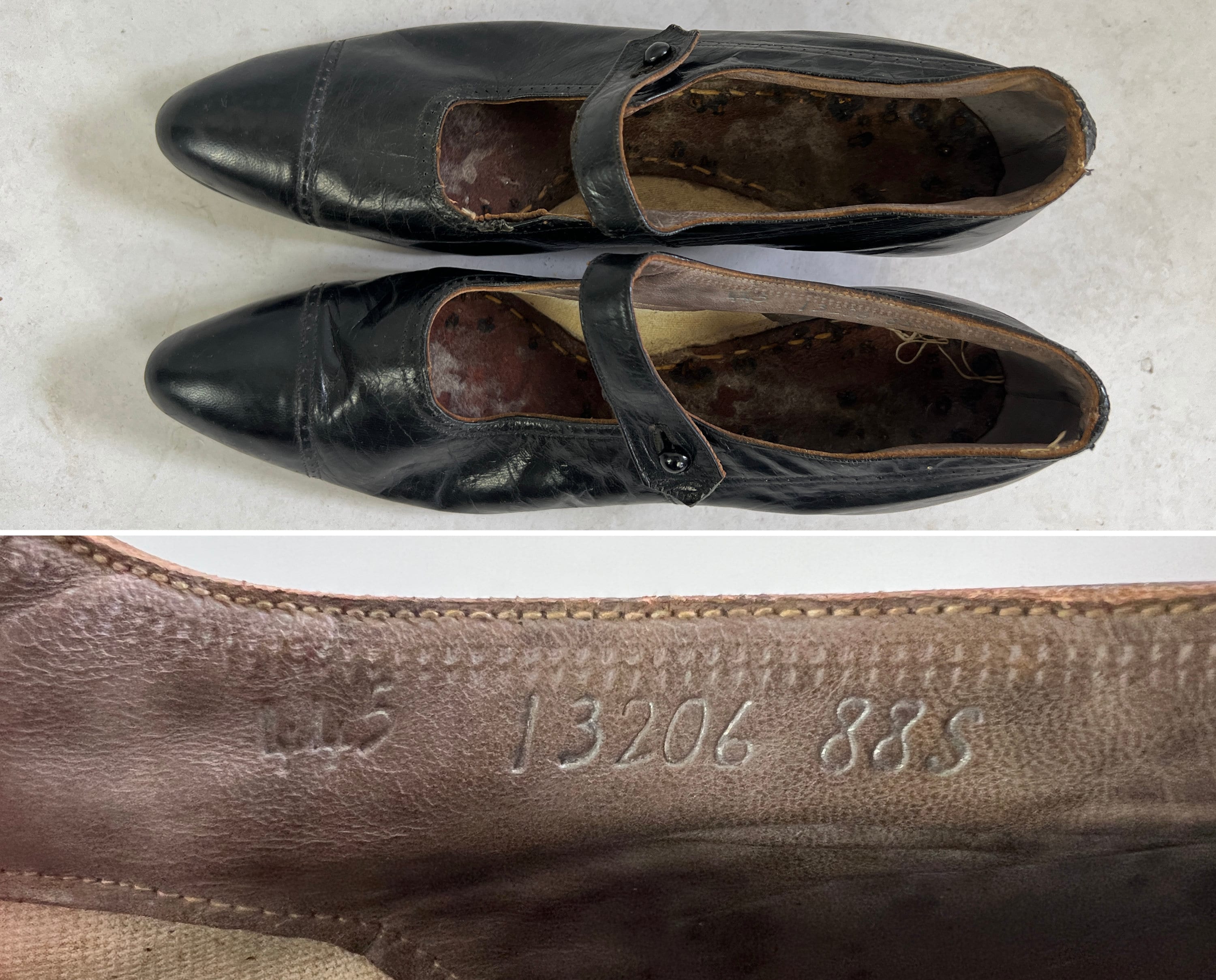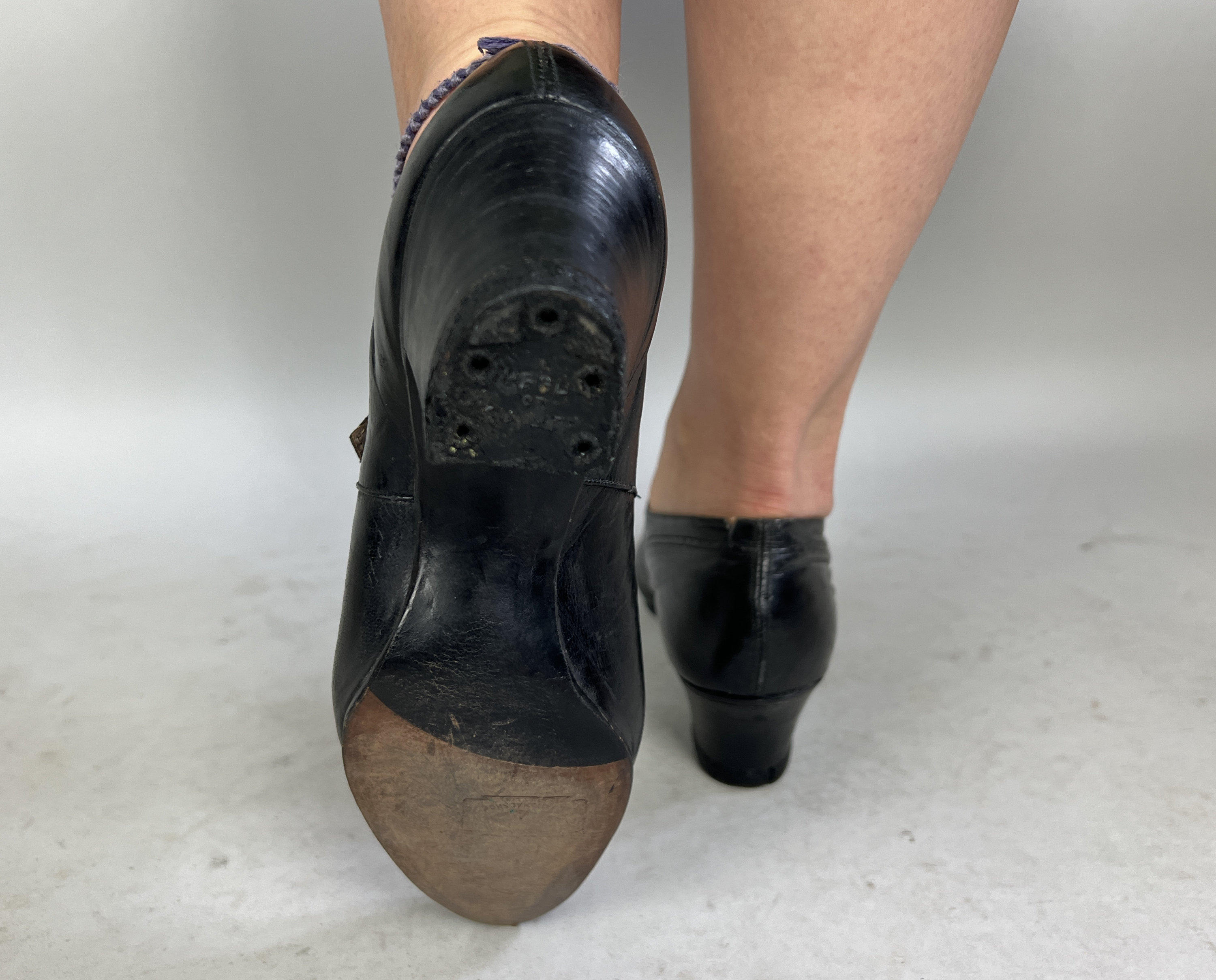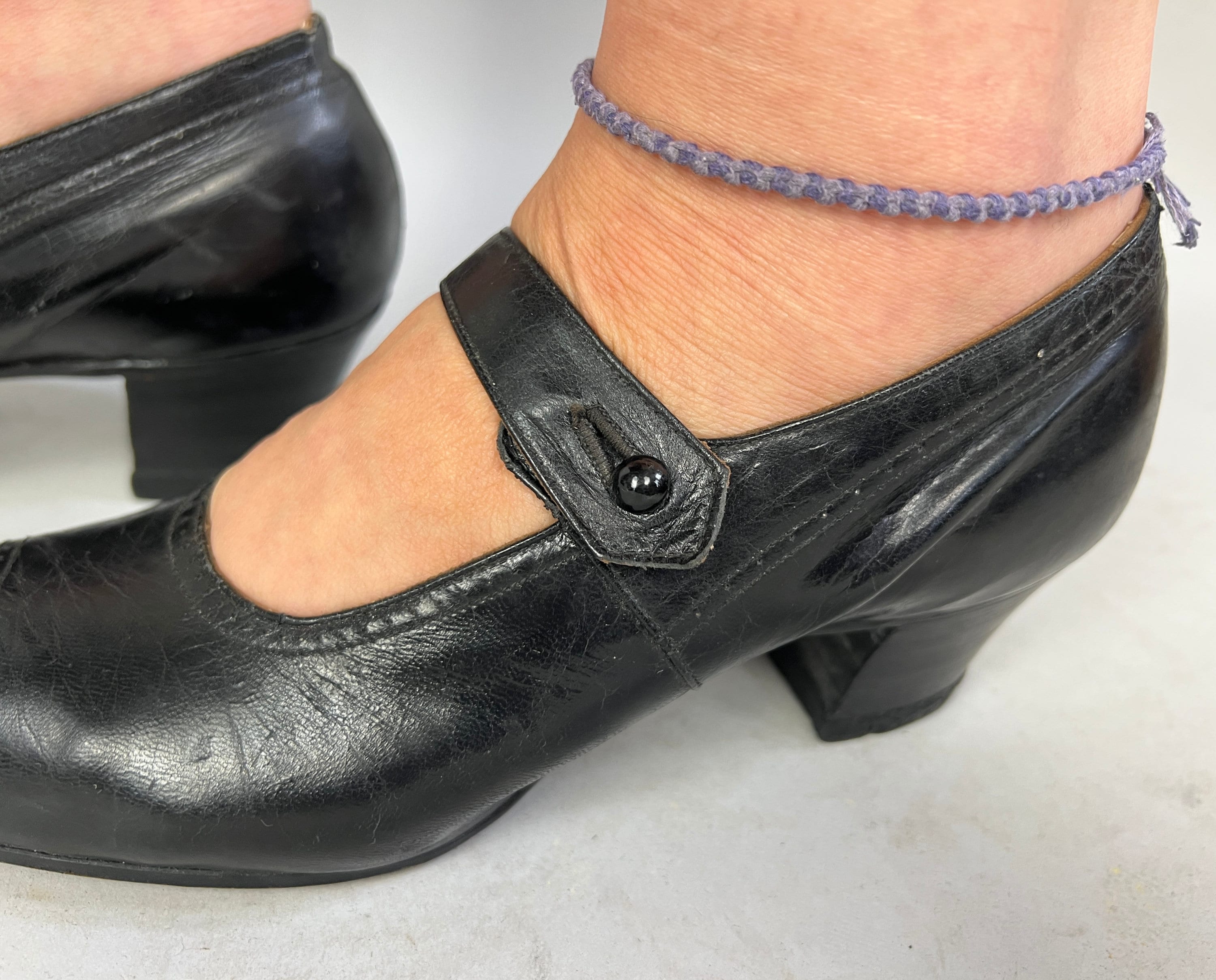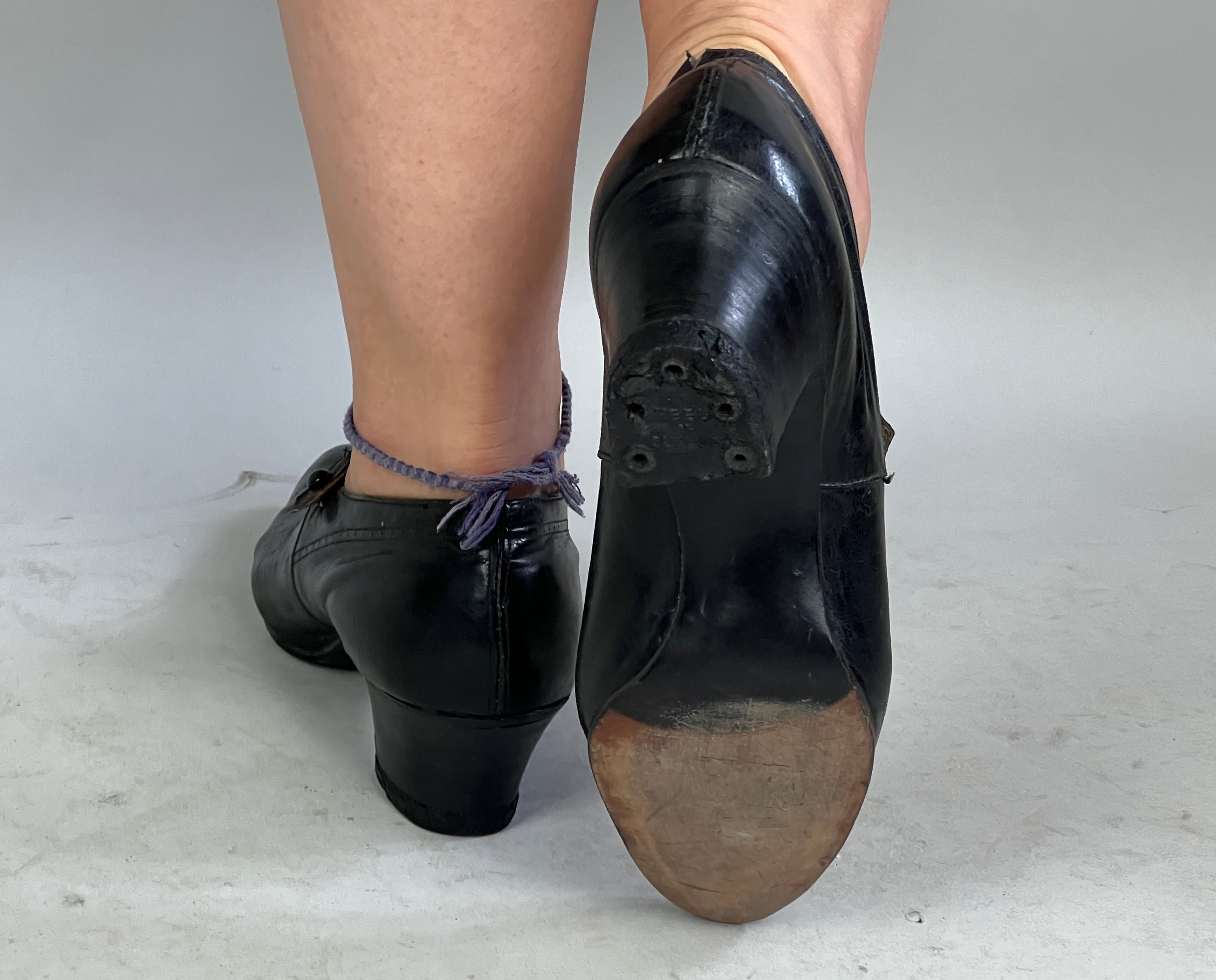 The perfect match to your deco dresses, these 1920’s shoes are basics at their best! These black leather Mary Janes feature a button strap and pointy cap toe. A comfortable low stacked heel make these a smart choice. These shoes are in great vintage condition with only minor signs of wear.