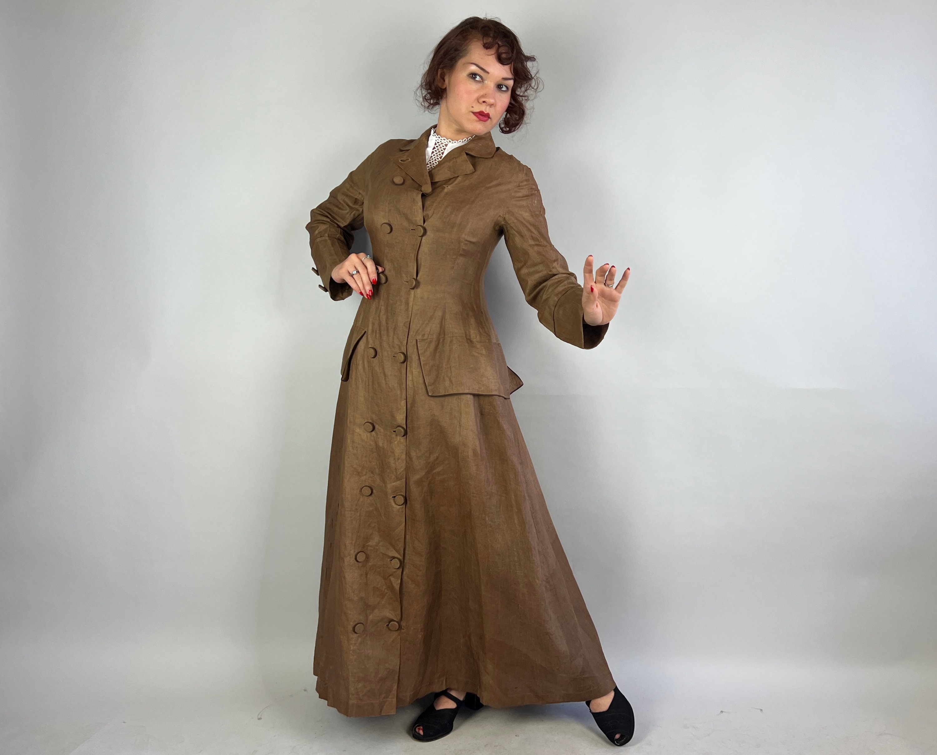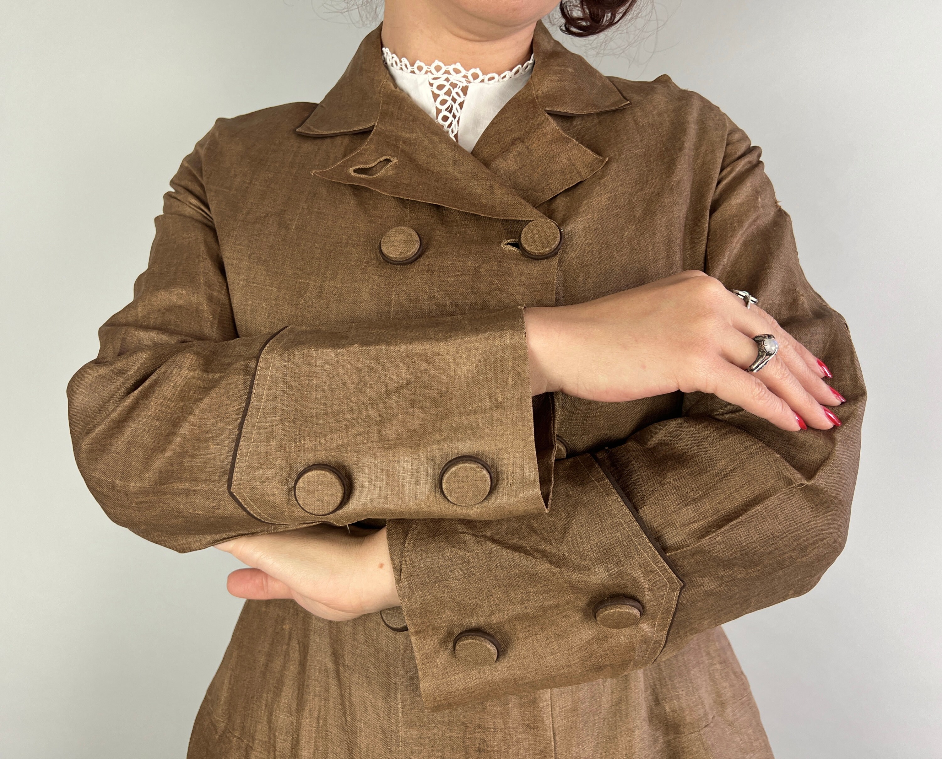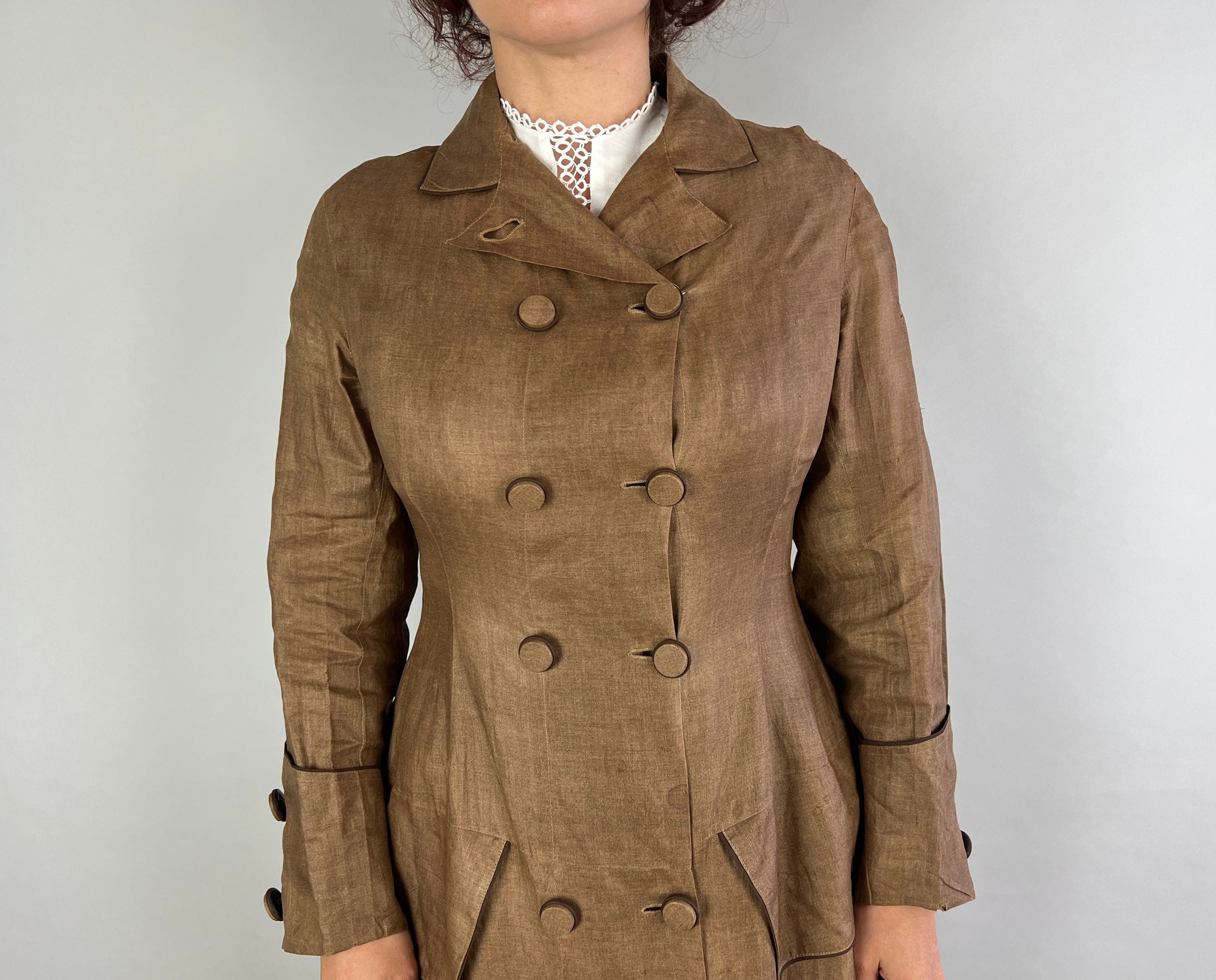 Dash around like a grand pirate in this 1800's frock coat! Lovely fawn brown linen features big cuffs, huge pocket flaps, and pleated back making for a fabulous shape. It has a double breasted closure with the buttons running down the entire length. Walnut brown piping makes for subtle decoration. This coat is in good vintage condition, with a couple tiny holes, period mends, and faint marks at the hem.