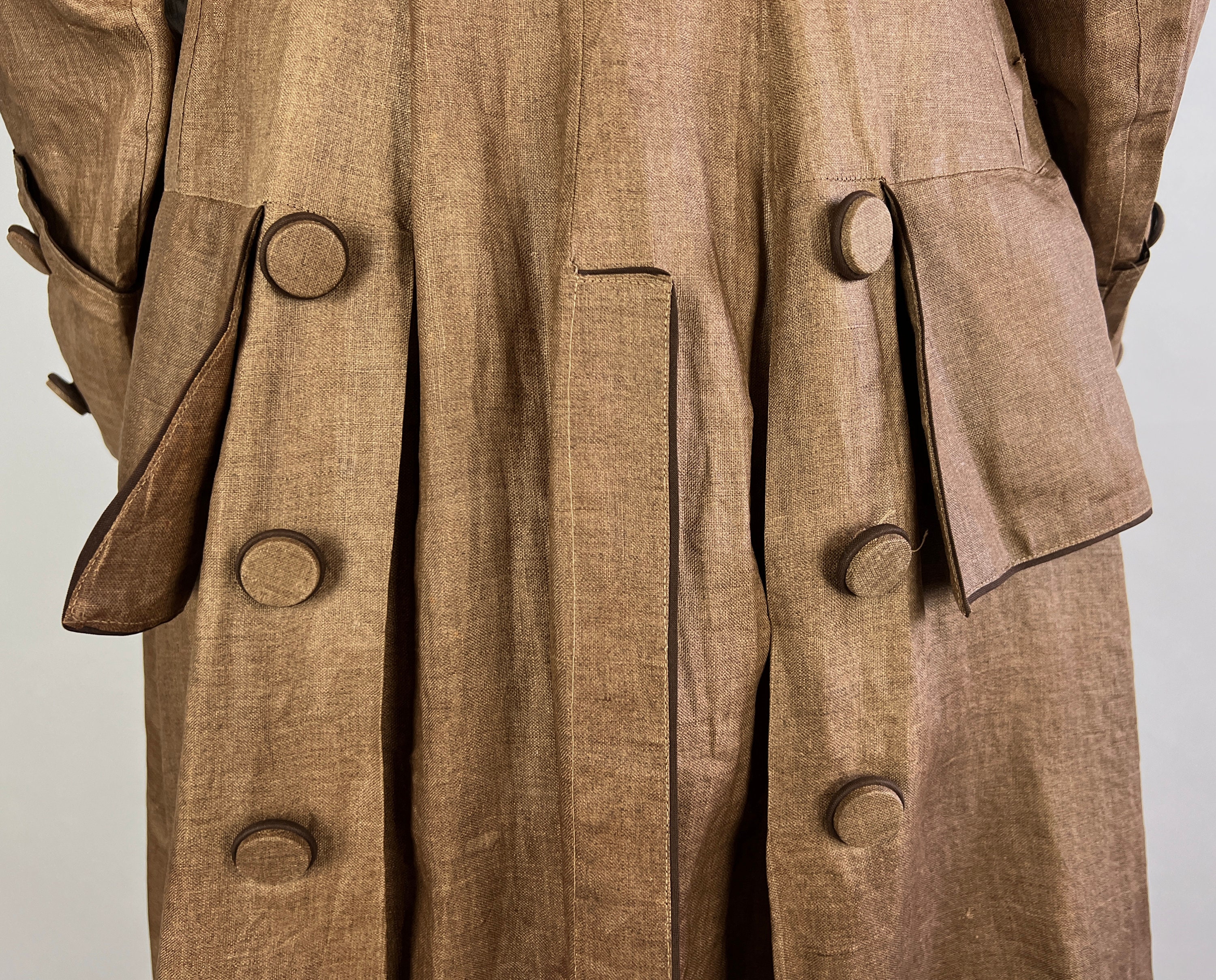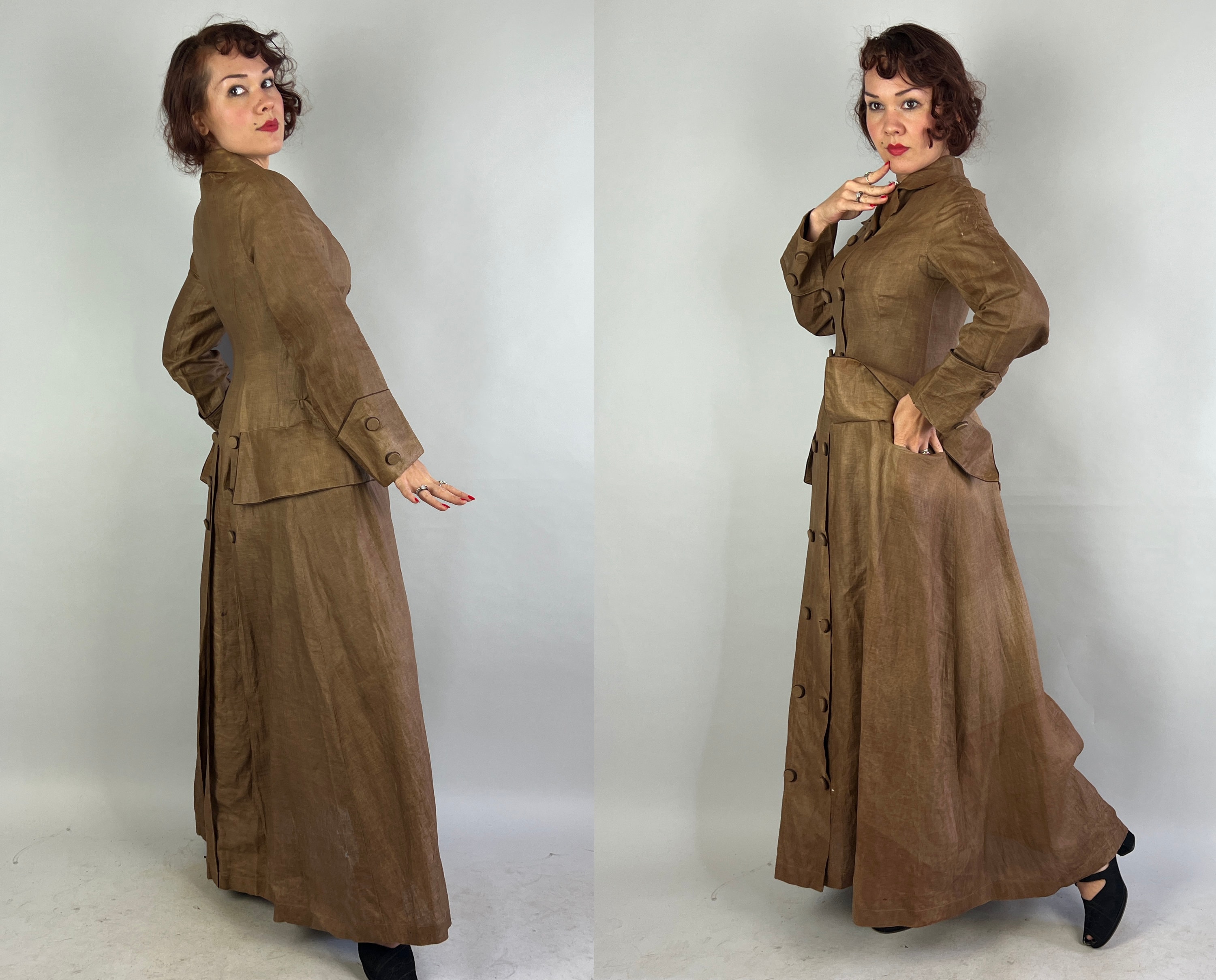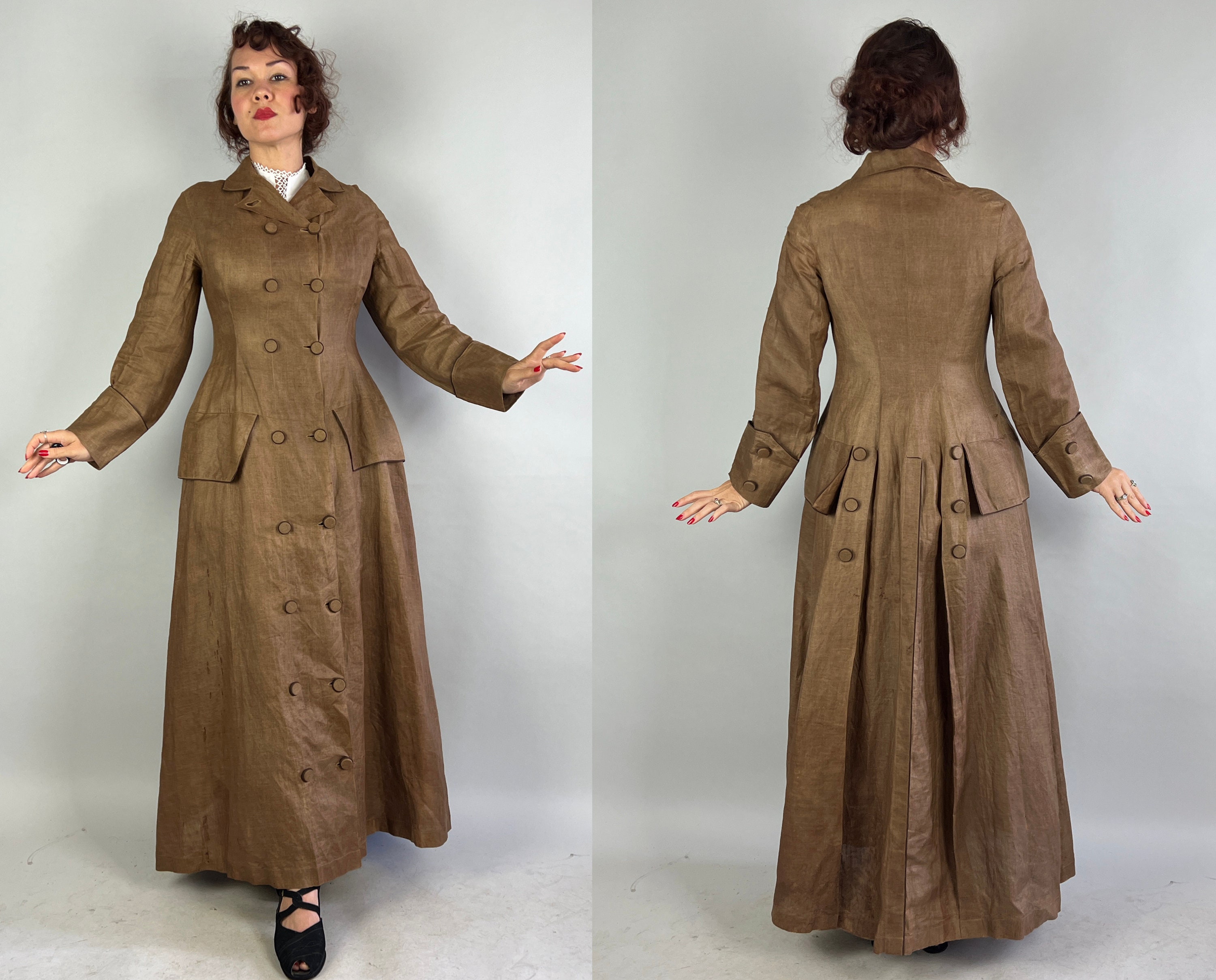 Dash around like a grand pirate in this 1800's frock coat! Lovely fawn brown linen features big cuffs, huge pocket flaps, and pleated back making for a fabulous shape. It has a double breasted closure with the buttons running down the entire length. Walnut brown piping makes for subtle decoration. This coat is in good vintage condition, with a couple tiny holes, period mends, and faint marks at the hem.