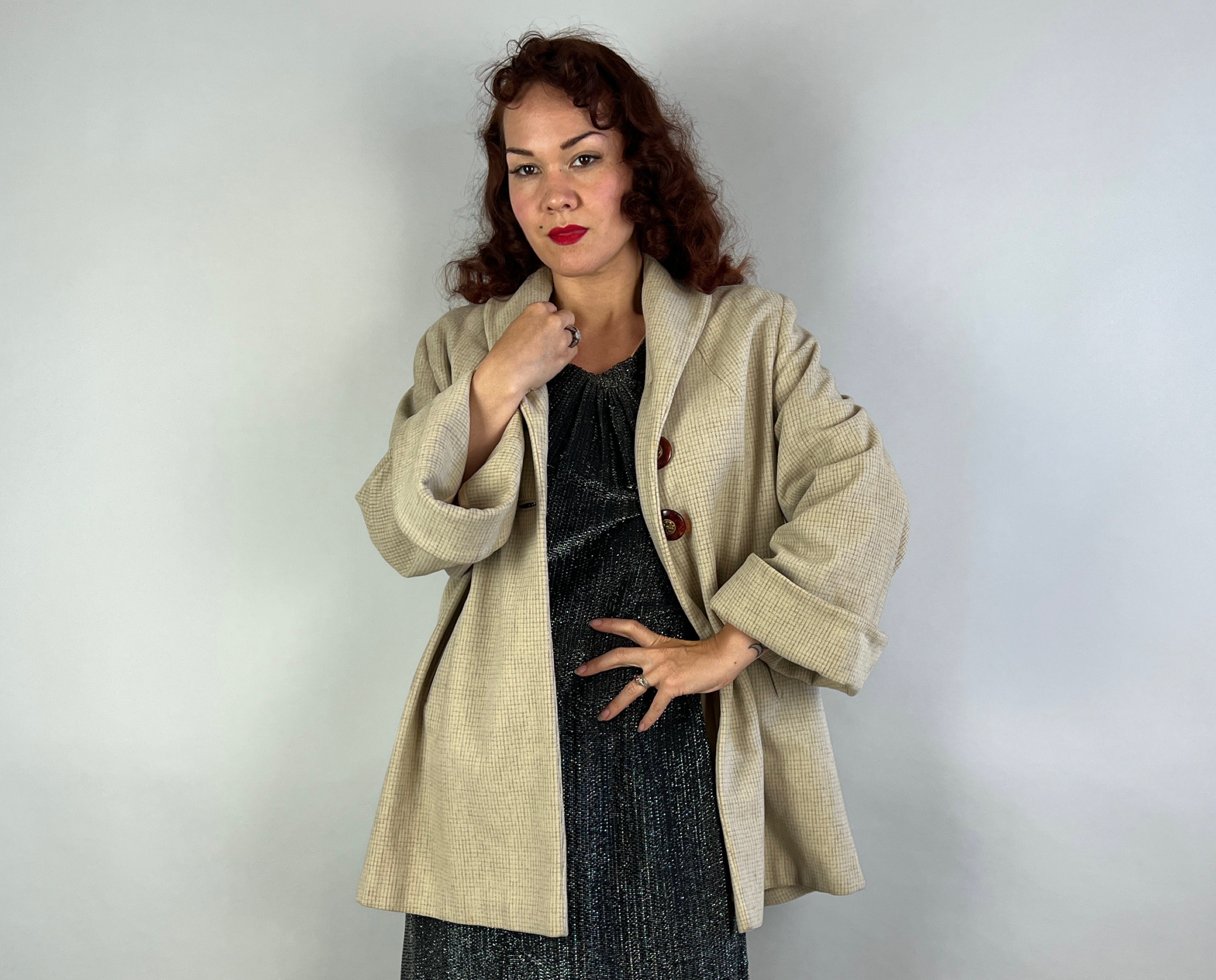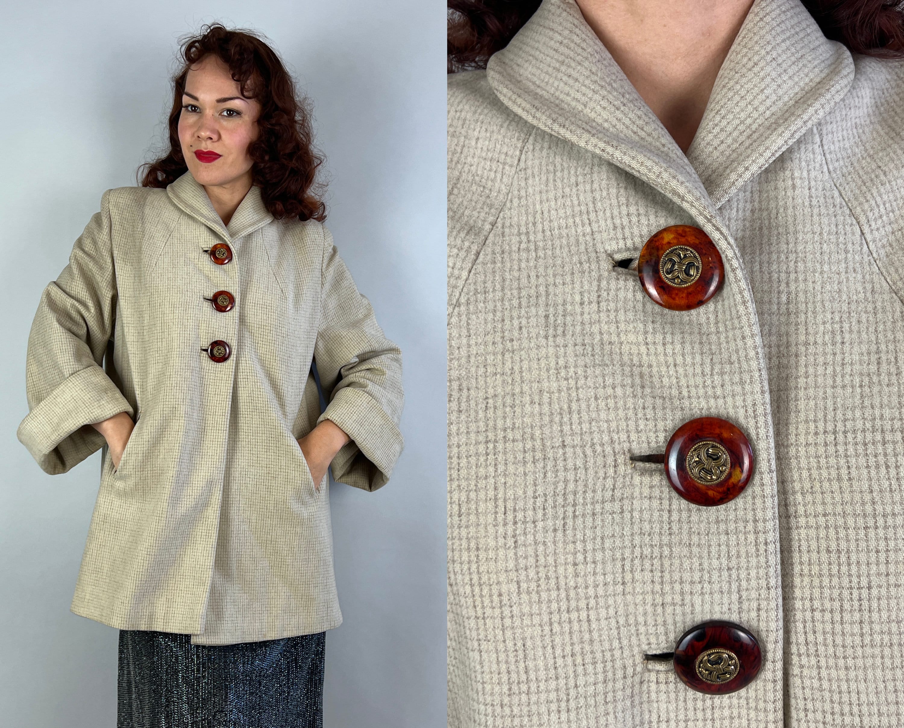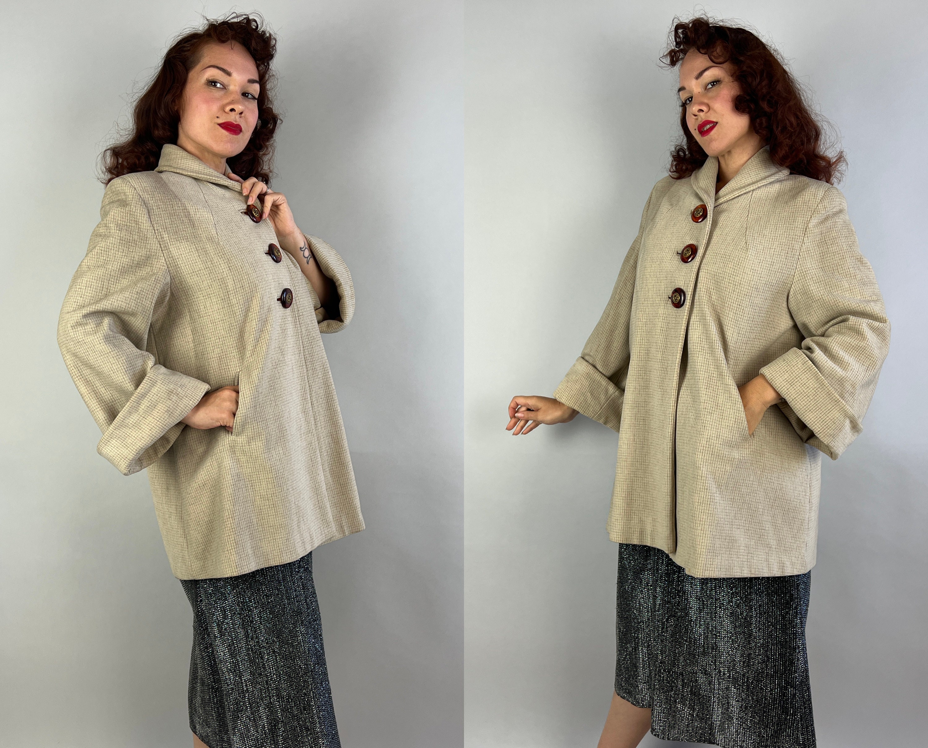 Give winter winds the cold shoulder wearing this chic swing coat! The wool is a lovely cream with a micro windowpane pattern in mocha. Featuring padded shoulders, welted pockets, and big cuffs, this cozy jacket will become an instant staple in your closet. Fastens with three large faux tortoise shell buttons with brass centers. This coat is in great vintage condition, with no holes, stains, or odors to note.