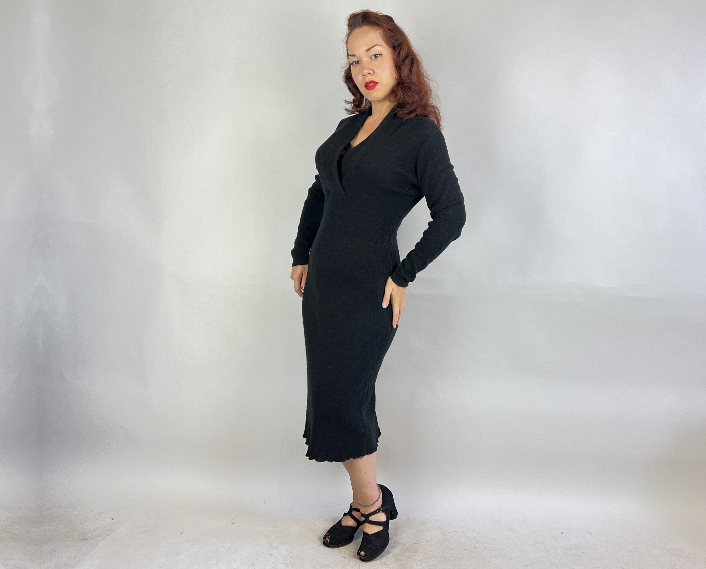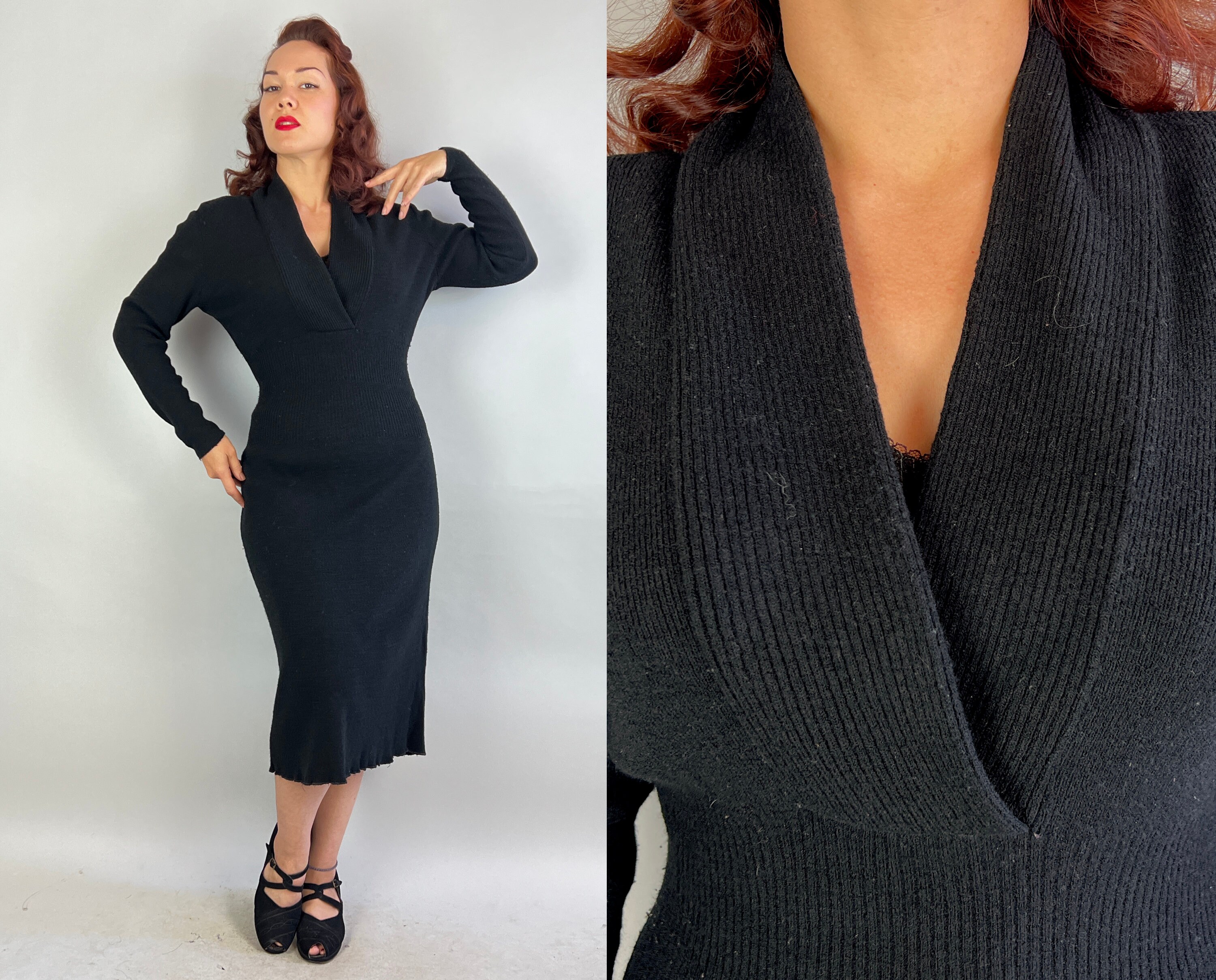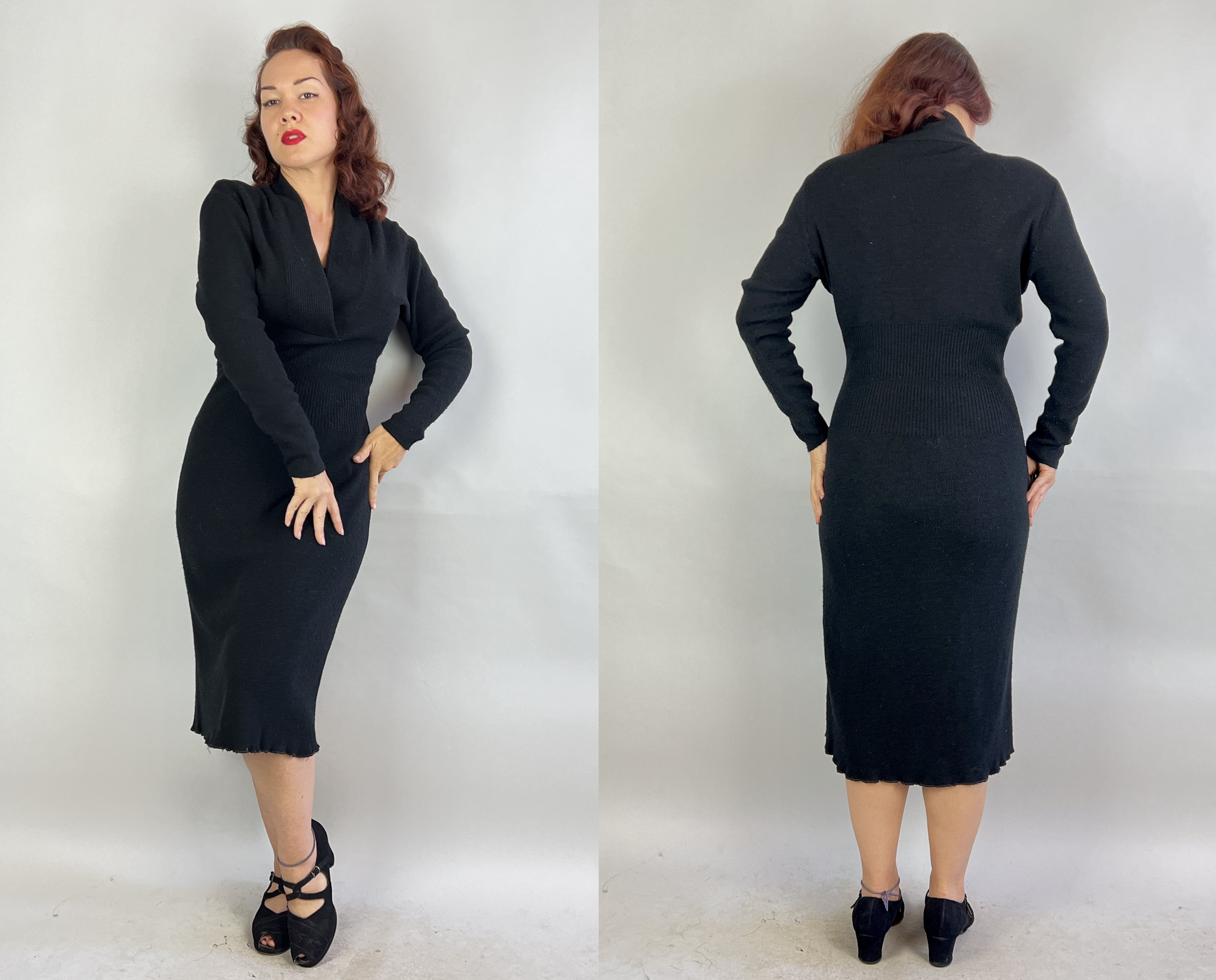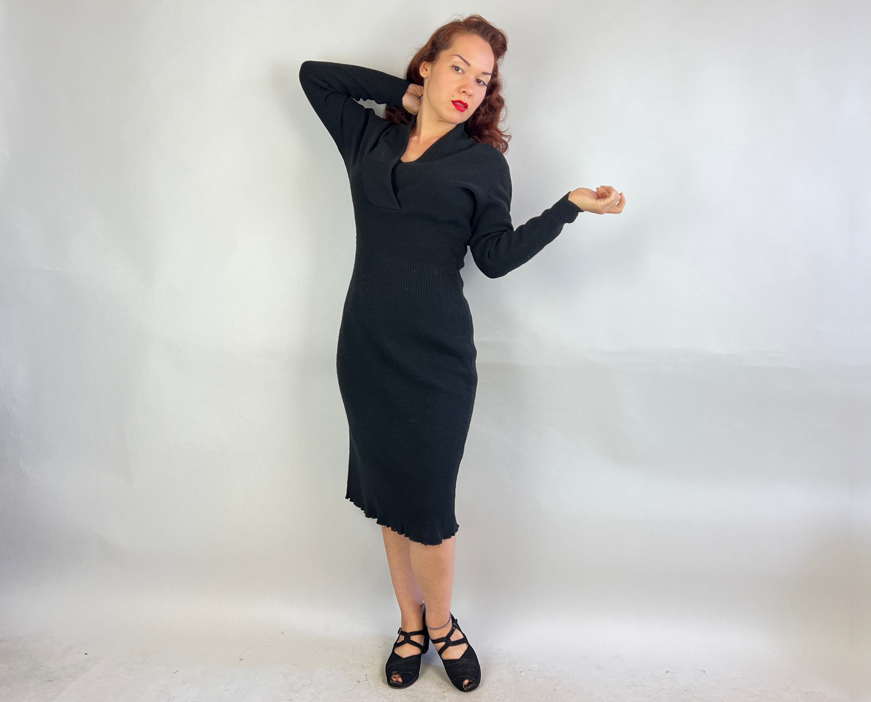 This sultry black 1950's knit is a design that spans the ages! This wool knit will have you feeling cozy while showing off your curves. It features a V-neck with a ribbed semi-wrap collar and ribbed waist. From the great label "Kimberly Knitwear". This dress is in great vintage condition, with no holes, stains, or odors to note.