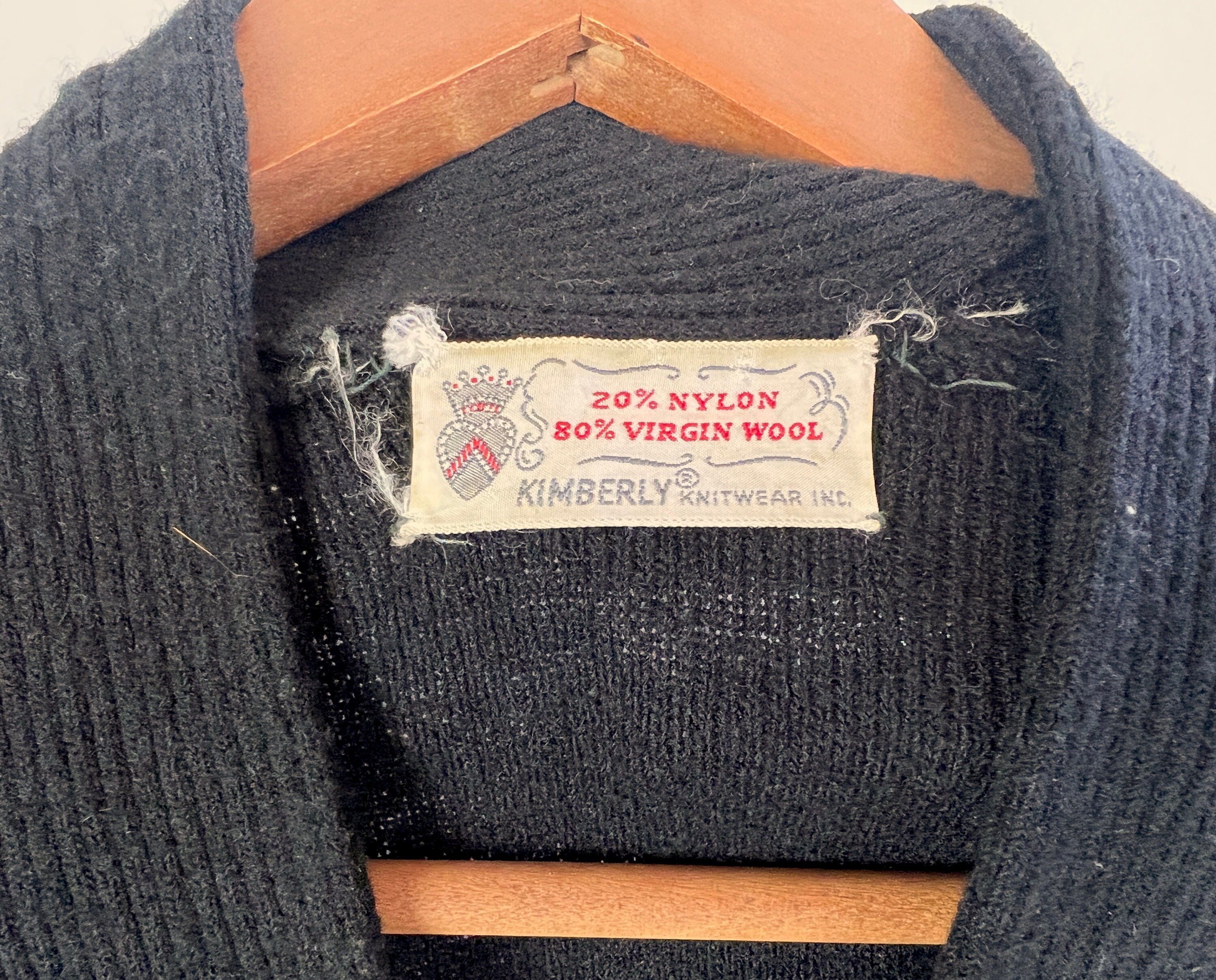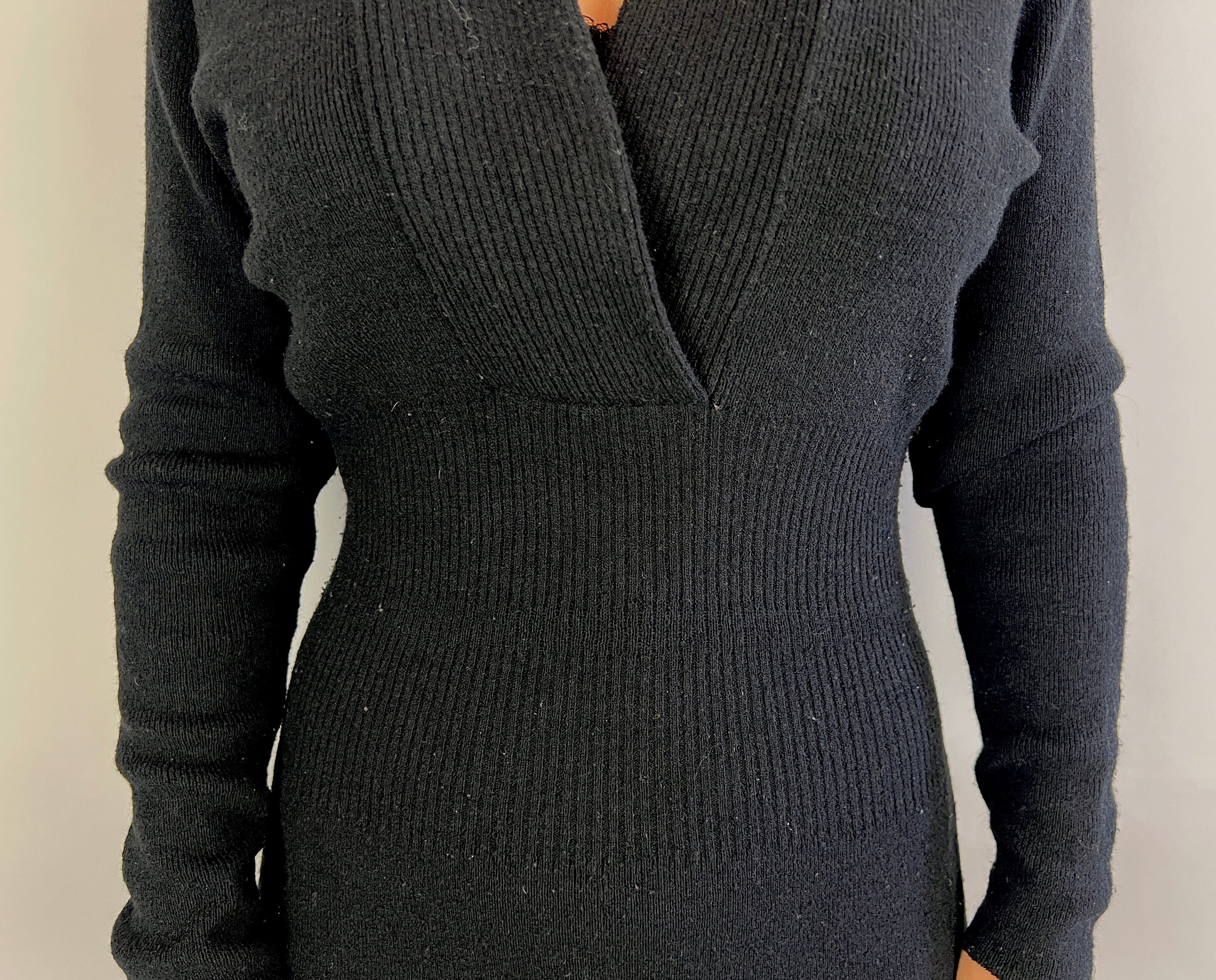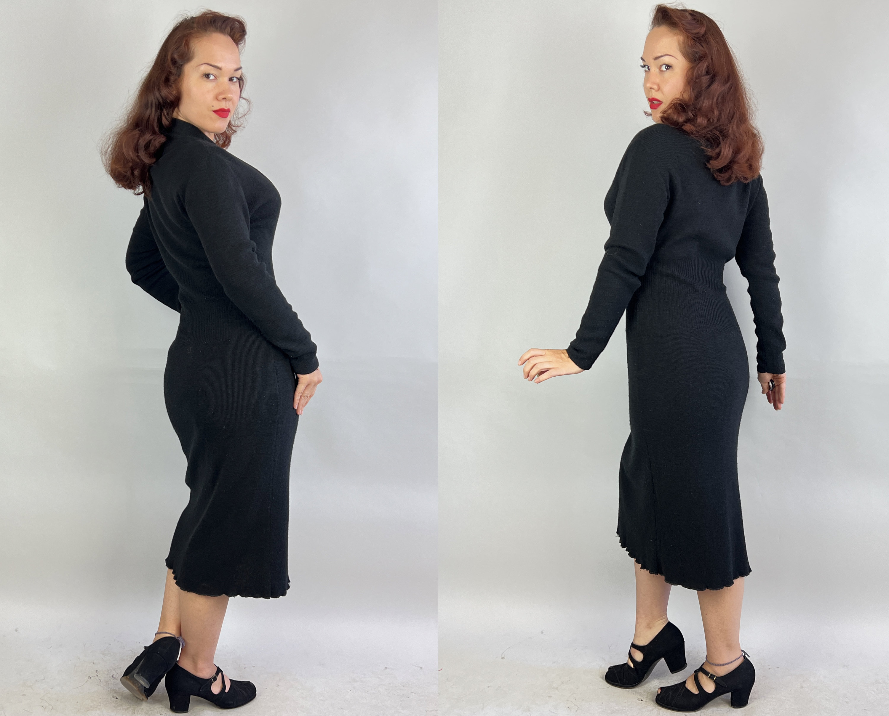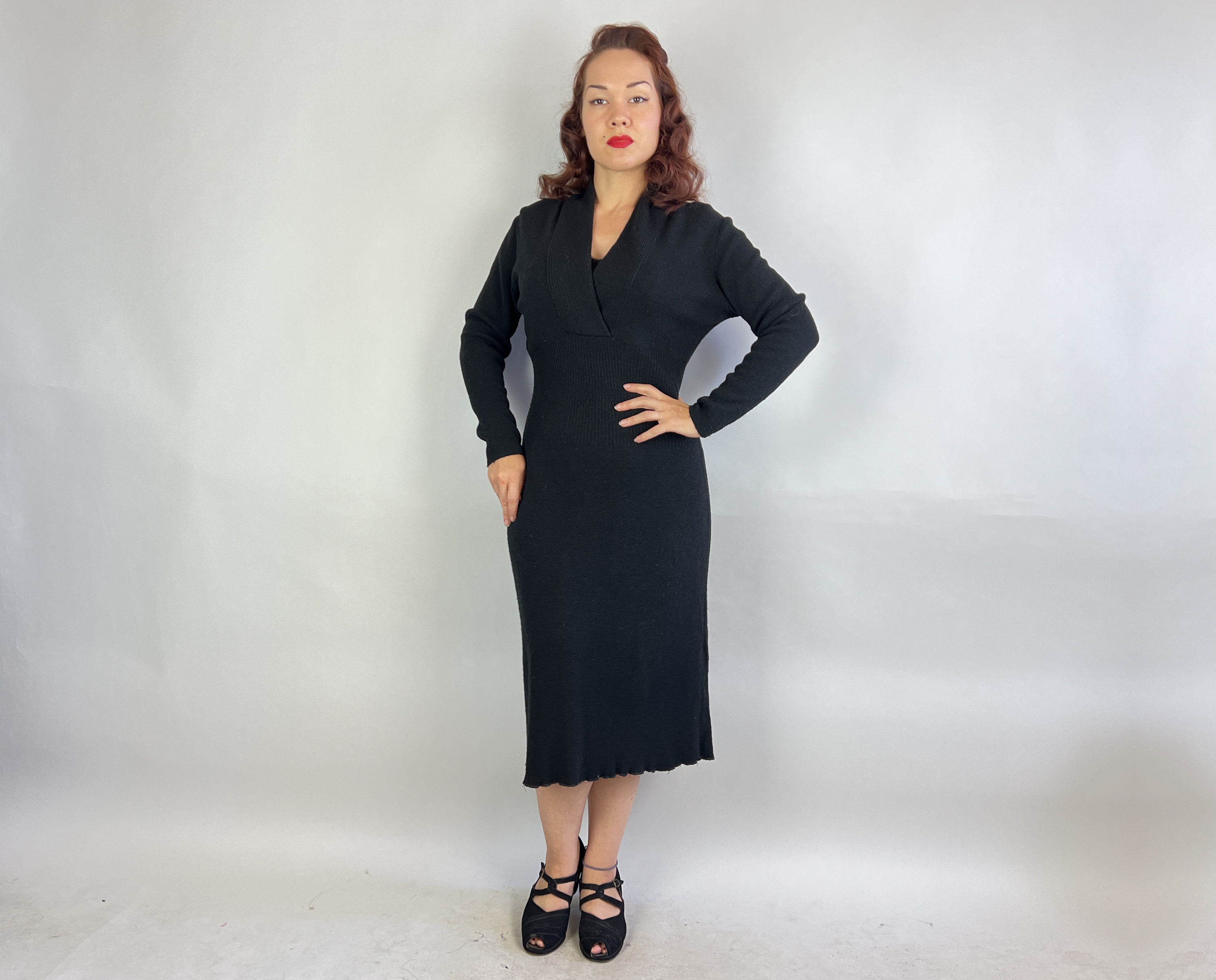 This sultry black 1950's knit is a design that spans the ages! This wool knit will have you feeling cozy while showing off your curves. It features a V-neck with a ribbed semi-wrap collar and ribbed waist. From the great label "Kimberly Knitwear". This dress is in great vintage condition, with no holes, stains, or odors to note.