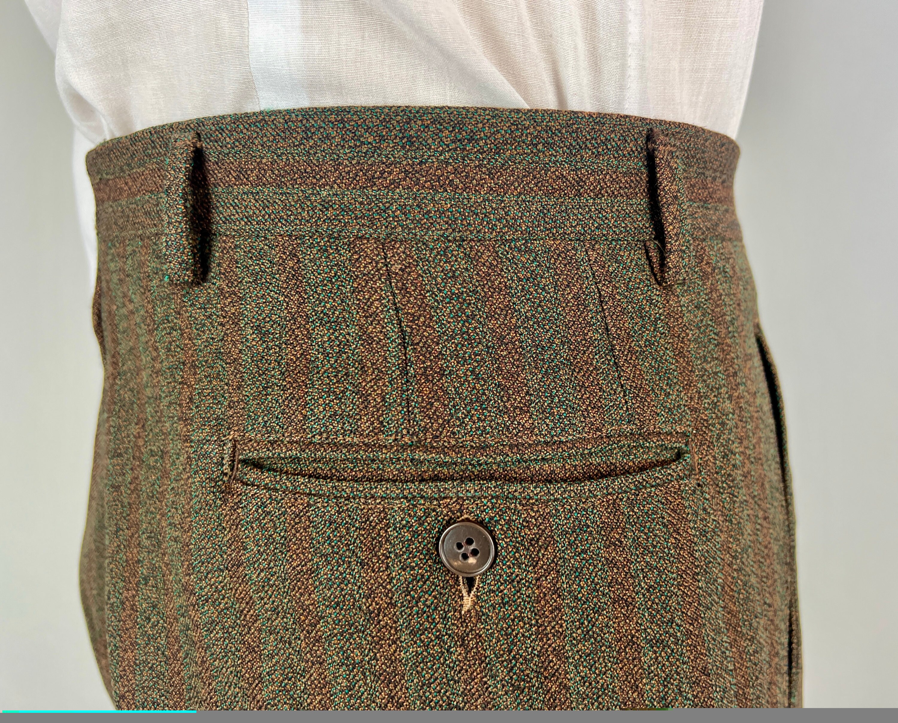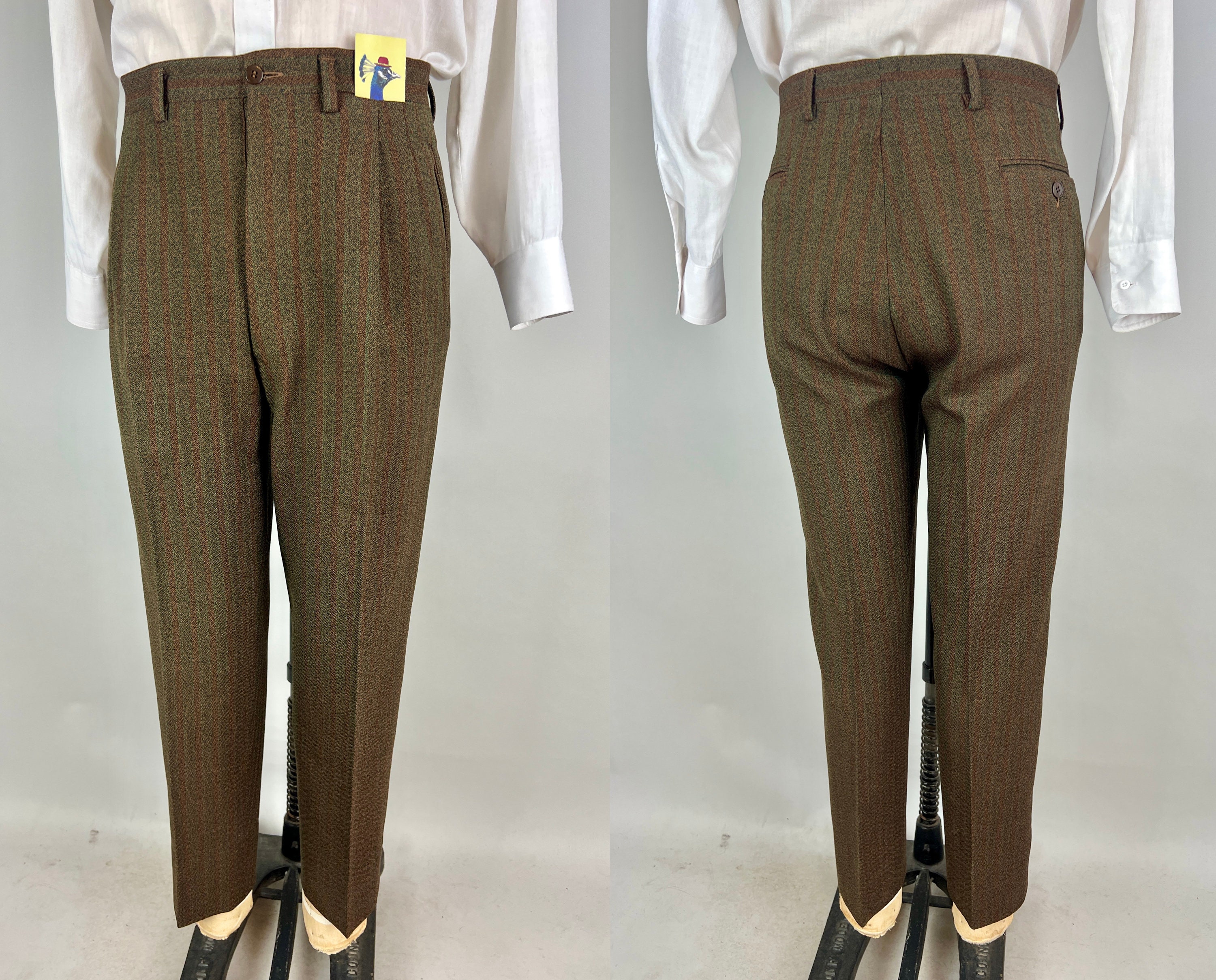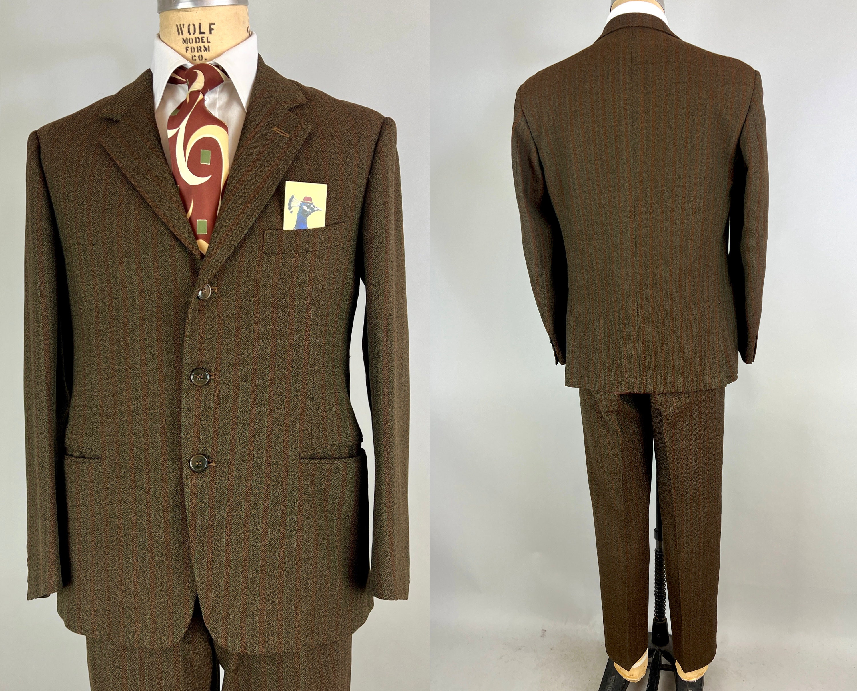Stand up against the fall in this amazing 1920’s autumnal suit! The wool has a fantastic weave of stripes and speckles in coffee brown, maroon, spiced orange, and forest green. The jacket features notch lapels, three button closure, three inner pockets, three outer pockets, full lining, and light shoulder padsThe trousers have dropped belt loops, double pleated front, five welted pockets with two buttoning on the back, and button fly. Italian made and labeled "Core abit". This suit is in great vintage condition, with no holes, stains, odors to note.