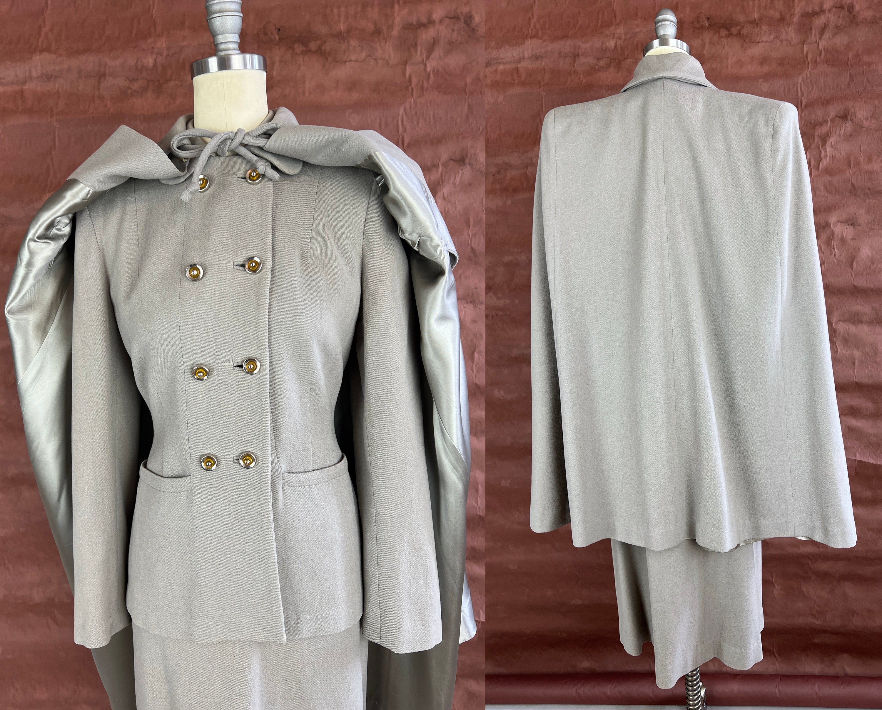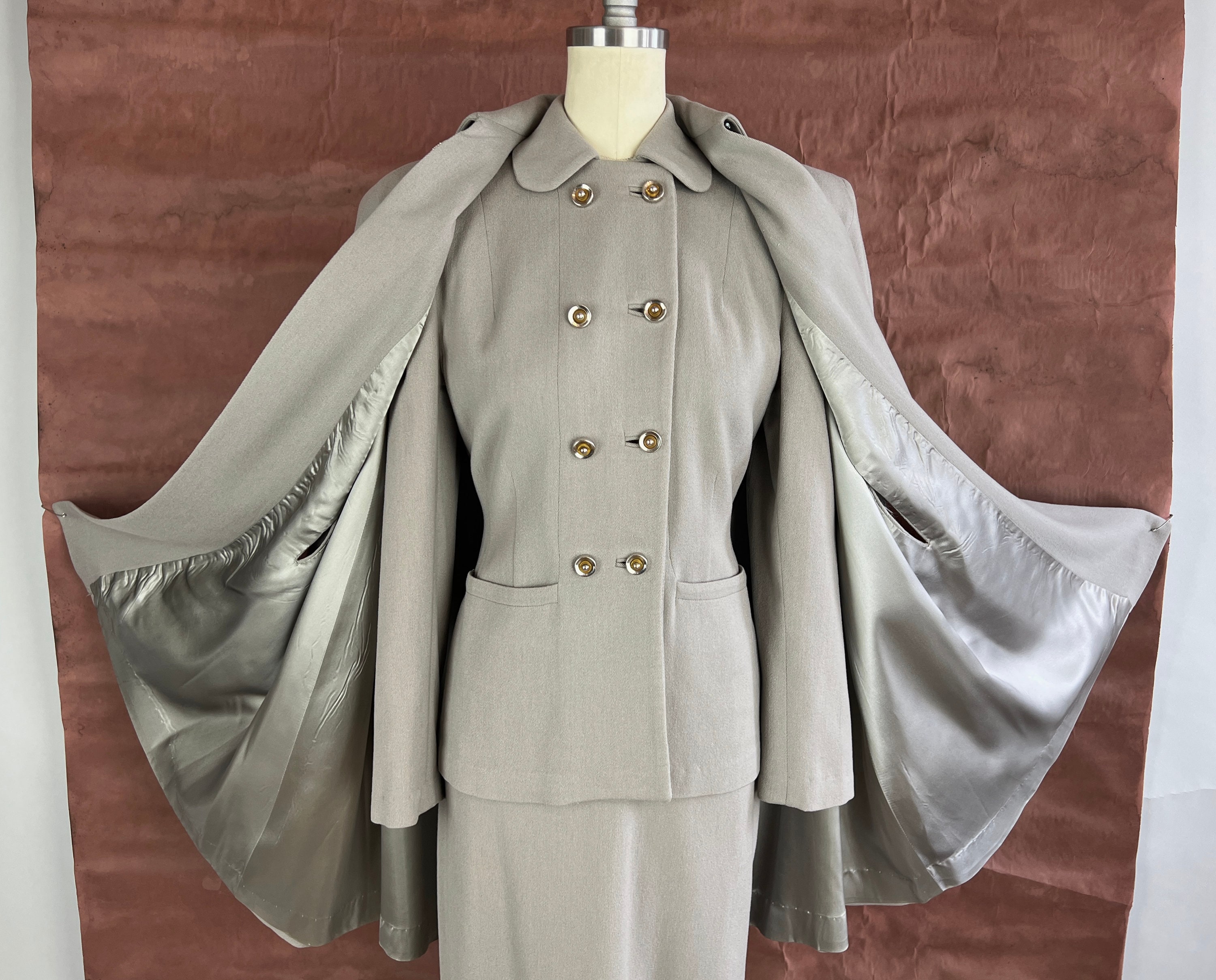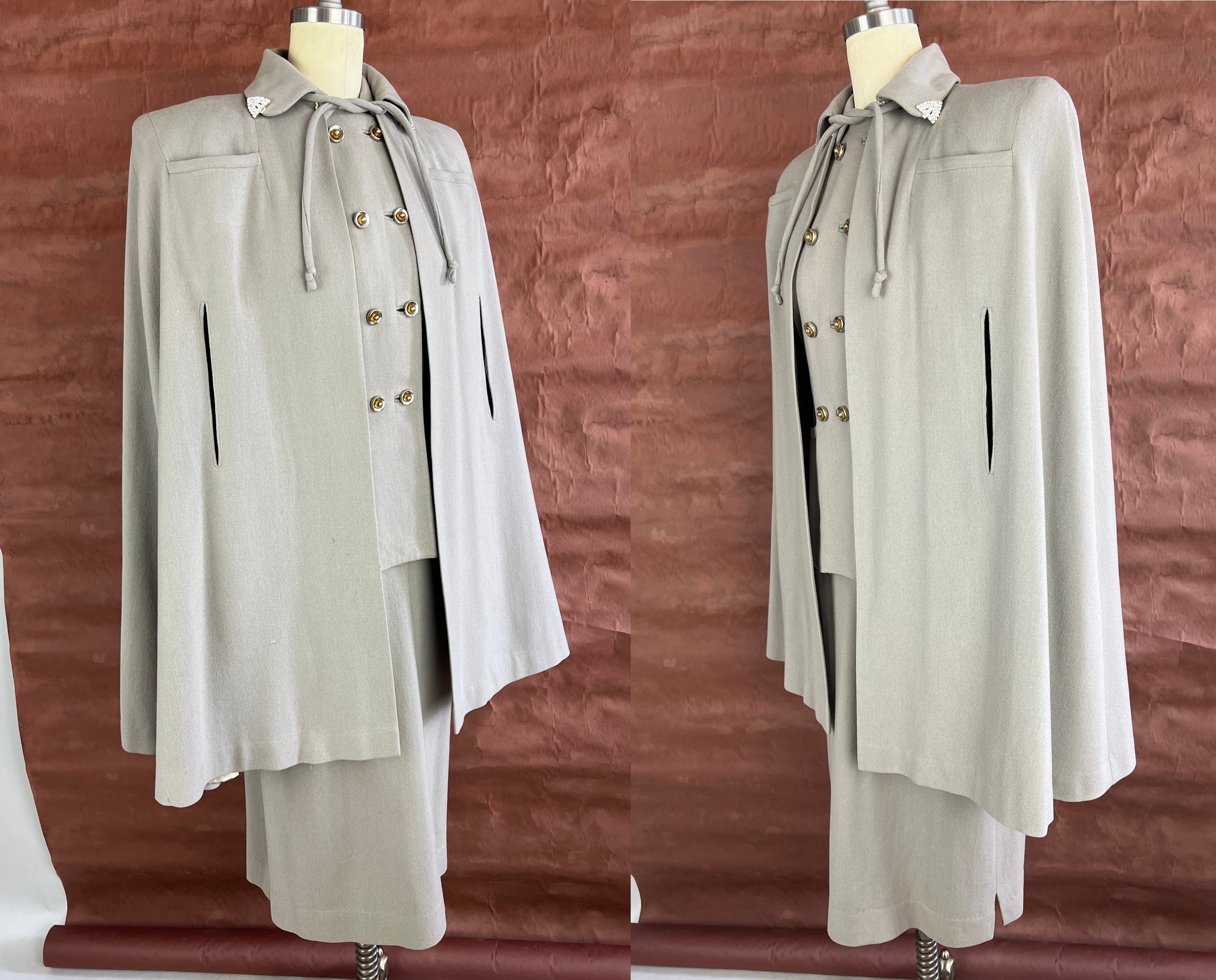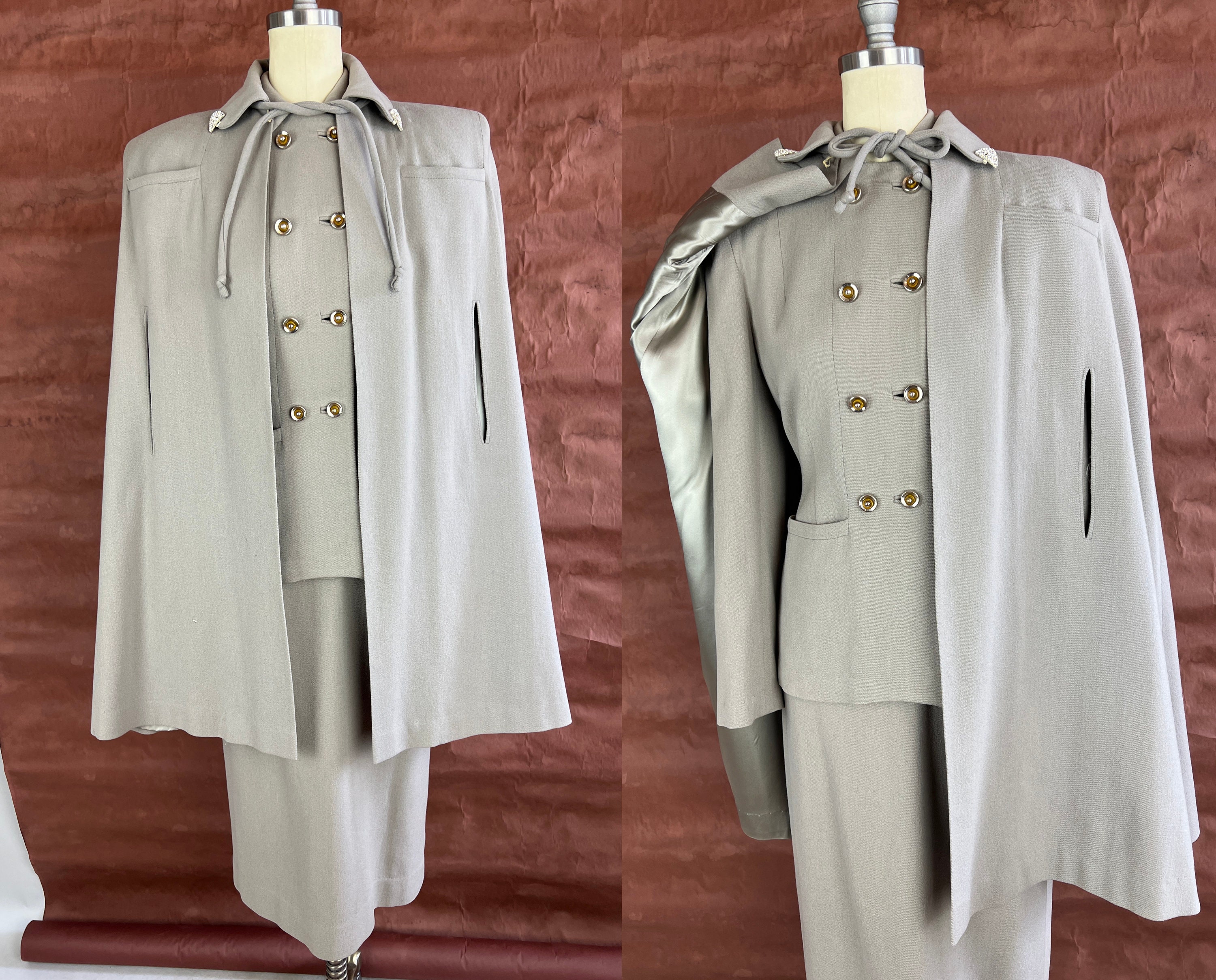 Take command like a member of the empire in this 1940's ensemble! All pieces are dove grey wool with the skirt and cape lined in a liquid rayon satin. The jacket is double breasted with buttons of silver and yellow layered in three pieces. It has padded shoulders, rounded collar, and hip pockets. The skirt is a pencil cut with small slits on each side, pleated darts at the waist, and metal zipper and button for the side closure. Top it off with the fantastic cape that has padded shoulders, yoke pockets, arm slits, and rhinestone clips on the collar. This suit is in great vintage condition, with no holes, stains, or odors to note.
