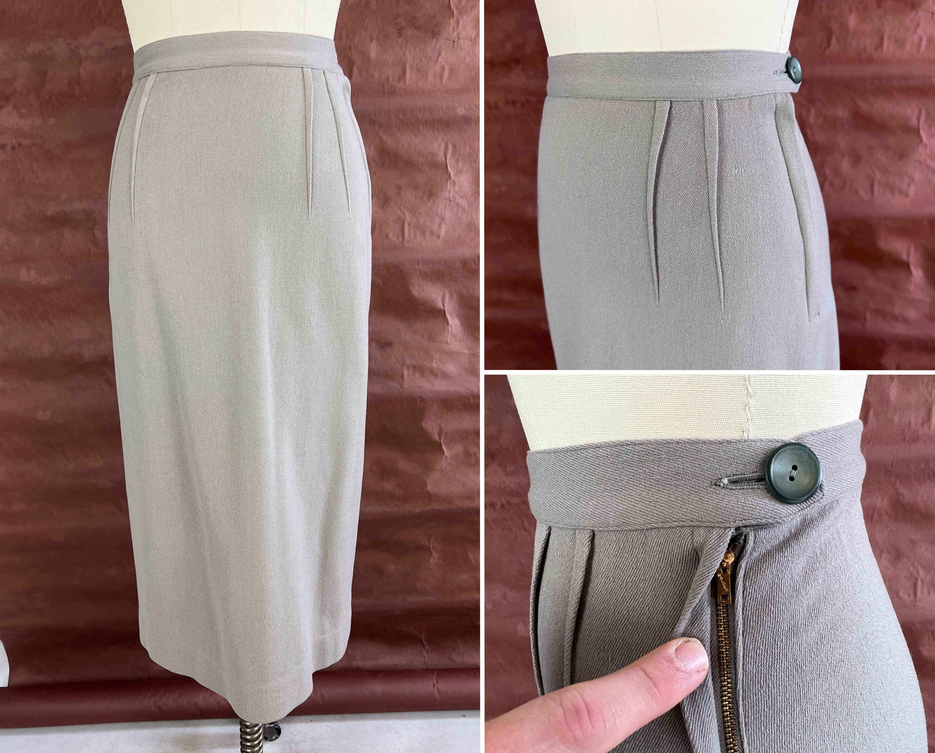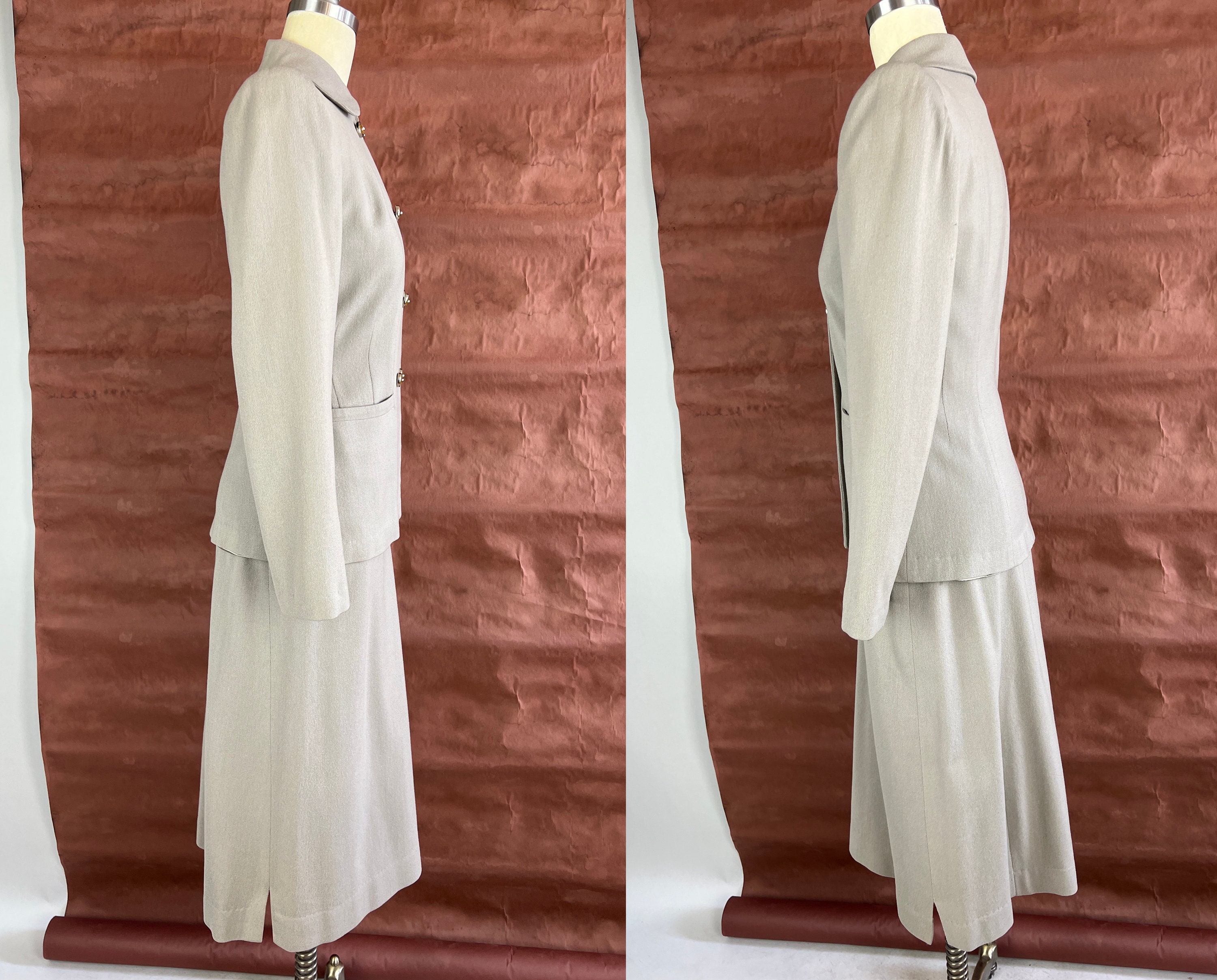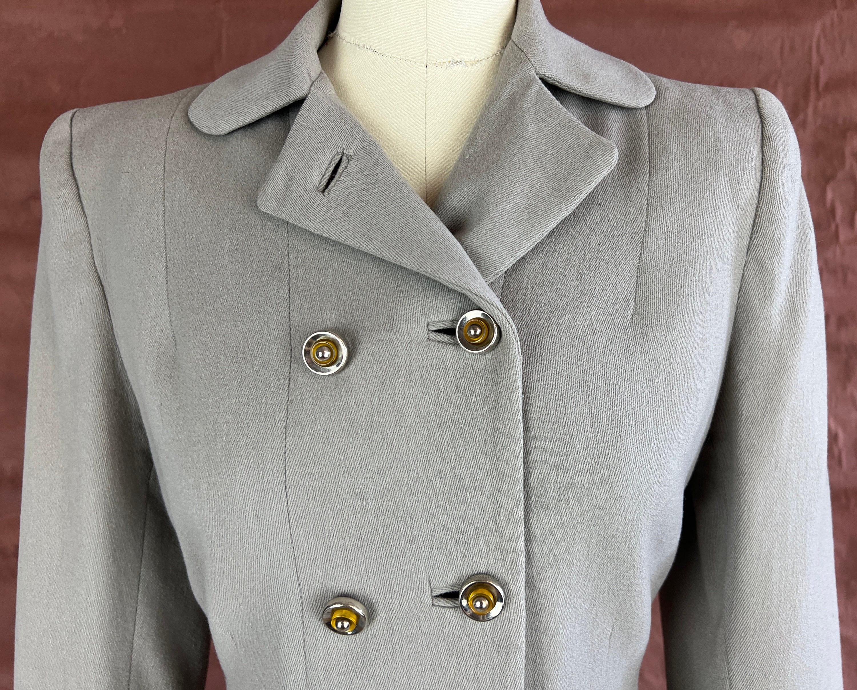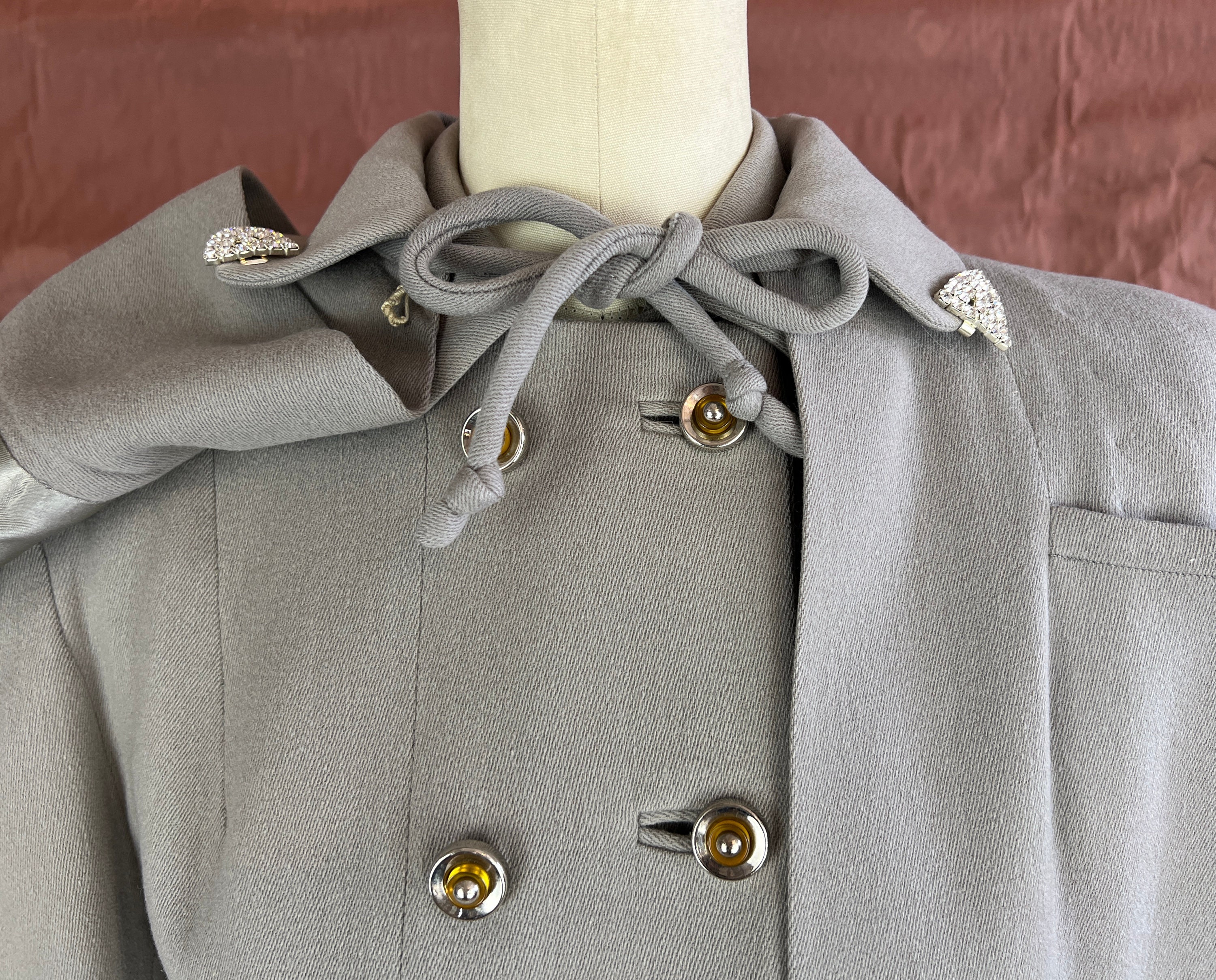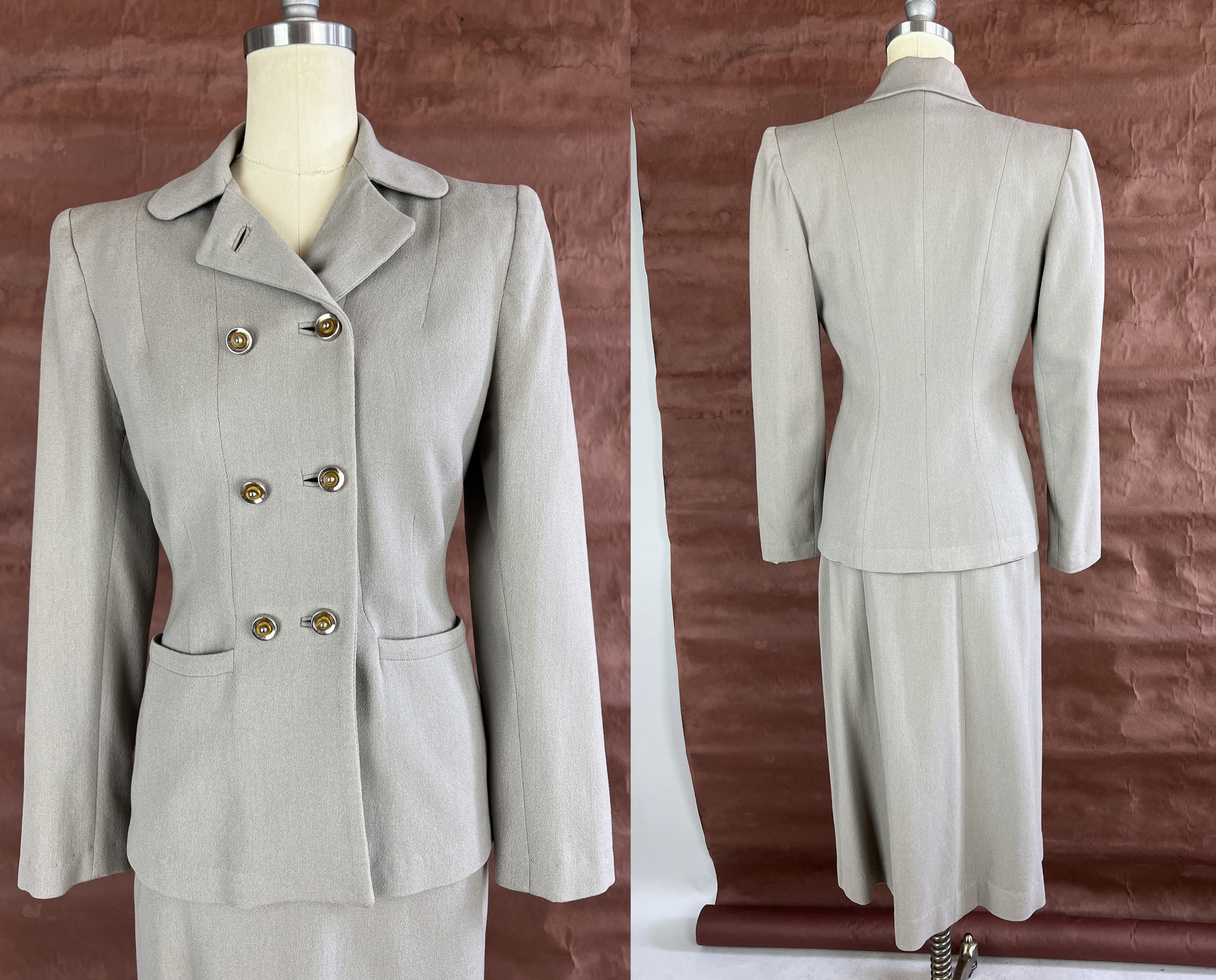 Take command like a member of the empire in this 1940's ensemble! All pieces are dove grey wool with the skirt and cape lined in a liquid rayon satin. The jacket is double breasted with buttons of silver and yellow layered in three pieces. It has padded shoulders, rounded collar, and hip pockets. The skirt is a pencil cut with small slits on each side, pleated darts at the waist, and metal zipper and button for the side closure. Top it off with the fantastic cape that has padded shoulders, yoke pockets, arm slits, and rhinestone clips on the collar. This suit is in great vintage condition, with no holes, stains, or odors to note.