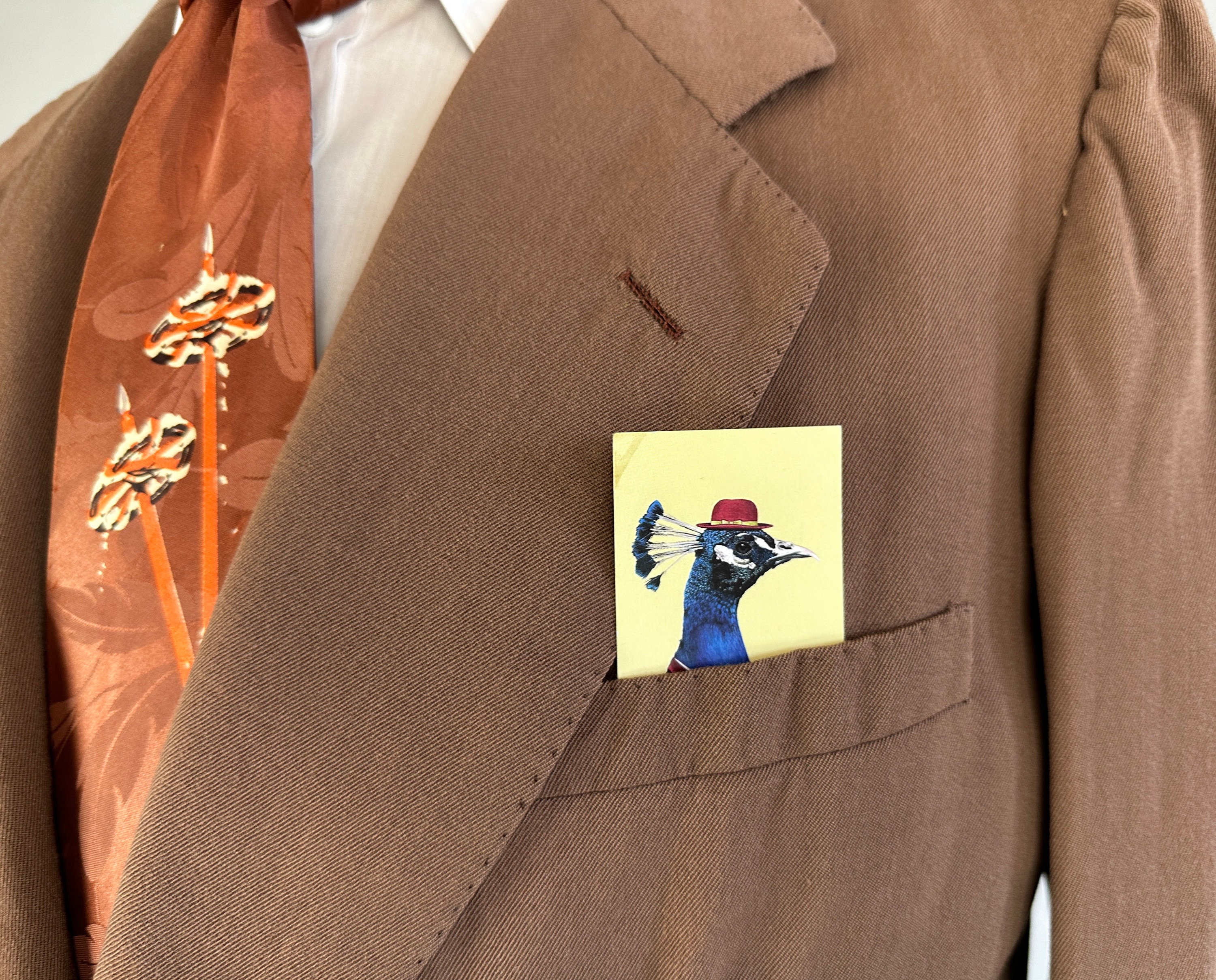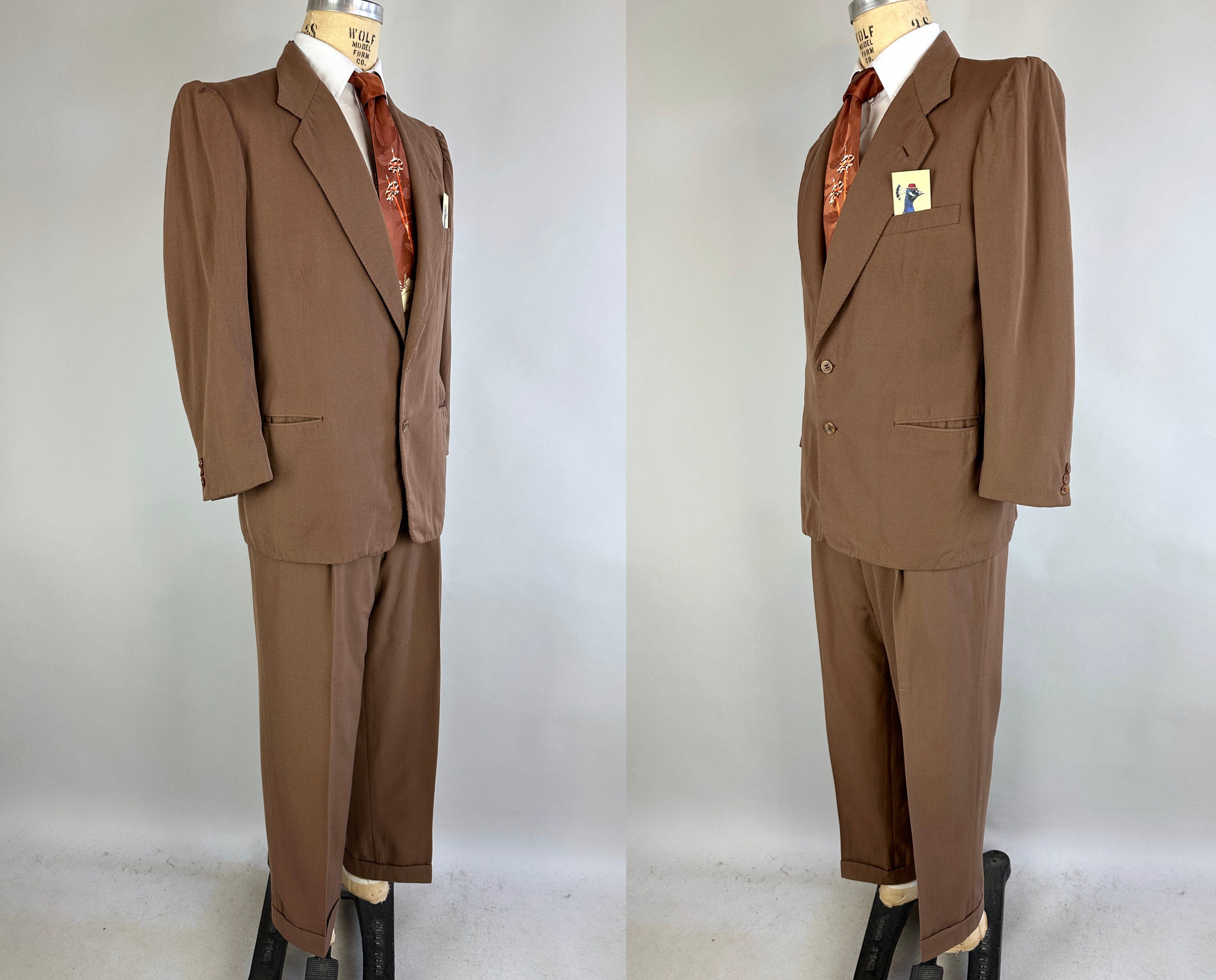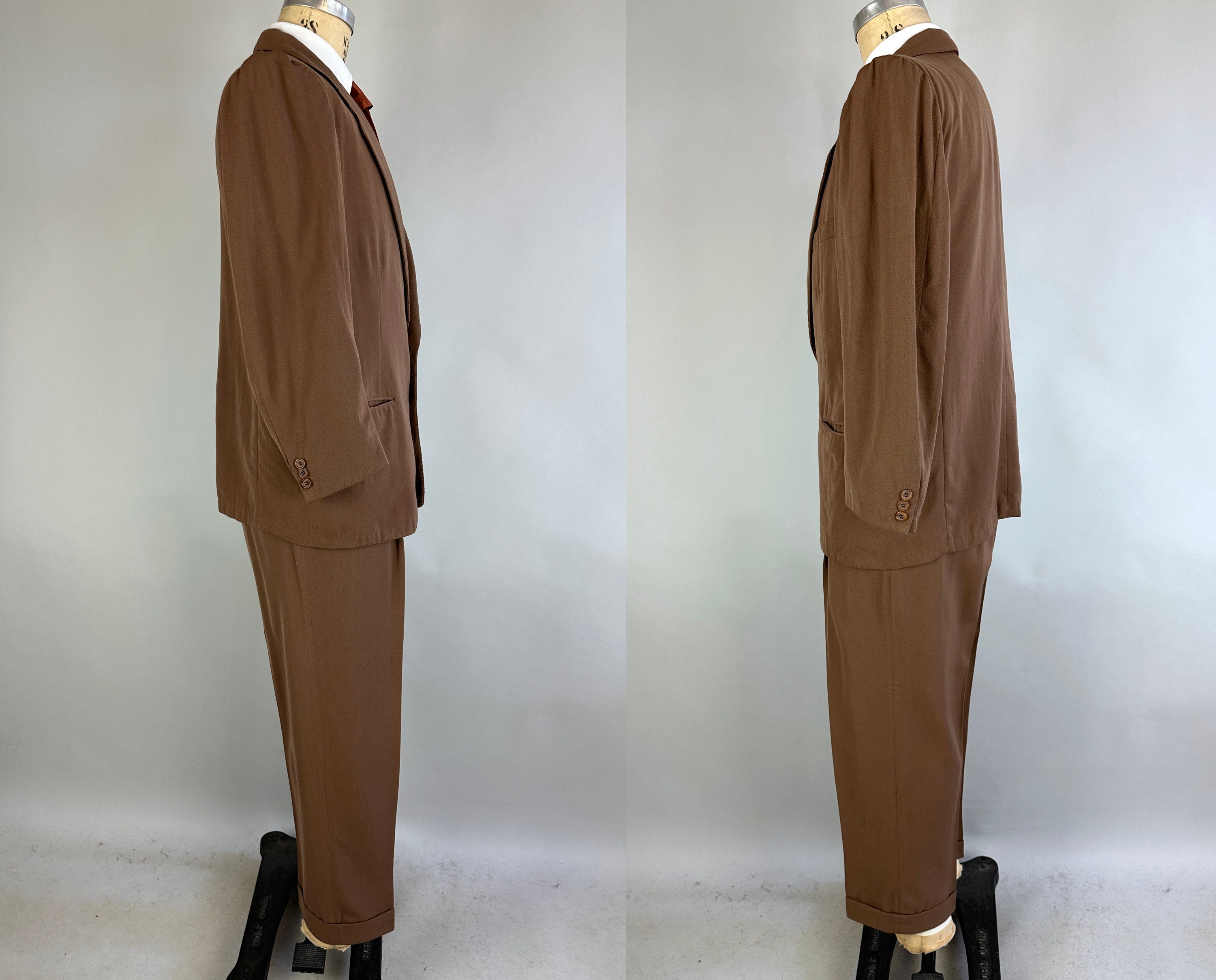 Swing along with Sinatra in this incredibly dashing 1950’s suit! Made of tawny brown wool gabardine, the single breasted jacket has top-stitching around the wide lapels, a two-button closure with notch lapels, three matching buttons at each cuff, three welted pockets, two inner pockets, butterfly lining, shoulder pads, and ventless back. The trousers have a pleated front with dropped belt loops, brass zip fly, five welted pockets with one buttoning in the back, inner suspender buttons, and cuffed hems. By Stephen Girard of Boston Massachusetts. This suit is in great vintage condition, with no holes, stains, odors to note.