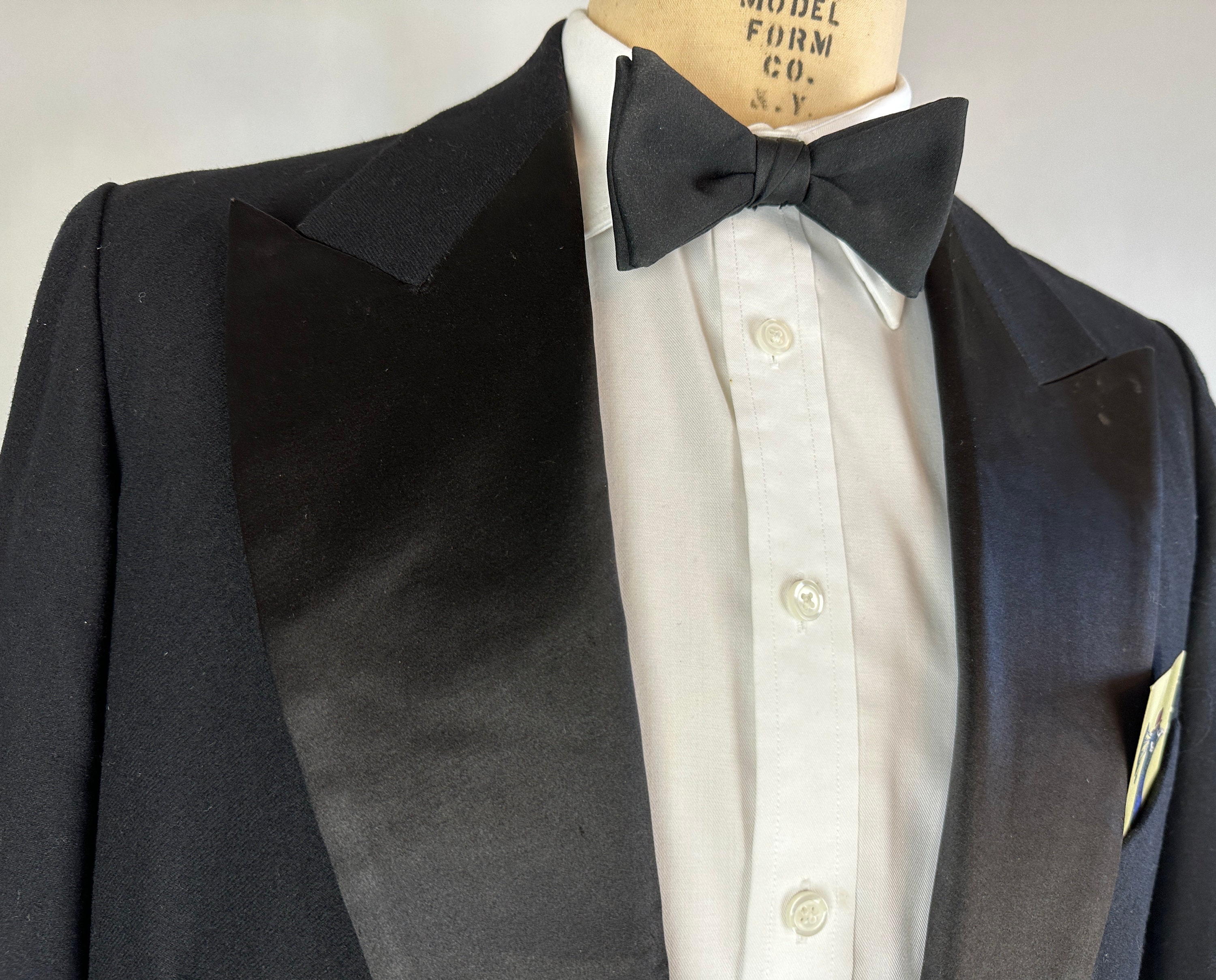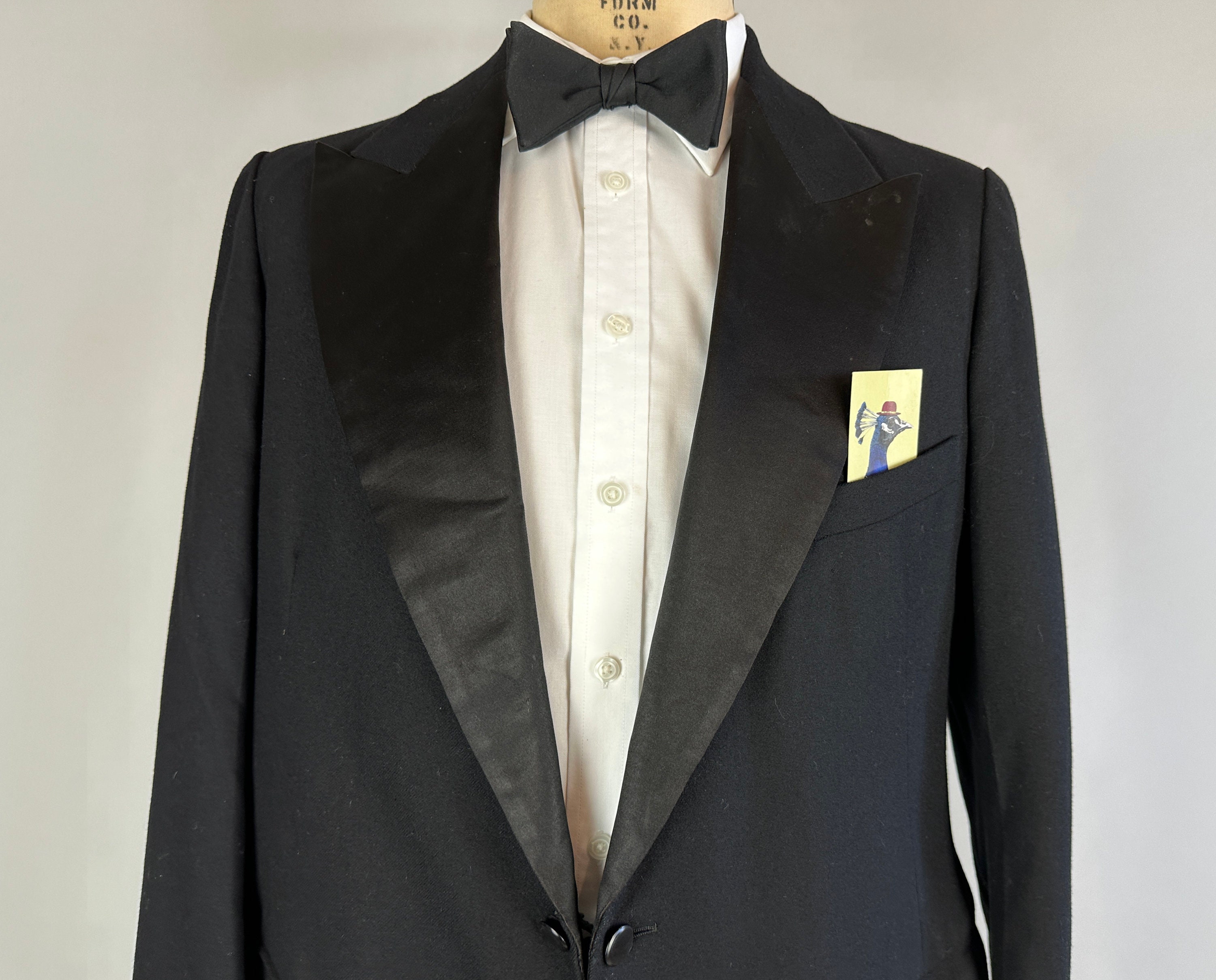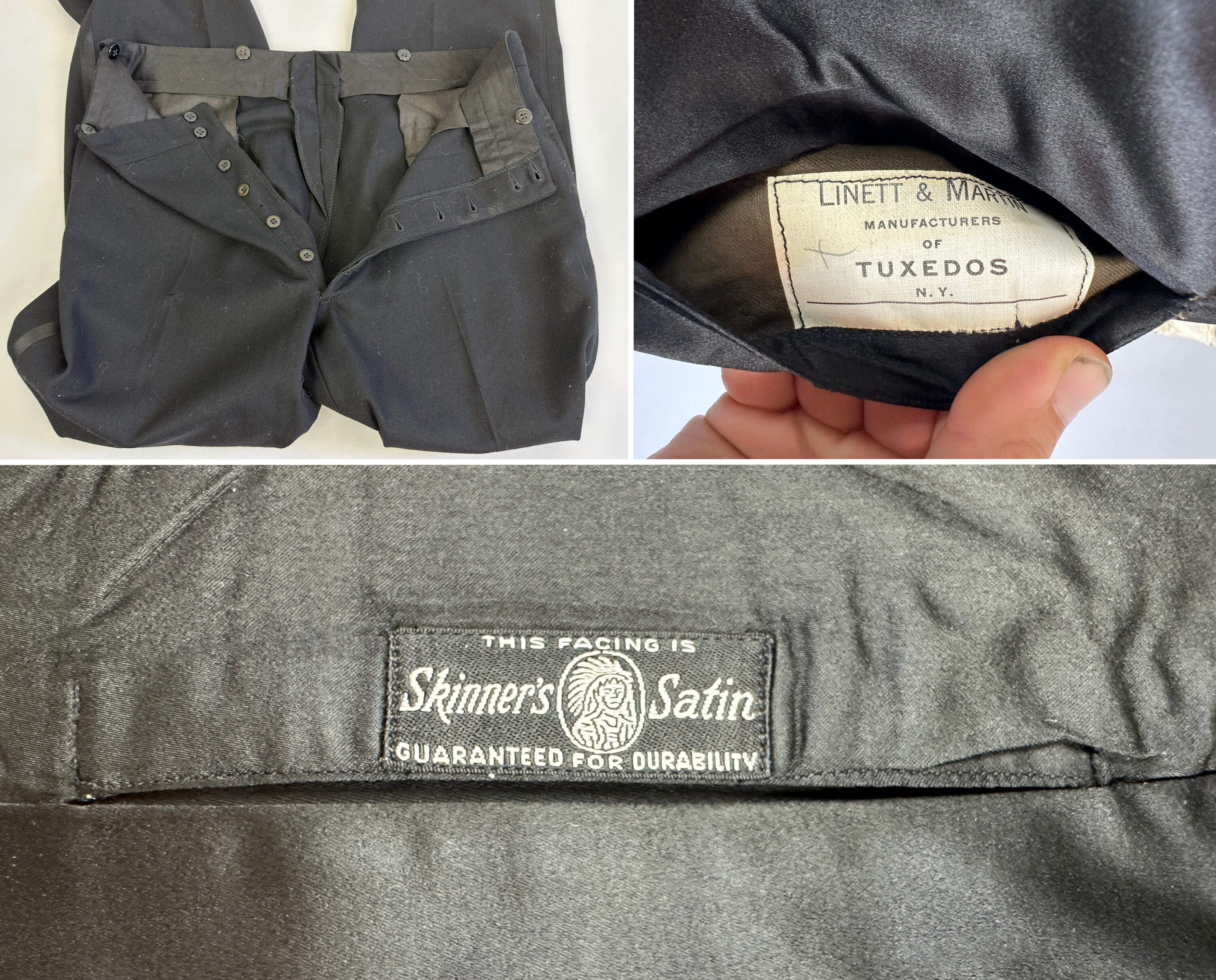 Very classy 1930s two piece black wool tuxedo for the true gentleman! Very sought-after era-appropriate single-breasted jacket with sharp peak-lapels features a single button closure with "after dinner" link-button option, silk satin lapels, two flapped hip pockets, jetted chest pocket, interior slash pocket, ventless back, matching two button cuffs, shoulder pads, and butterfly lining. Trousers feature a button fly, inner suspender buttons, two hip pockets and two button back pockets with an additional coin/watch pocket, matching satin stripe down the sides, uncuffed hems, and flat front. By "Linett and Martin" of New York. This suit is in great vintage condition, with no holes, stains, odors to note.
