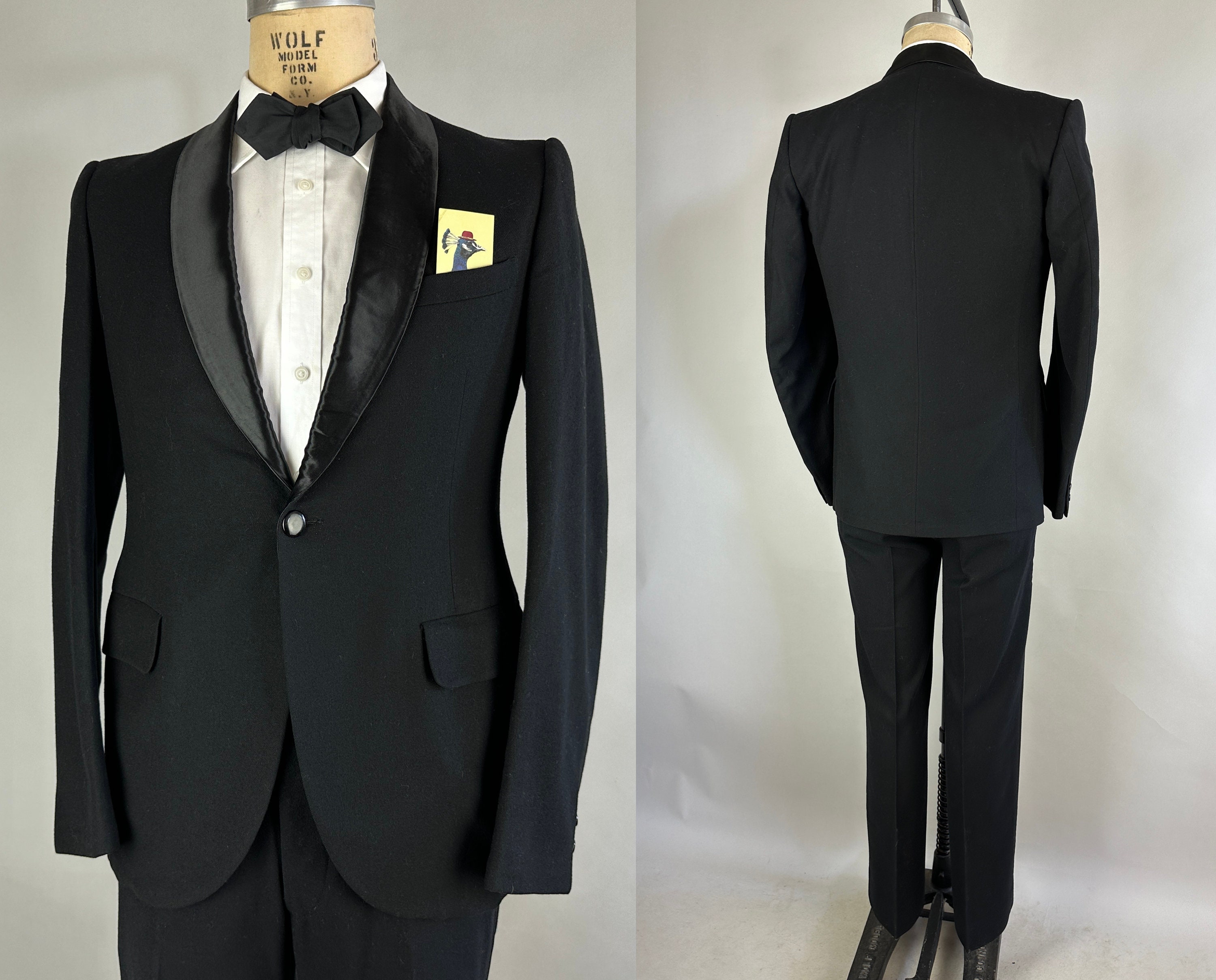 Ring in the New Year wearing this dapper vintage tuxedo originally purchased a week before New Years Eve of 1931! Soft black wool with silk shawl lapels, this jacket also features a single-button closure, pairs of matching cuff buttons, jetted chest pocket, two flapped hip pockets, and one inner pocket, butterfly lining, shoulder pads, and an unvented back. Trousers have a flat-front, silk tuxedo-stripe down the sides, 5 pockets, button-fly closure, and a full set of inner suspender buttons. By "A May & Sons" (later May Co, later bought by Macys) of Grand Rapids, Michigan and dated December 18th, 1931 - so close to New Years, surely this was bought to ring in the New Year! This suit is in great vintage condition, with no holes, stains, odors to note.