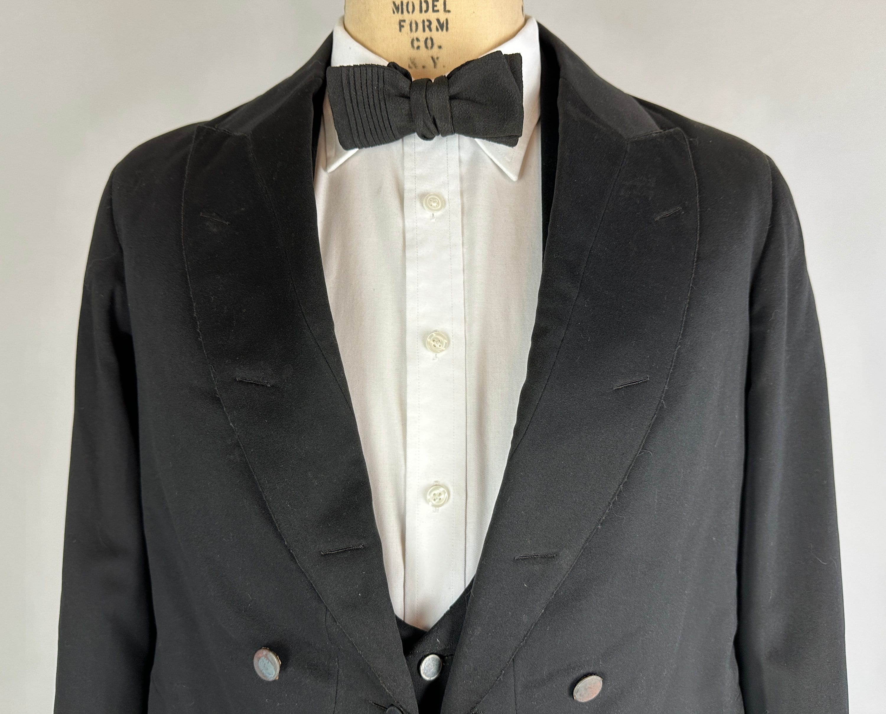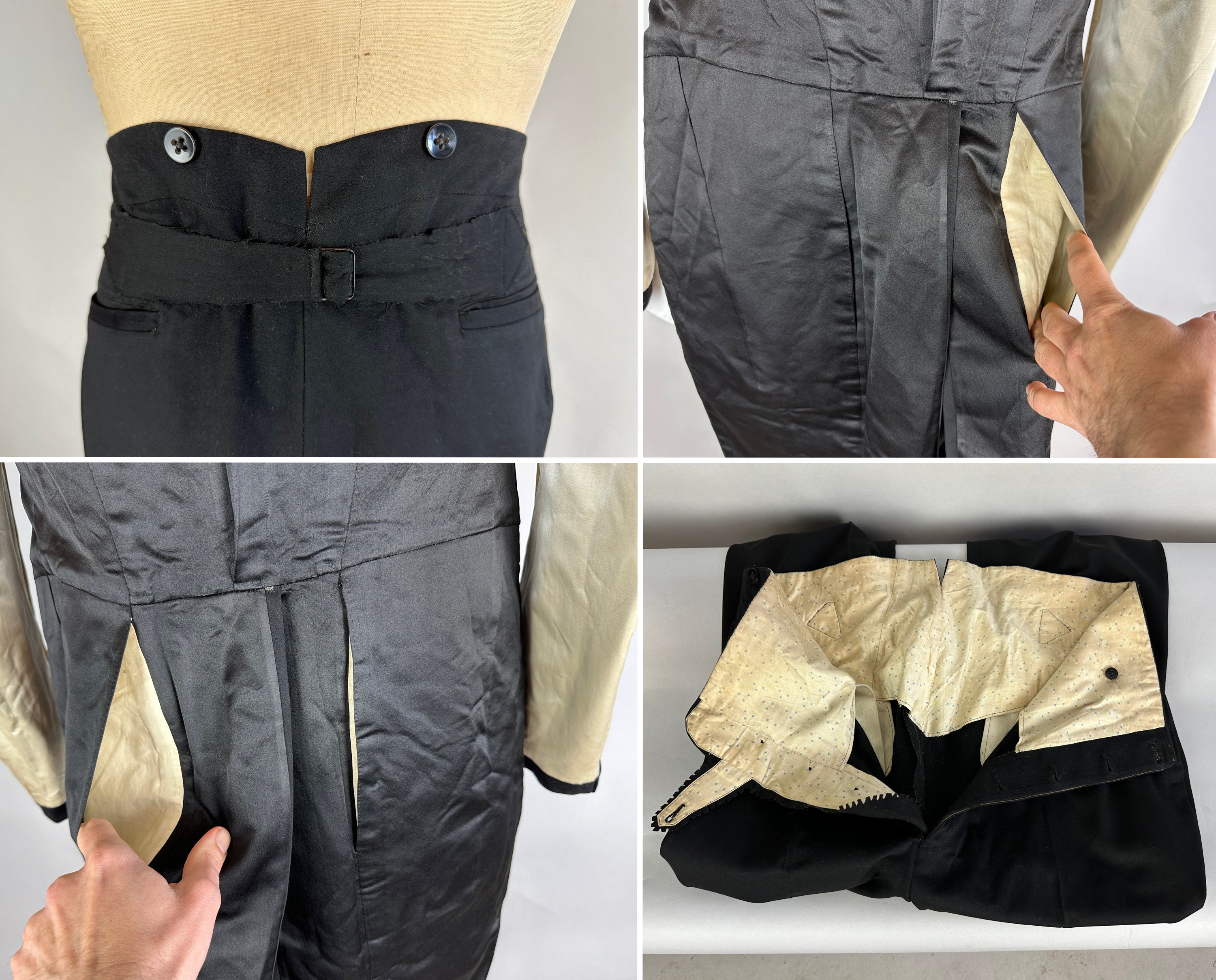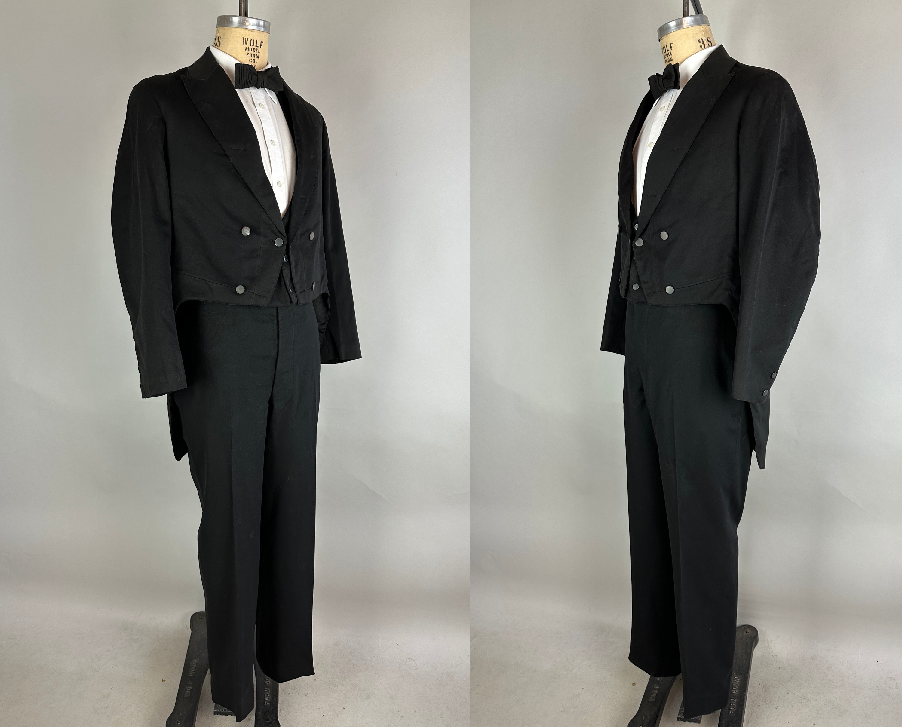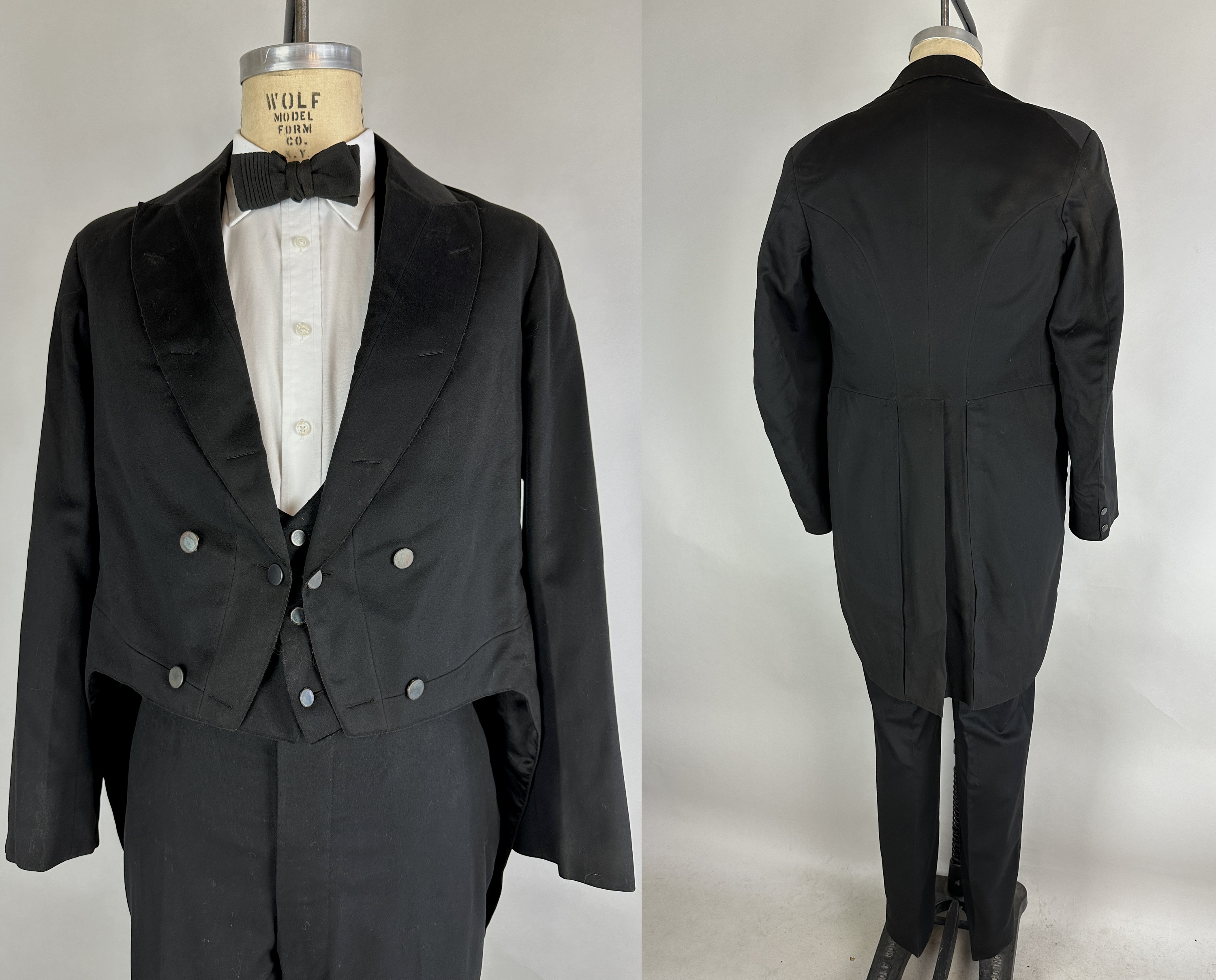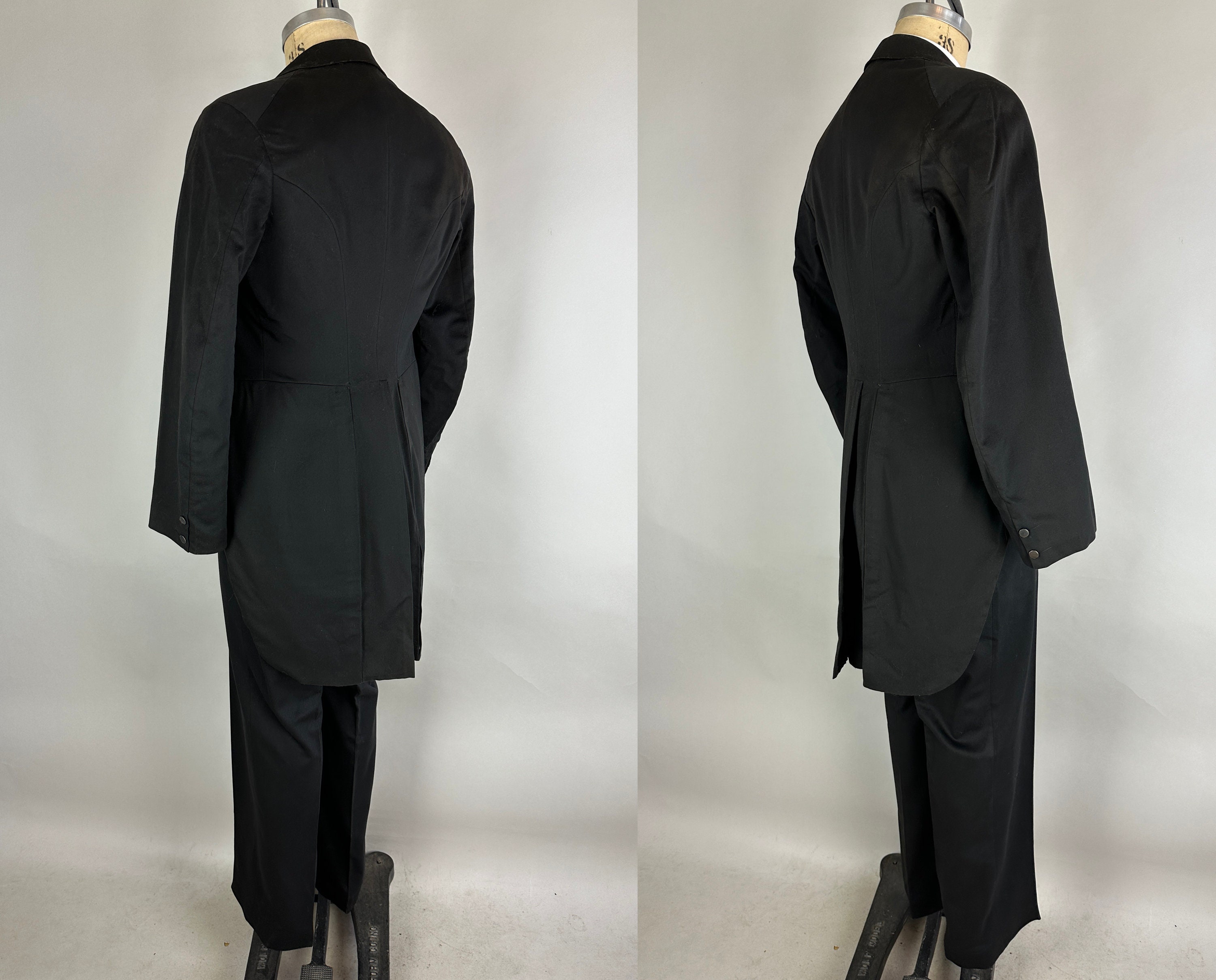 Take a stroll down the boulevard wearing the finery of a gentleman from another era in this late-Victorian turn of the century suit! Soft black wool throughout all three pieces. Jacket/tailcoat features four decorative steel buttons, with pairs of matching buttons at each cuff, steel link-button closure, wide peaked lapels with working buttonholes, shapely back seaming, fully lined in silk with two inner chest pockets and two glove-pockets in the tails. Vest has a matching 3-button closure, deep shawl collar, and four jetted pockets. Lined in cotton and backed in black silk with a back-adjuster marked "Paris". Trousers feature a buckle-back, a full set of outer-suspender buttons, button-fly, fun confetti cotton lining the waist, 5 pockets, and slanted cuffs. This suit dates to the late-1800s. This suit is in incredibly great vintage condition for its age and generous size, even the silk lining the arms is in wonderful, stable shape! No holes, stains, nor odors to note.