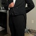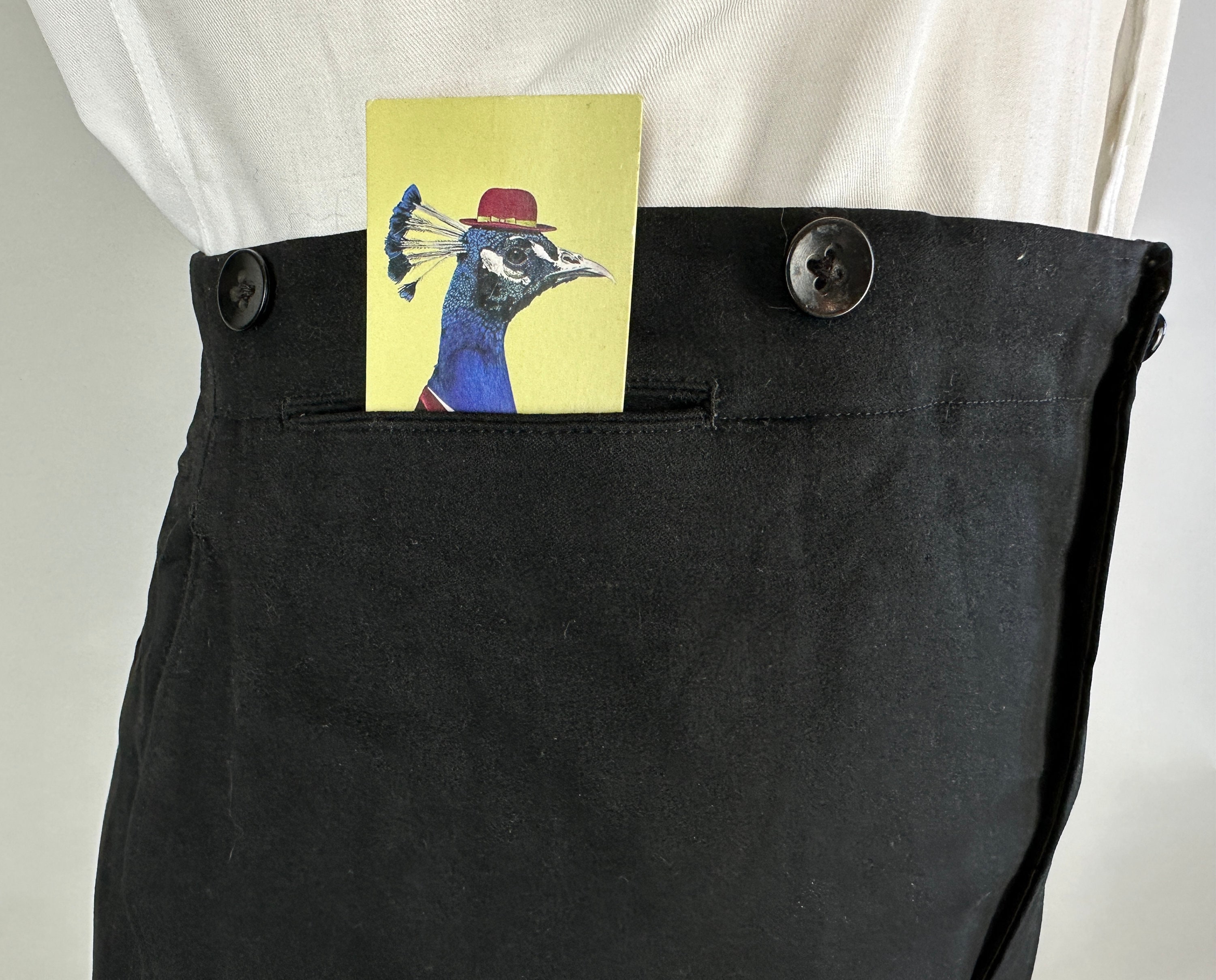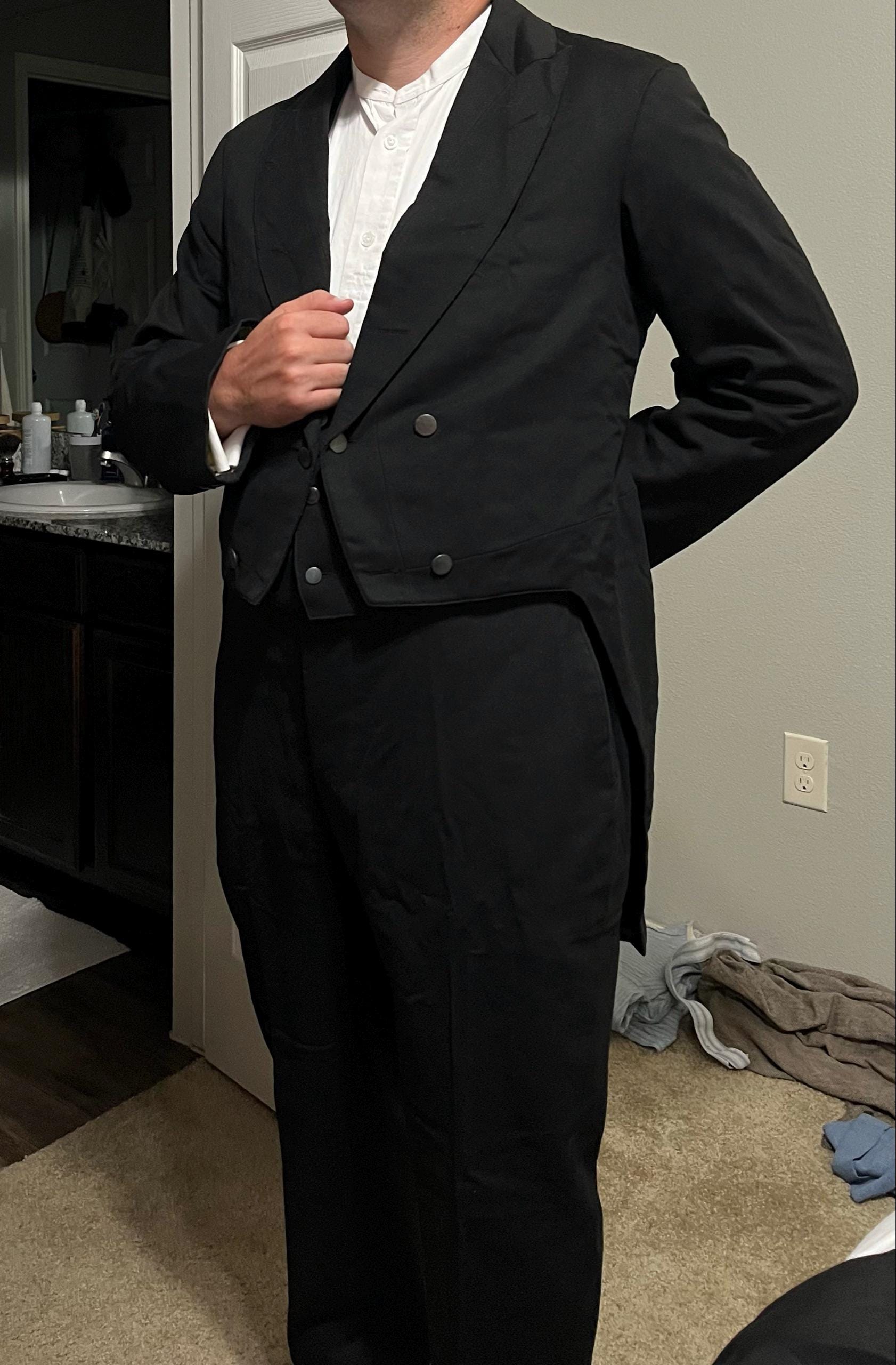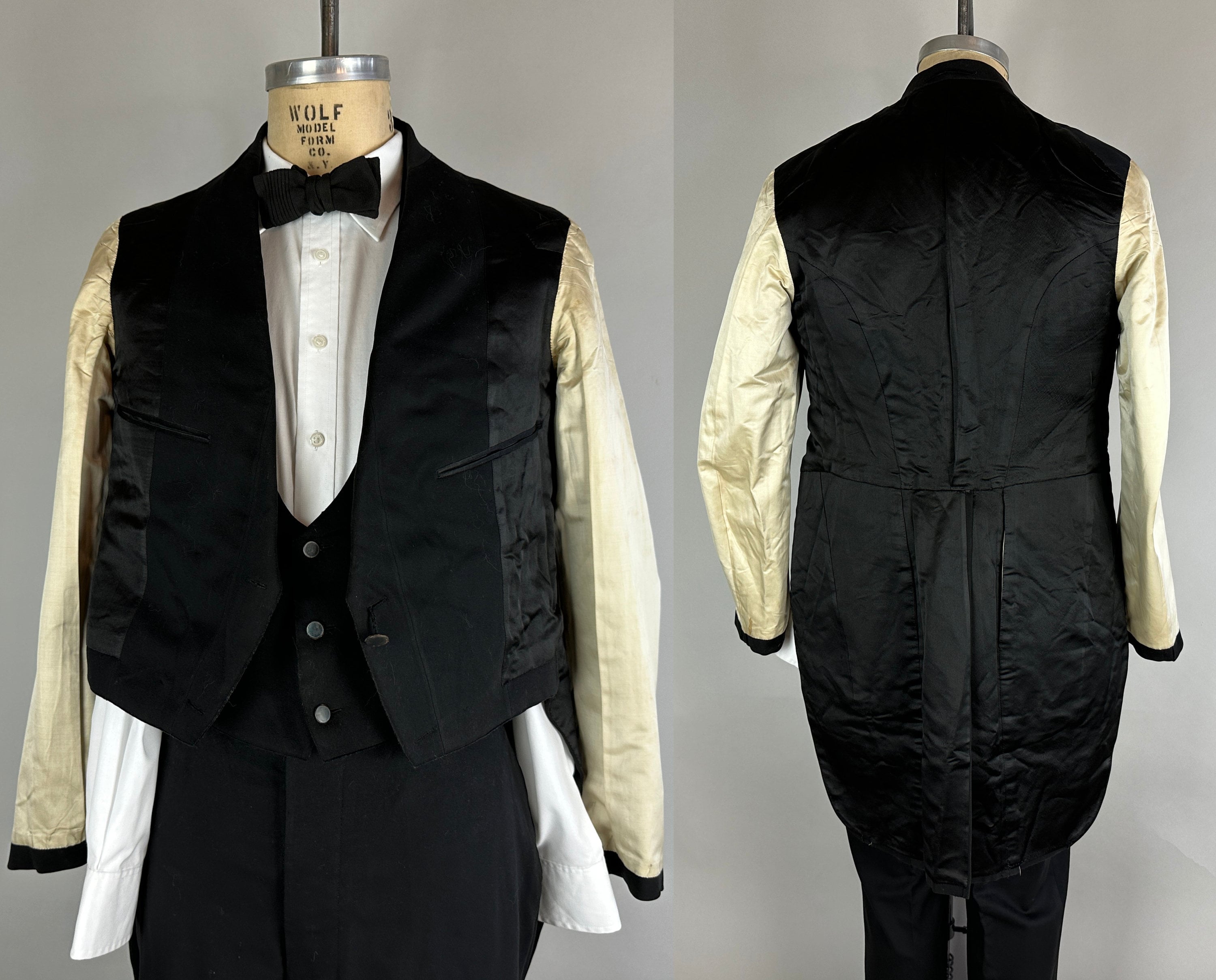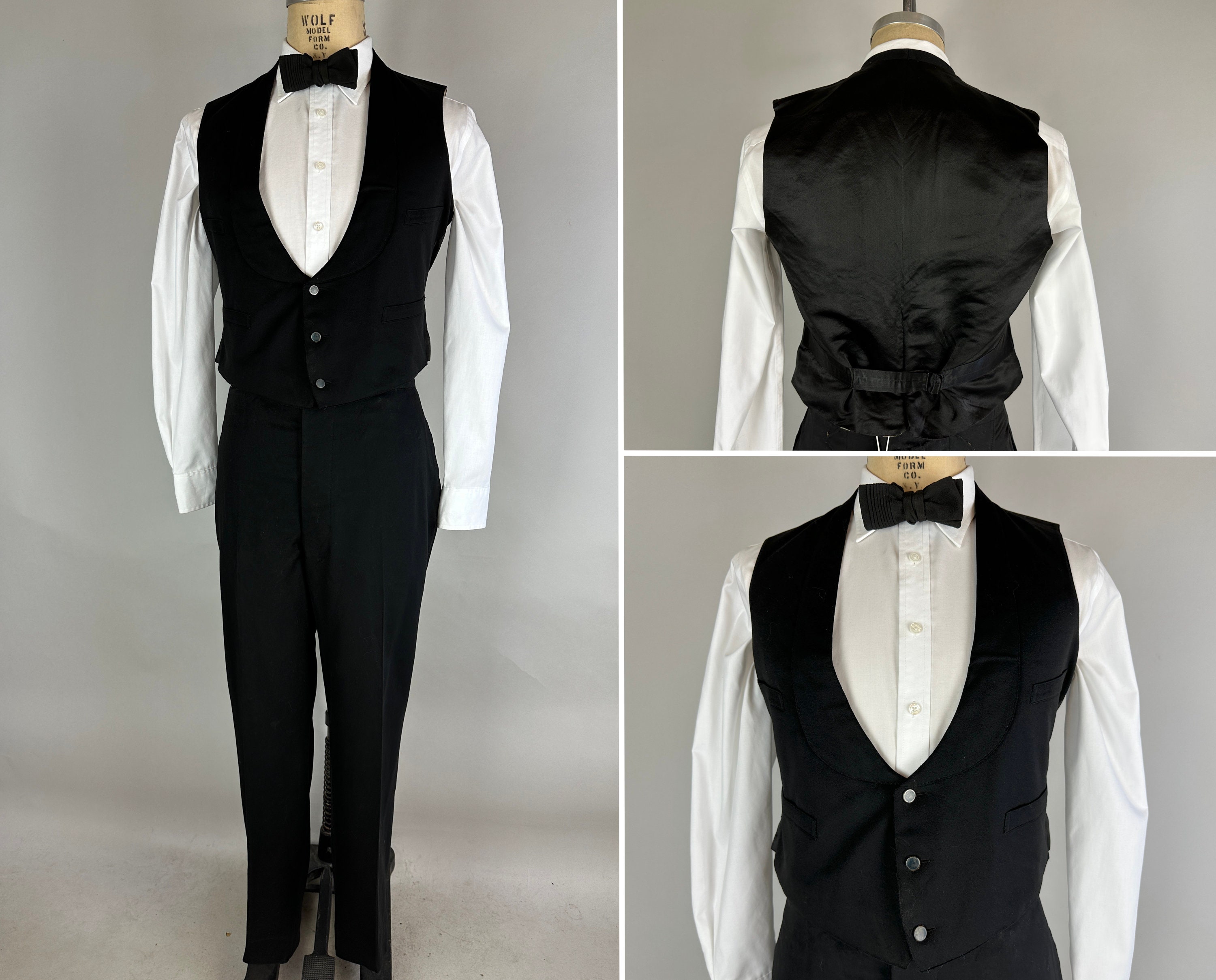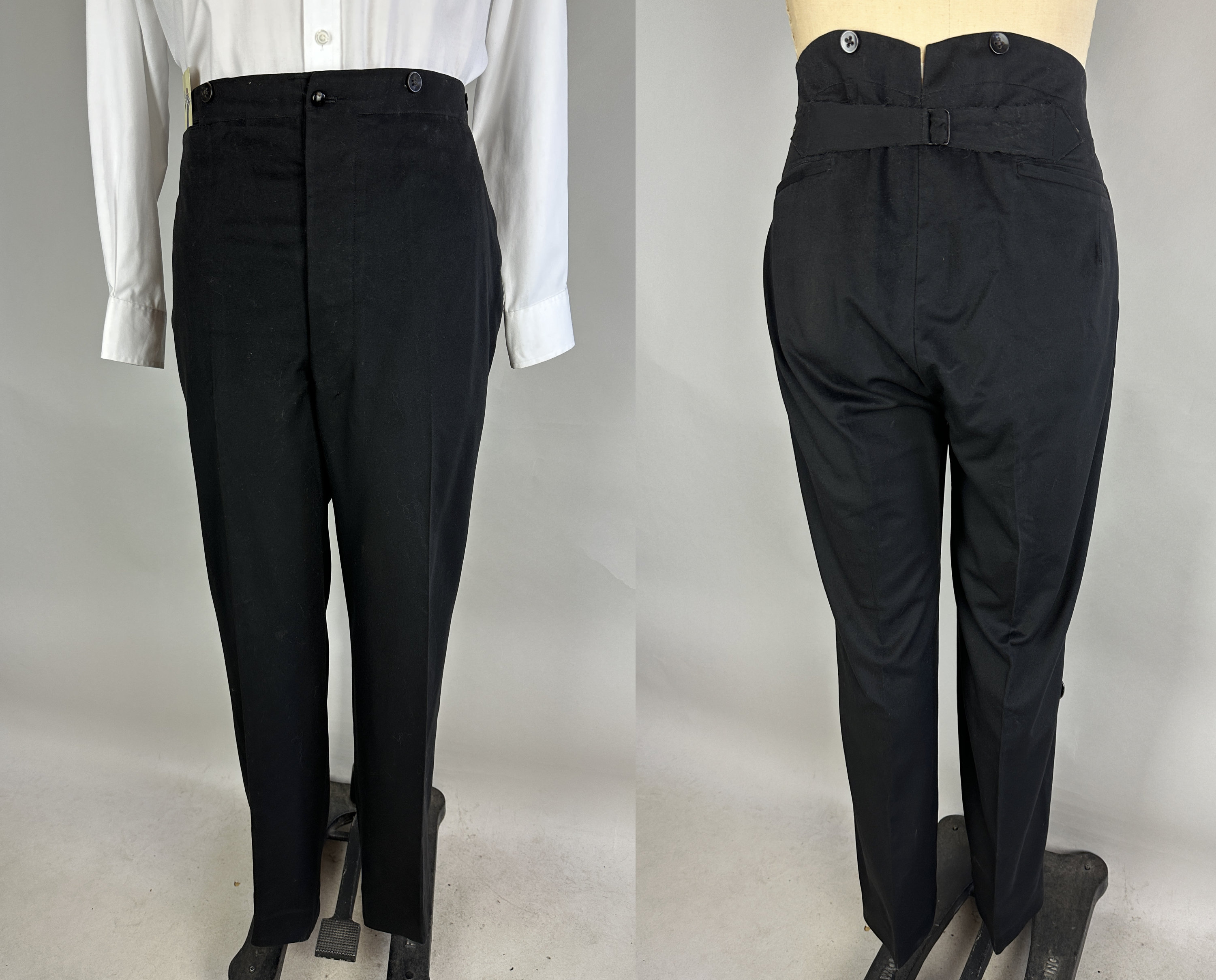 Take a stroll down the boulevard wearing the finery of a gentleman from another era in this late-Victorian turn of the century suit! Soft black wool throughout all three pieces. Jacket/tailcoat features four decorative steel buttons, with pairs of matching buttons at each cuff, steel link-button closure, wide peaked lapels with working buttonholes, shapely back seaming, fully lined in silk with two inner chest pockets and two glove-pockets in the tails. Vest has a matching 3-button closure, deep shawl collar, and four jetted pockets. Lined in cotton and backed in black silk with a back-adjuster marked "Paris". Trousers feature a buckle-back, a full set of outer-suspender buttons, button-fly, fun confetti cotton lining the waist, 5 pockets, and slanted cuffs. This suit dates to the late-1800s. This suit is in incredibly great vintage condition for its age and generous size, even the silk lining the arms is in wonderful, stable shape! No holes, stains, nor odors to note.