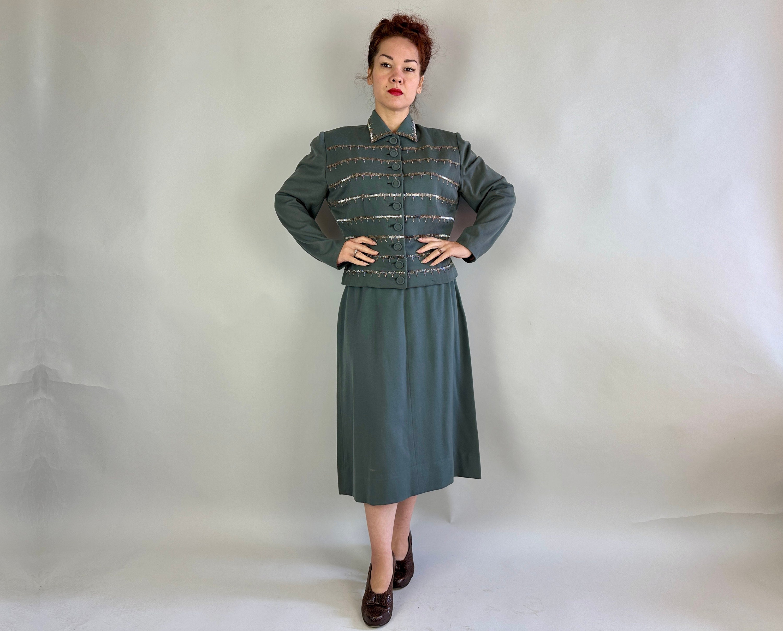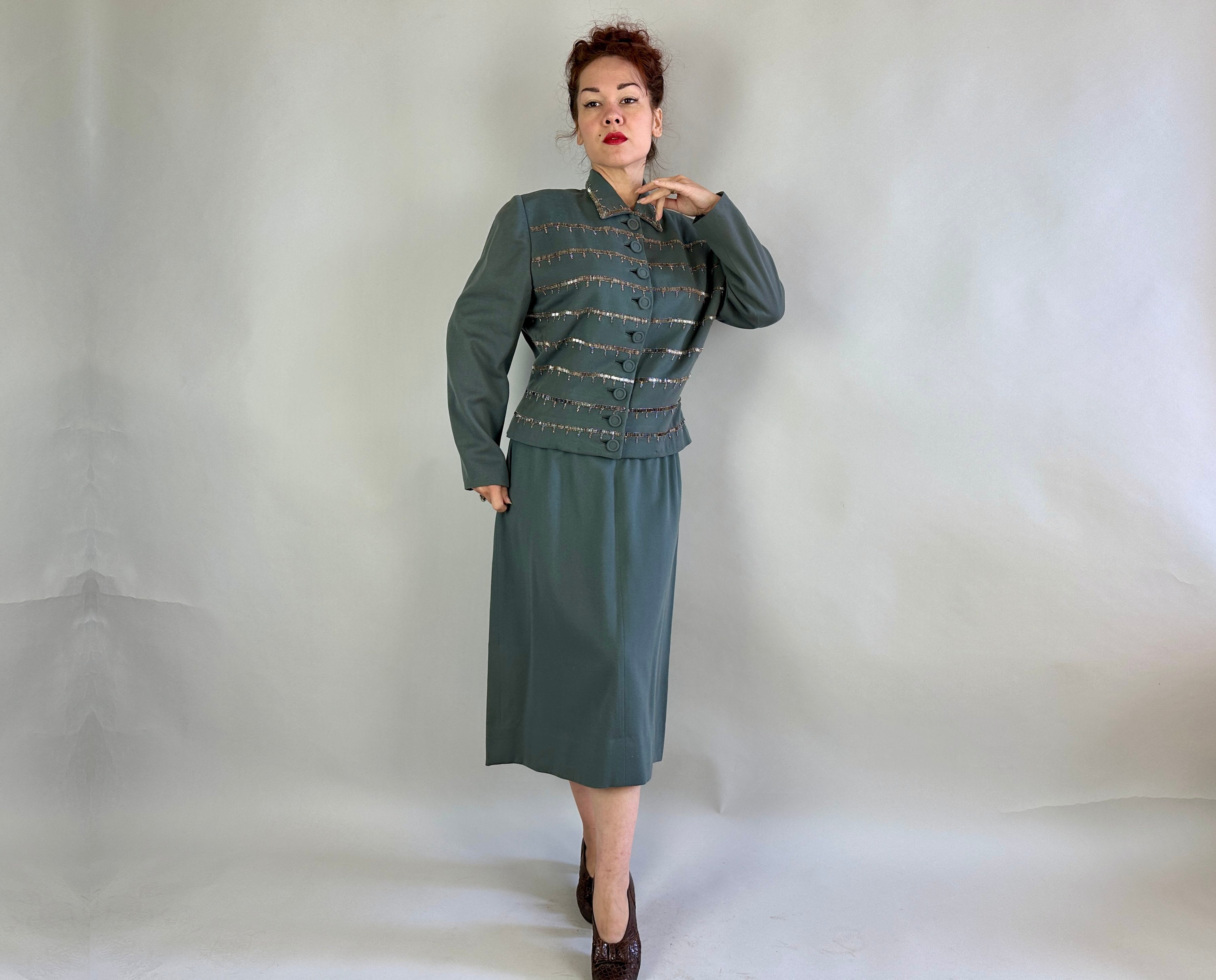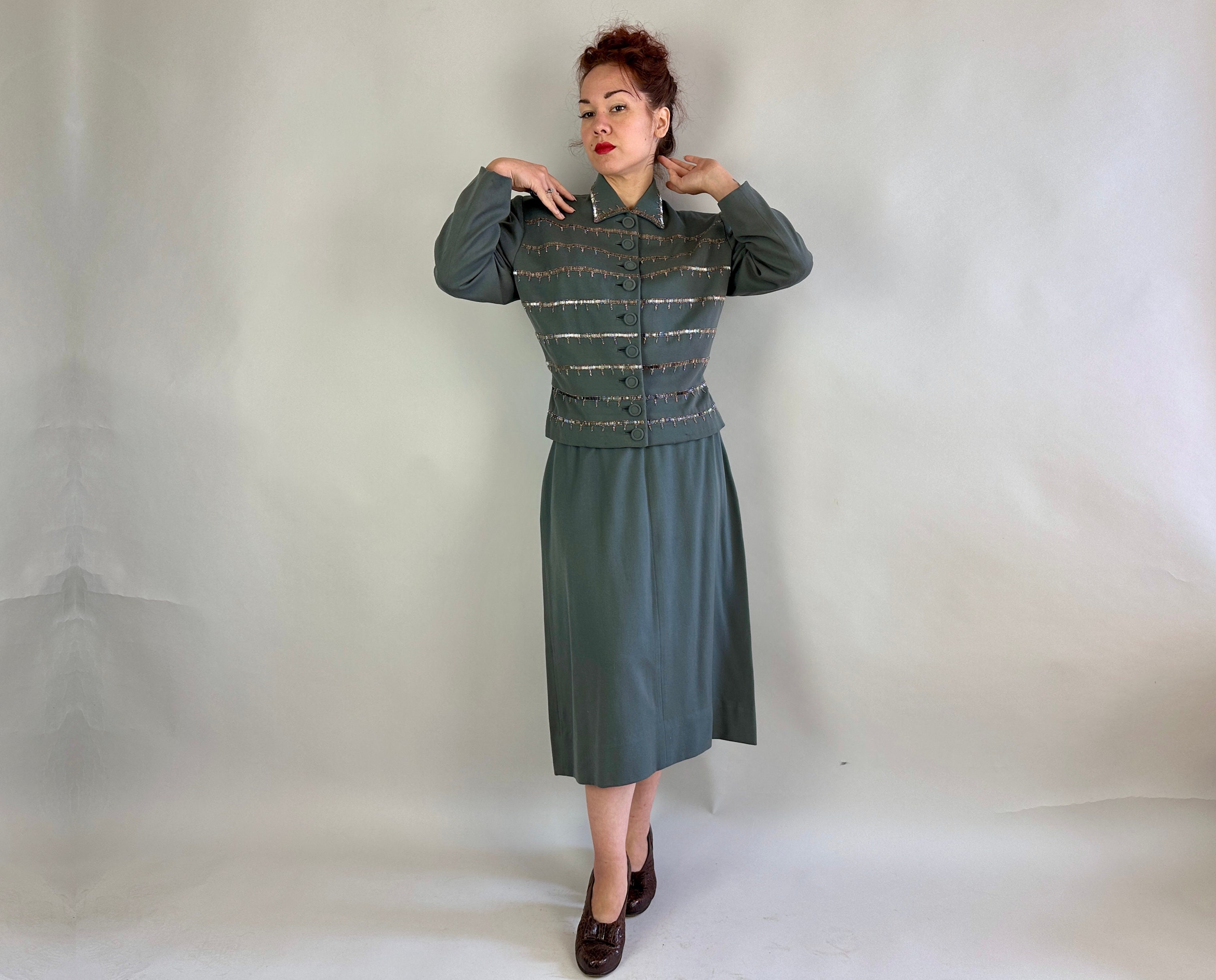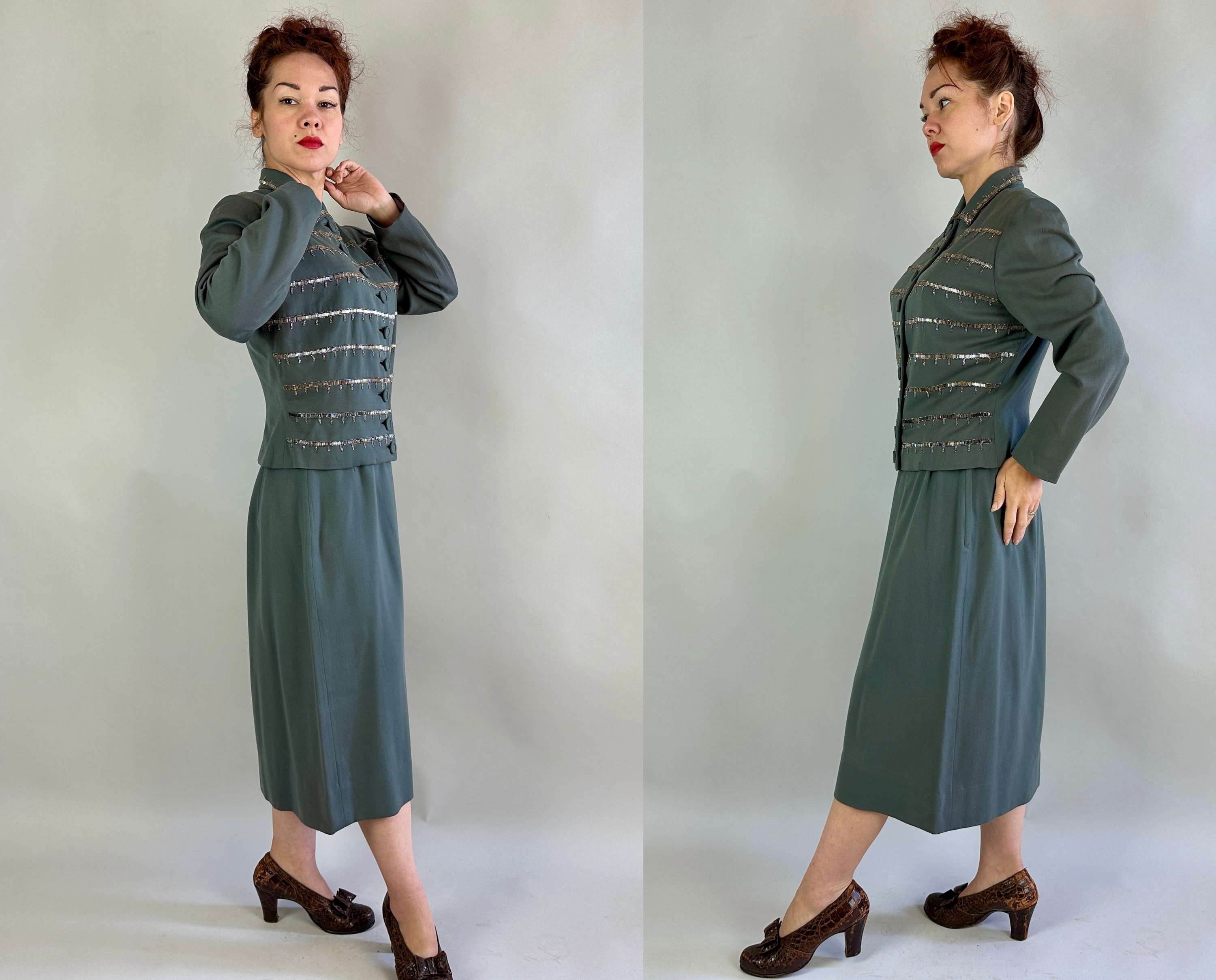 He'll be over the moon when you walk into the gin joint wearing this 1940’s suit! This two piece cocktail suit is heavily beaded with flashy silver beads with some giving off an oil slick sheen as it moves under light. The fabric is a sage green-blue wool gabardine which is also used to create the buttons. The jacket is slightly cropped and has light waist shaping and a full rayon crepe lining and the pencil skirt fastens with a metal "Talon" zipper on the side. Another fabulous set from "Fred A. Block". This suit is in great vintage condition, with no holes, stains, or odors to note. Suit has been pinned on model to show fit.