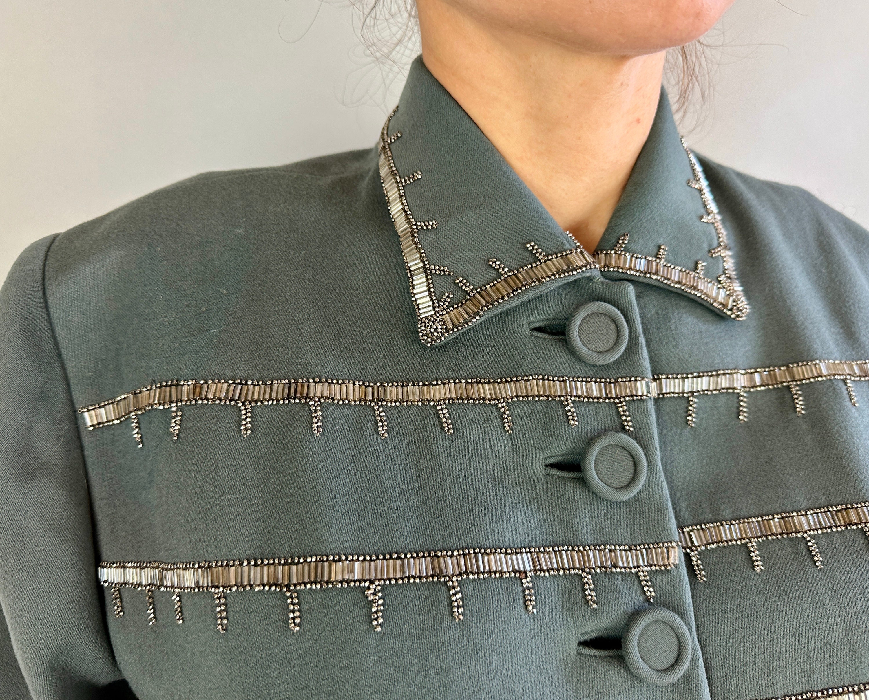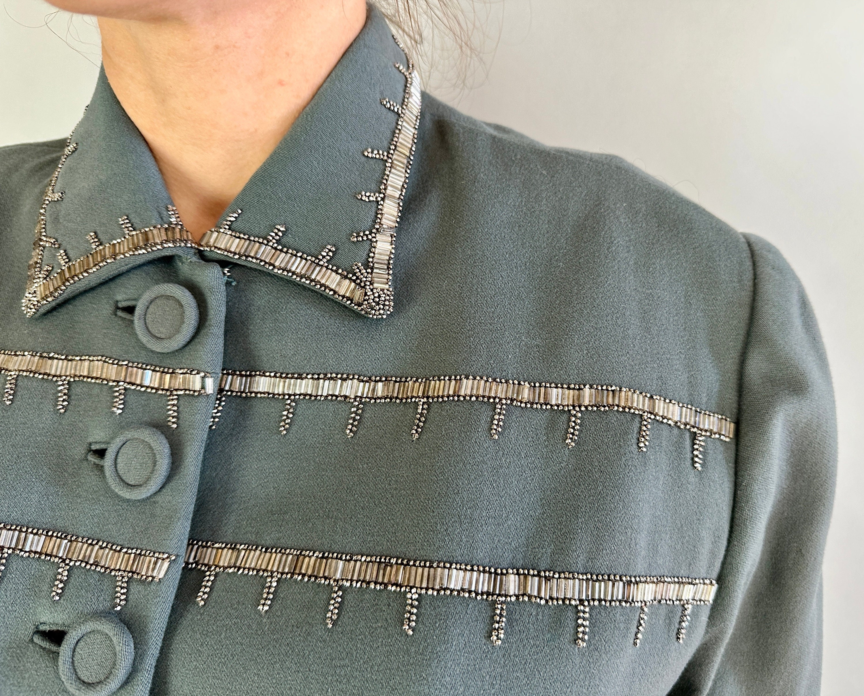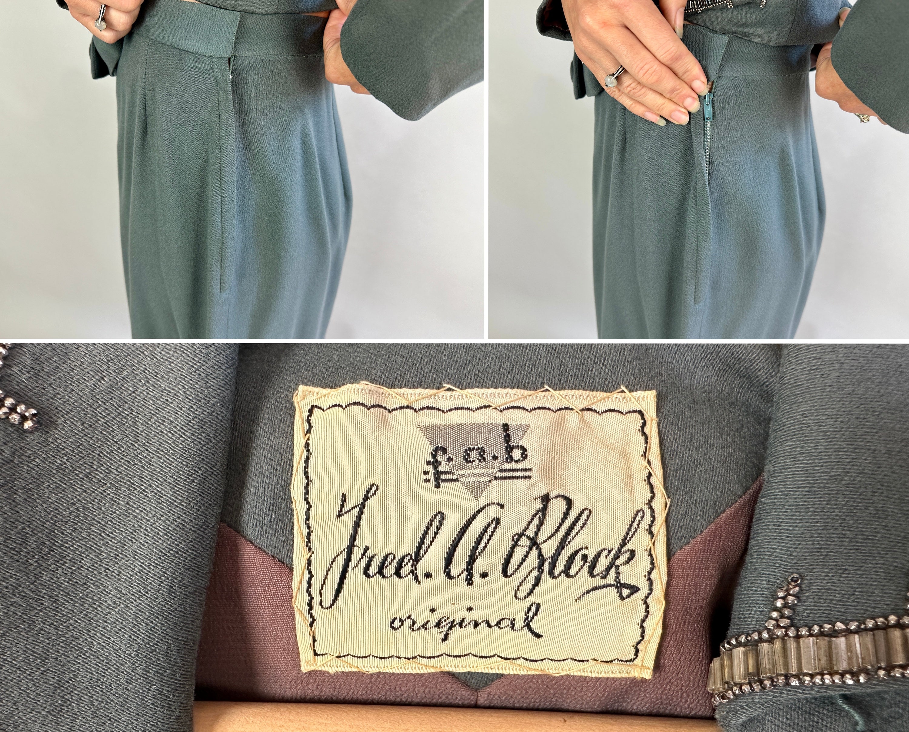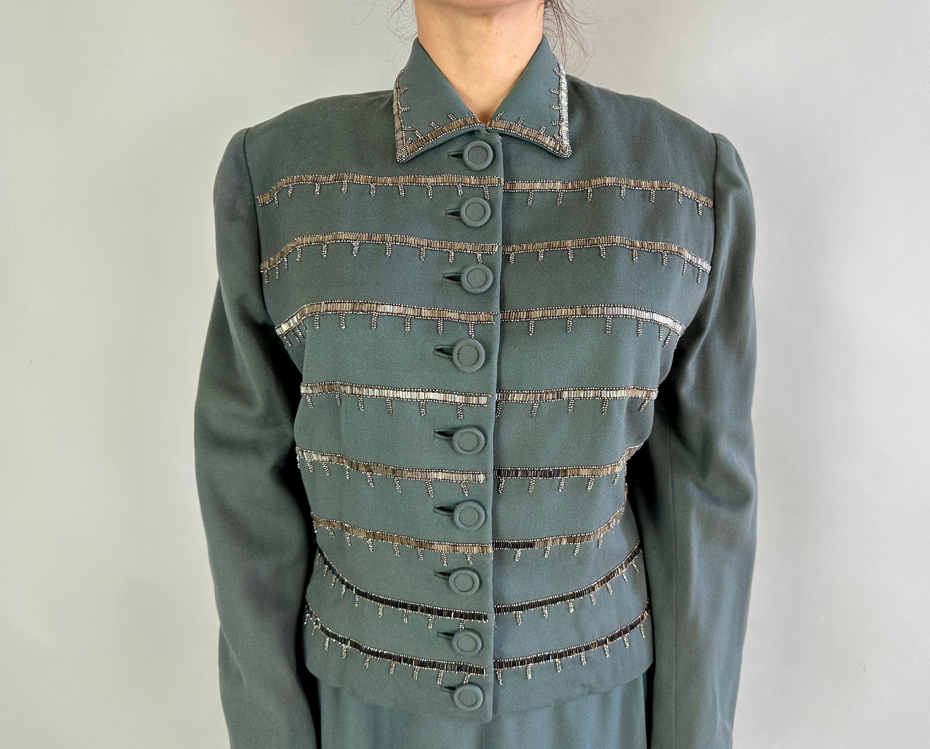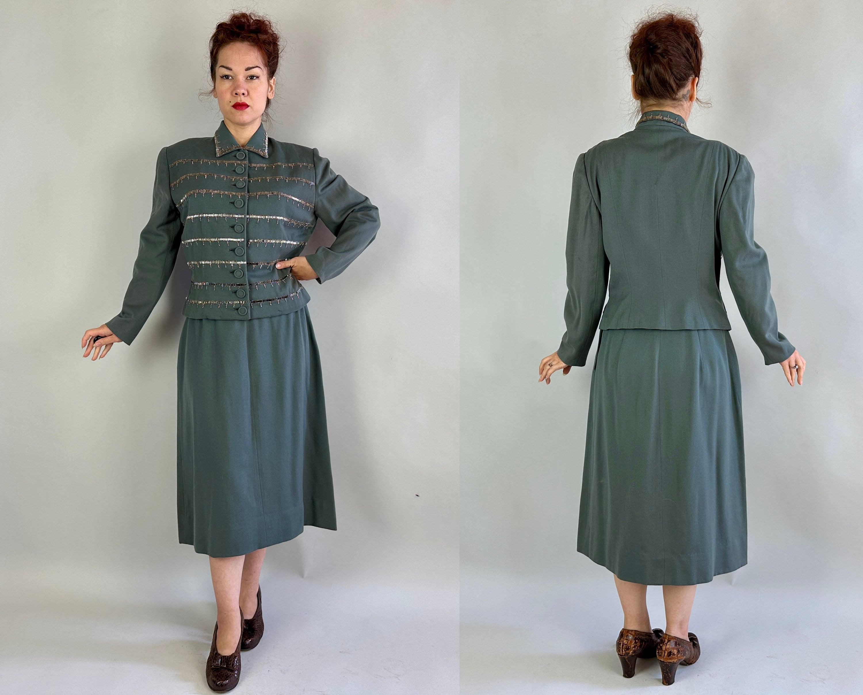 He'll be over the moon when you walk into the gin joint wearing this 1940’s suit! This two piece cocktail suit is heavily beaded with flashy silver beads with some giving off an oil slick sheen as it moves under light. The fabric is a sage green-blue wool gabardine which is also used to create the buttons. The jacket is slightly cropped and has light waist shaping and a full rayon crepe lining and the pencil skirt fastens with a metal "Talon" zipper on the side. Another fabulous set from "Fred A. Block". This suit is in great vintage condition, with no holes, stains, or odors to note. Suit has been pinned on model to show fit.