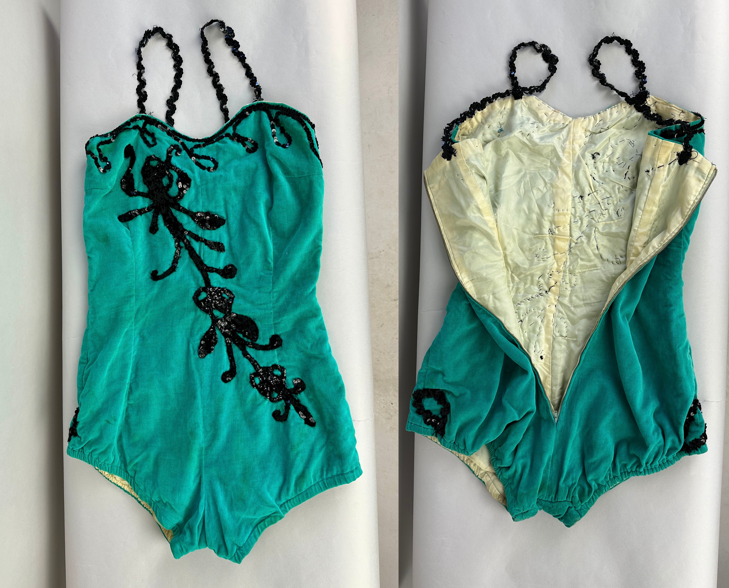 Your shimmy and shake will cause a quake in this saucy 1950’s burlesque one piece! This cotton velveteen costume is a gorgeous teal offset with black sequins swirling across the body and making up the straps. It is fully lined with acetate and an extra long metal "Talon" zip down the back makes for quick changes. This set is in great vintage condition, a faint smudge on the hip but no holes or odors to note.