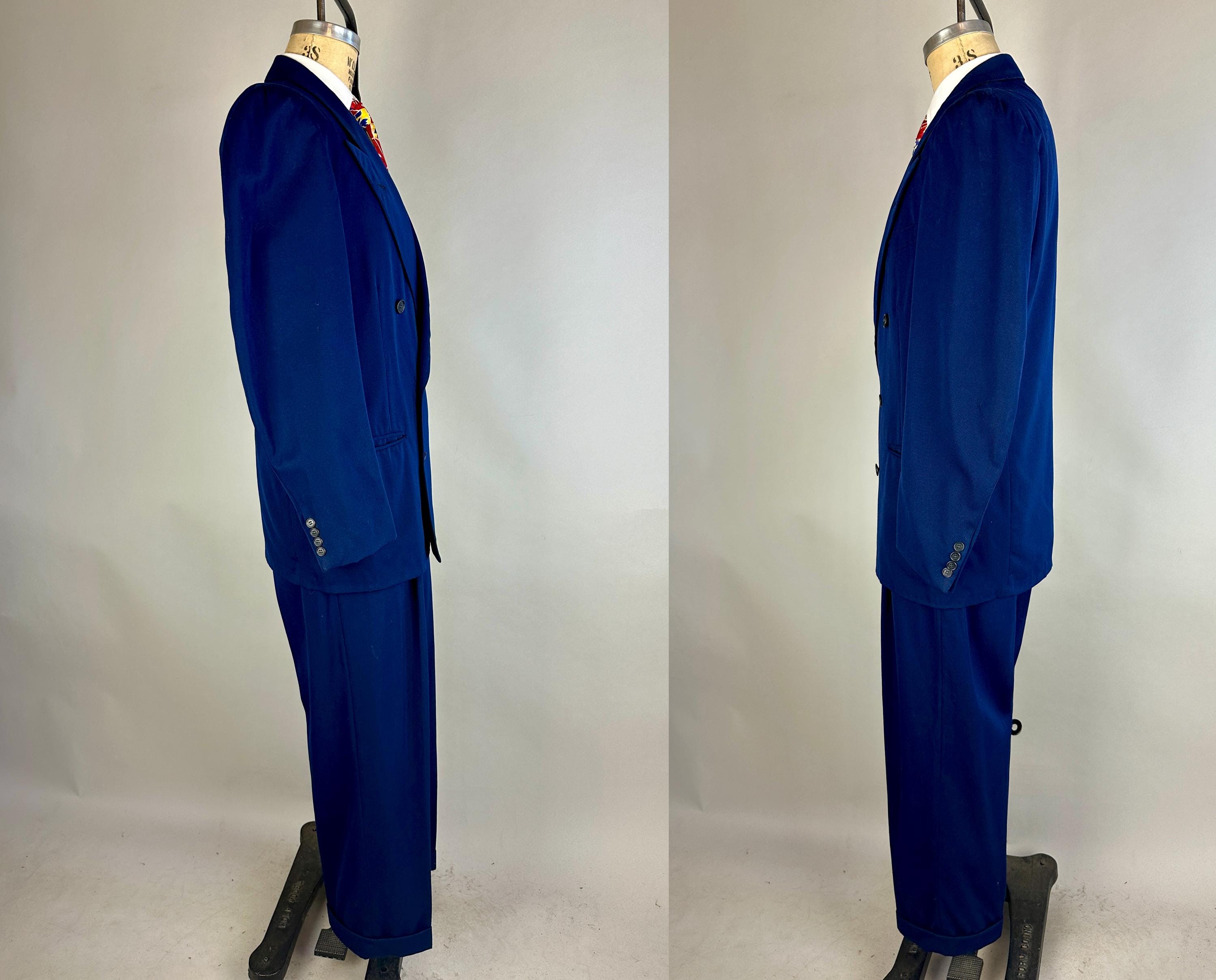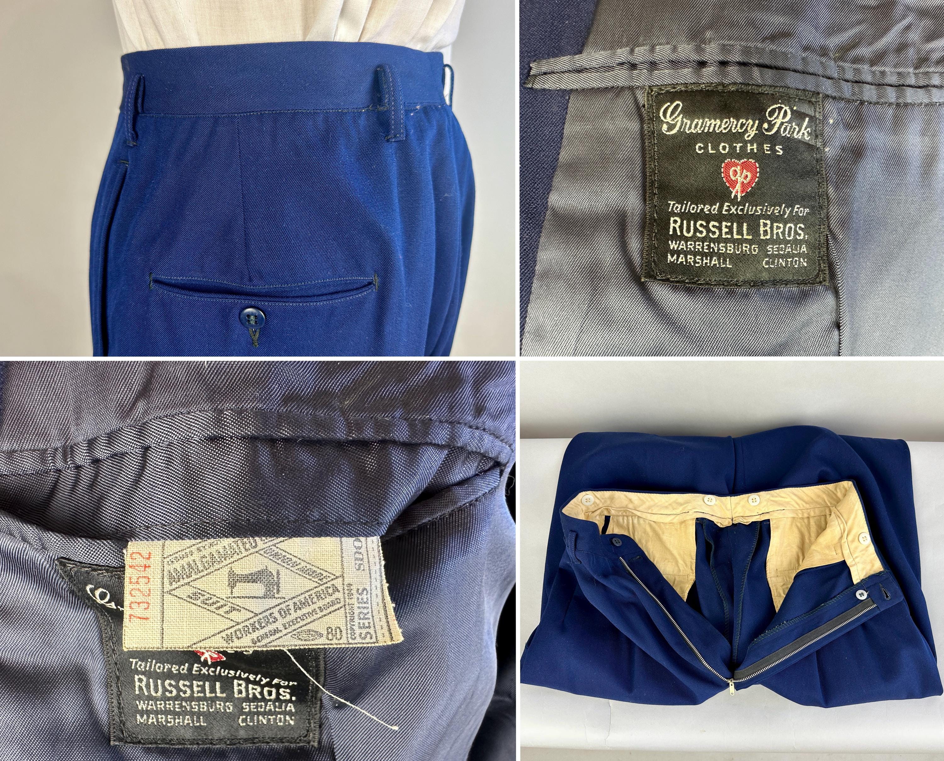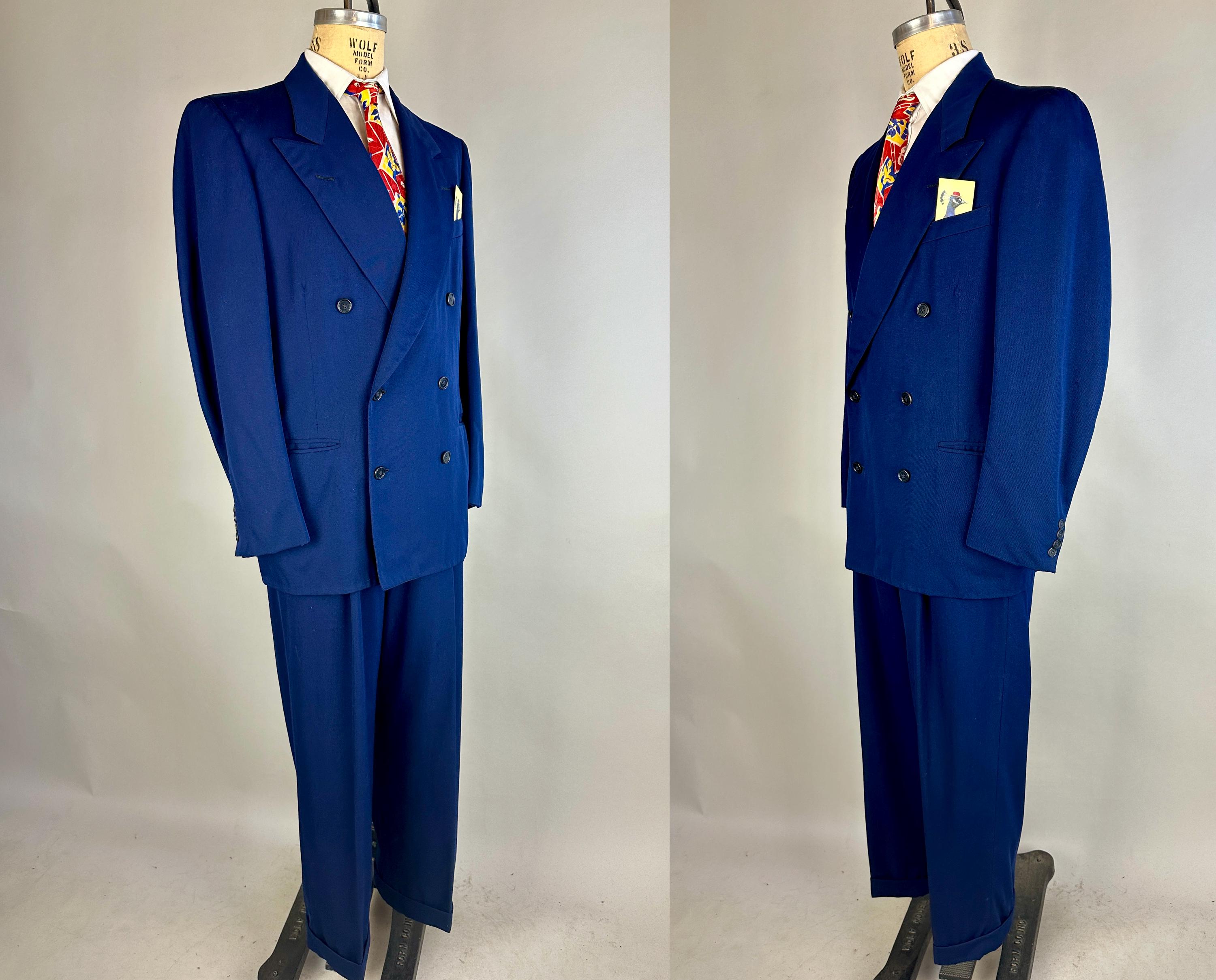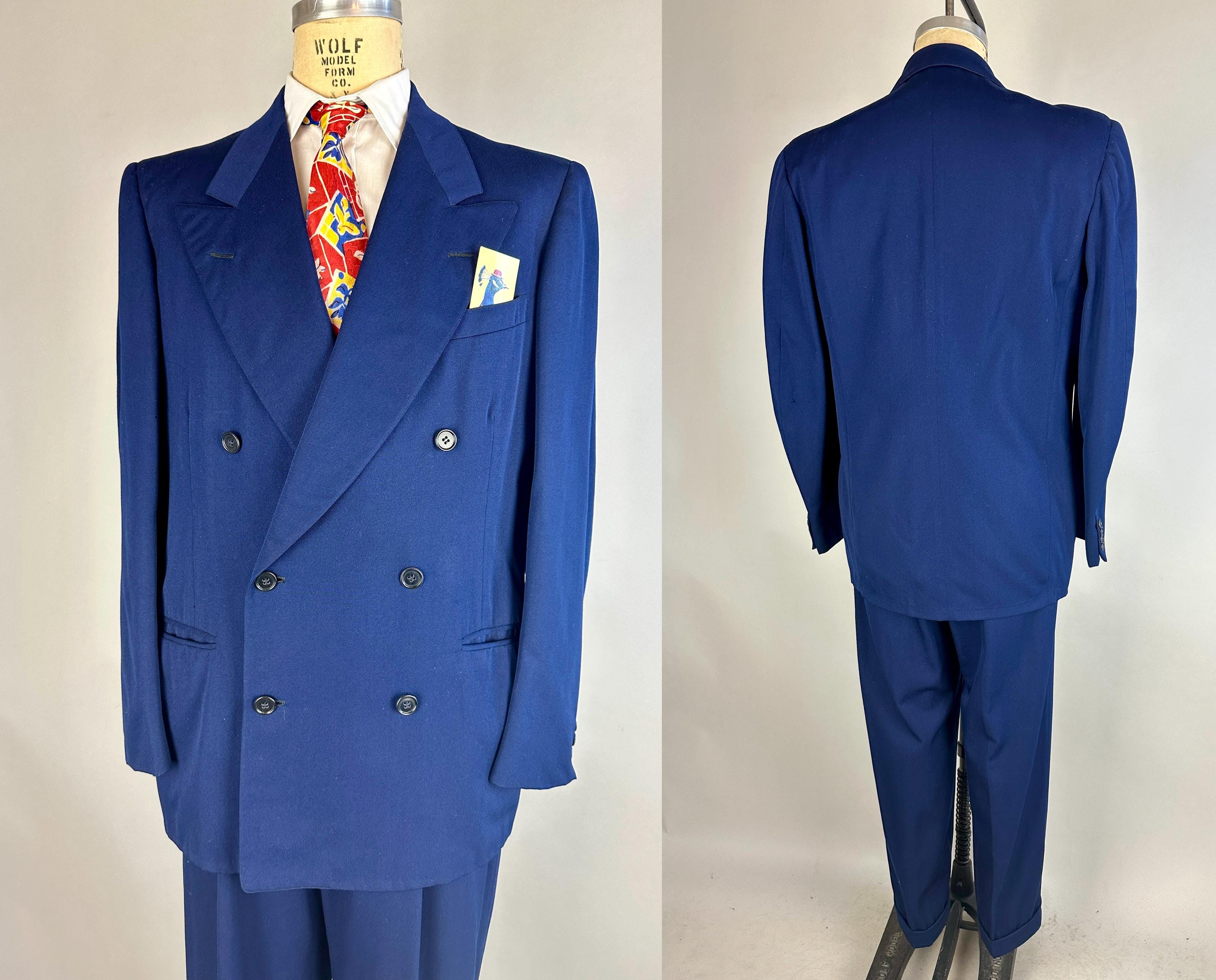 Wait for your lover under the blue moon in this early 1950’s suit and they are sure to swoon! This marvelous suit is made of royal blue wool gabardine. The blazer is double breasted with a 2x6 button stance and features wide peak lapels, jetted chest pocket, welted hip pockets, four matching buttons at each cuff, two inner pockets, butterfly lining, shoulder pads, and no vent. The pants have a pleated front, welted pockets (one buttoning in the back), dropped belt loops, coin/watch pocket, metal zip fly, a full set of inner suspender buttons, and healthy cuffs. From Gramercy Park Clothes with a 1949 Union Label. This suit is in great vintage condition, with no holes, stains, or odors to note.