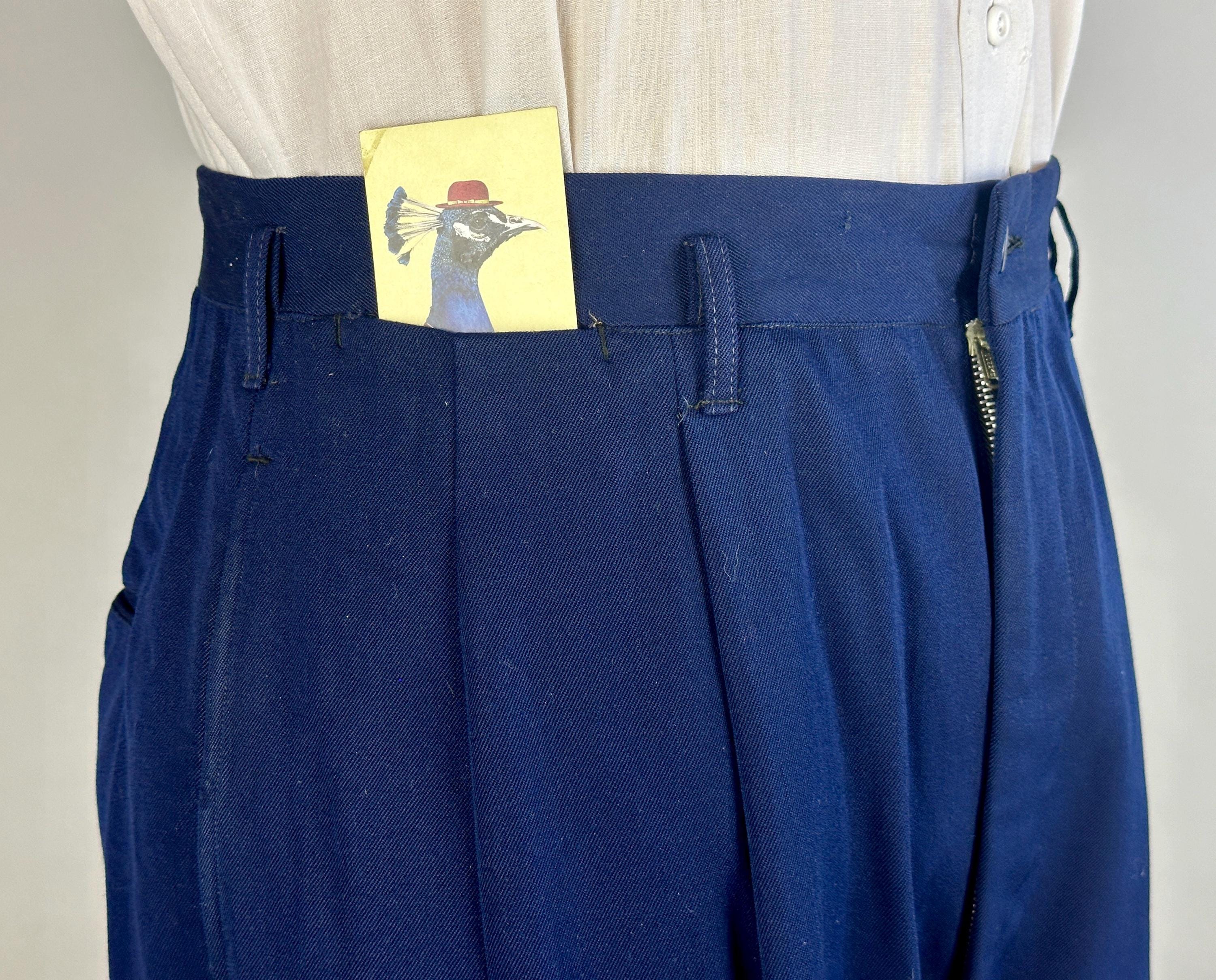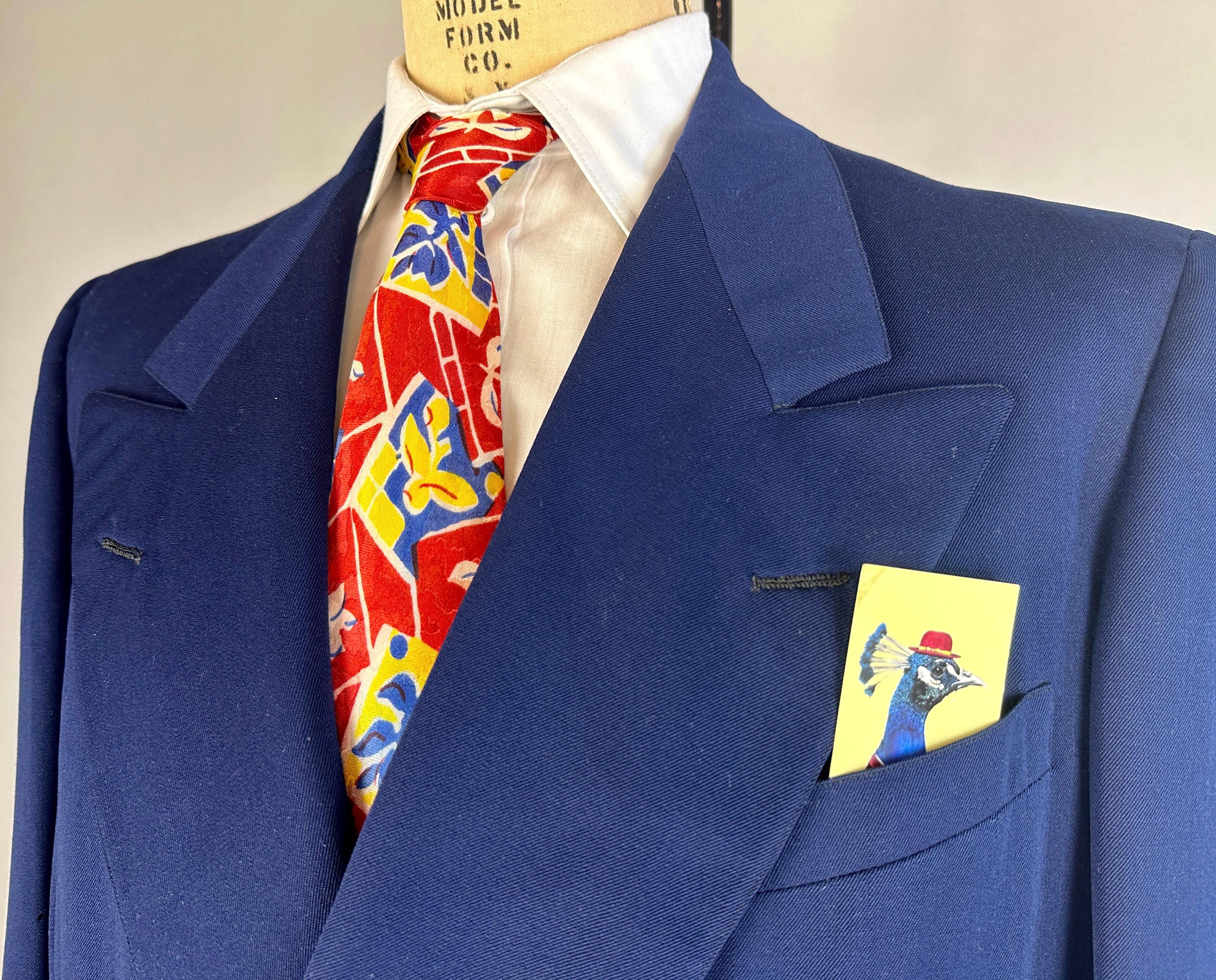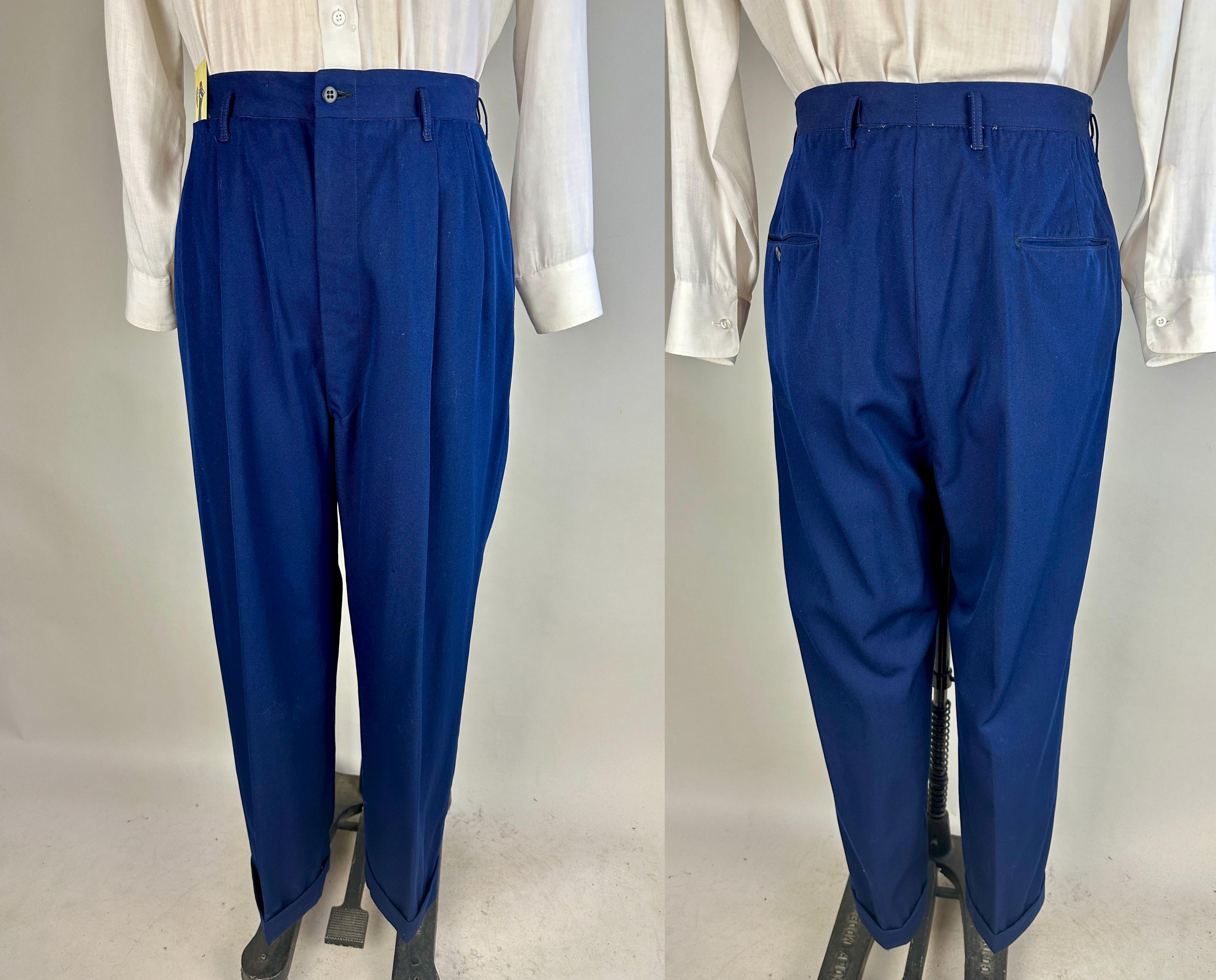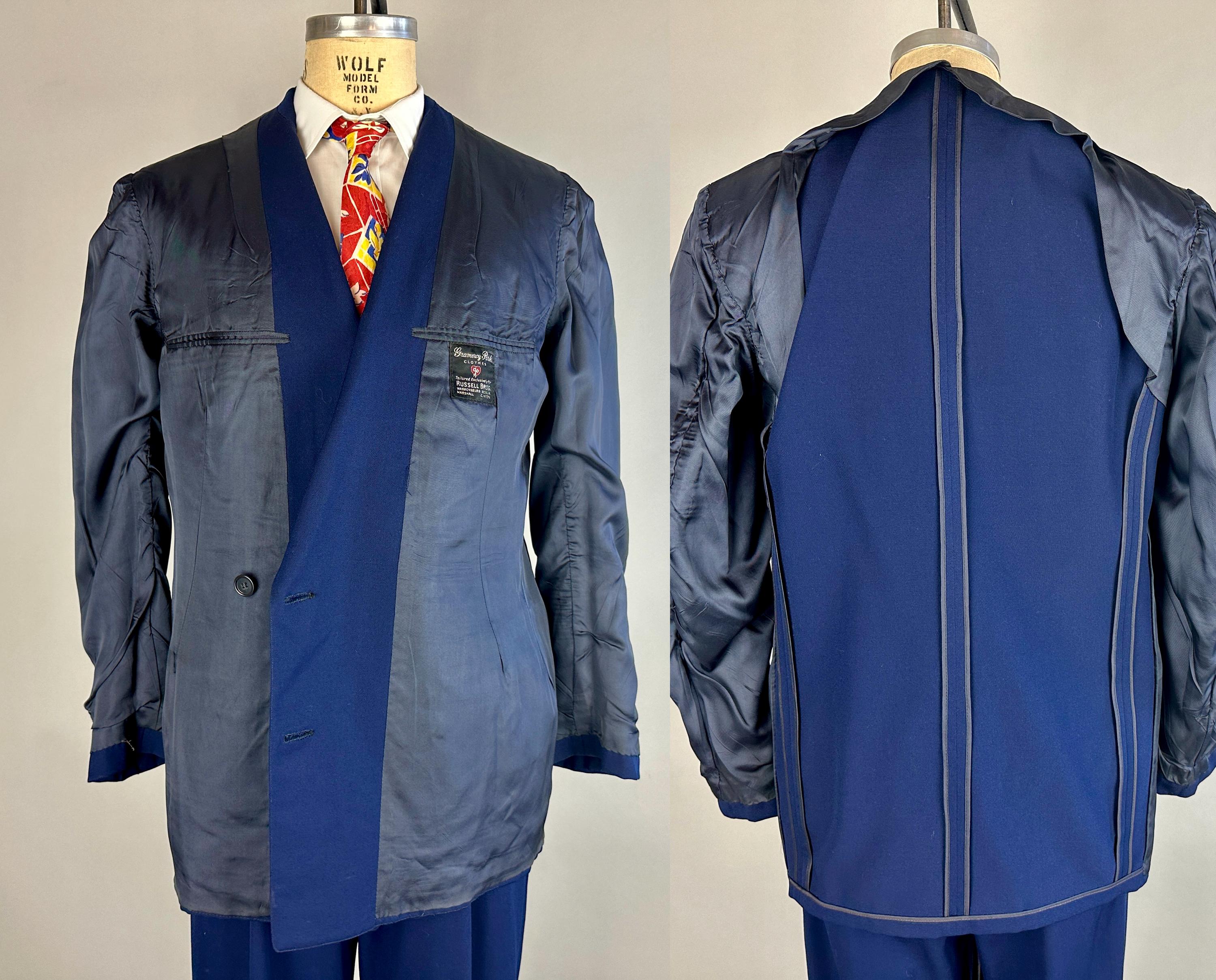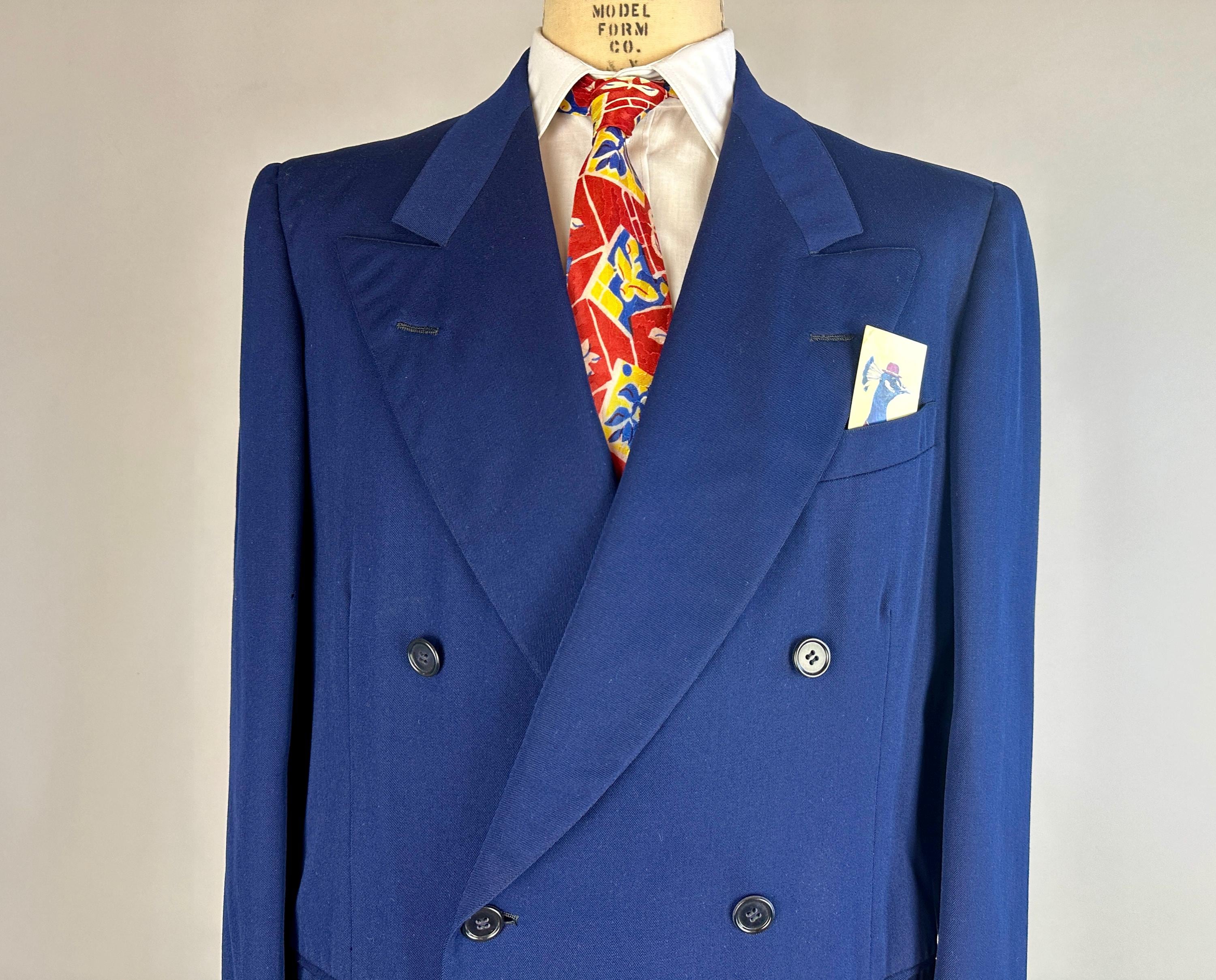 Wait for your lover under the blue moon in this early 1950’s suit and they are sure to swoon! This marvelous suit is made of royal blue wool gabardine. The blazer is double breasted with a 2x6 button stance and features wide peak lapels, jetted chest pocket, welted hip pockets, four matching buttons at each cuff, two inner pockets, butterfly lining, shoulder pads, and no vent. The pants have a pleated front, welted pockets (one buttoning in the back), dropped belt loops, coin/watch pocket, metal zip fly, a full set of inner suspender buttons, and healthy cuffs. From Gramercy Park Clothes with a 1949 Union Label. This suit is in great vintage condition, with no holes, stains, or odors to note.
