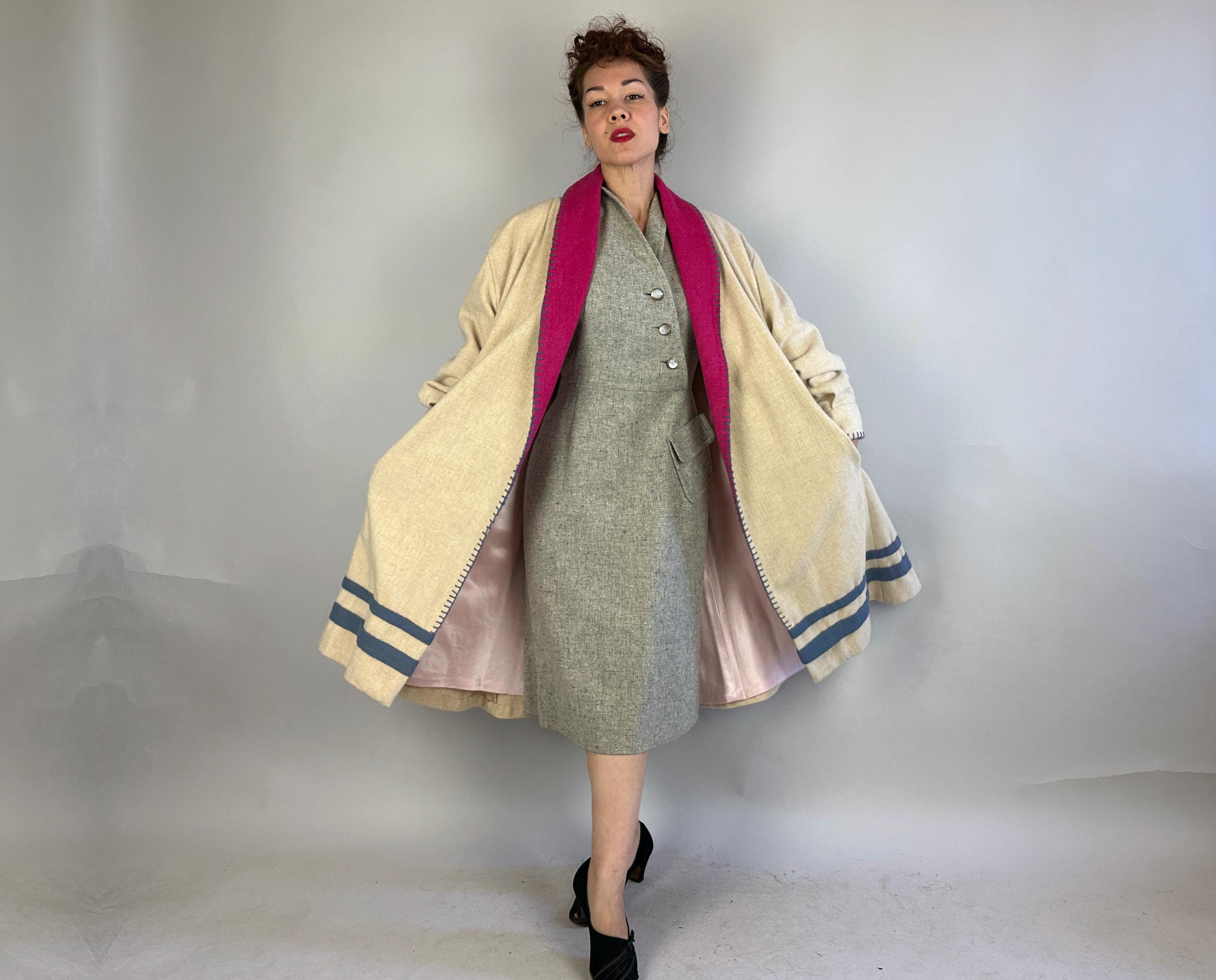 You'll be a sweet treat bundled up in this 1950's coat! Cream white wool makes up this open swing coat with an extra swingy full skirt and billowed sleeves created with pleats inset in the fitted cuffs. Bright berry pink makes up the shawl collar and dusty blue stripes trim the hem and adorn the edges as a blanket stitch creating a look that really pops! Hip pockets are set into the side seams and a rayon mimicking raw silk makes for a cozy lining. Light padding in the shoulders. This coat is in great vintage condition, with no stains, holes, or odors to note.