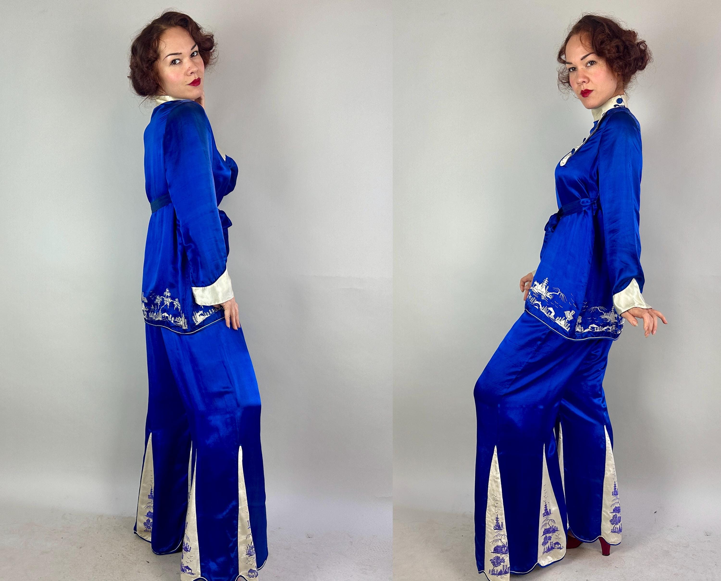 Make lazy days looks so good in this 1920’s lounge set! Made of sumptuous silk in cobalt blue with white accents and embroidery depicting natural scenery. The top is billowy and loose, easily slipping overhead and the fit is cinched with the matching sash belt. It has a high collar with a decorative button line sitting asymmetrically and hiding the actual snap fasteners and a little patch pocket sits right under the belt. The pants have super wide bell legs with scallop edging and the embroidery on the white insets adds a touch of lavender. Buttons and snaps on the side with a flat waistband trimmed with white piping. This set is in great vintage condition, with no holes, stains, nor odors to note.