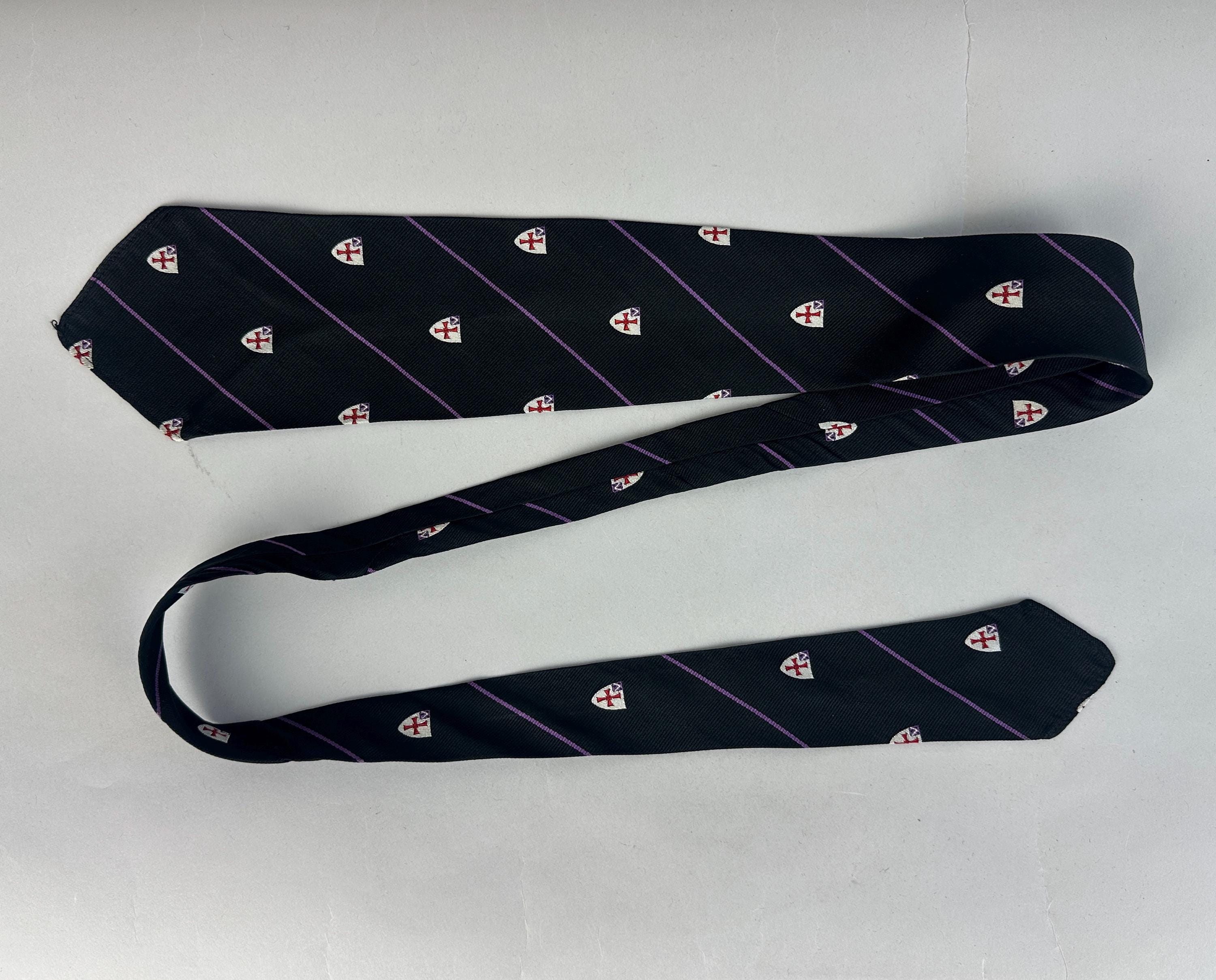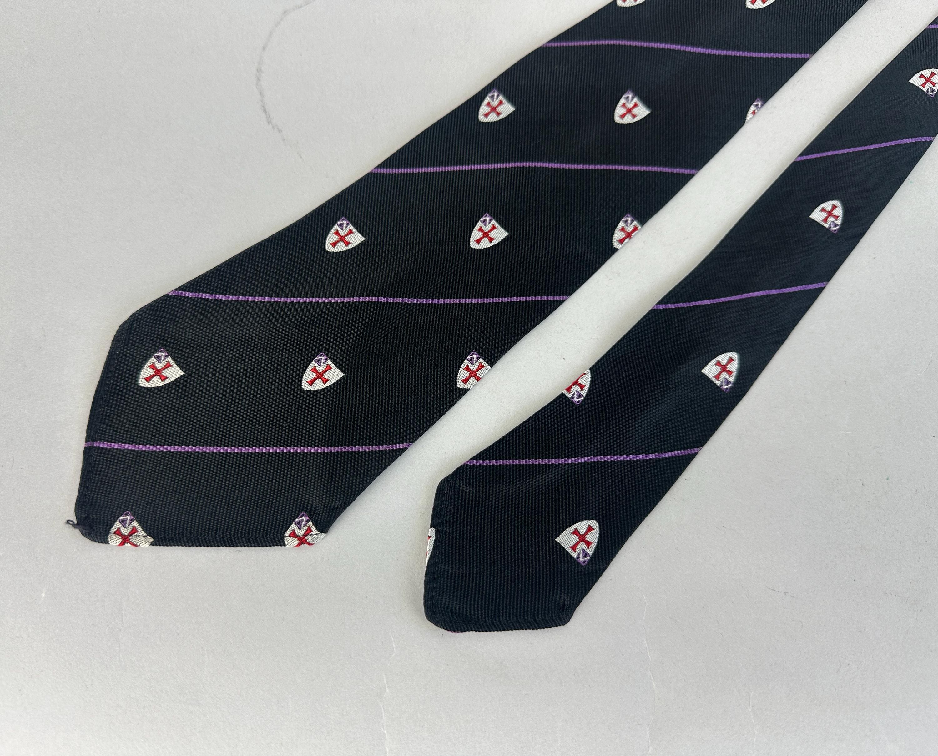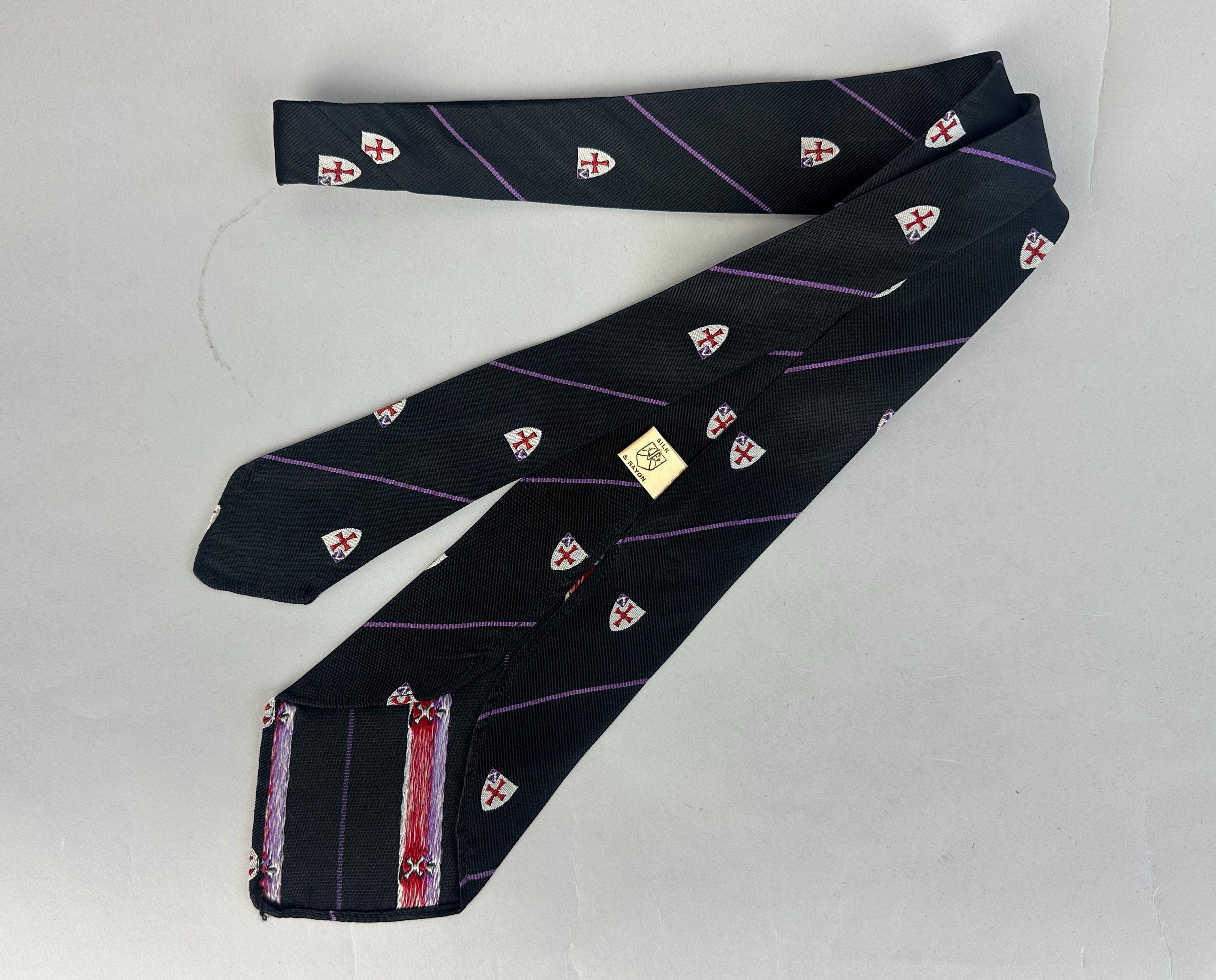 Cross your heart on a crusade in this 1940's necktie! Black silk rayon blend features thin grape purple stripes and silver shields with red crosses. Unlined. Pairs well with a wide variety of Art Deco and Mid-Century suit colors and fabric types. This tie is in great vintage condition with no holes, stains, or odors to note.