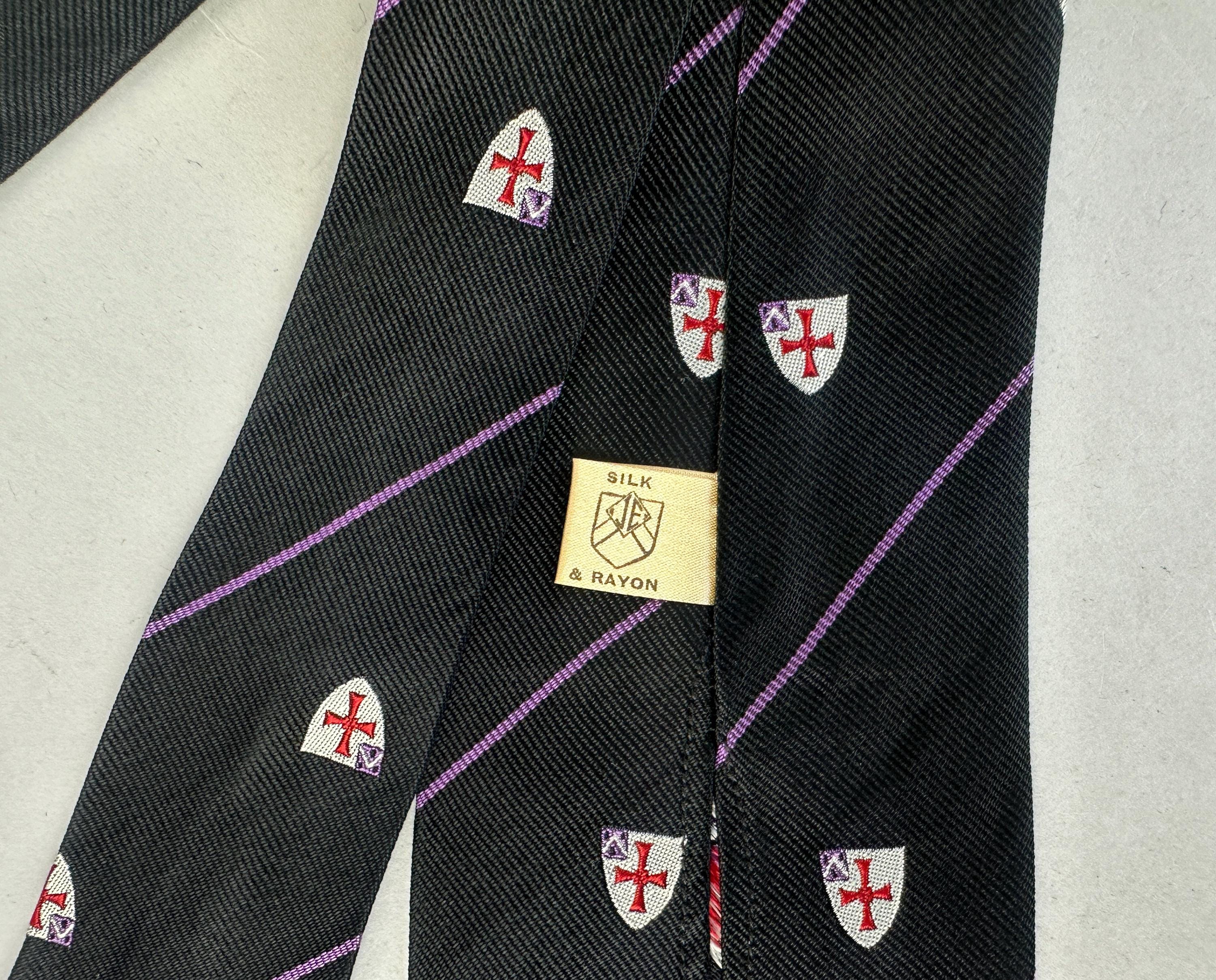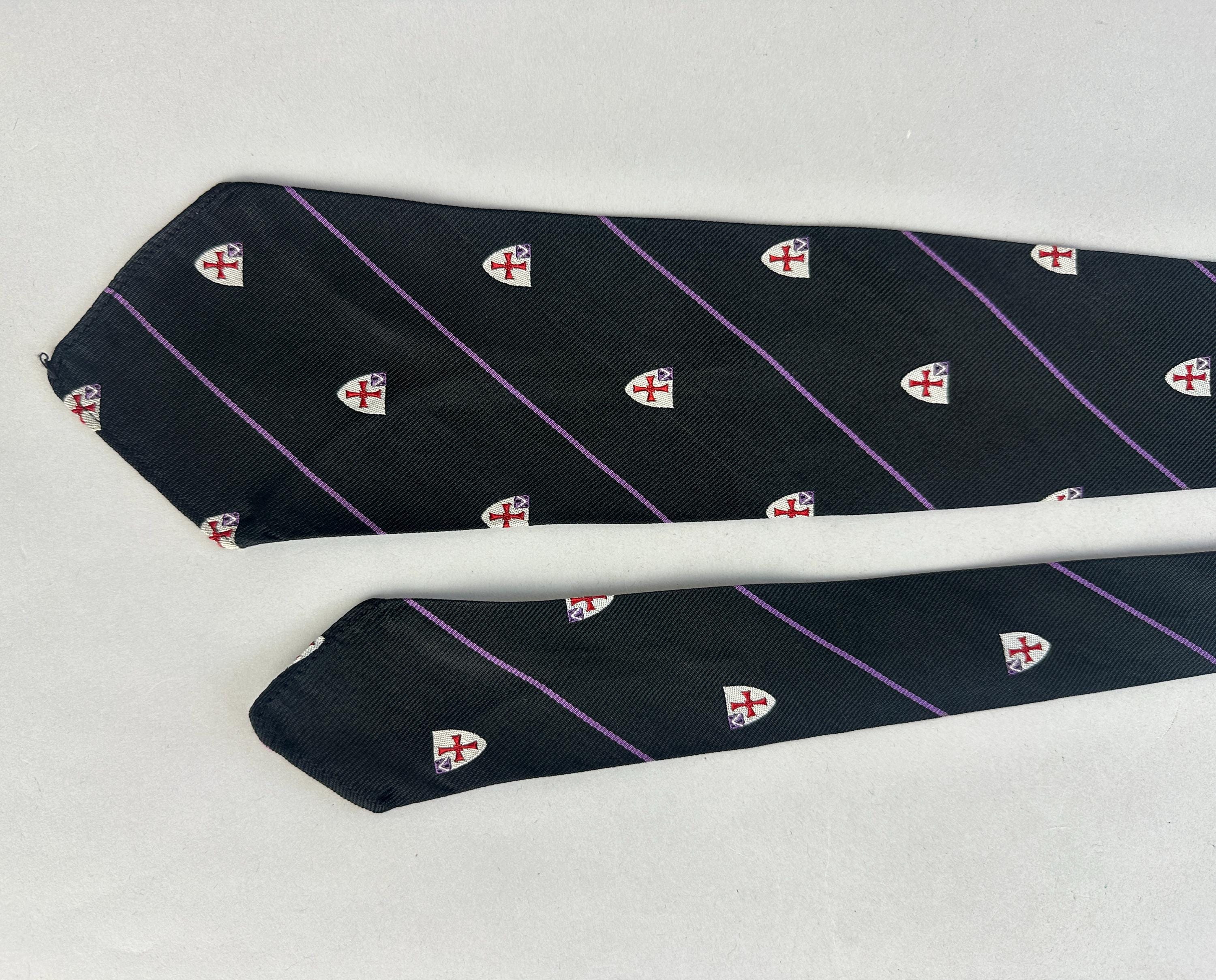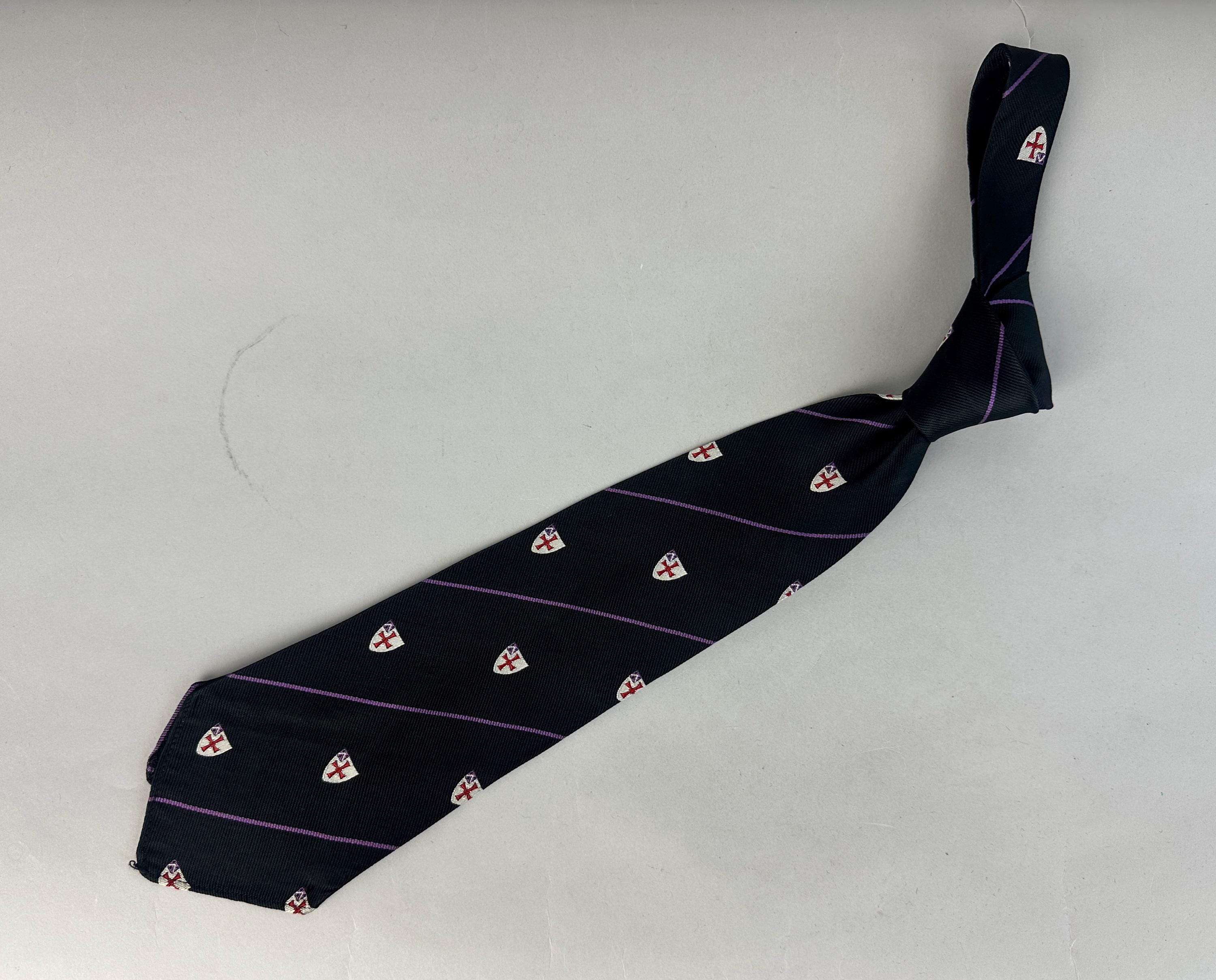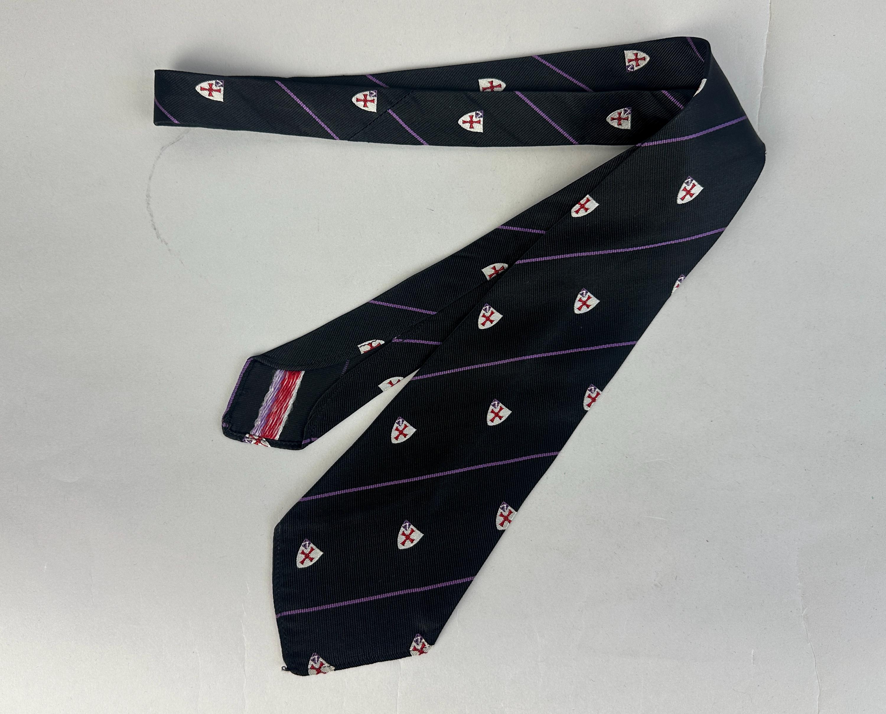 Cross your heart on a crusade in this 1940's necktie! Black silk rayon blend features thin grape purple stripes and silver shields with red crosses. Unlined. Pairs well with a wide variety of Art Deco and Mid-Century suit colors and fabric types. This tie is in great vintage condition with no holes, stains, or odors to note.