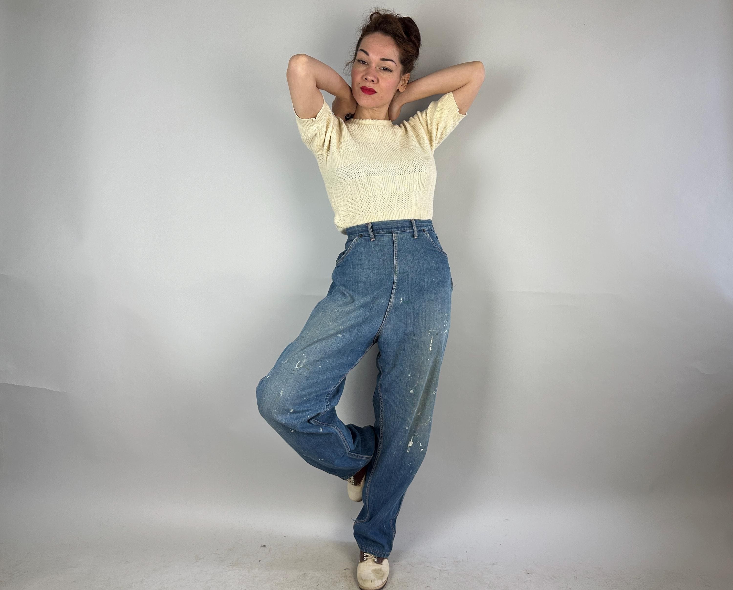 You'll keep looking cute even on a day of duty with these 1950's jeans! The faded blue denim is wonderfully broken in and has that perfect distressed look that many new brands try to fake! They are given a highlight of peach top stitching, four pockets to keep your necessities close, belt loops, and metal "Talon" zipper with snap on the side. These trousers are in good vintage condition, certainly well used and loved with splatters of white paint and some rough edges but in the world of jeans it's the sort of thing that seems to make them just that much better! No holes or odors to note.