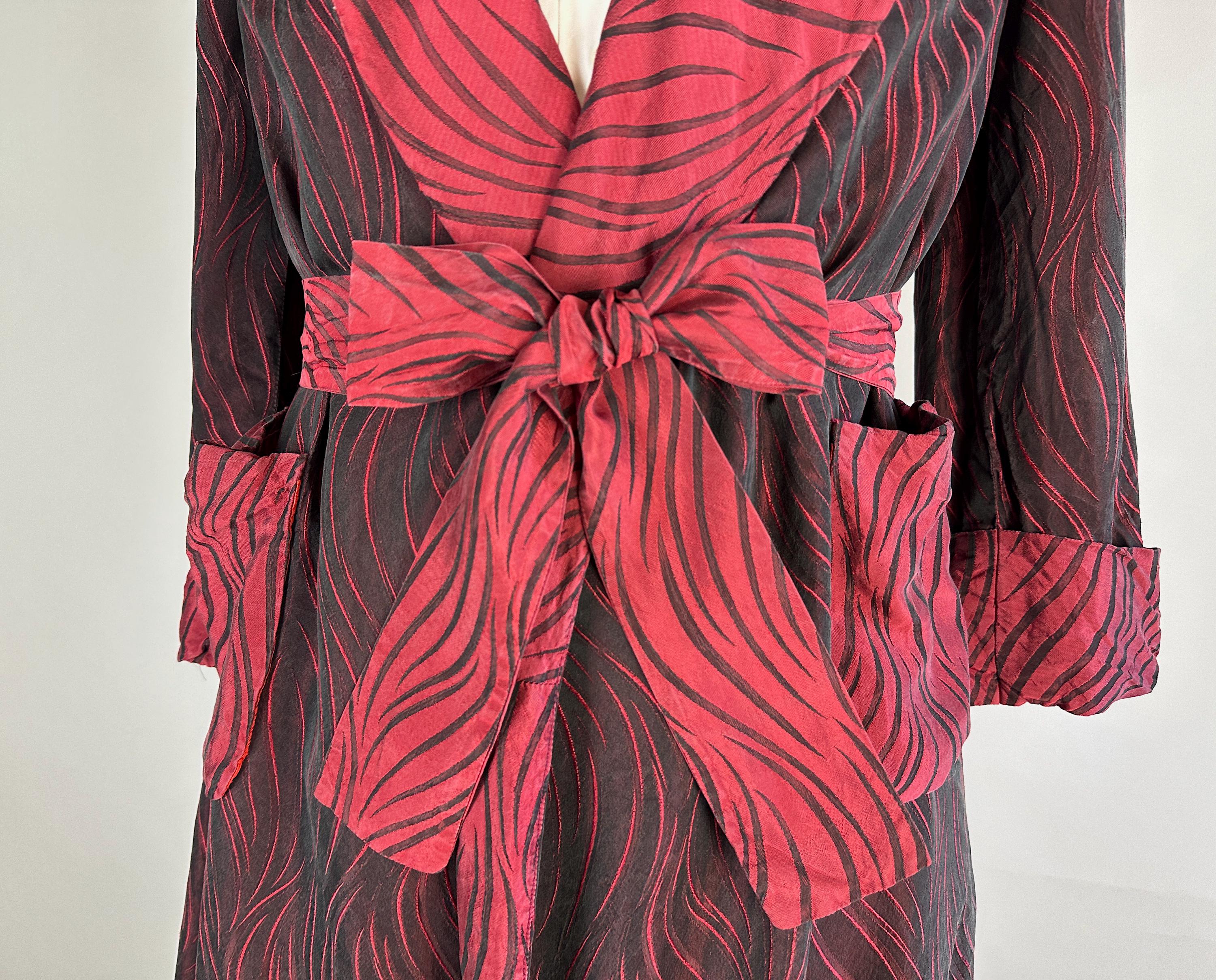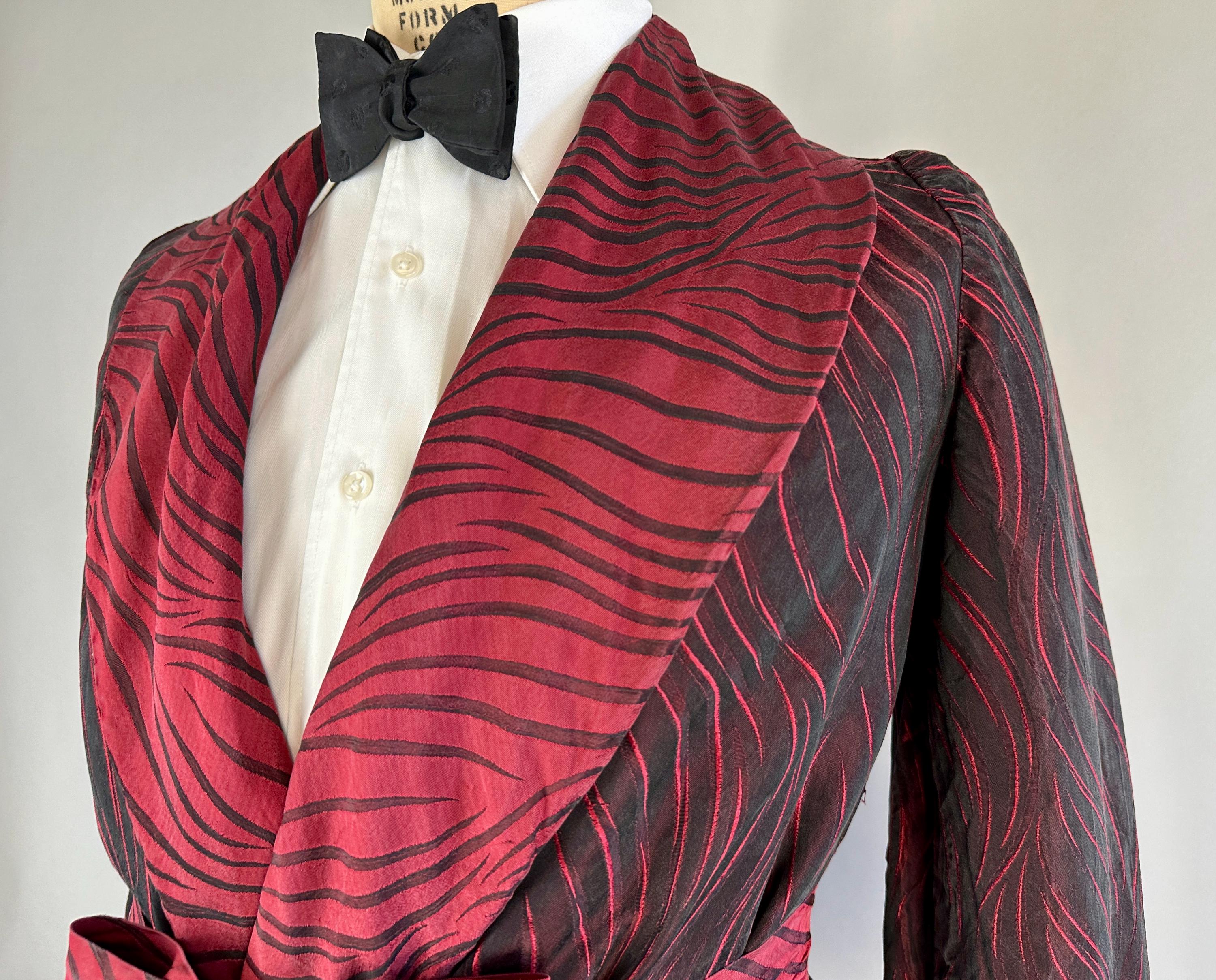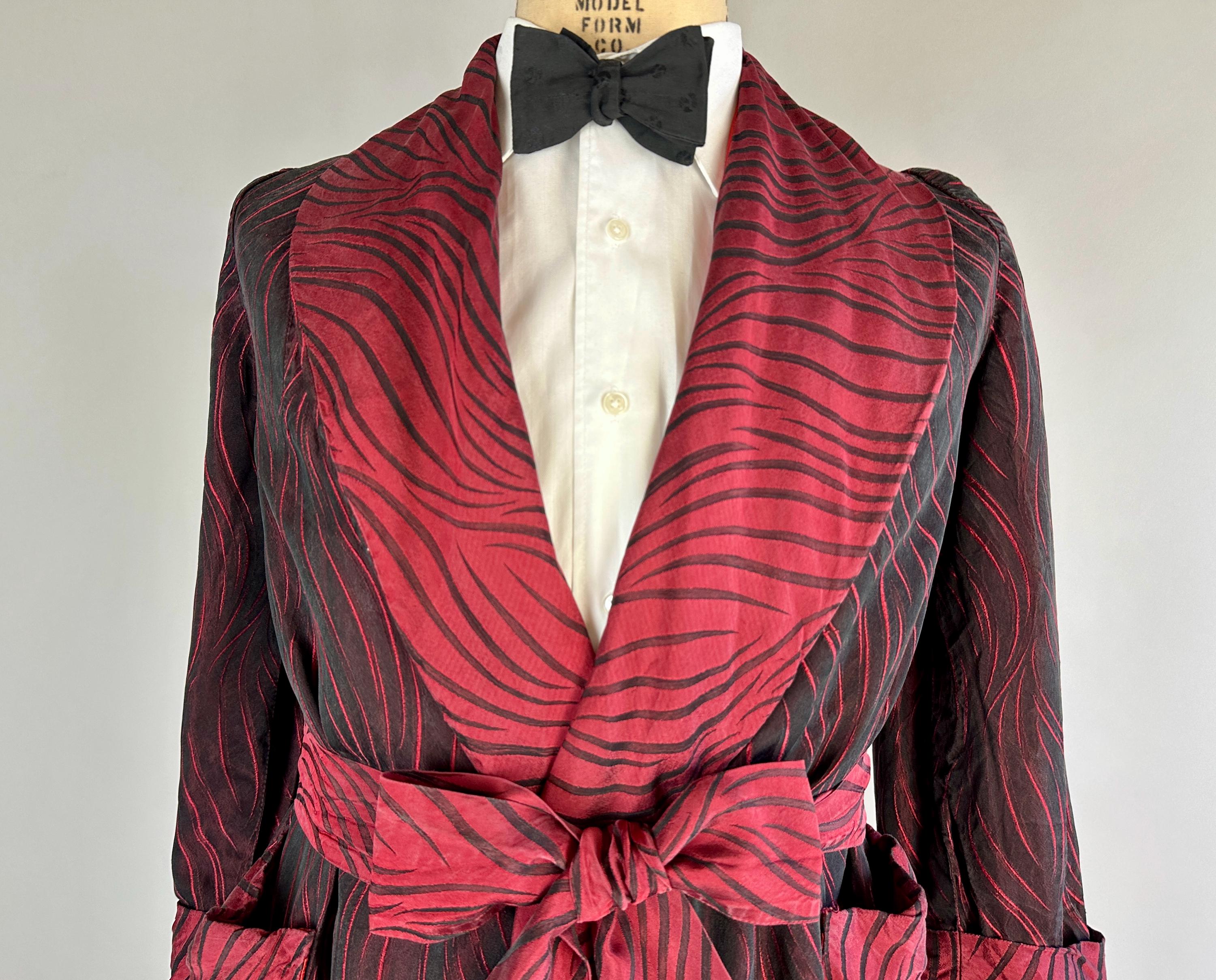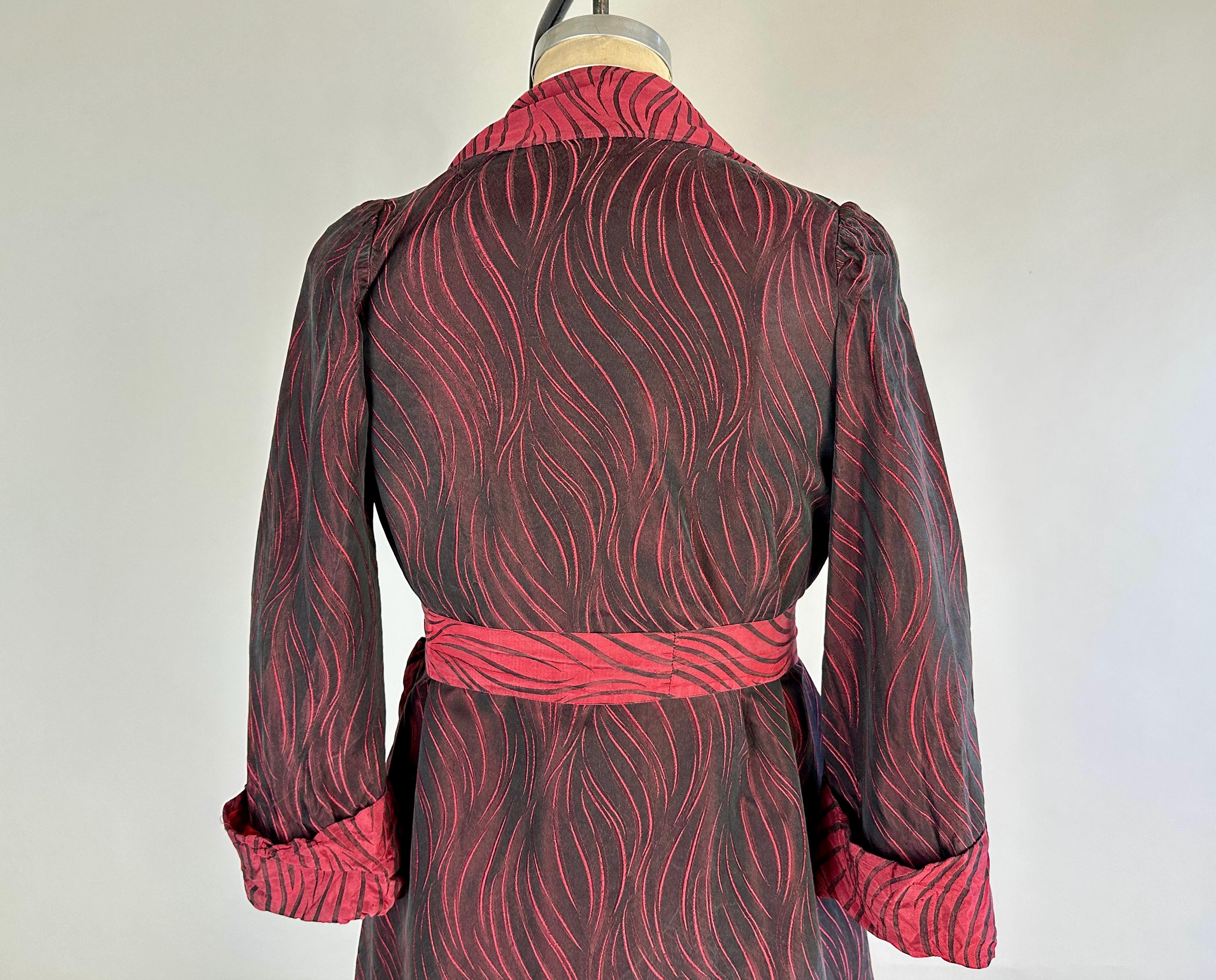 Your animal magnetism knows no bounds so she'll scream "Hold that tiger!" with after hours drinks in this 1950's robe! Constructed of silk with a brocade weave making tiger stripes, it combines blood red and black with each sharing the role of dominant colour depending on the placement and lighting. It has a shawl collar, two patch pockets, single buttton fastening, and matching sash belt. Fully lined in a fire red silk. This robe is in great vintage condition with no stains, holes, nor odors to note.