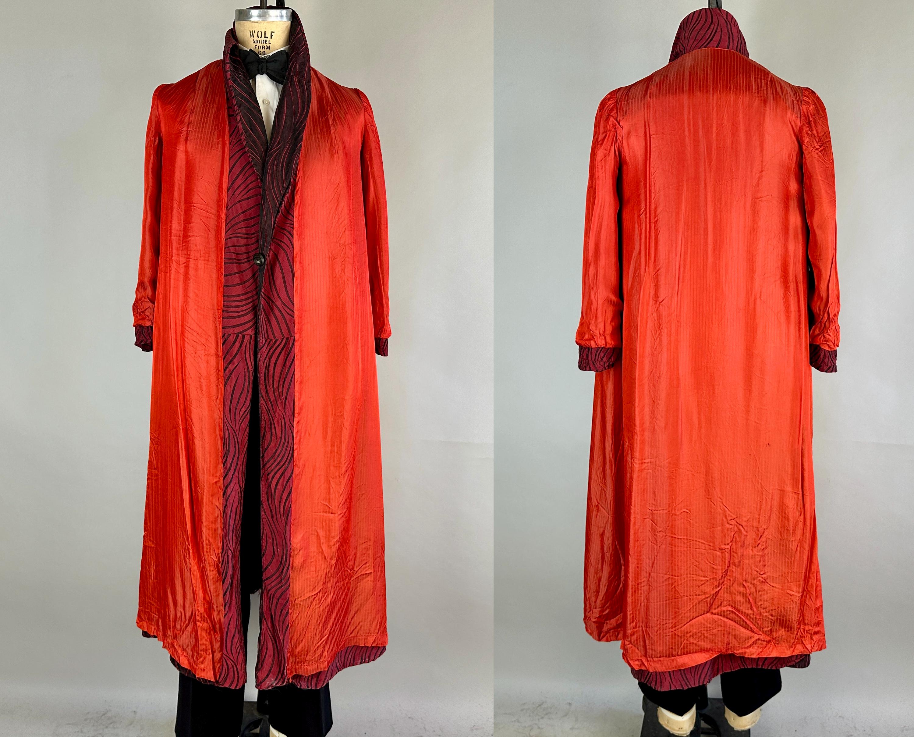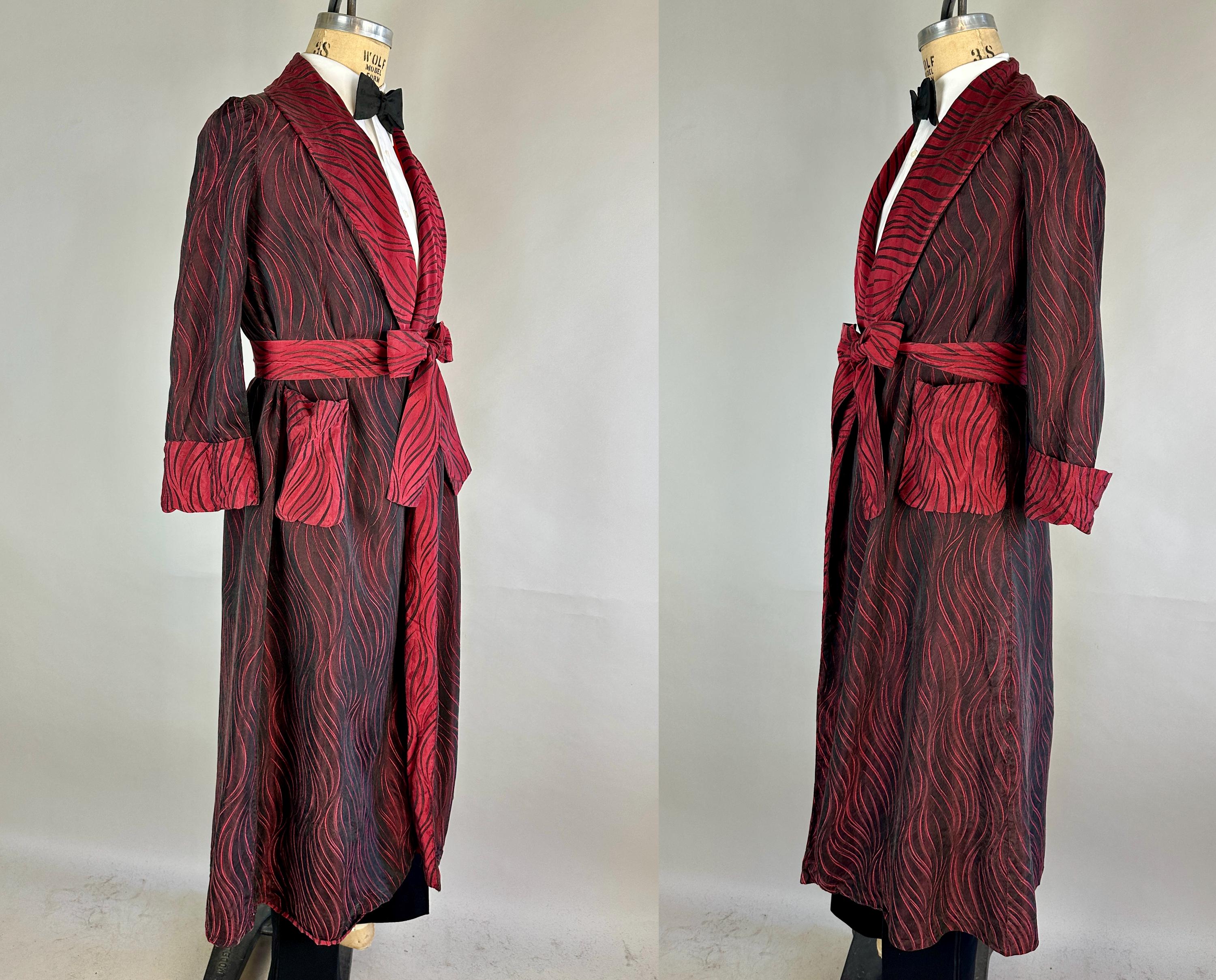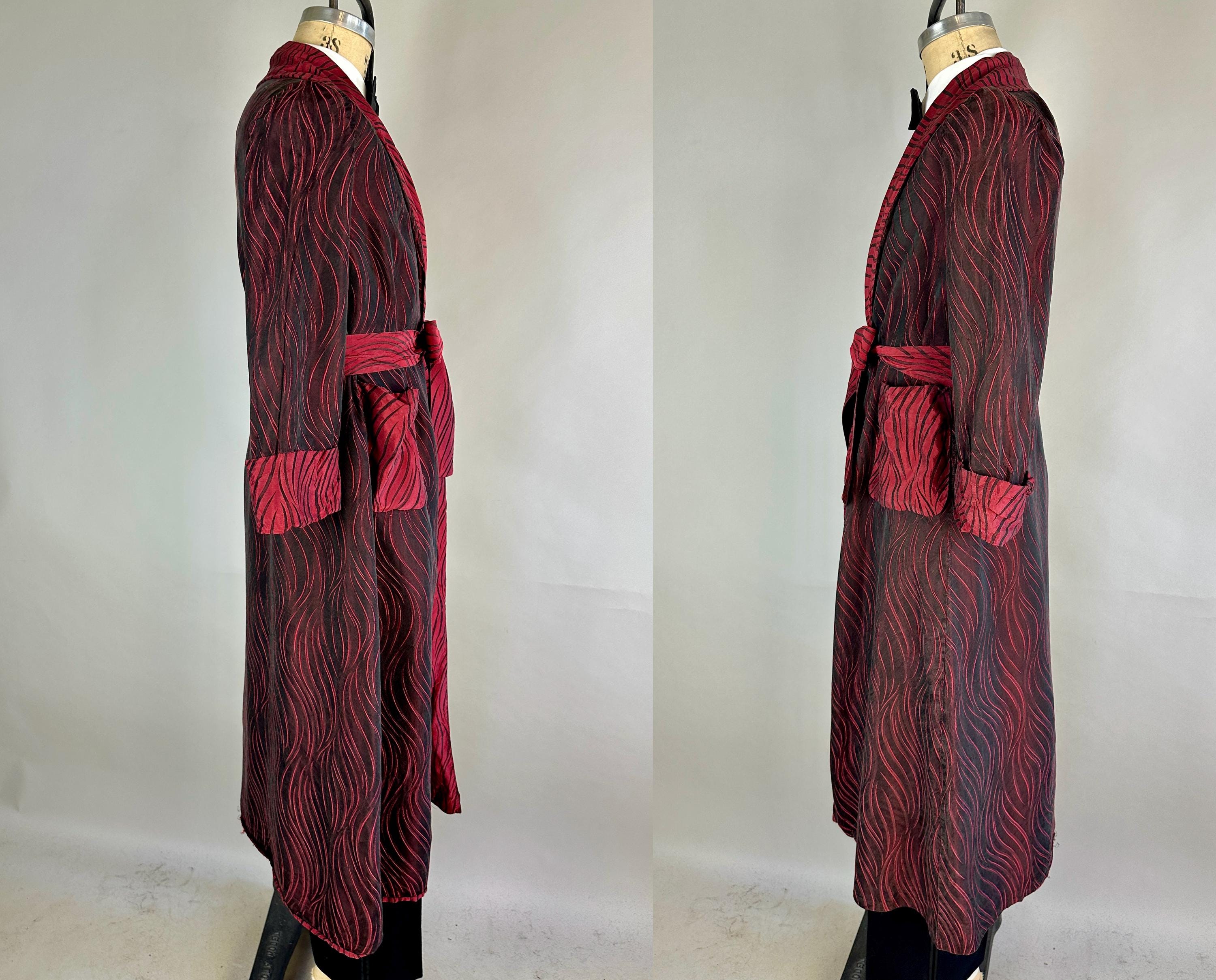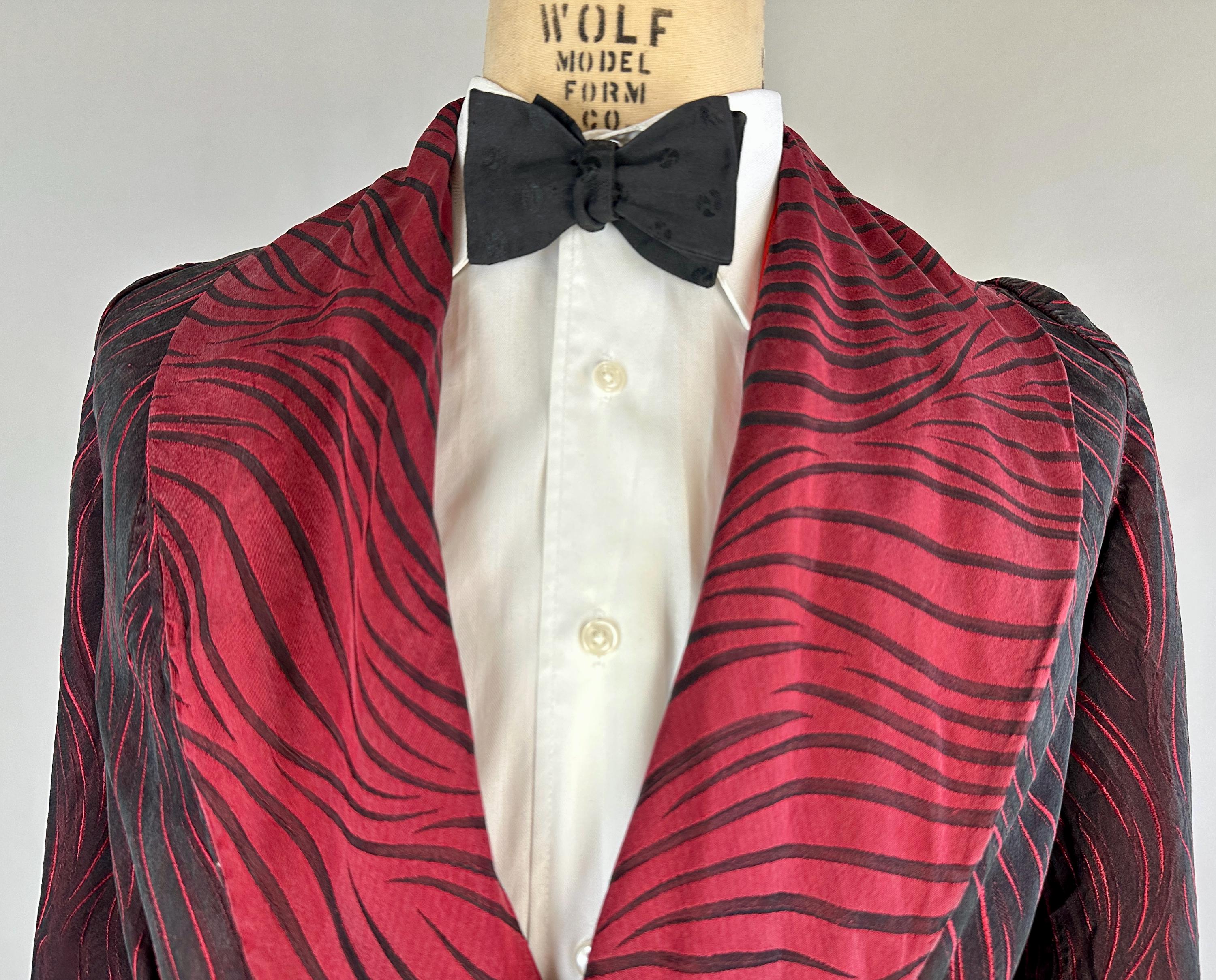 Your animal magnetism knows no bounds so she'll scream "Hold that tiger!" with after hours drinks in this 1950's robe! Constructed of silk with a brocade weave making tiger stripes, it combines blood red and black with each sharing the role of dominant colour depending on the placement and lighting. It has a shawl collar, two patch pockets, single buttton fastening, and matching sash belt. Fully lined in a fire red silk. This robe is in great vintage condition with no stains, holes, nor odors to note.