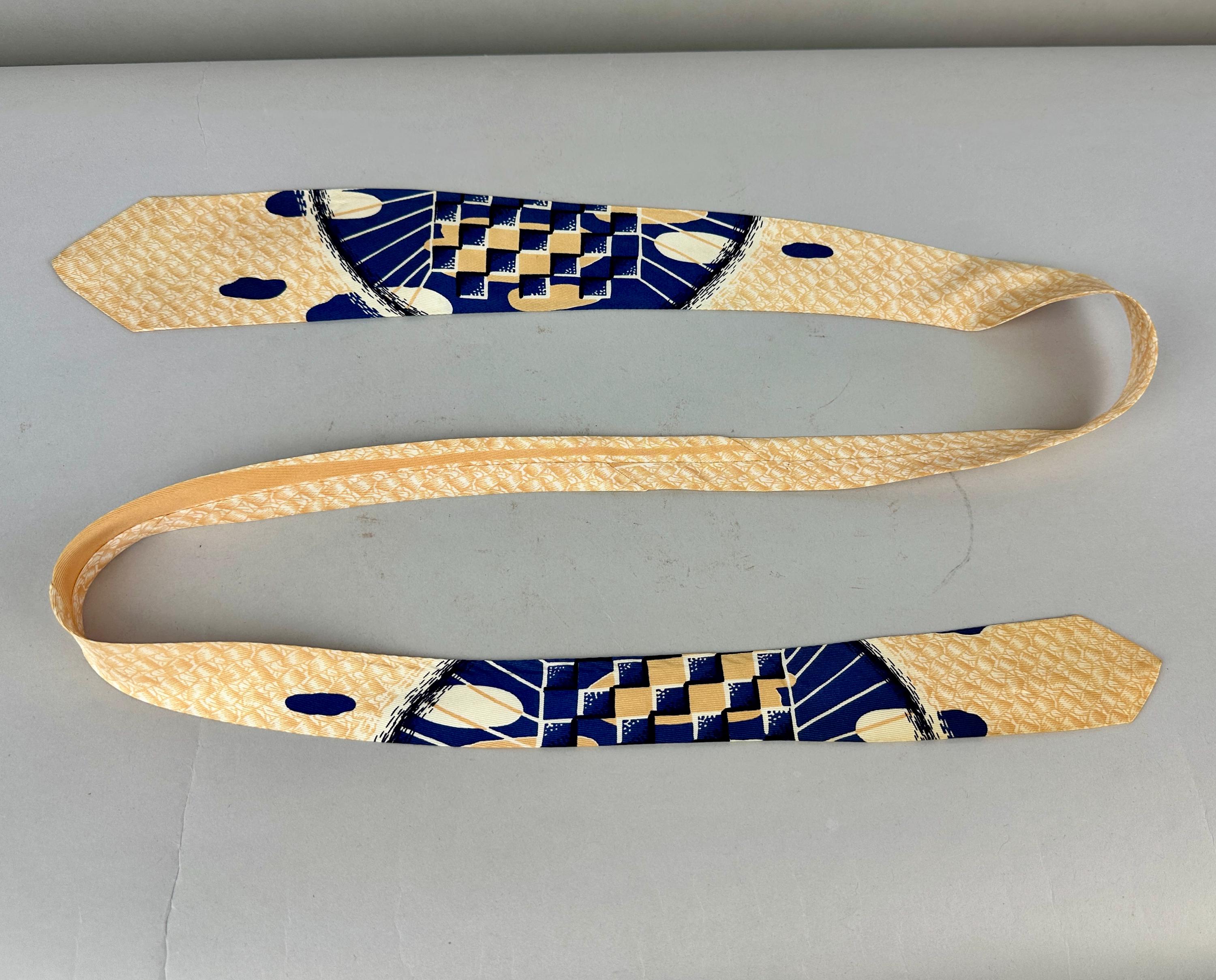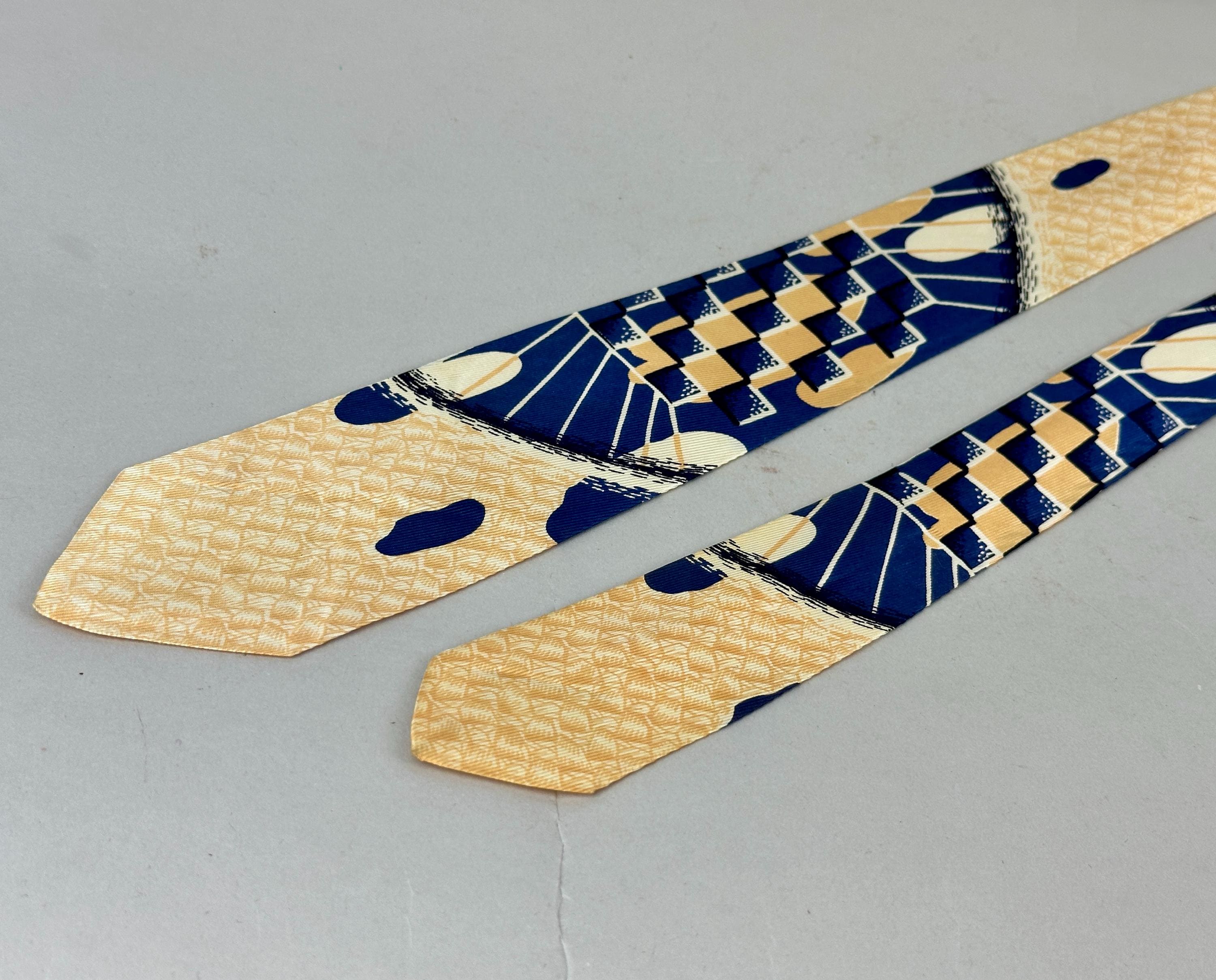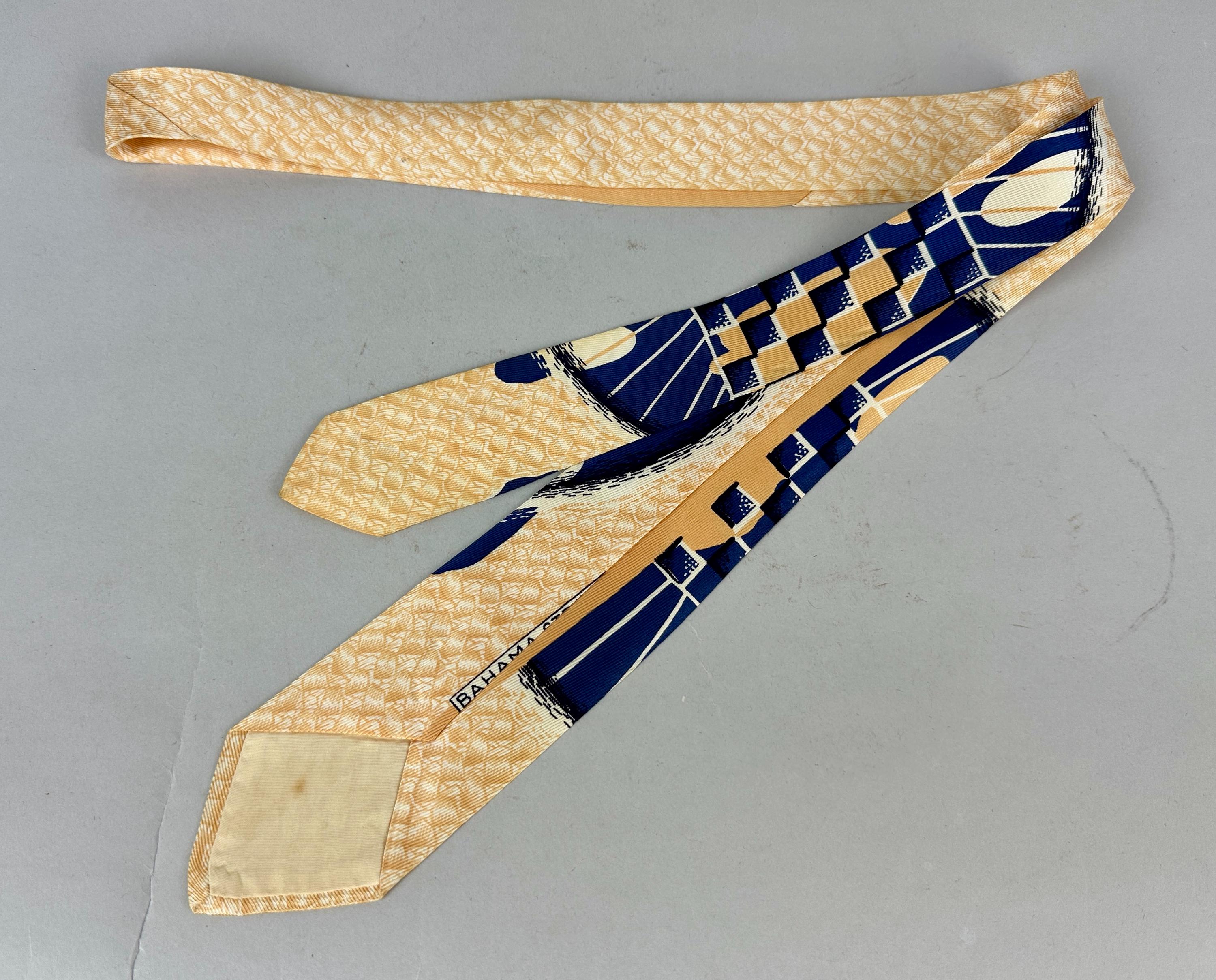 Feel relaxed even in your work attire when you can gaze at the scenery of this 1950’s tie! Called “Bahama Straws”, The modernistic depiction on this rayon tie includes geometric elements and beaming rays in admiral blue and white with peachy sand for a beach sunrise vibe. Fully lined. Pairs well with a wide variety of Art Deco and Mid-Century suit colors and fabric types. This tie is in great vintage condition with no flaws found!