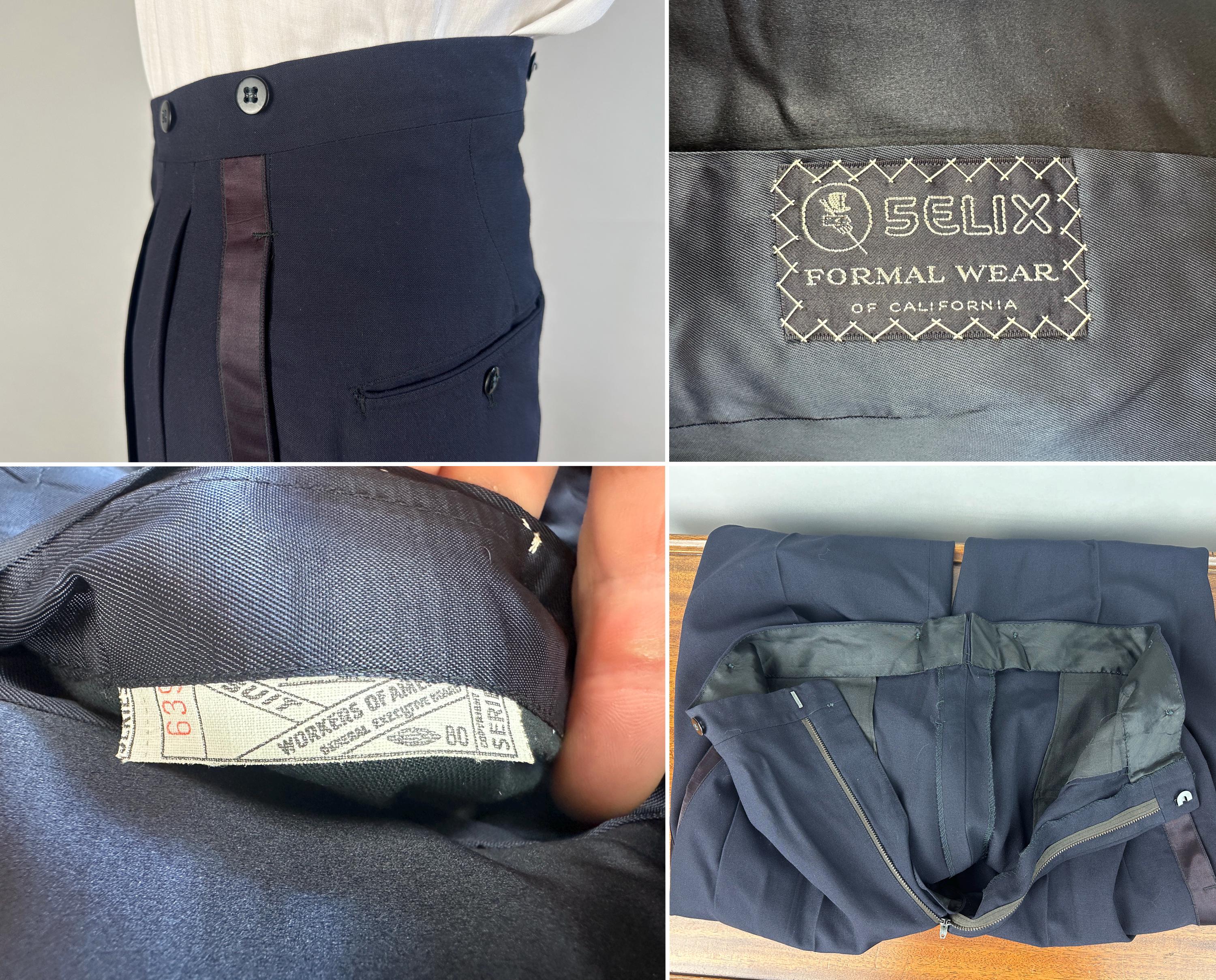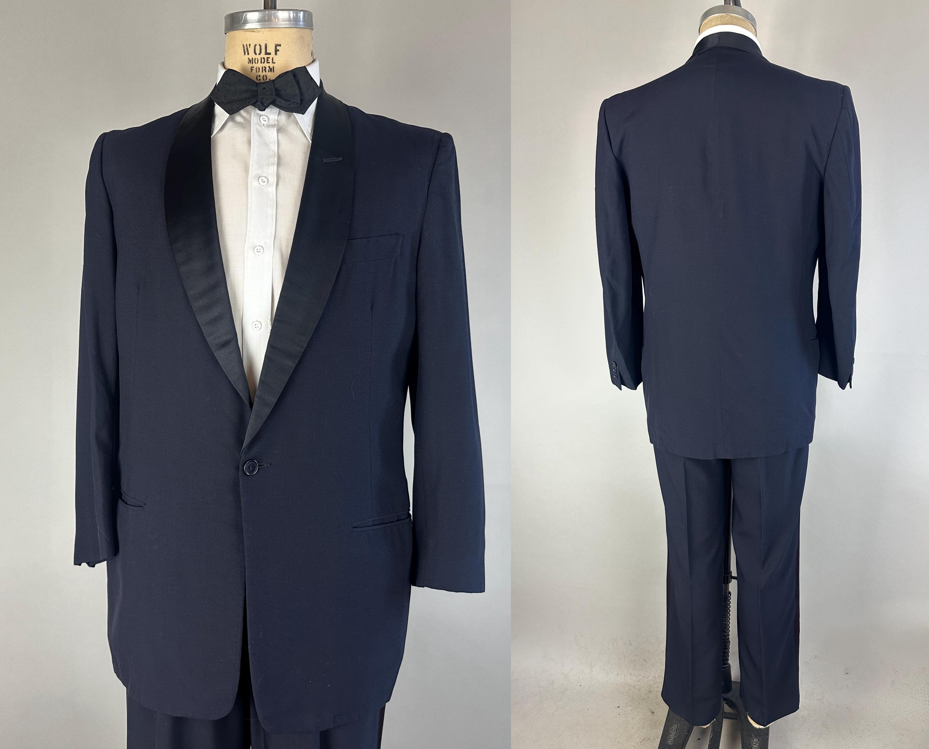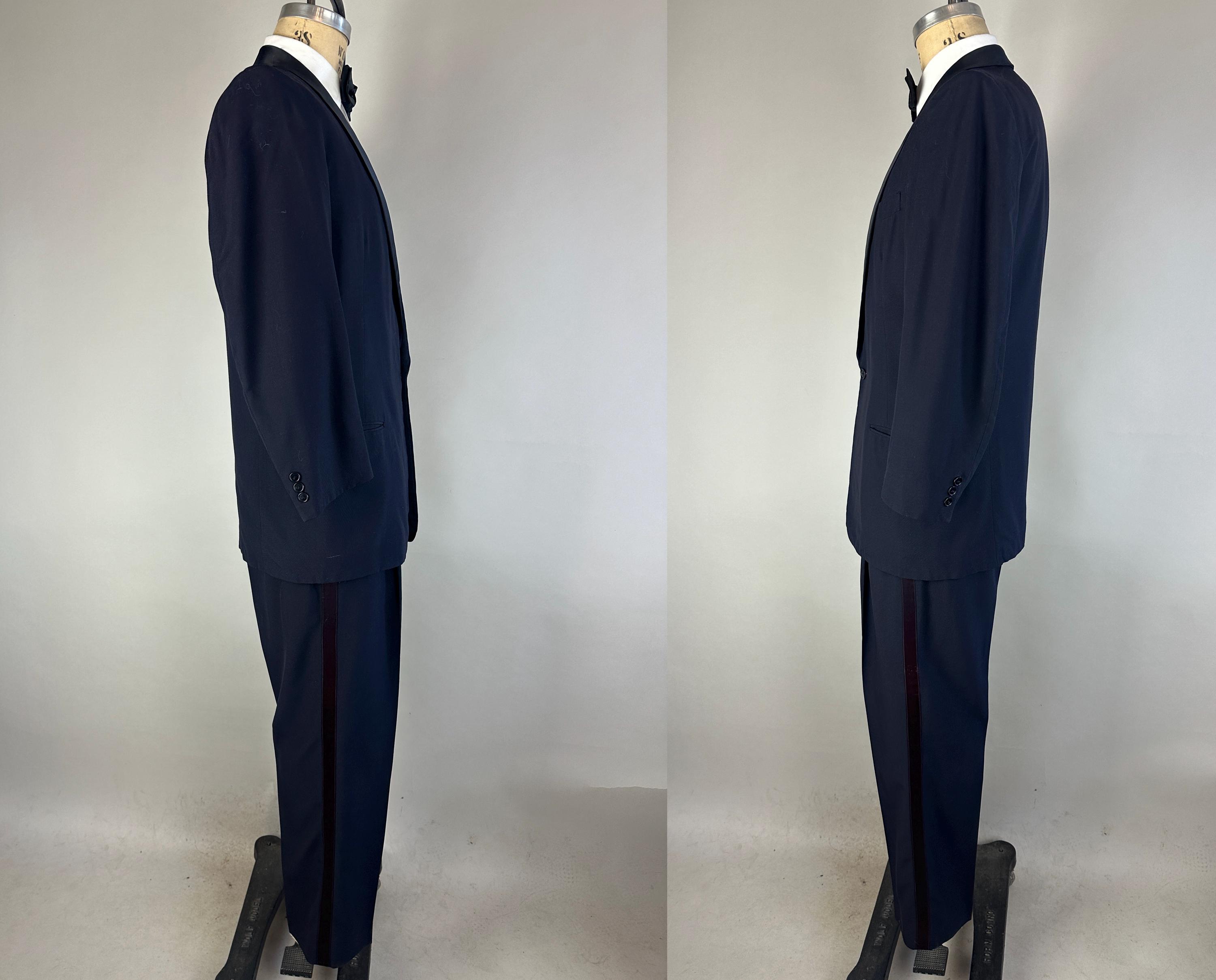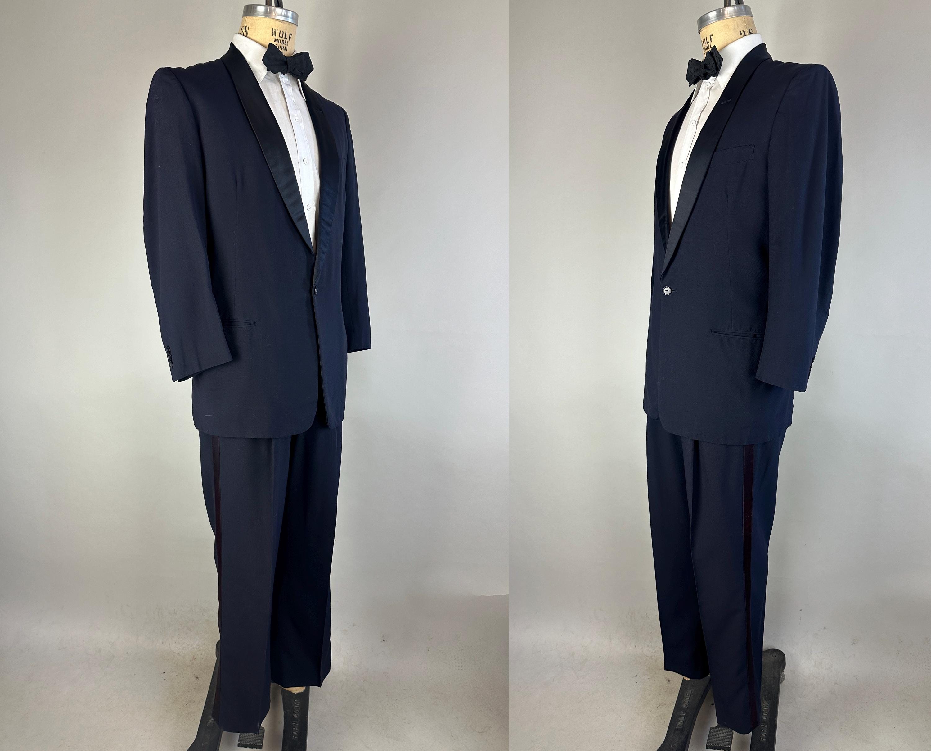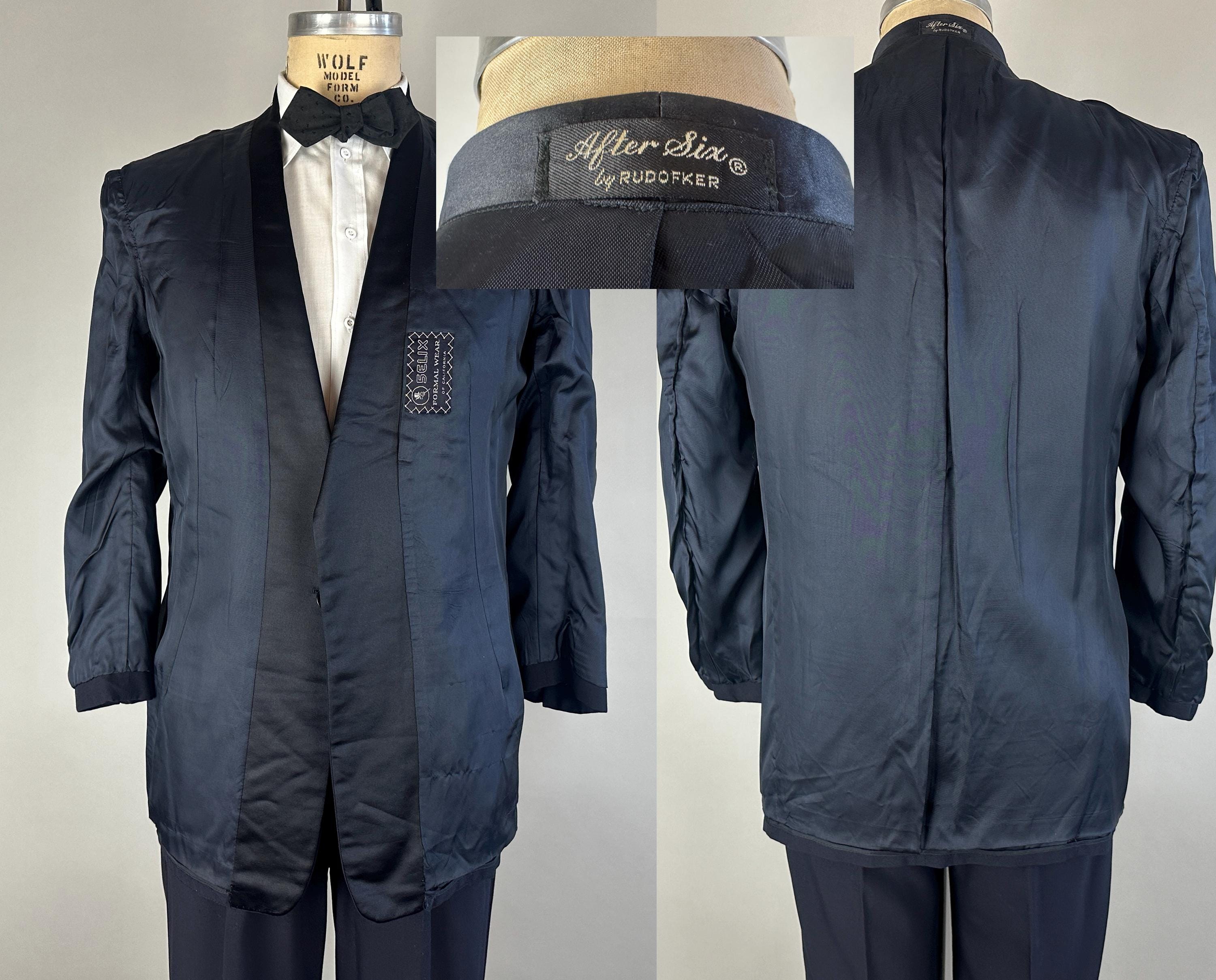 Swing and sway like a member of the Rat Pack in this 1950's tux! Light weight wool in a soft black features classic accents of silk making up the shawl lapel and trousers stripes. Jacket is single breasted with single button closure, two welted hip pockets, jetted chest pocket, full rayon satin lining with inner pocket, shoulder pads, and three matching buttons on each cuff. Trousers are double pleated front with metal zipper fly with hook and eye, four welted pockets with one buttoning in the back, cuffless hems, outer suspender buttons, and deep plumb silk stripe down the sides. Labeled "After Six by Rudofker" and with a 1949-62 Union Label dating this suit to the 1950s. This suit is in great vintage condition, with no holes, stains, nor odors to note.