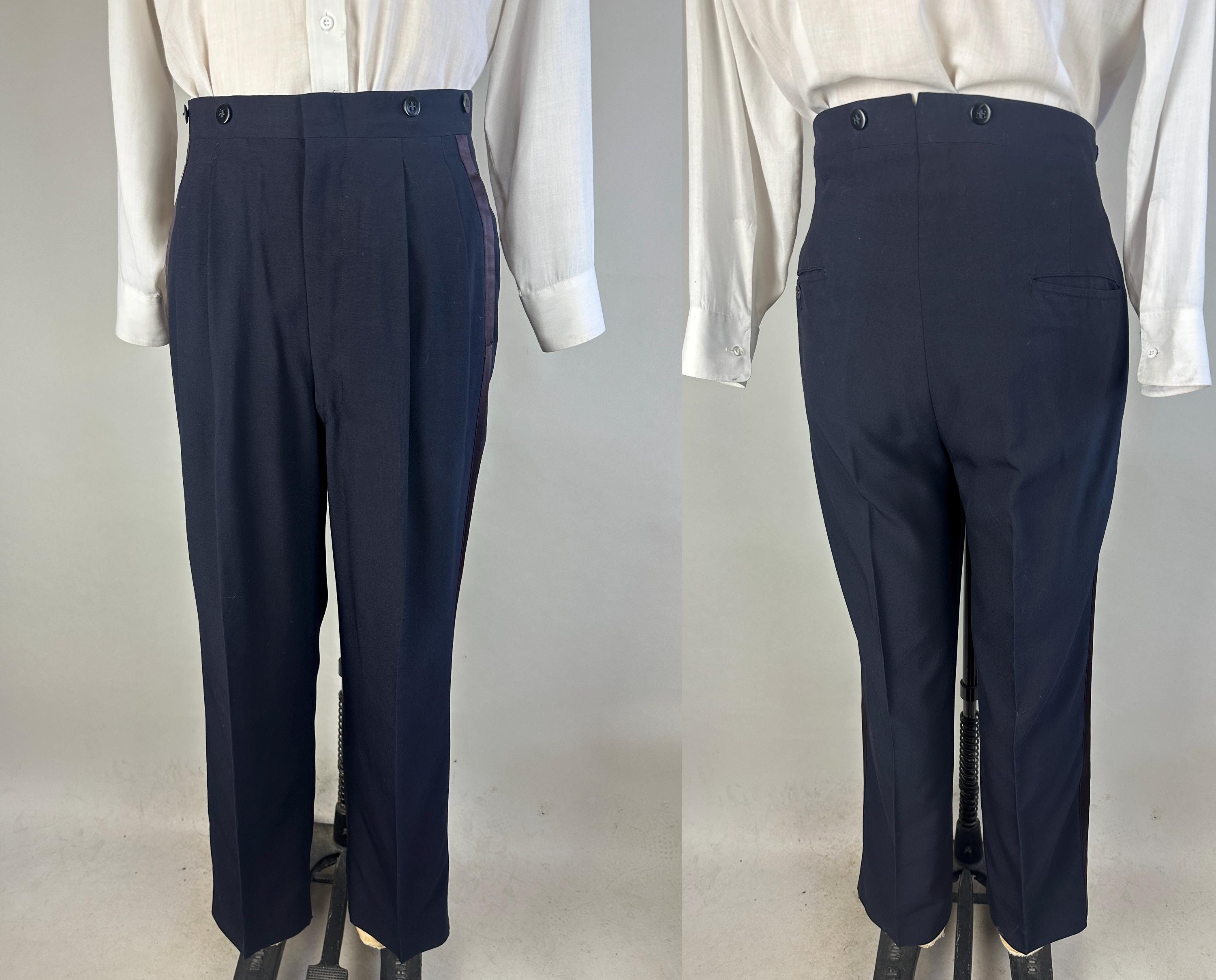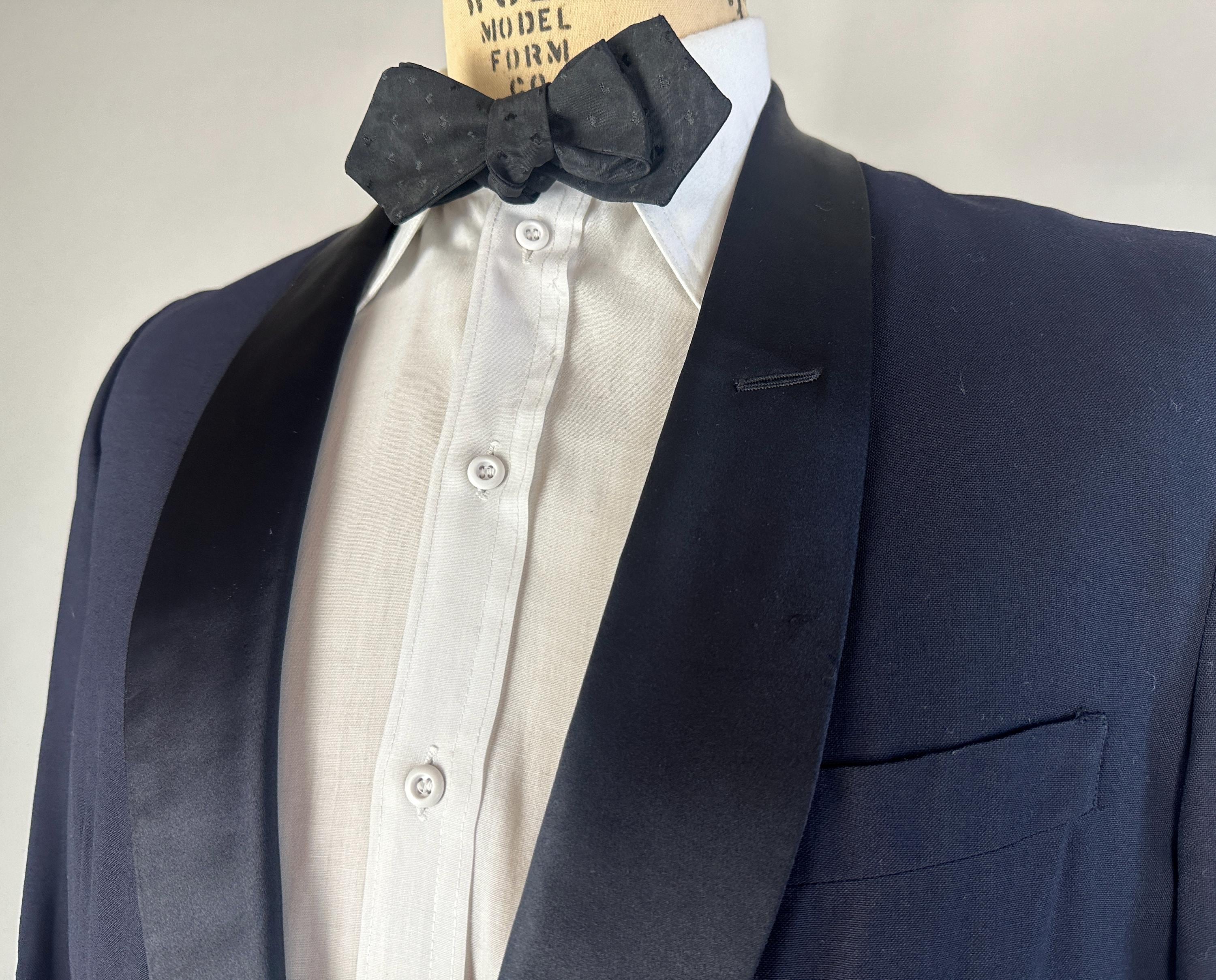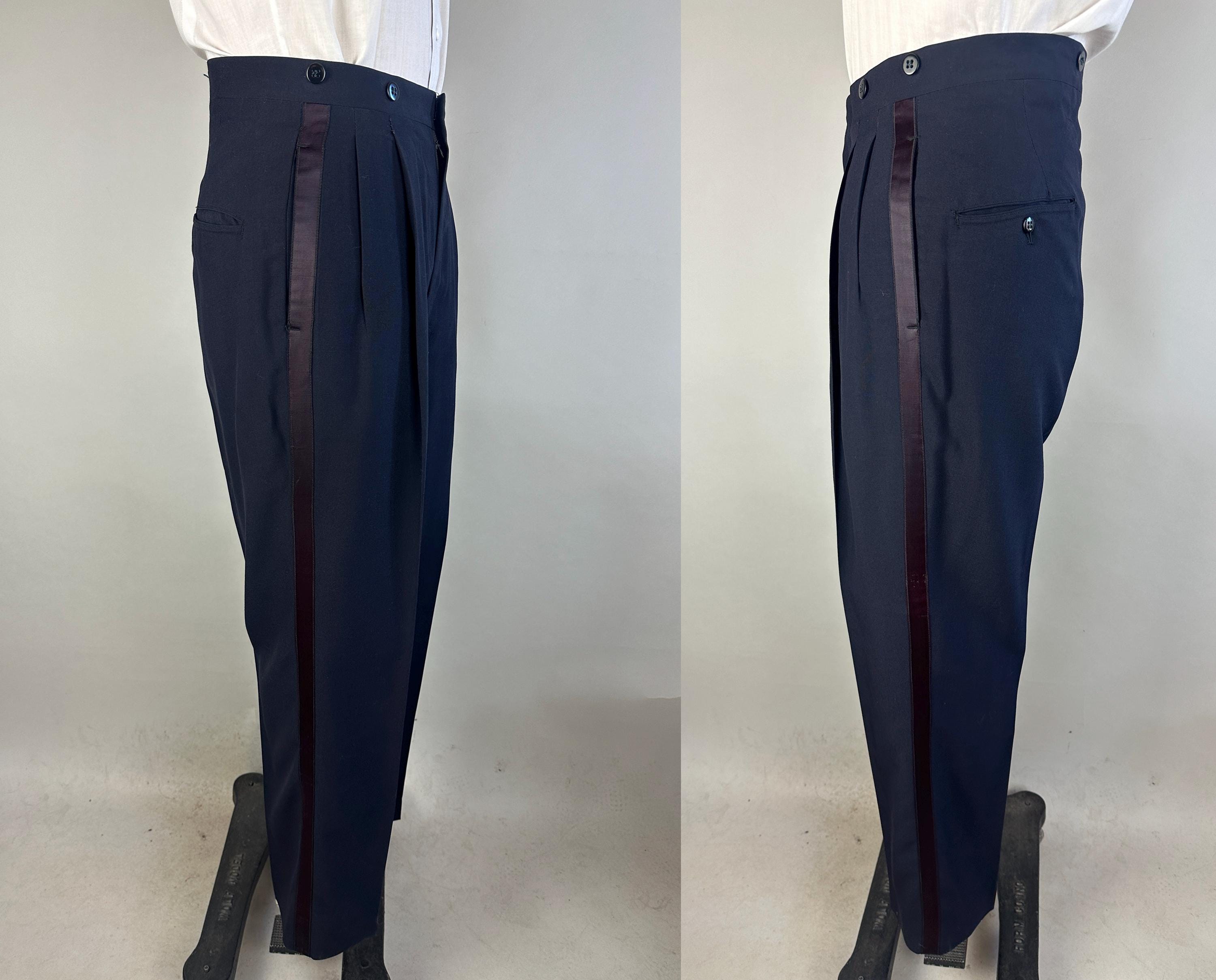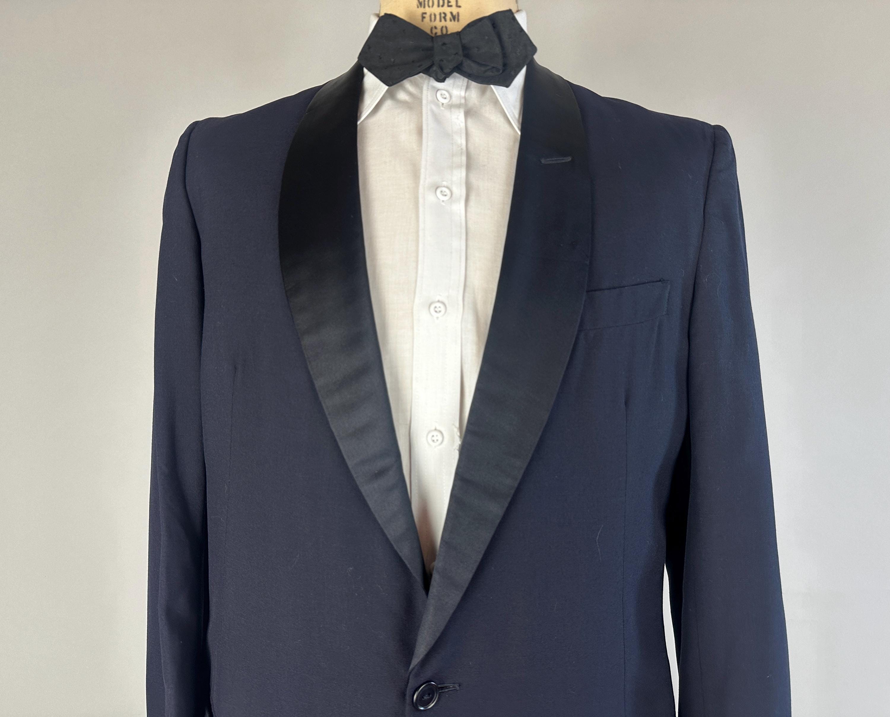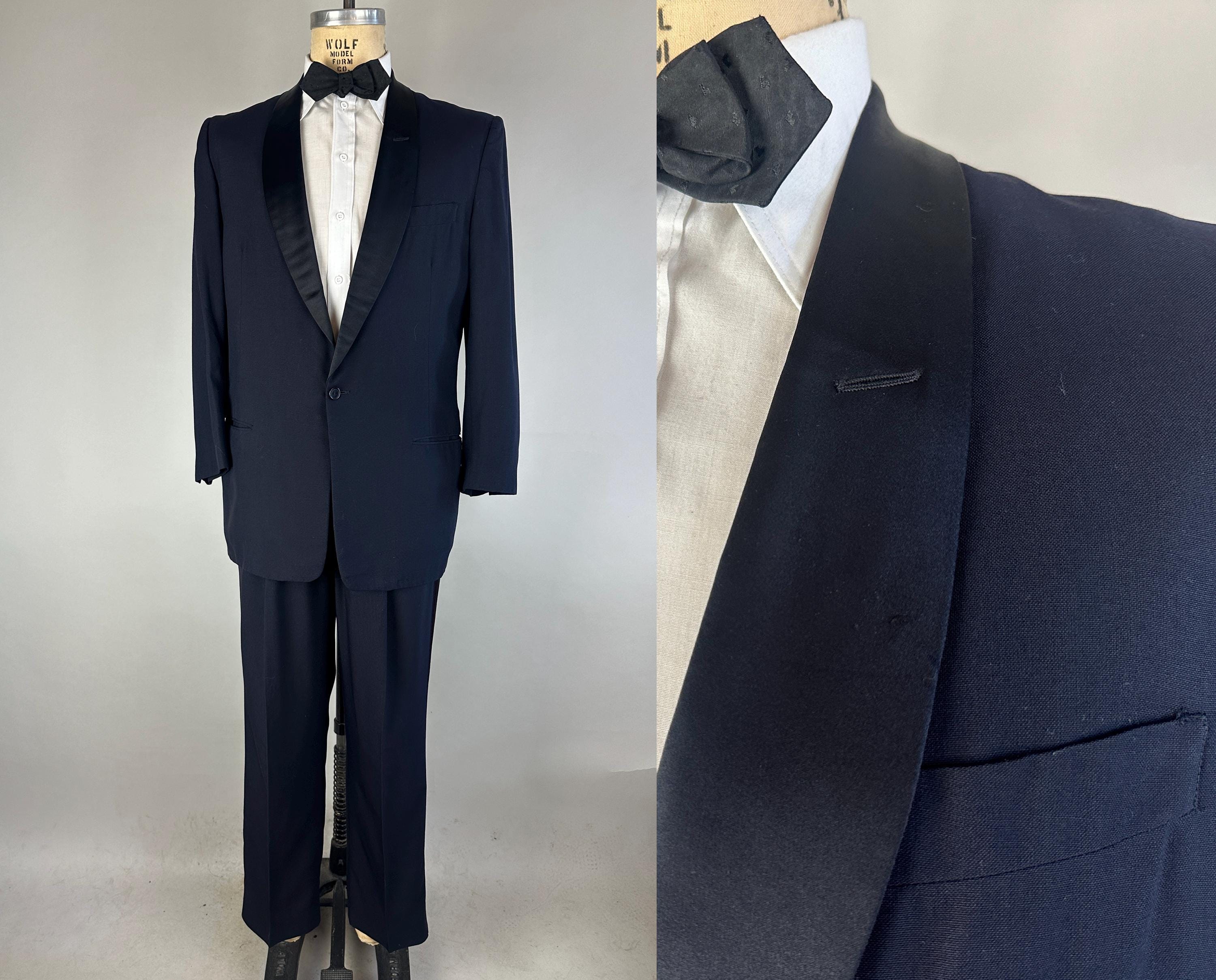 Swing and sway like a member of the Rat Pack in this 1950's tux! Light weight wool in a soft black features classic accents of silk making up the shawl lapel and trousers stripes. Jacket is single breasted with single button closure, two welted hip pockets, jetted chest pocket, full rayon satin lining with inner pocket, shoulder pads, and three matching buttons on each cuff. Trousers are double pleated front with metal zipper fly with hook and eye, four welted pockets with one buttoning in the back, cuffless hems, outer suspender buttons, and deep plumb silk stripe down the sides. Labeled "After Six by Rudofker" and with a 1949-62 Union Label dating this suit to the 1950s. This suit is in great vintage condition, with no holes, stains, nor odors to note.