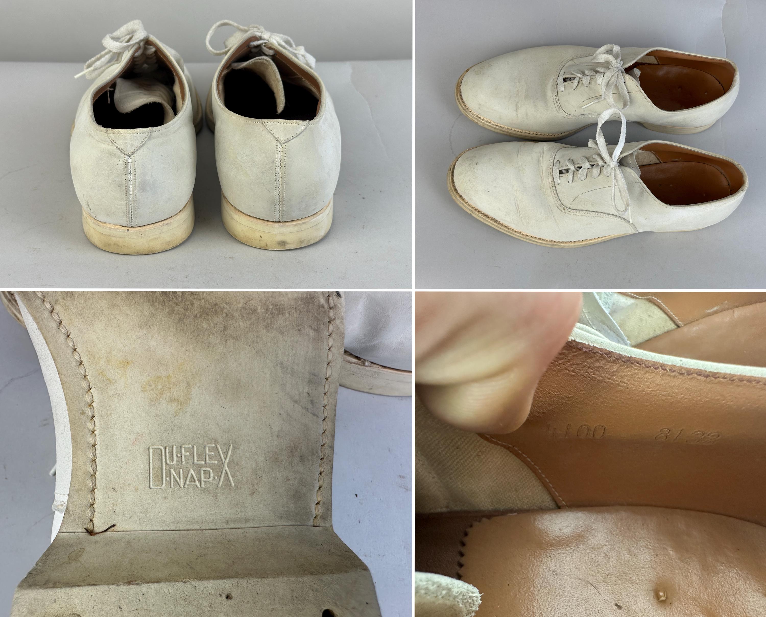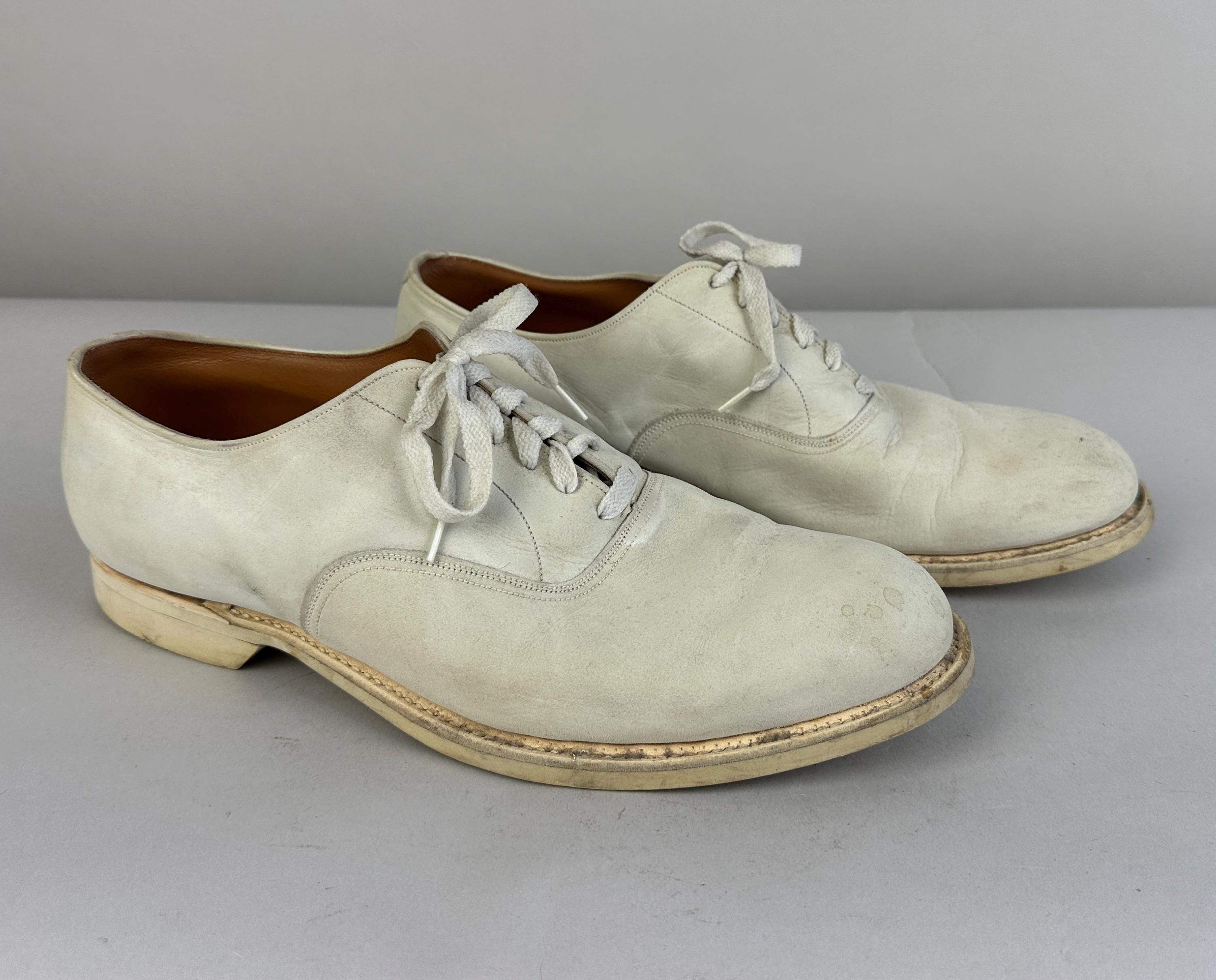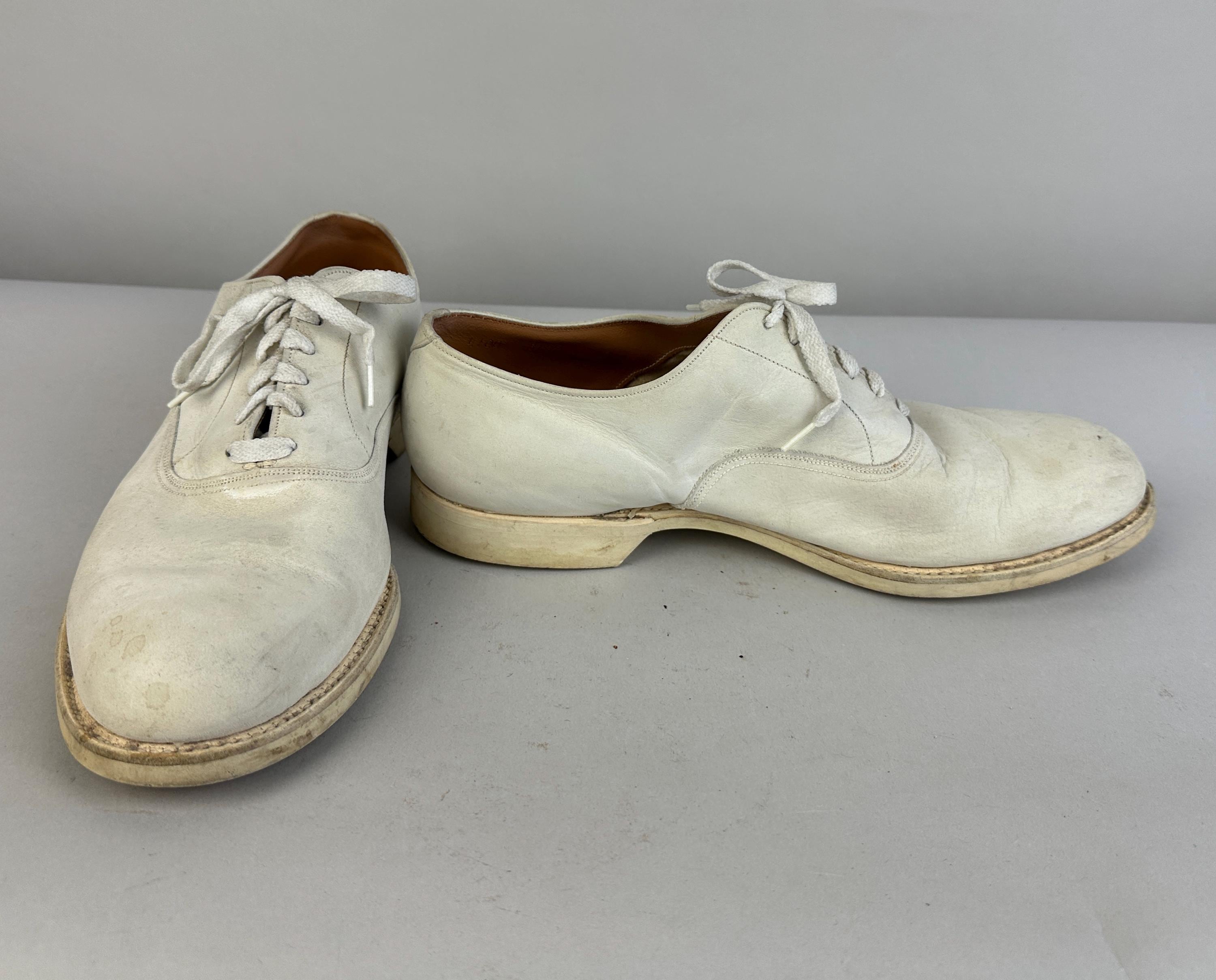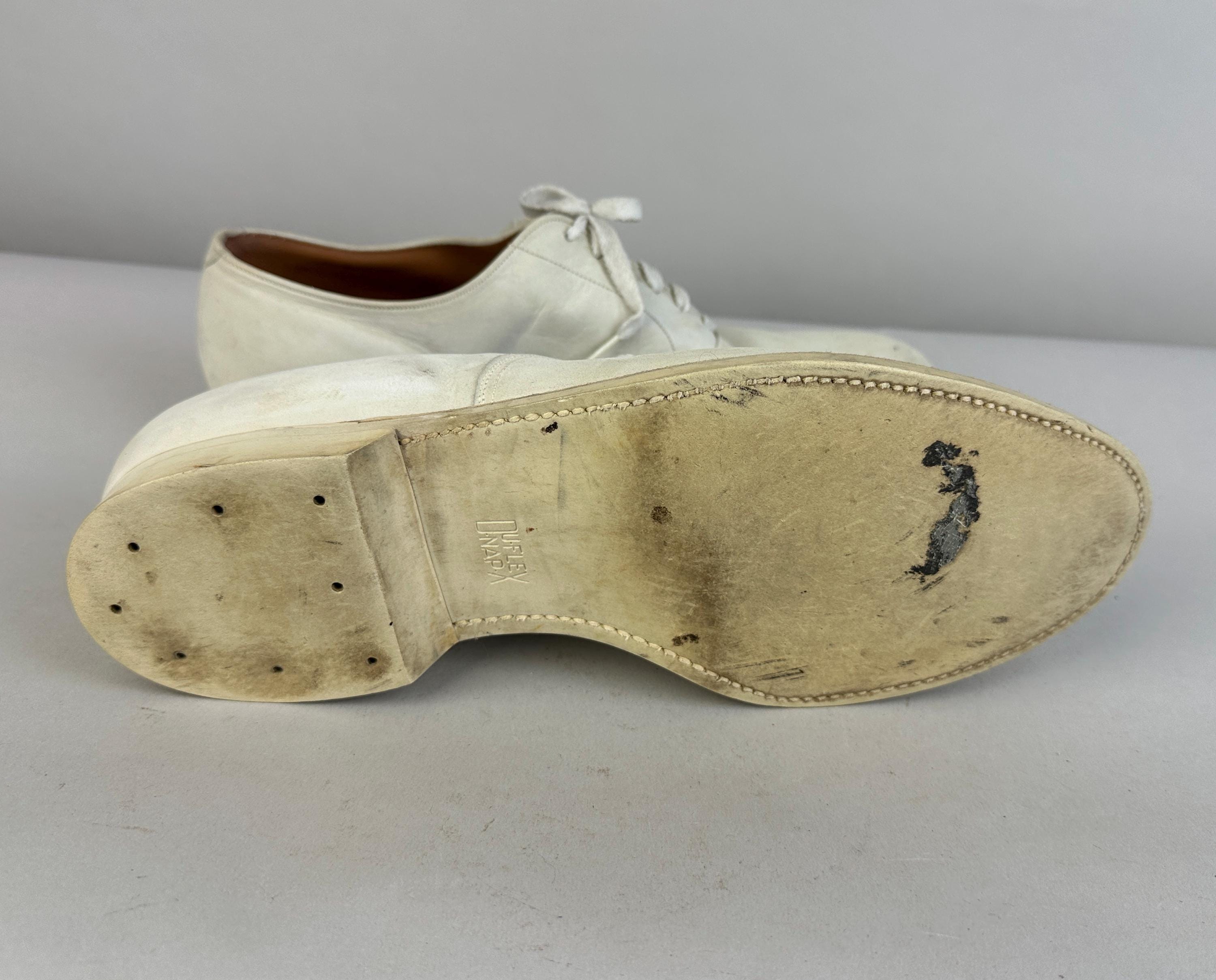 Buck the crowd and wear these 1950's white bucks anytime of year! Made of matte suede with a classic saddle shoe sole of rubber, they have six hole laces and rounded natural toe. These shoes are in great vintage condition, for white shoes they remain very clean looking for their age and overall wear is consistent for age.