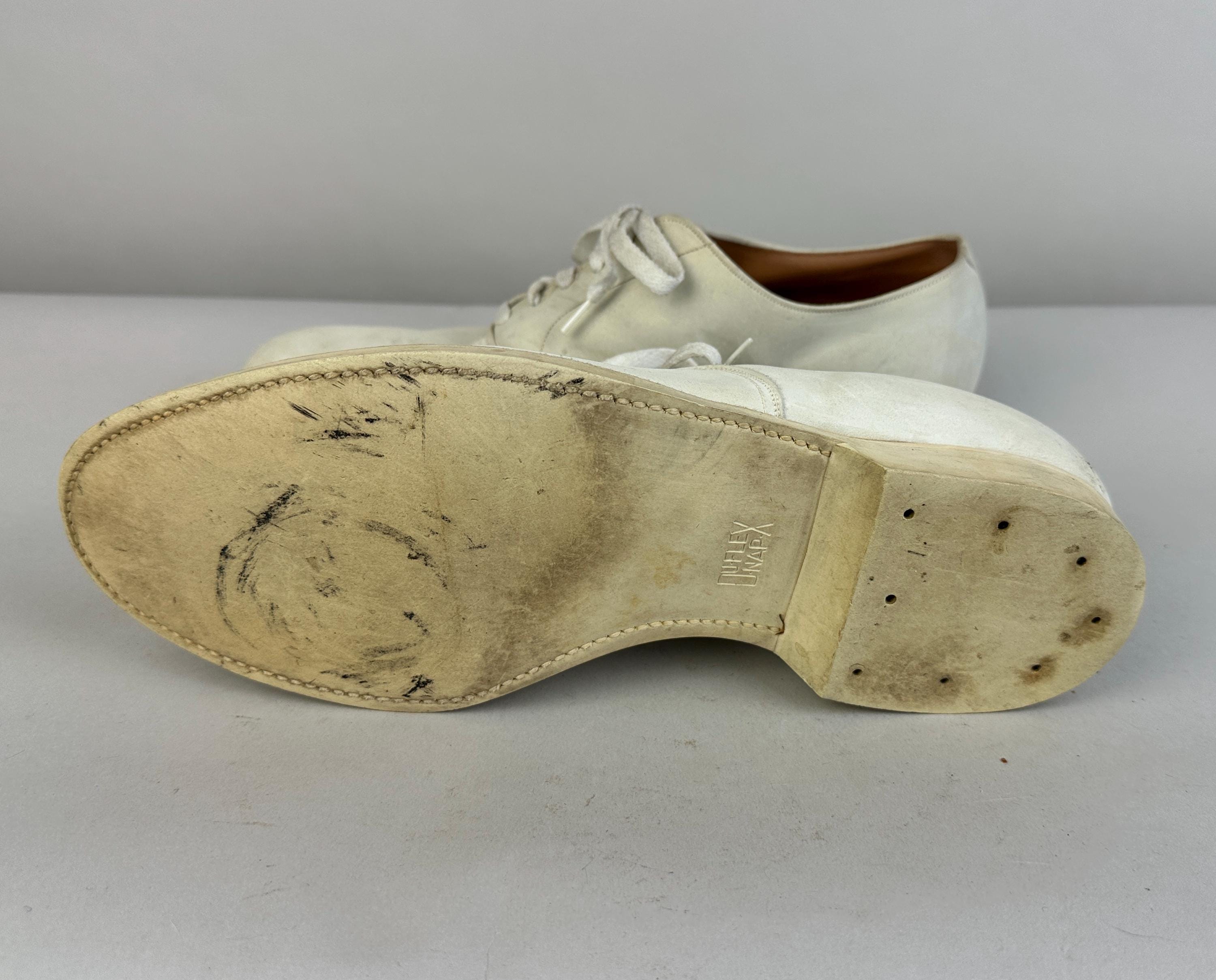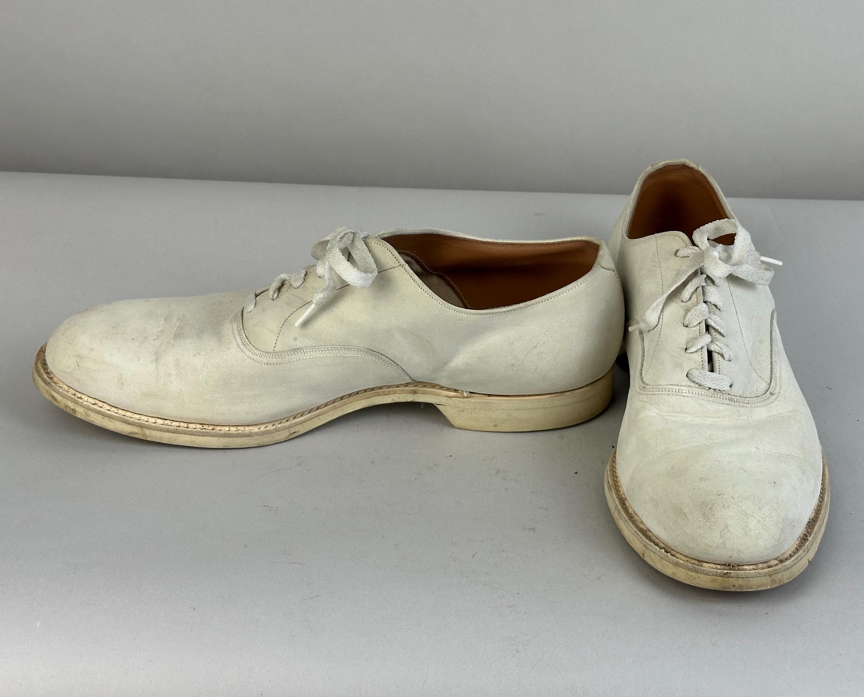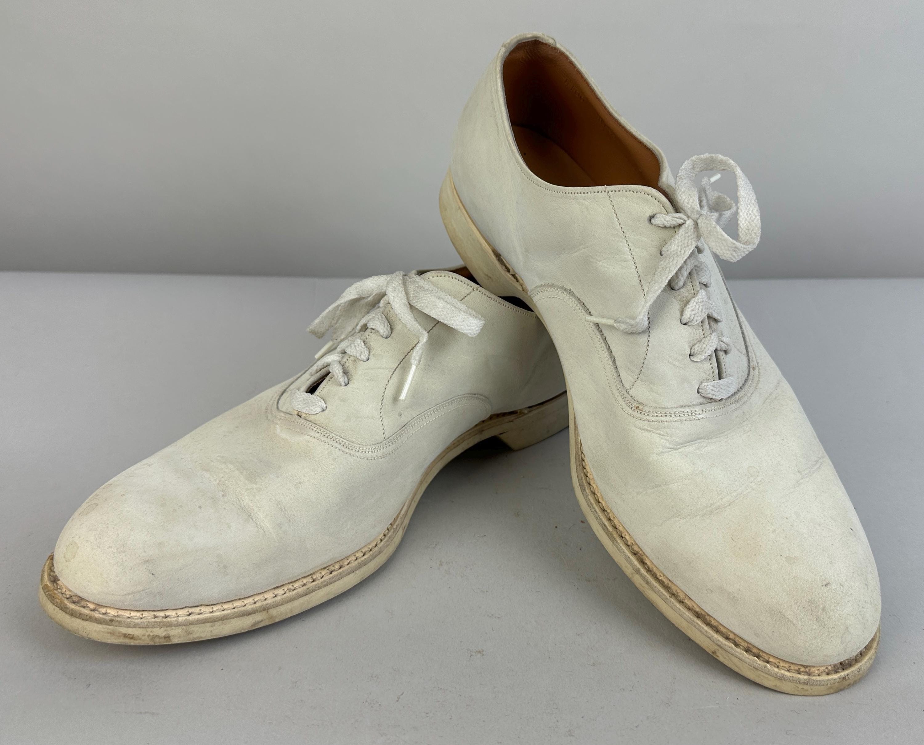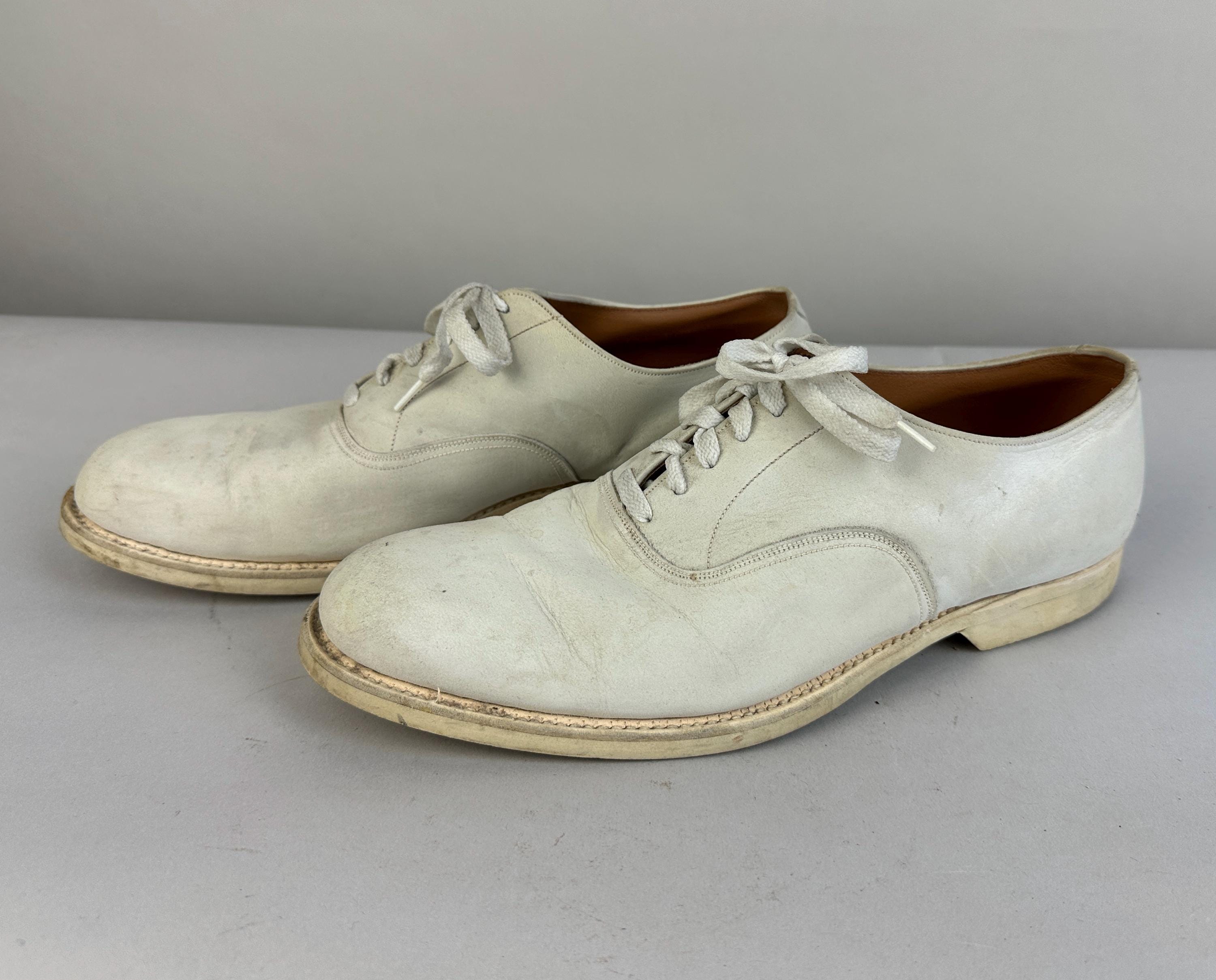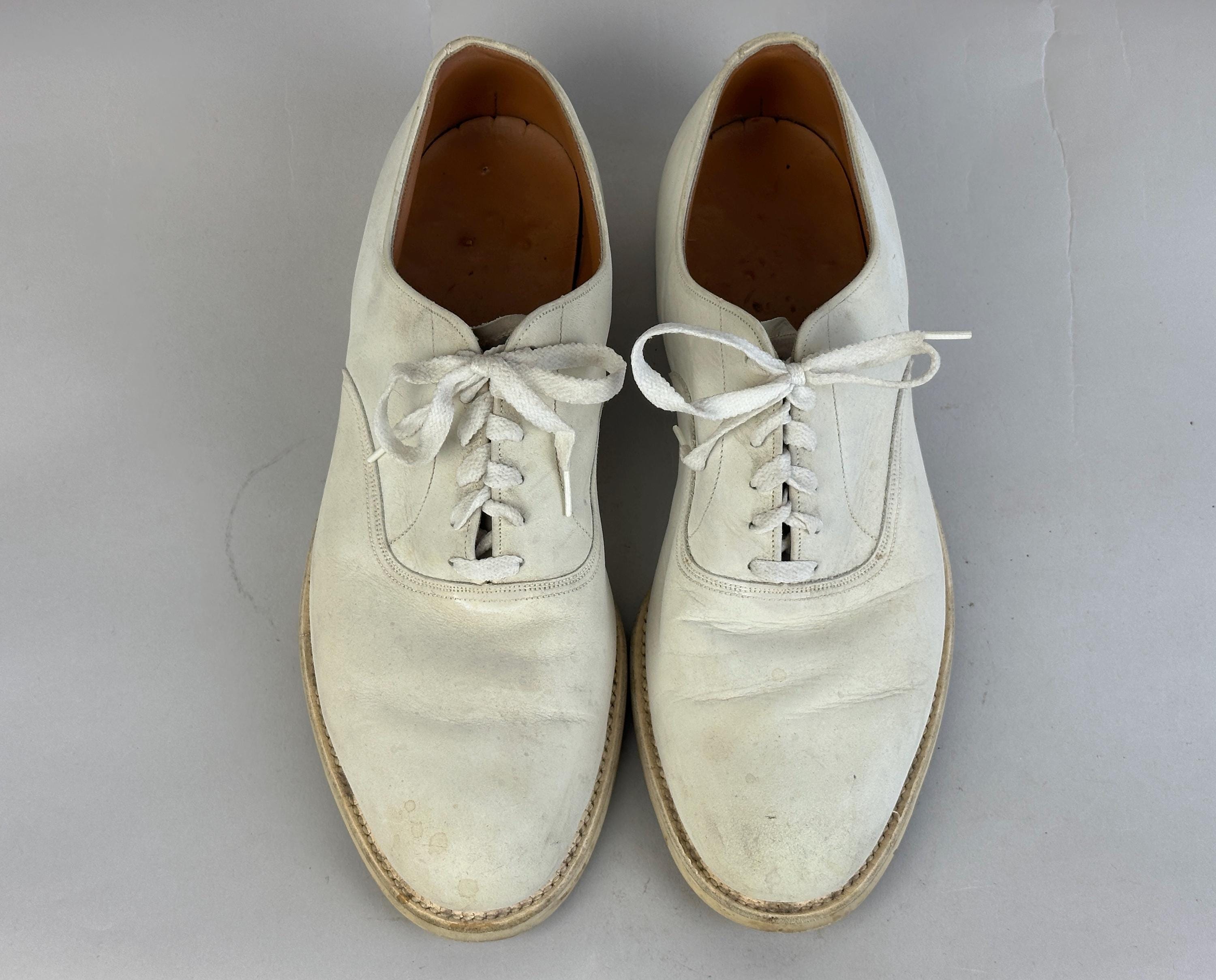 Buck the crowd and wear these 1950's white bucks anytime of year! Made of matte suede with a classic saddle shoe sole of rubber, they have six hole laces and rounded natural toe. These shoes are in great vintage condition, for white shoes they remain very clean looking for their age and overall wear is consistent for age.