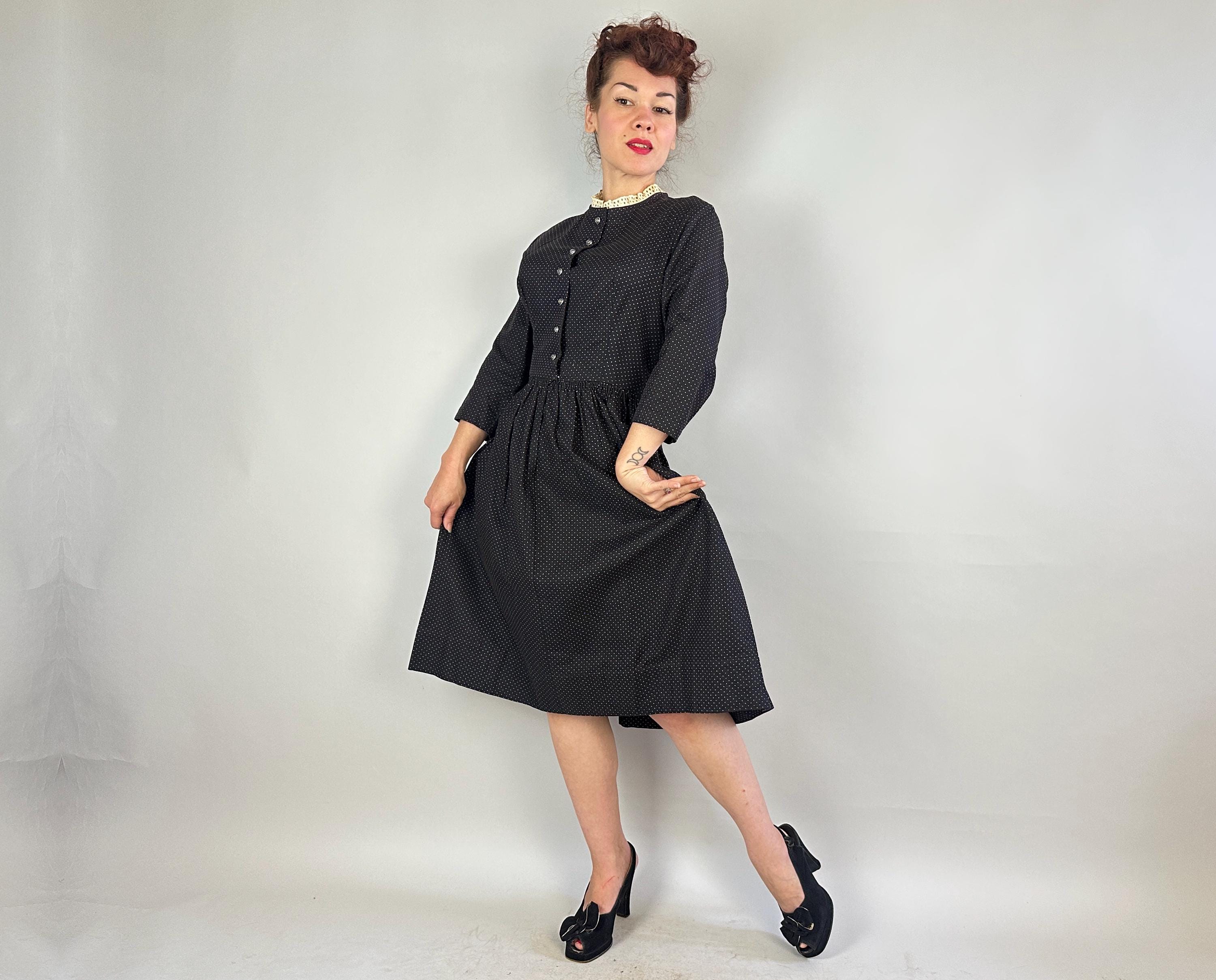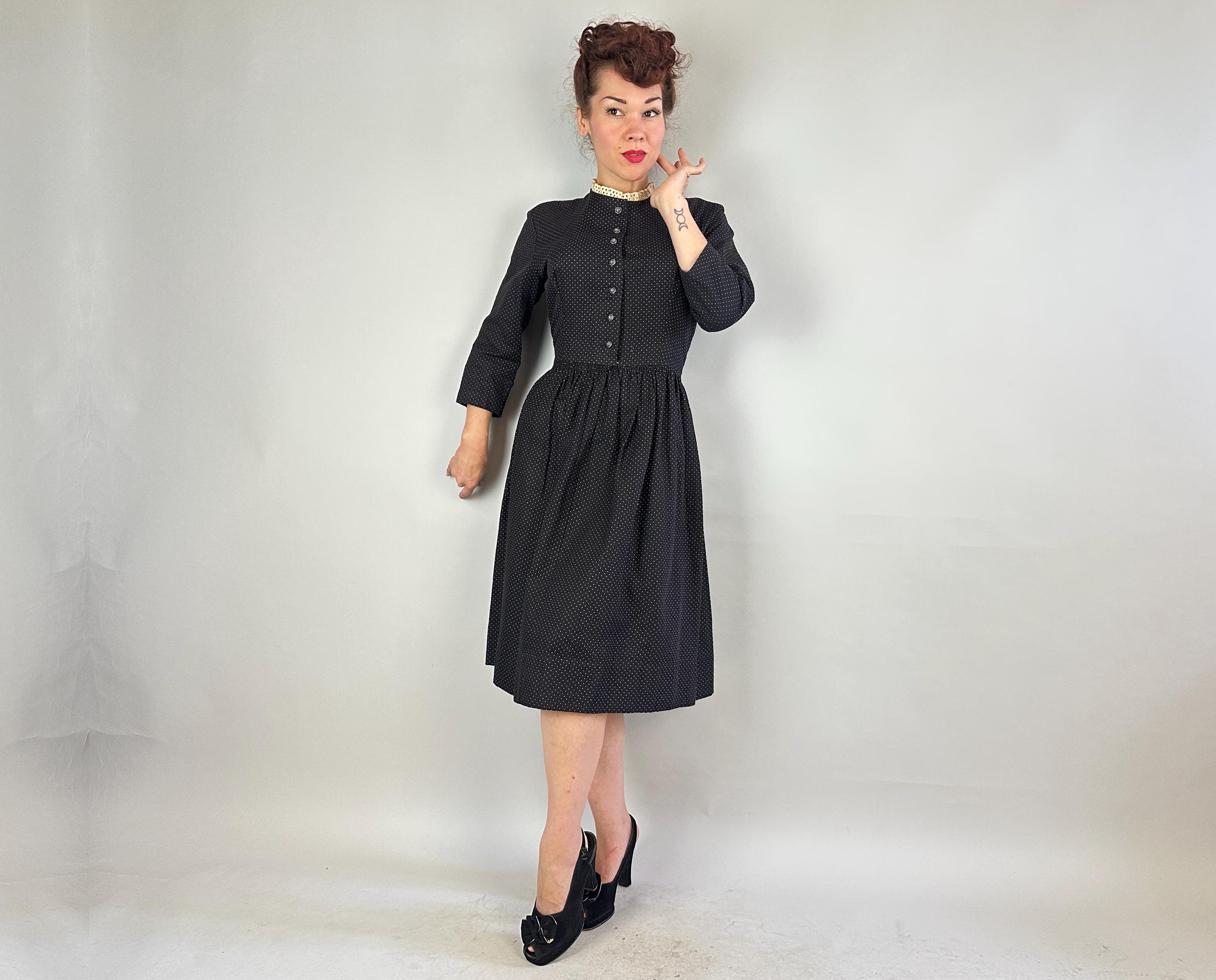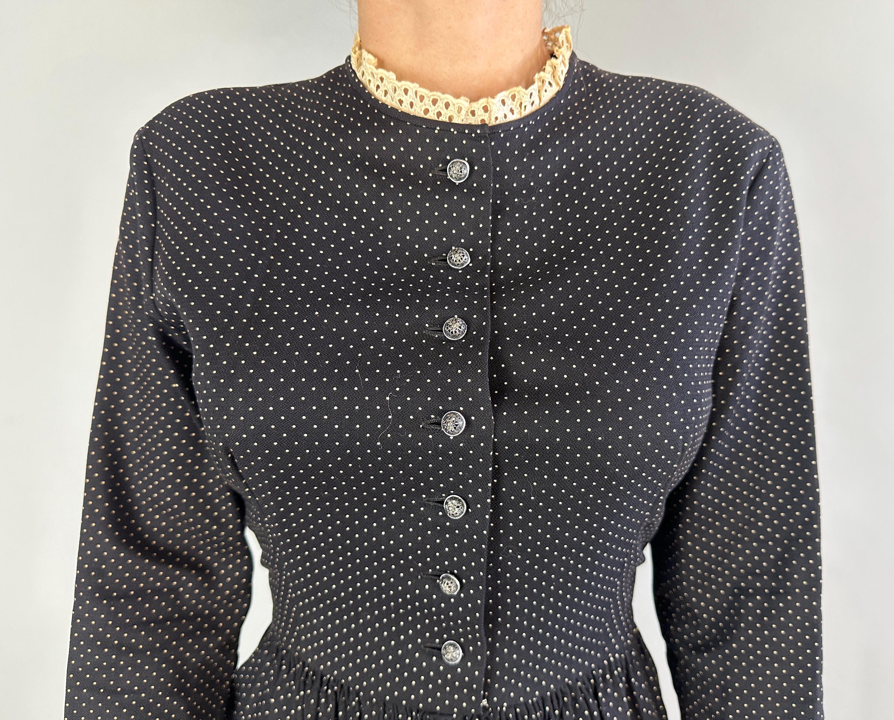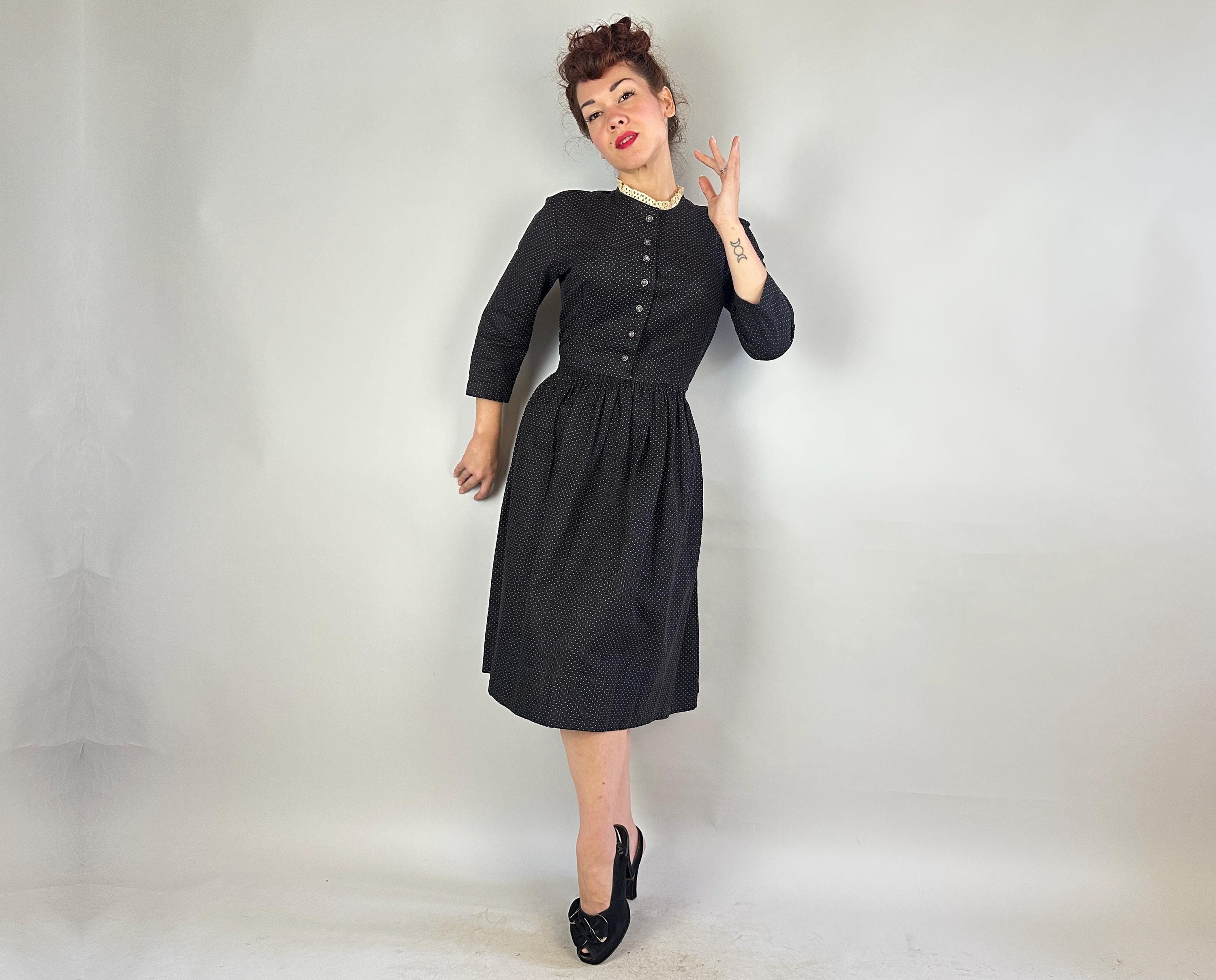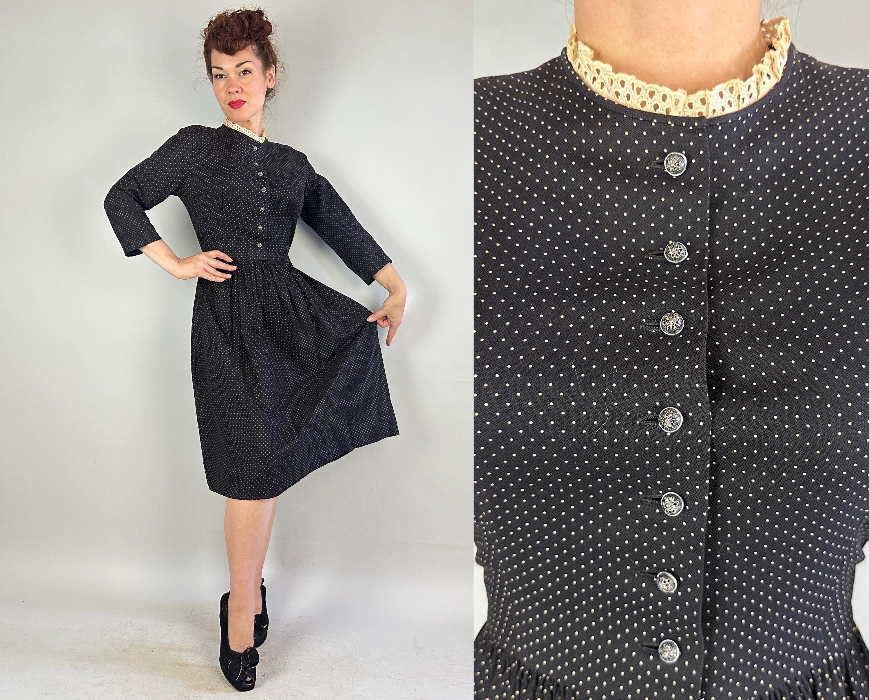 Follow the stars and navigate your day with ease in this 1950s "Lanz" frock! Woven cotton in a classic Swiss dot of white on black looks extra sweet and demure with a trim of eyelet lace on the high neckline. Filagree style buttons fasten the bodice and smocking around the waist adds fullness to the skirt. Made in Austria. This dress is in great vintage condition, with no holes, stains, or odors to note.