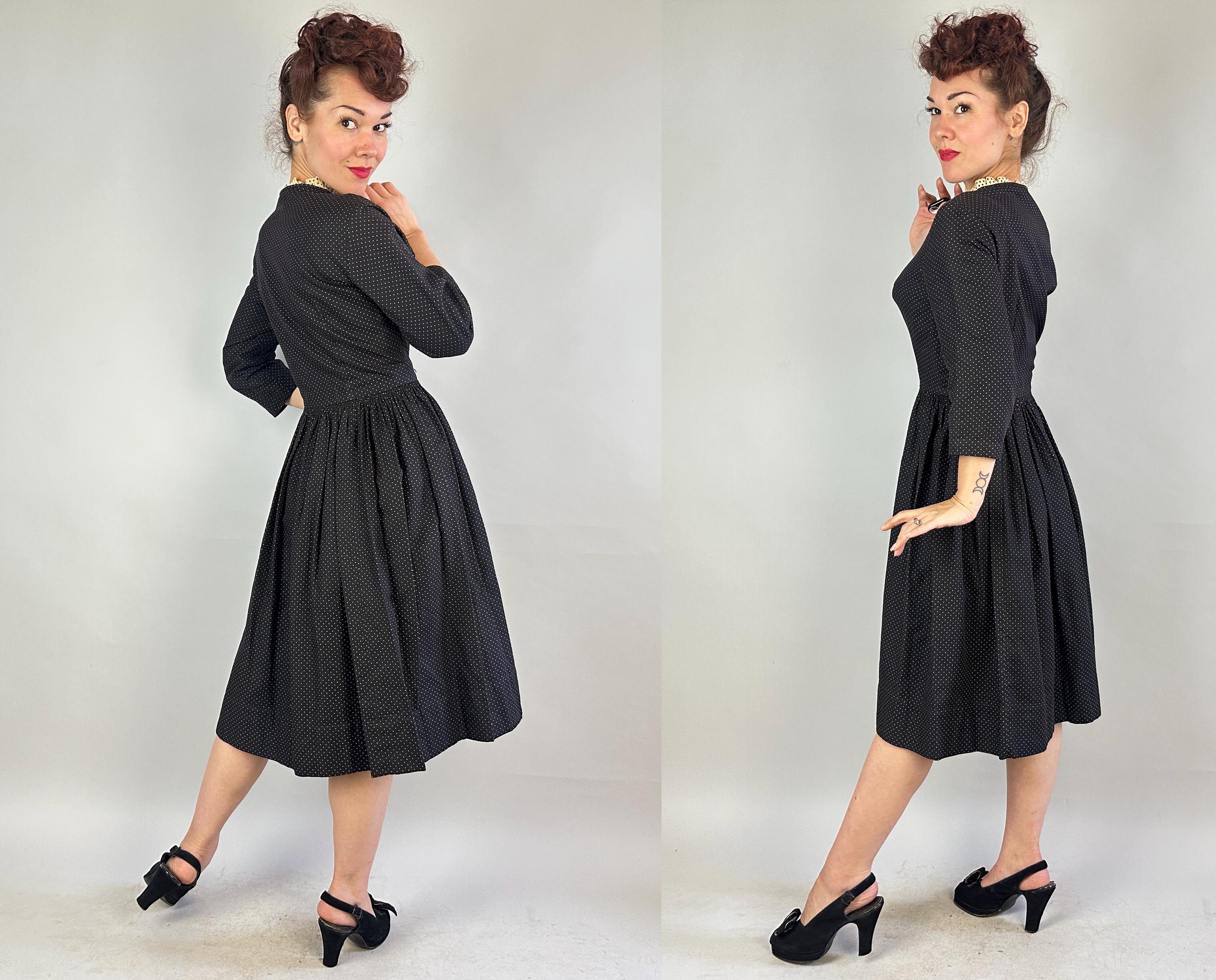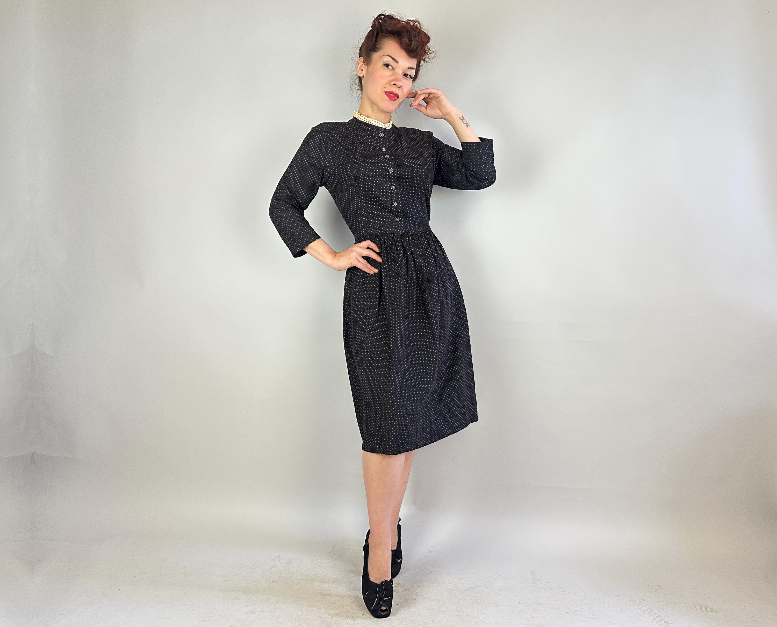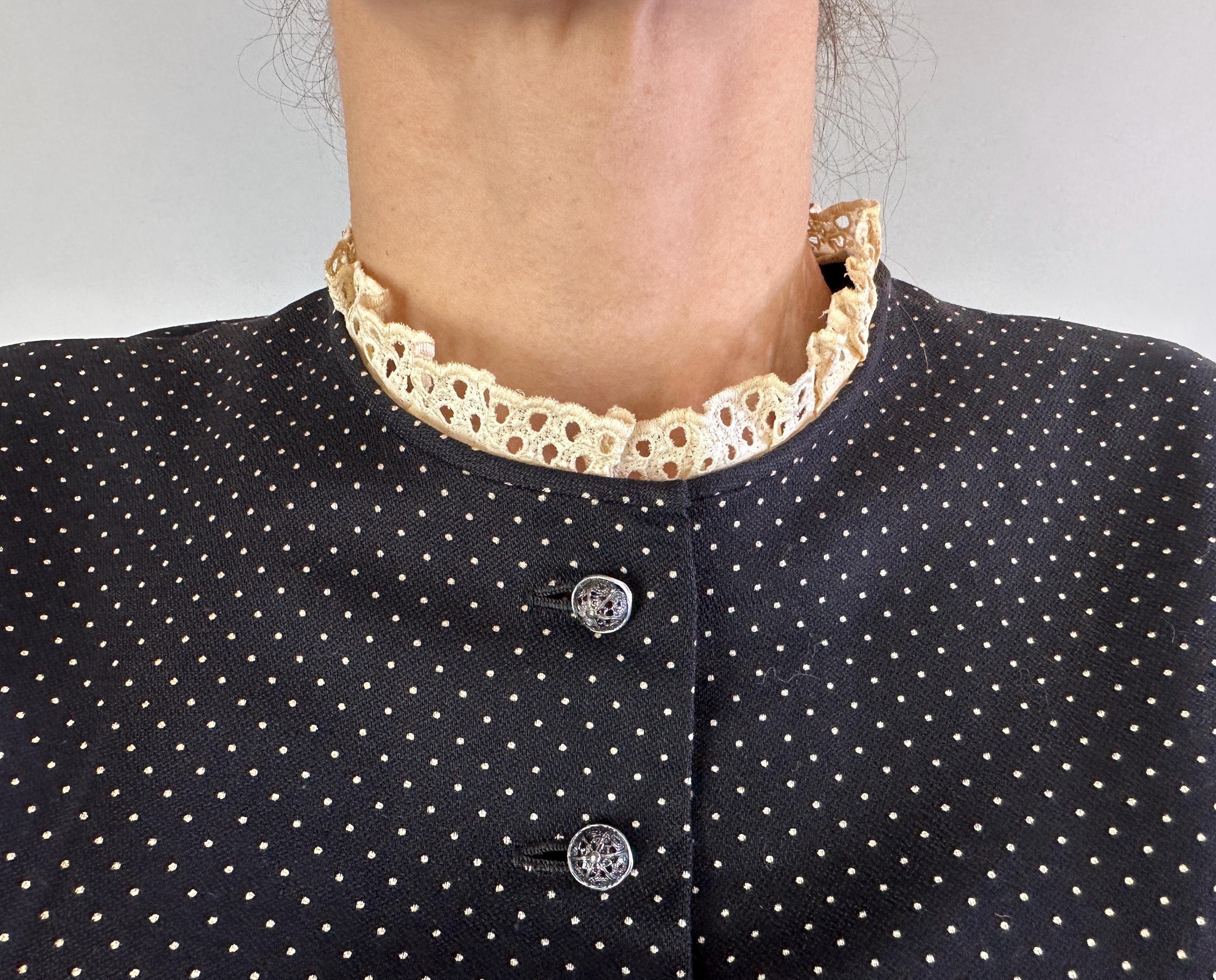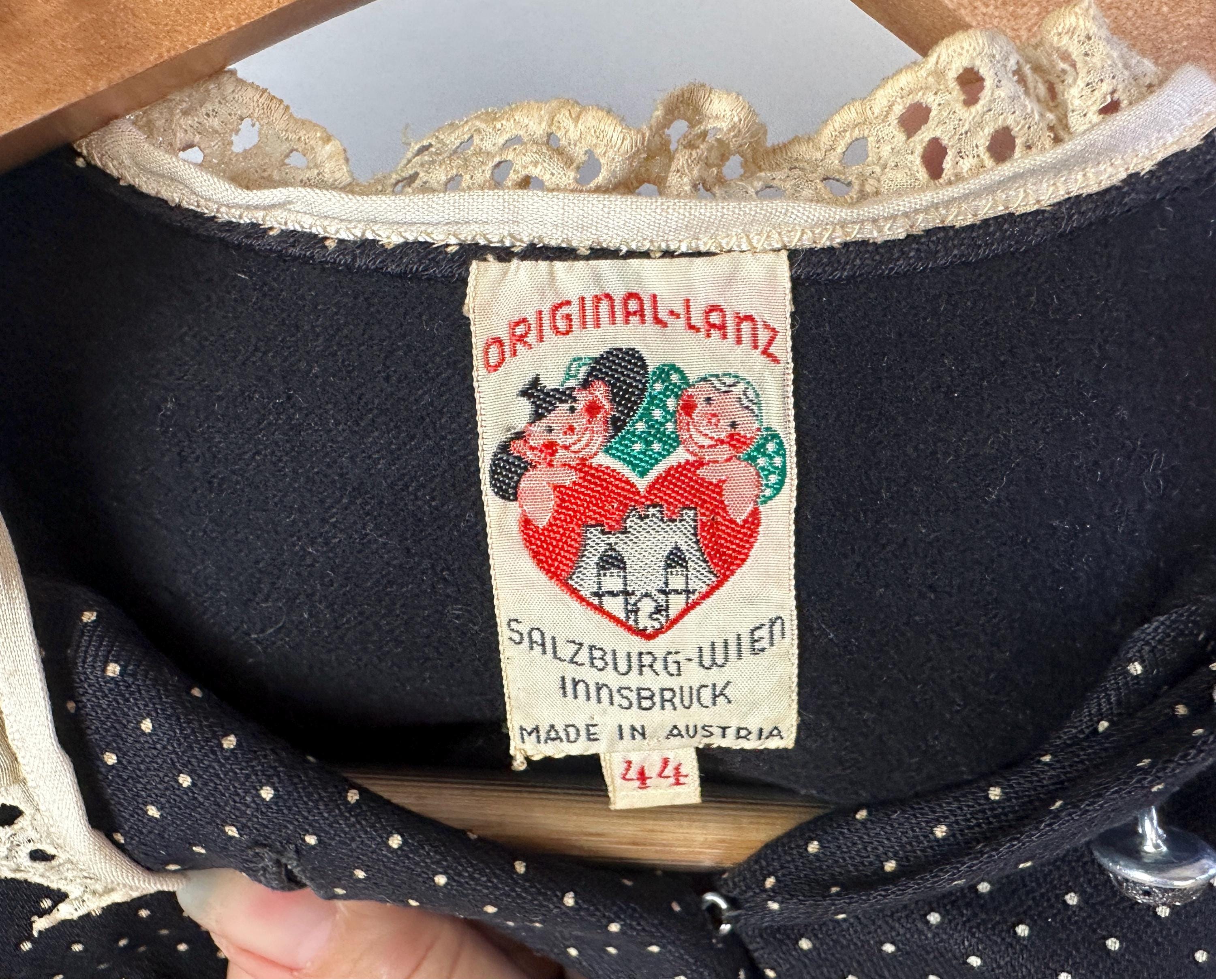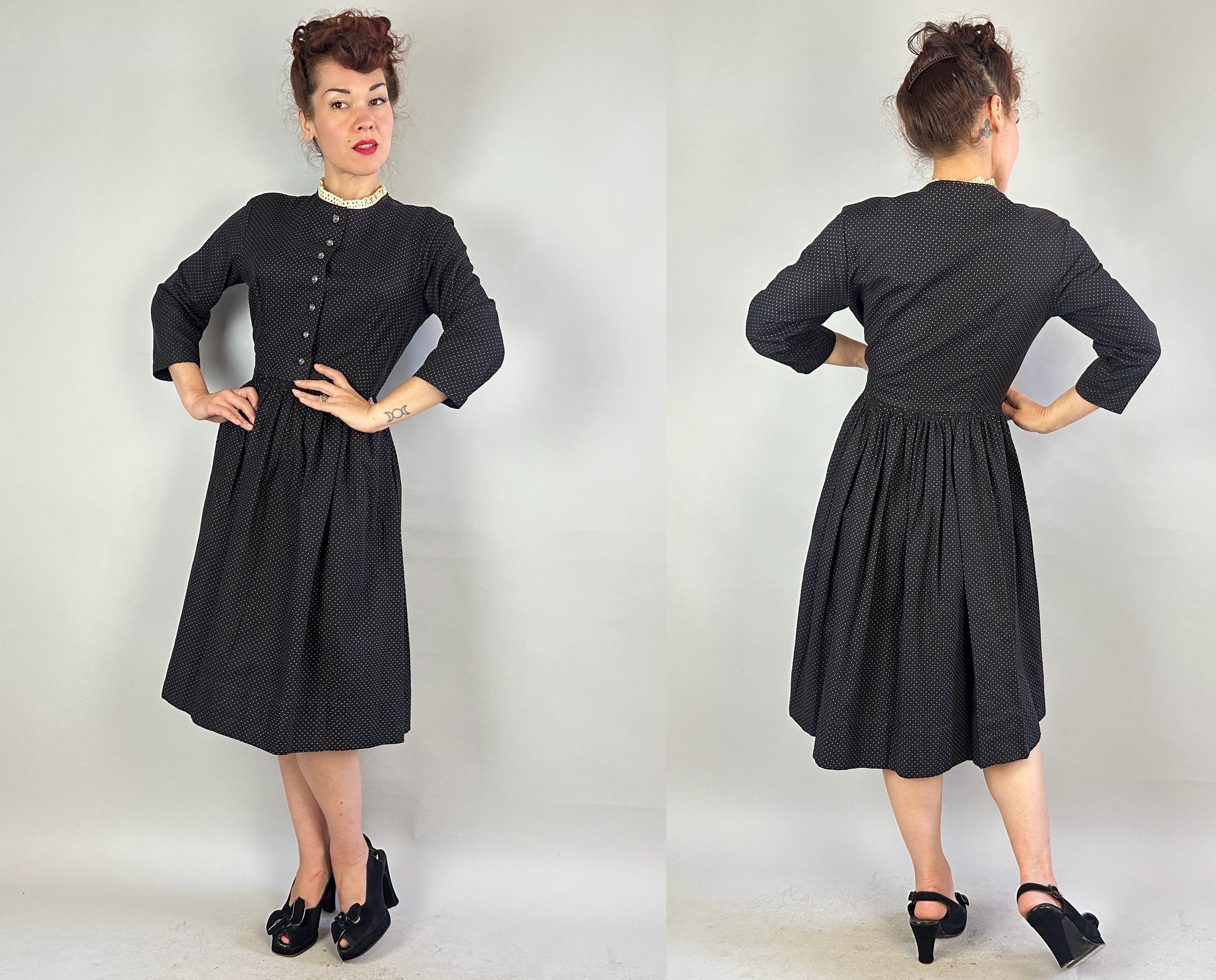 Follow the stars and navigate your day with ease in this 1950s "Lanz" frock! Woven cotton in a classic Swiss dot of white on black looks extra sweet and demure with a trim of eyelet lace on the high neckline. Filagree style buttons fasten the bodice and smocking around the waist adds fullness to the skirt. Made in Austria. This dress is in great vintage condition, with no holes, stains, or odors to note.