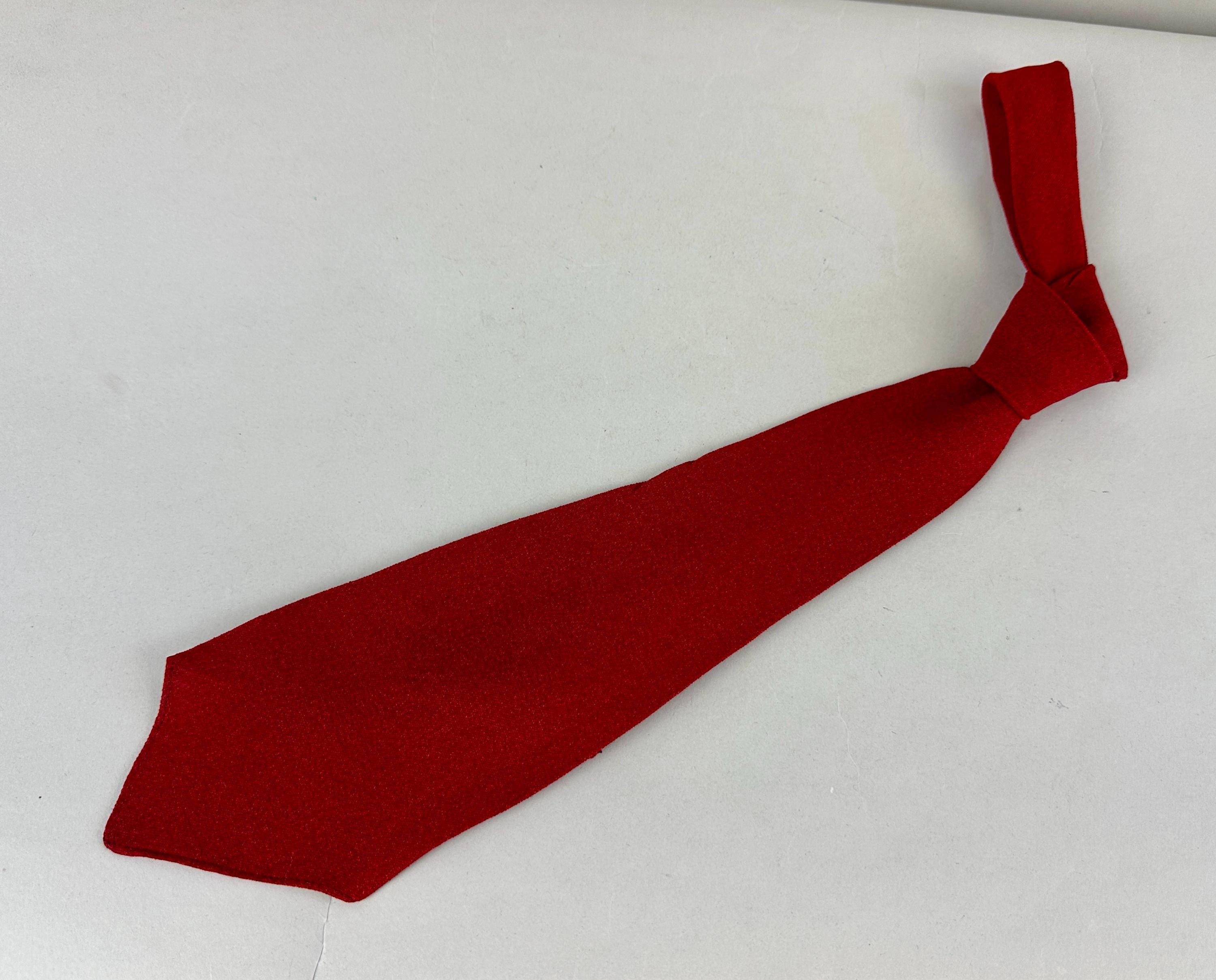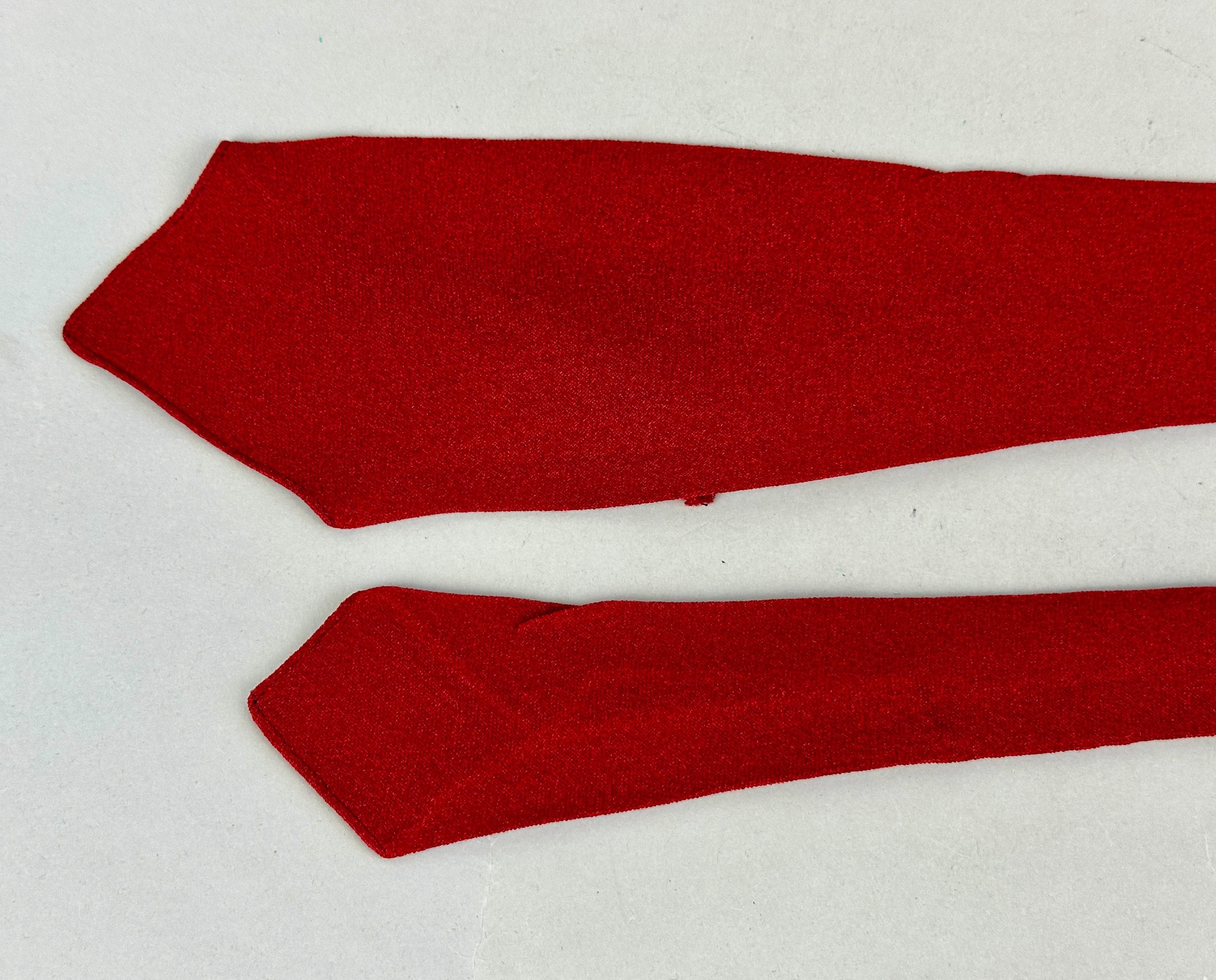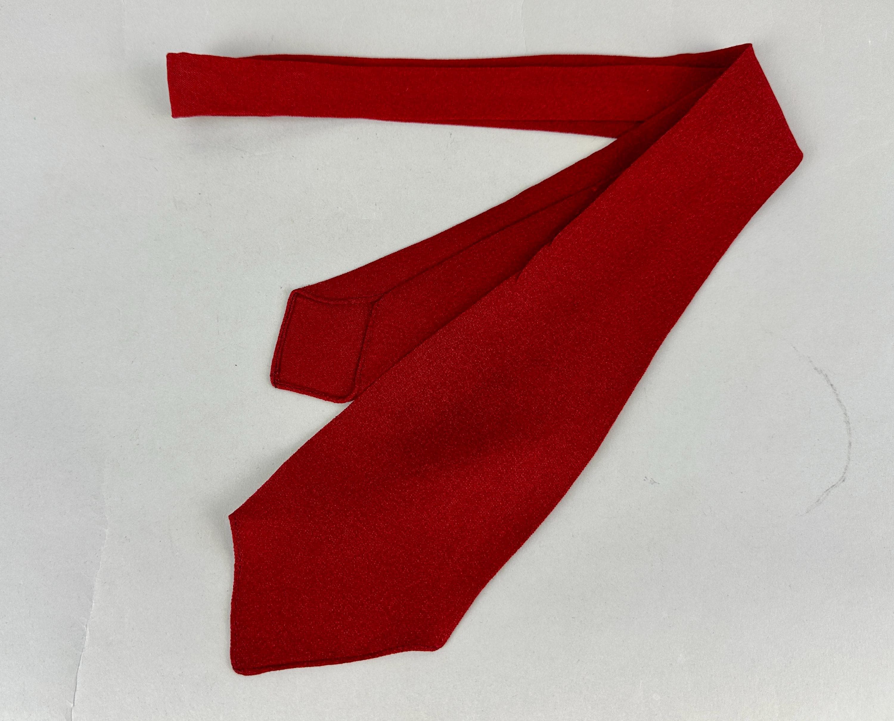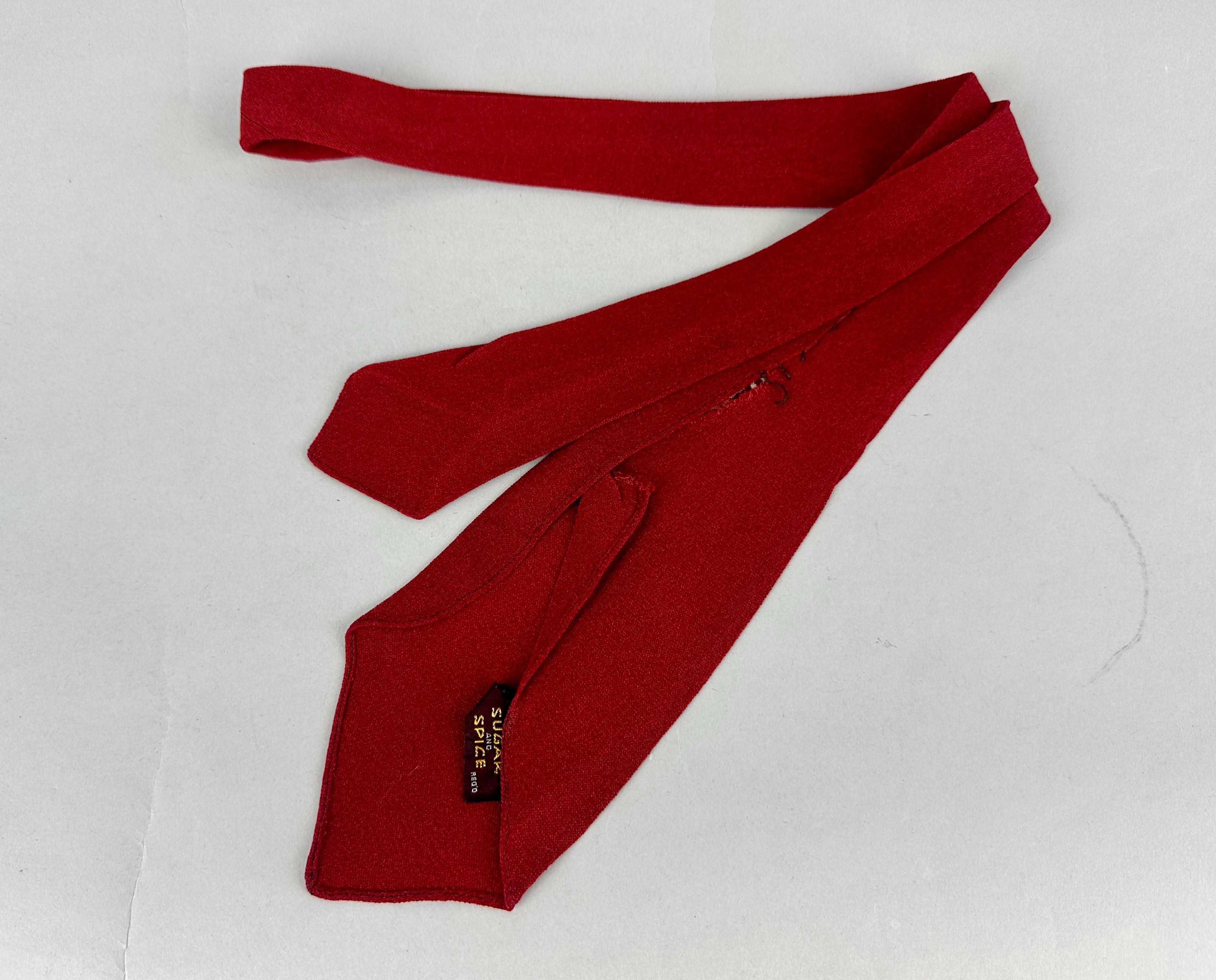 This solid power colour 1930's necktie will have you ready to take on anything! Wool crepe in Alizarin crimson makes a statement with it's understated elegance. Unlined and labeled "Sugar and Spice". Pairs well with a wide variety of Art Deco and Mid-Century suit colors and fabric types. This tie is in great vintage condition with no flaws found!