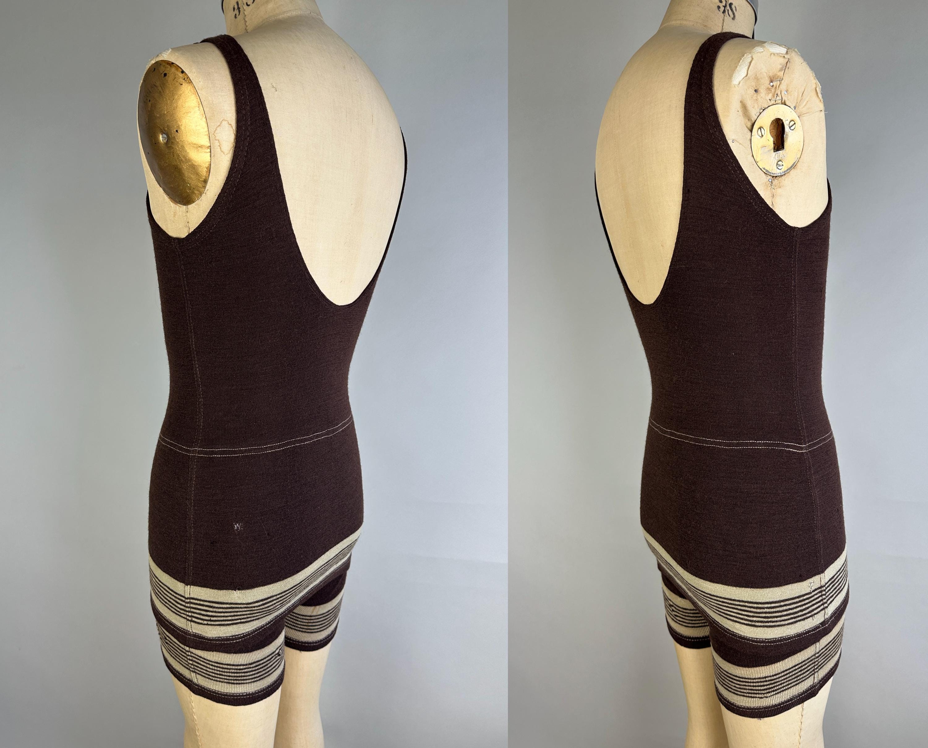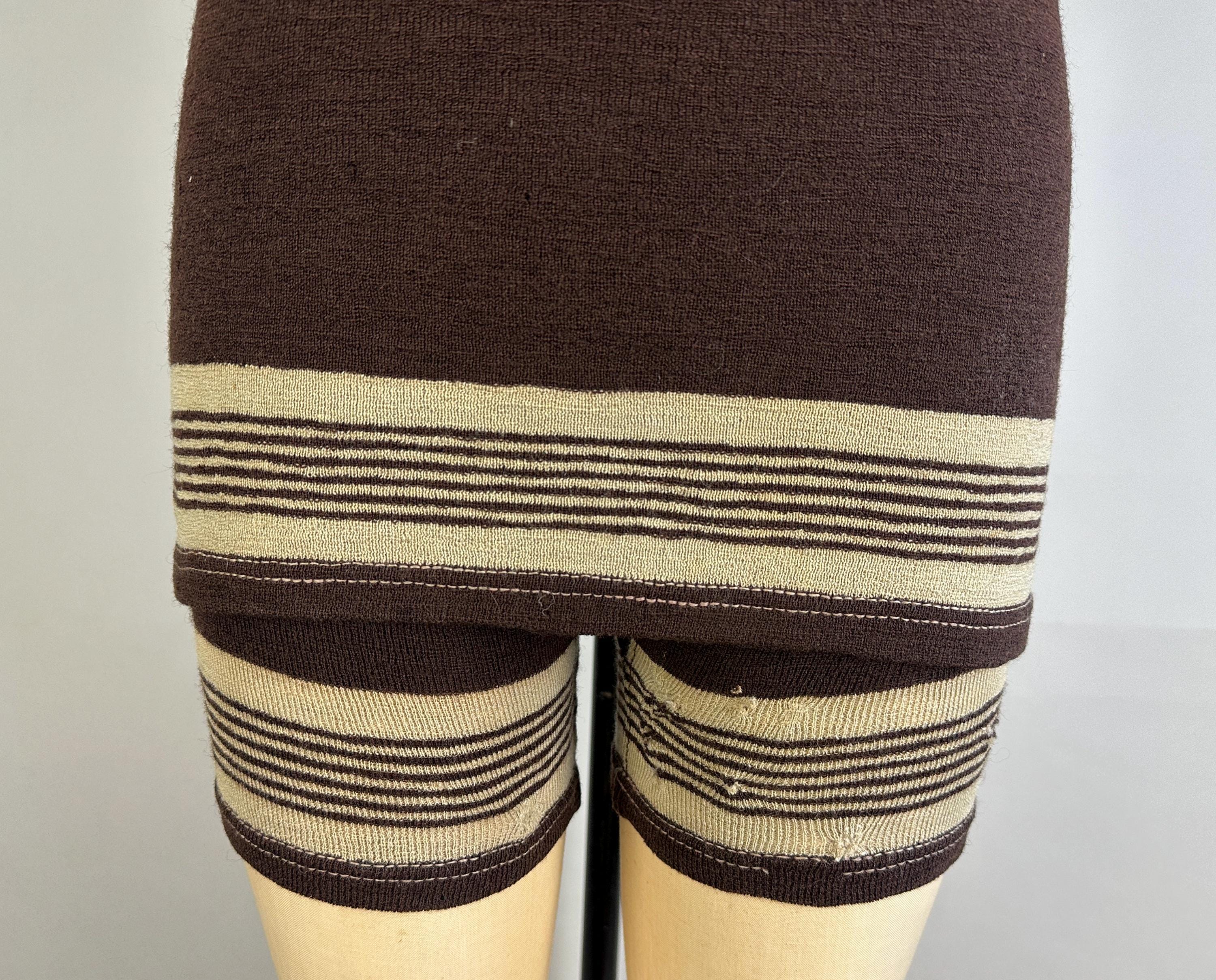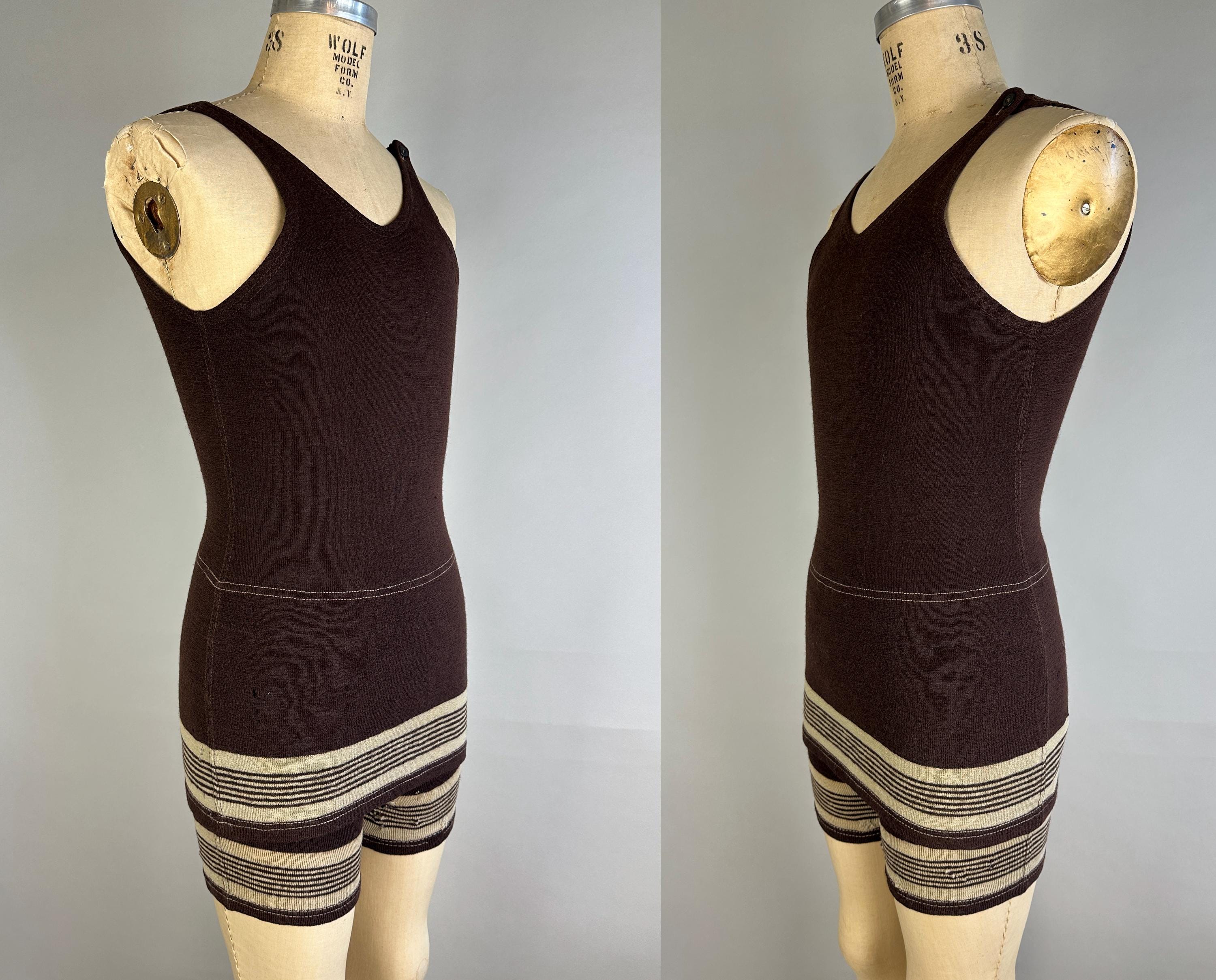 Energize your beachwear game in this 1920’s swimsuit! The coffee bean brown wool features skirted shorts with stripes of cappuccino foam beige on both the legs and skirt. Button fastens over the left shoulder and low dipped back. This swimsuit is in goood vintage condition, visible mends but no holes, stains, nor odors to note.