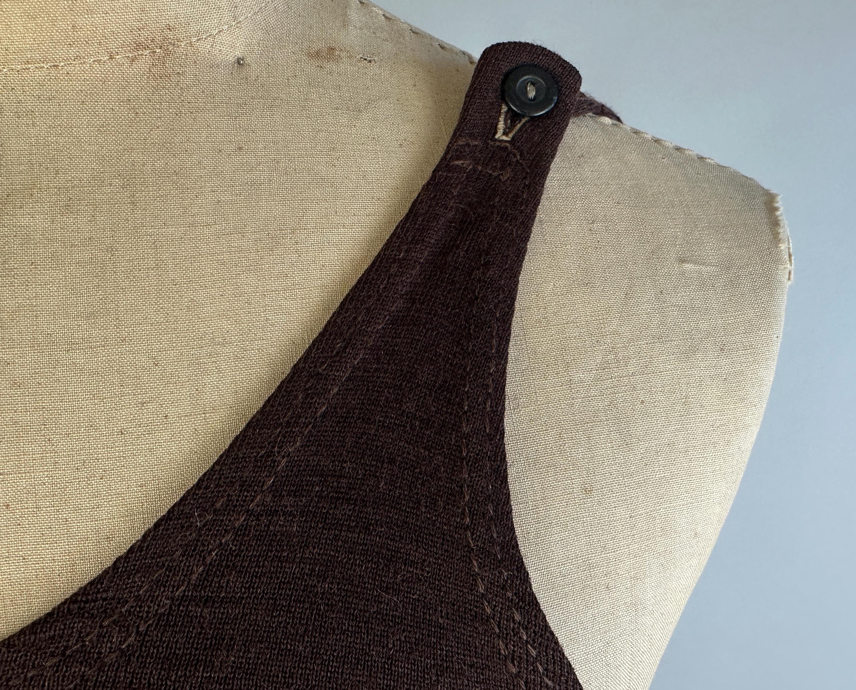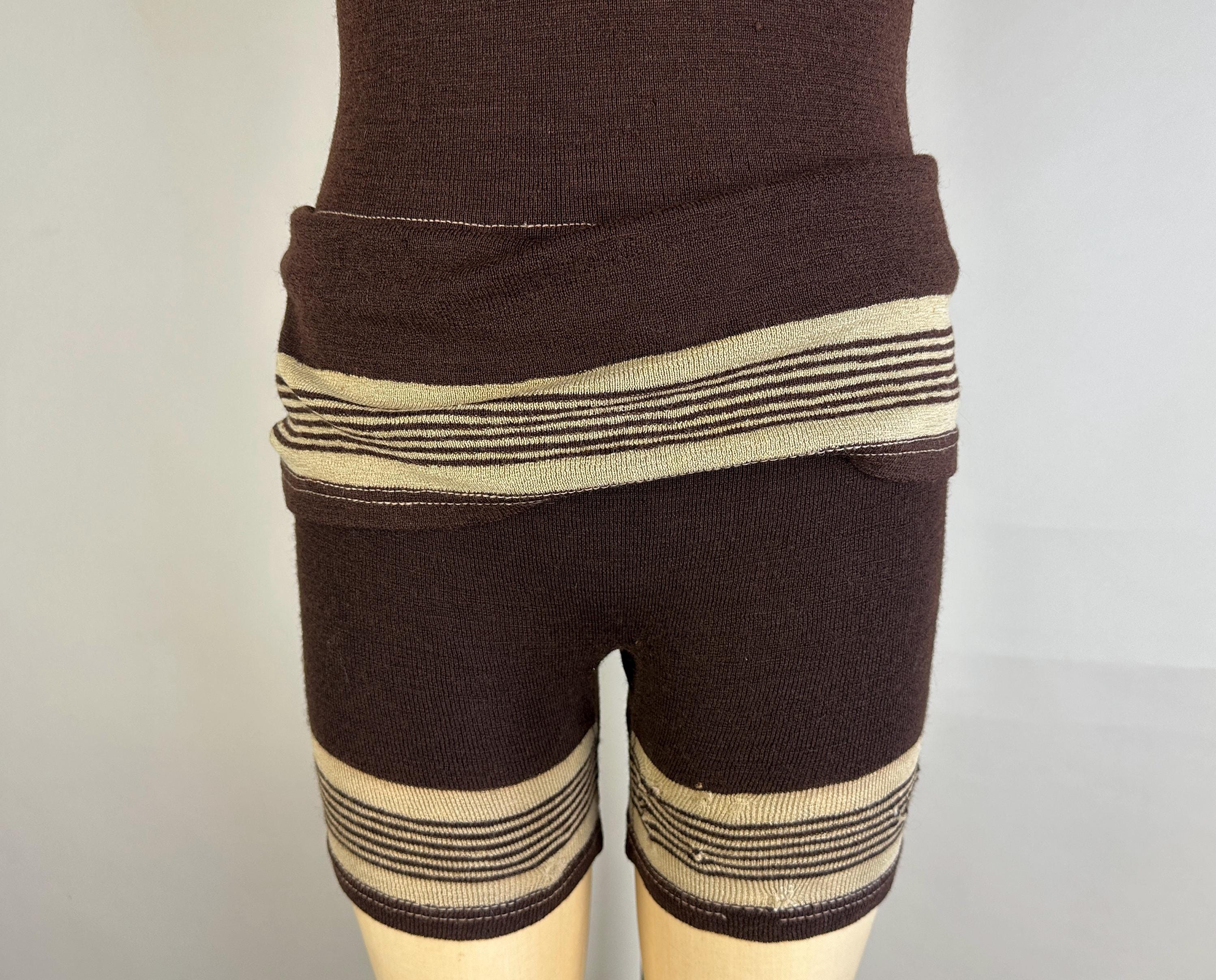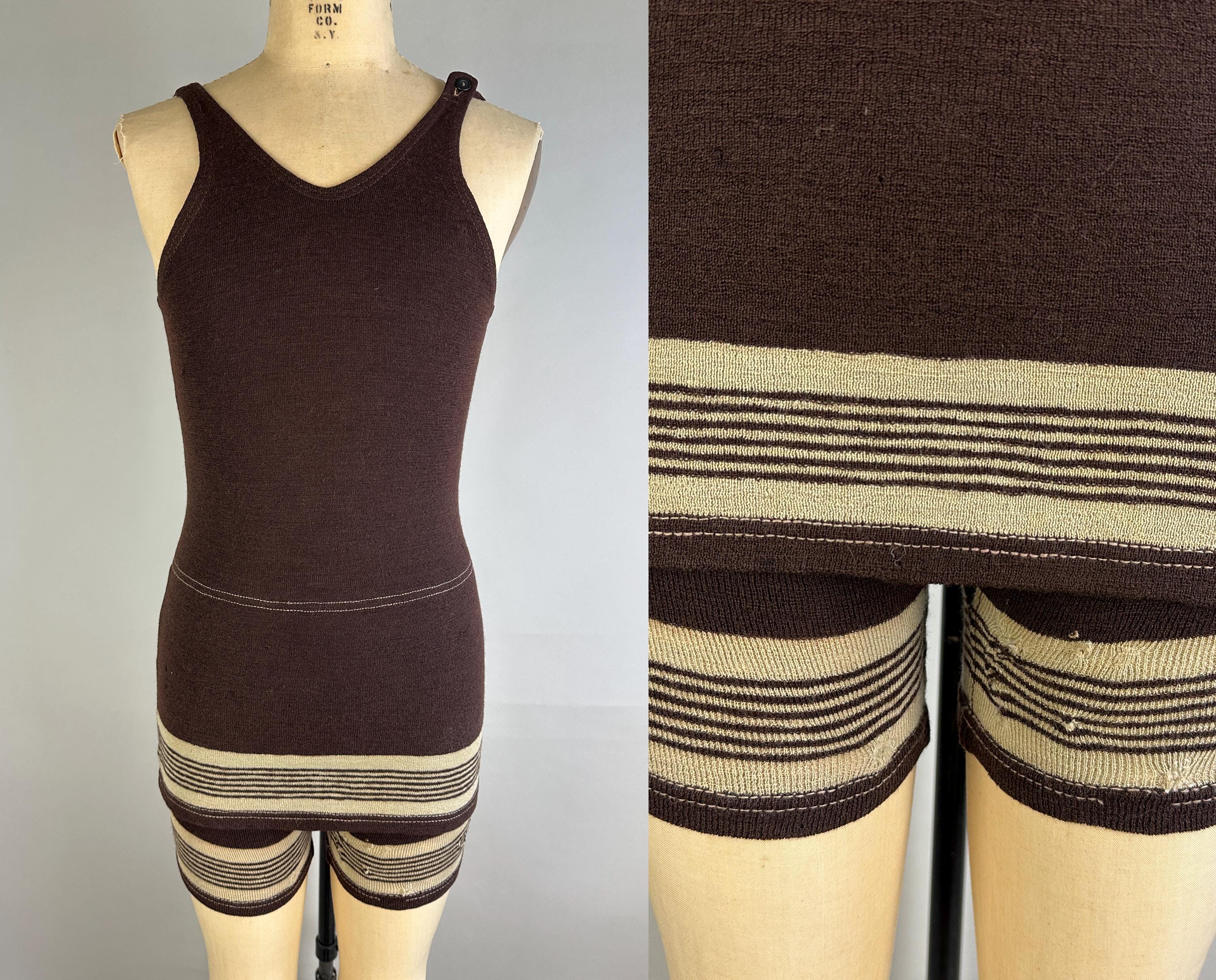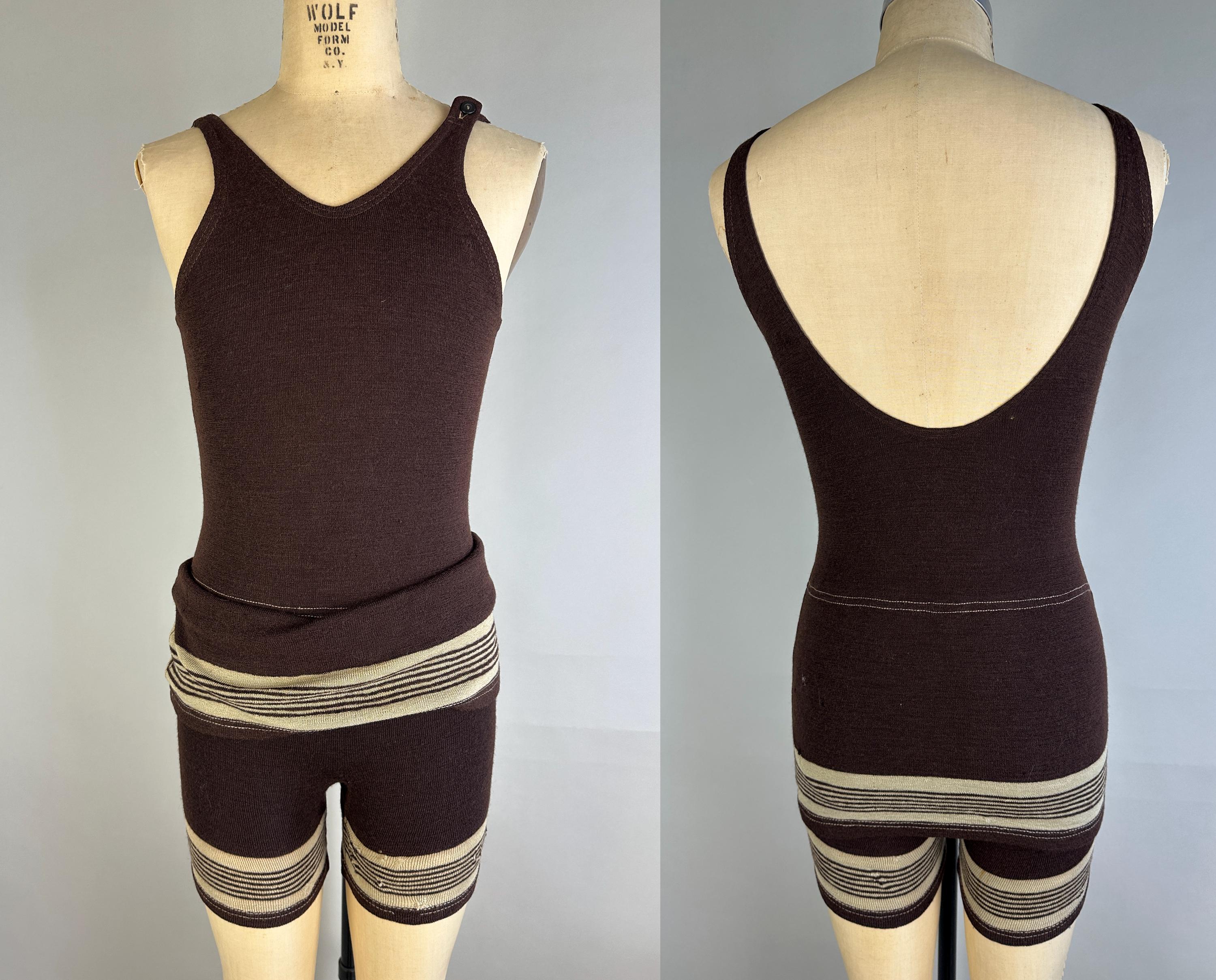 Energize your beachwear game in this 1920’s swimsuit! The coffee bean brown wool features skirted shorts with stripes of cappuccino foam beige on both the legs and skirt. Button fastens over the left shoulder and low dipped back. This swimsuit is in goood vintage condition, visible mends but no holes, stains, nor odors to note.