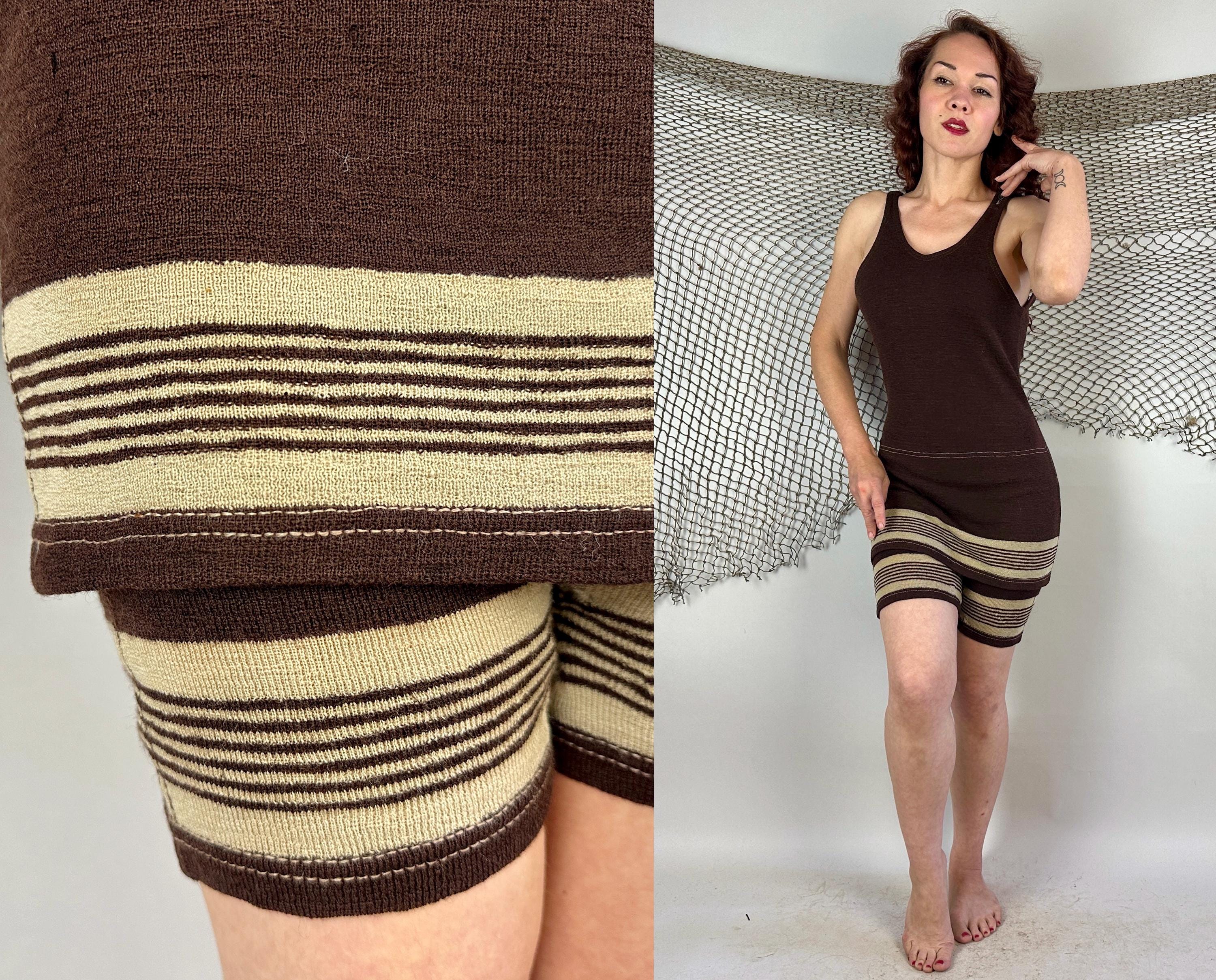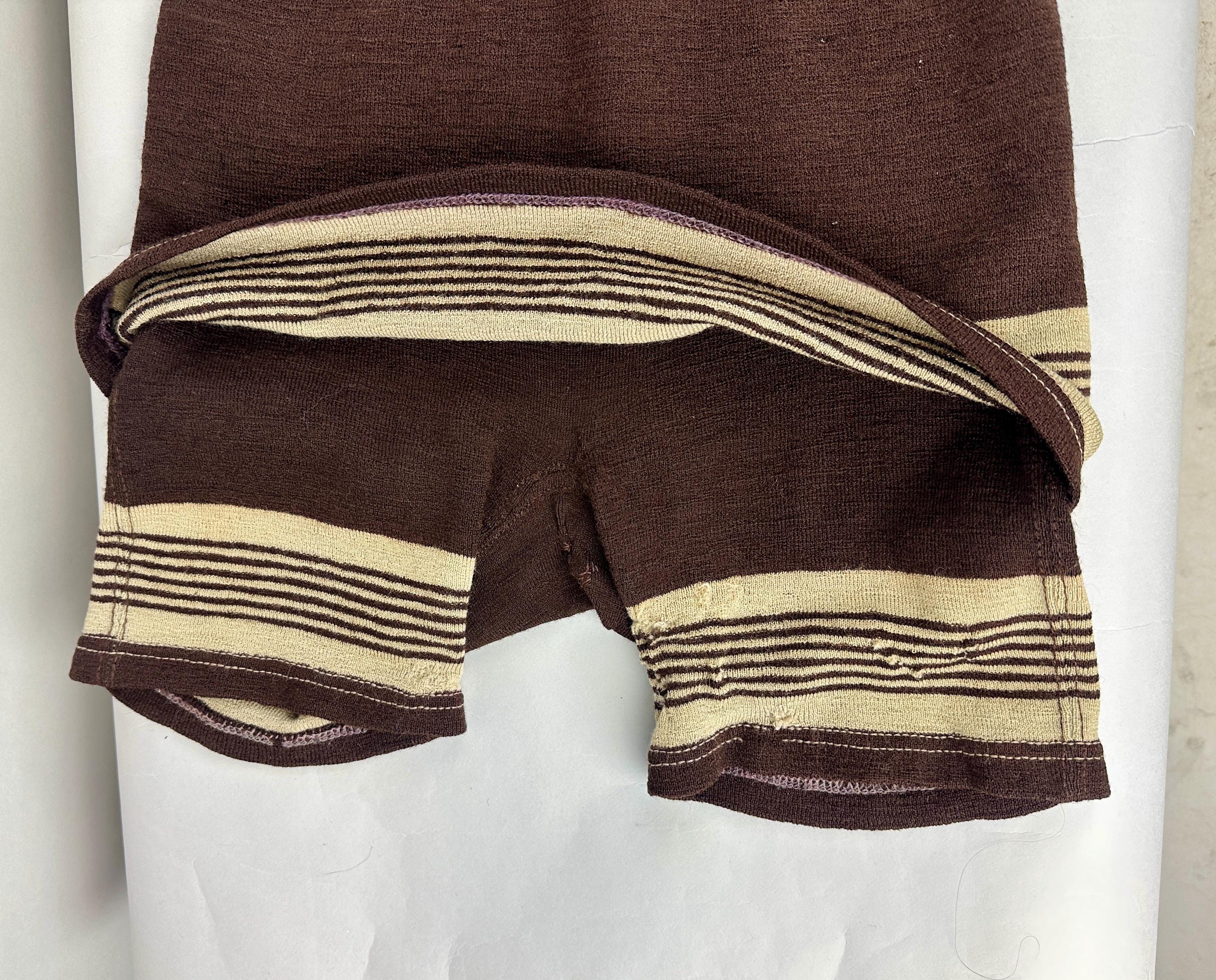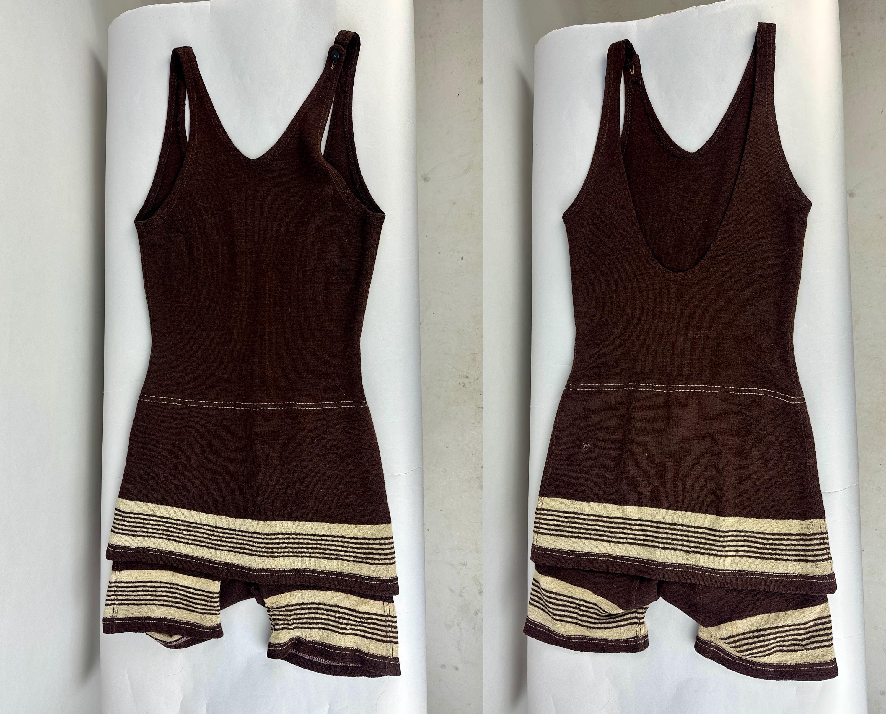 Energize your beachwear game in this 1920’s swimsuit! The coffee bean brown wool features skirted shorts with stripes of cappuccino foam beige on both the legs and skirt. Button fastens over the left shoulder and low dipped back. This swimsuit is in goood vintage condition, visible mends but no holes, stains, nor odors to note.