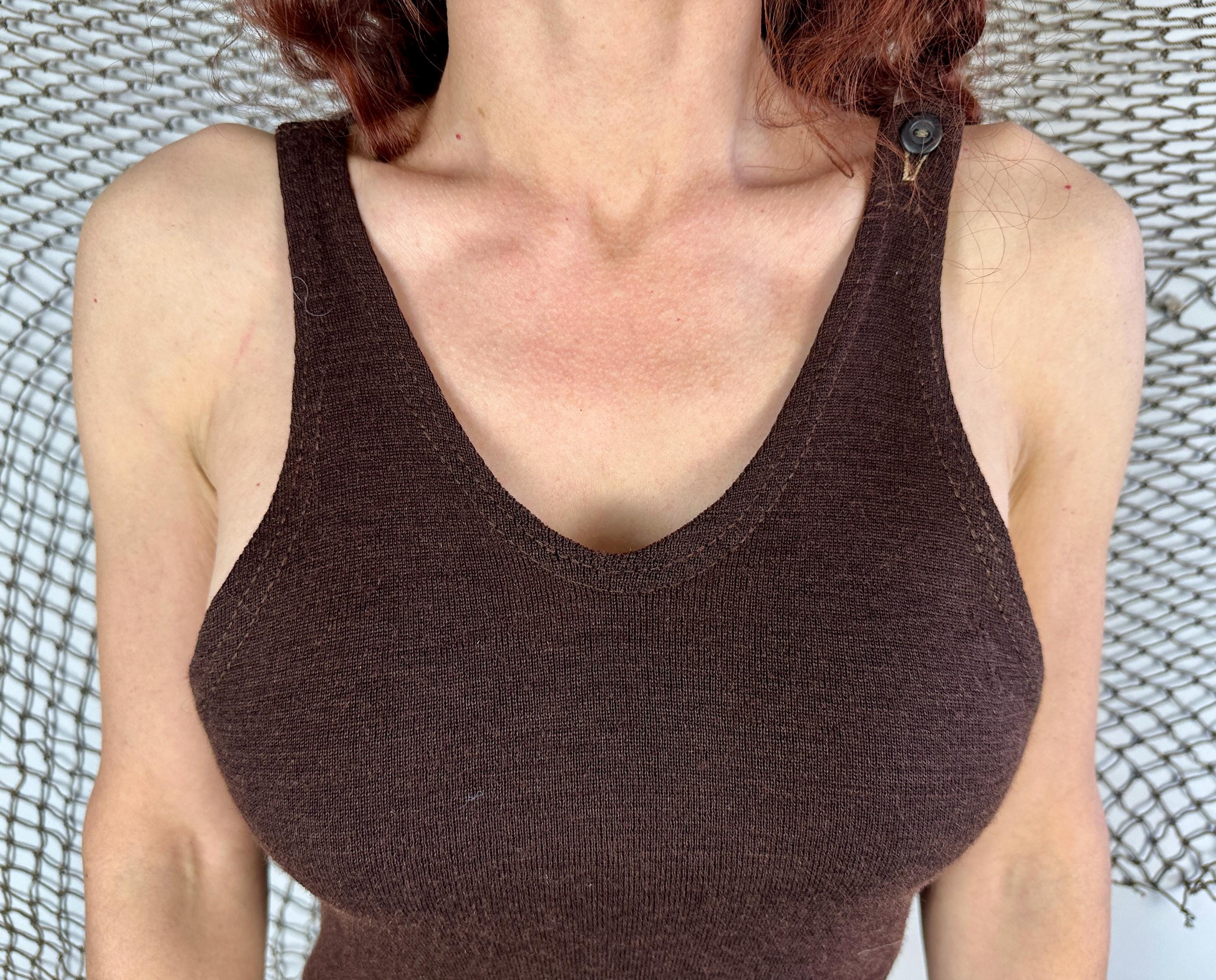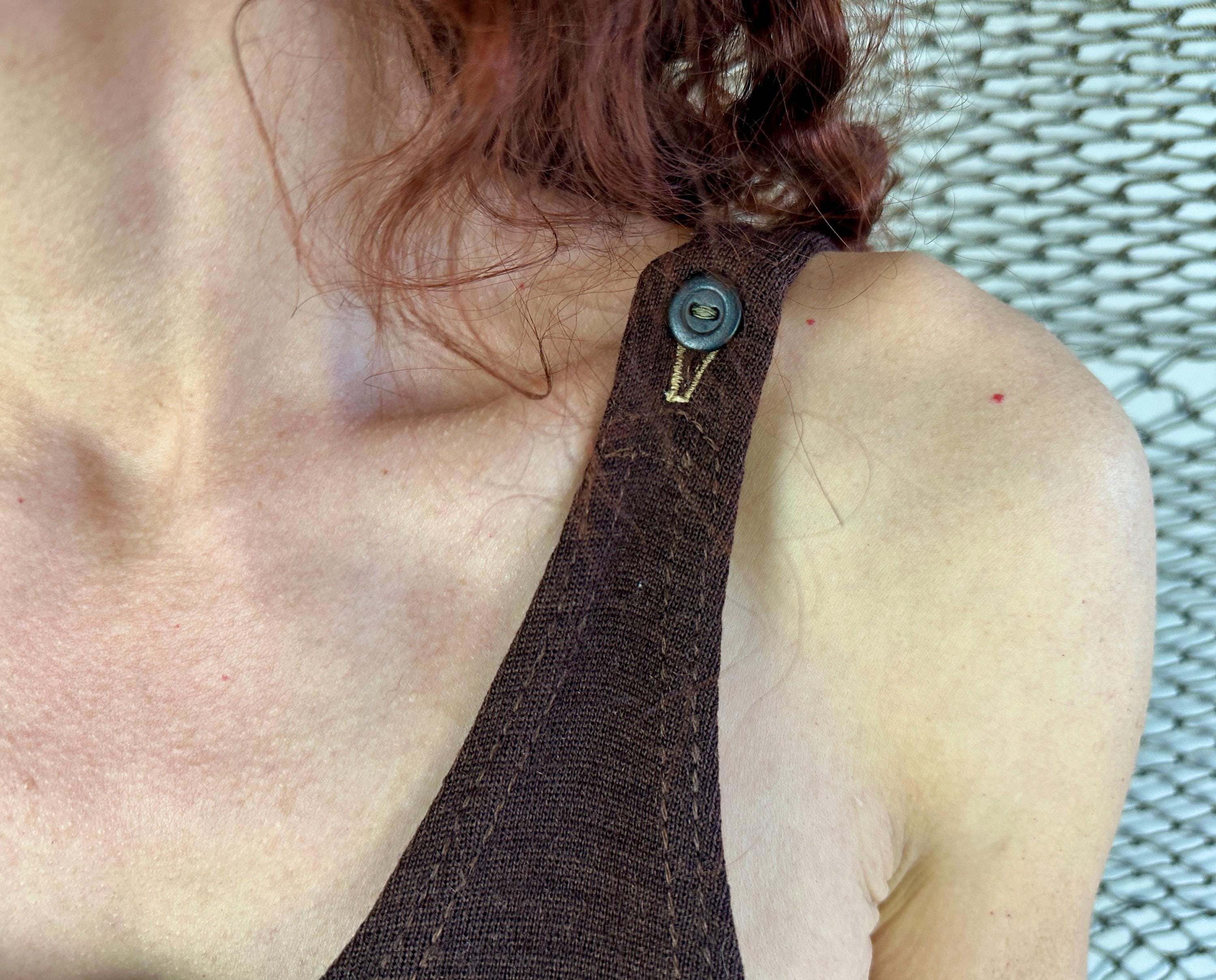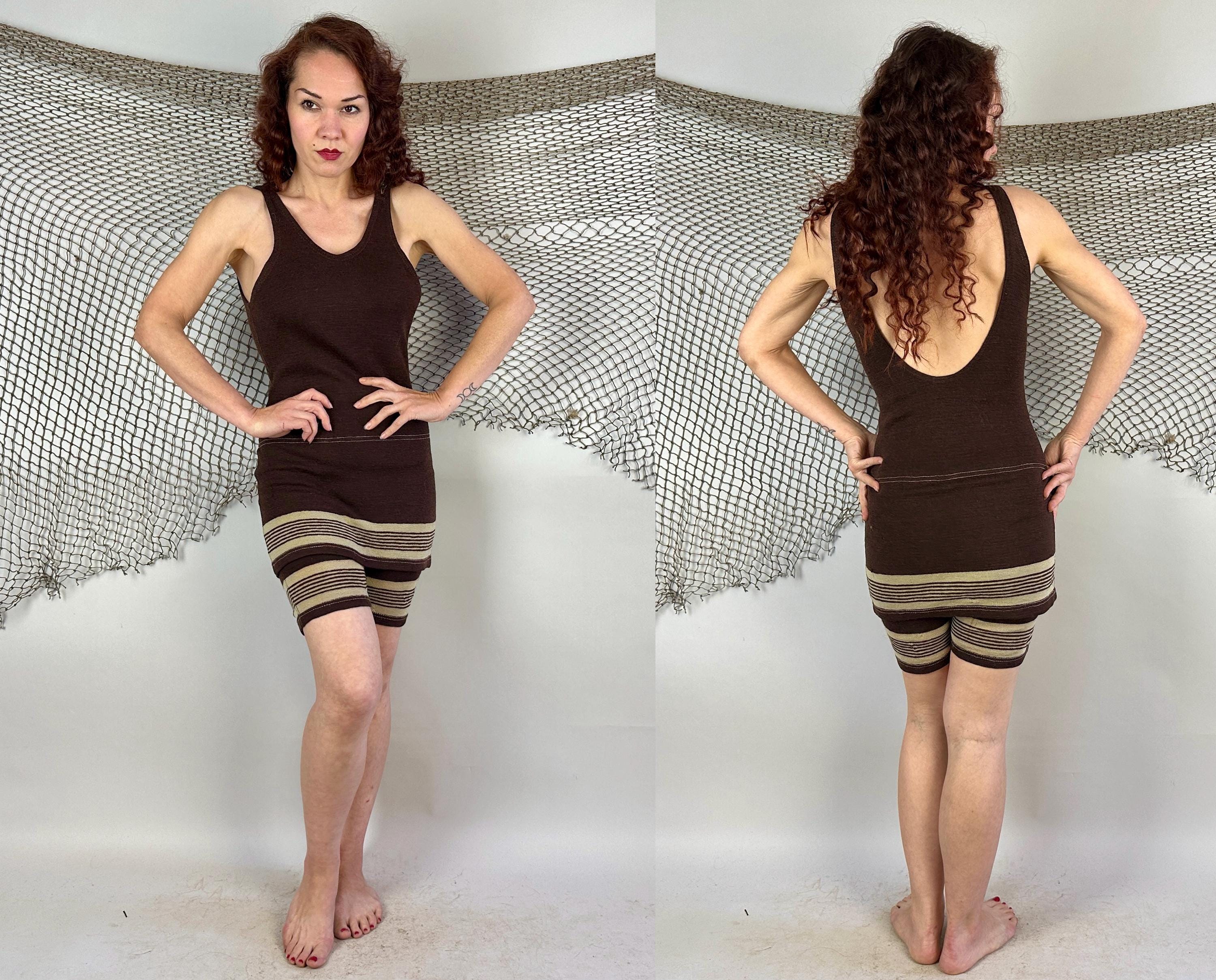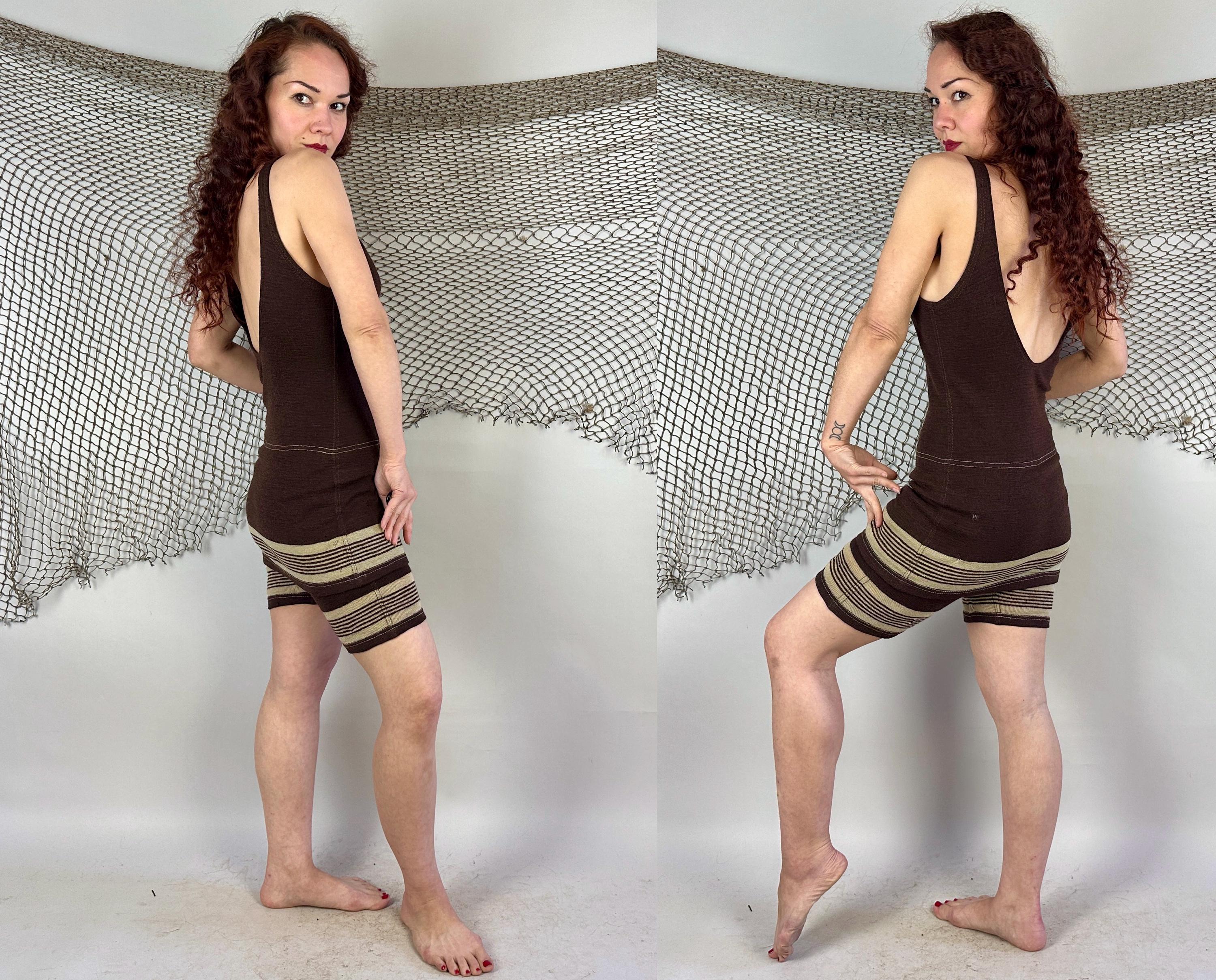 Energize your beachwear game in this 1920’s swimsuit! The coffee bean brown wool features skirted shorts with stripes of cappuccino foam beige on both the legs and skirt. Button fastens over the left shoulder and low dipped back. This swimsuit is in goood vintage condition, visible mends but no holes, stains, nor odors to note.
