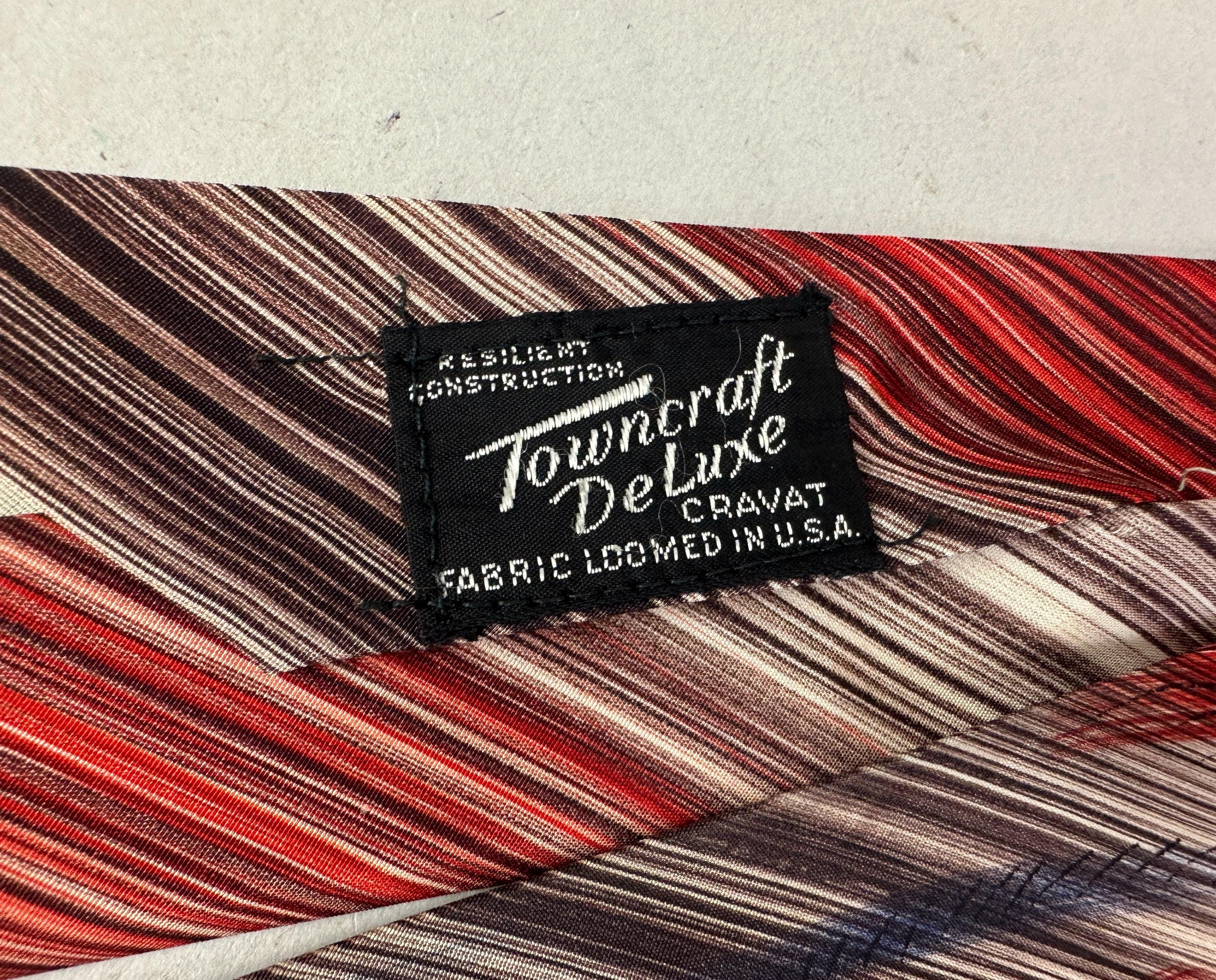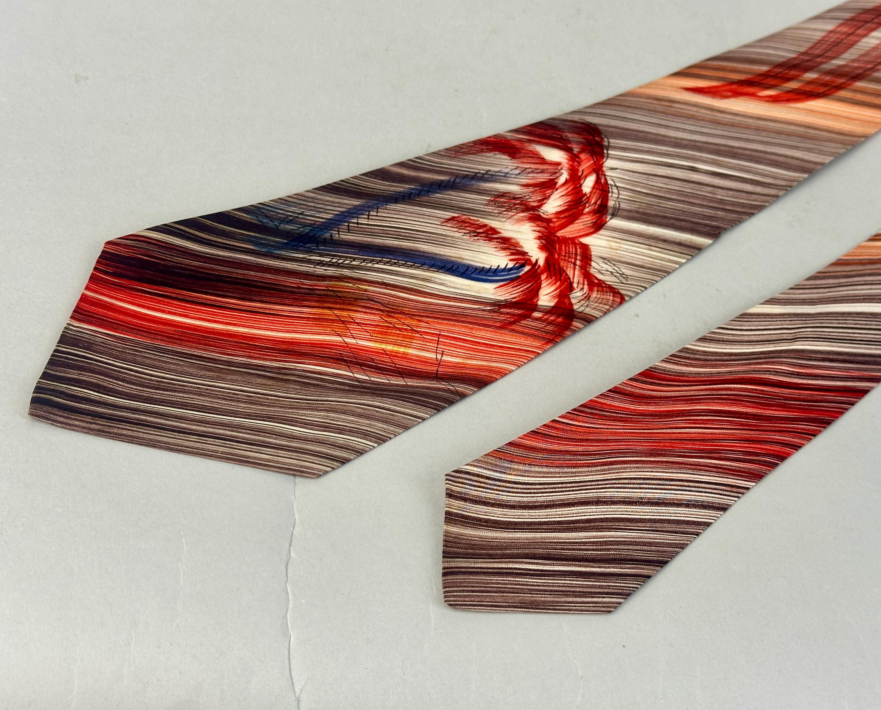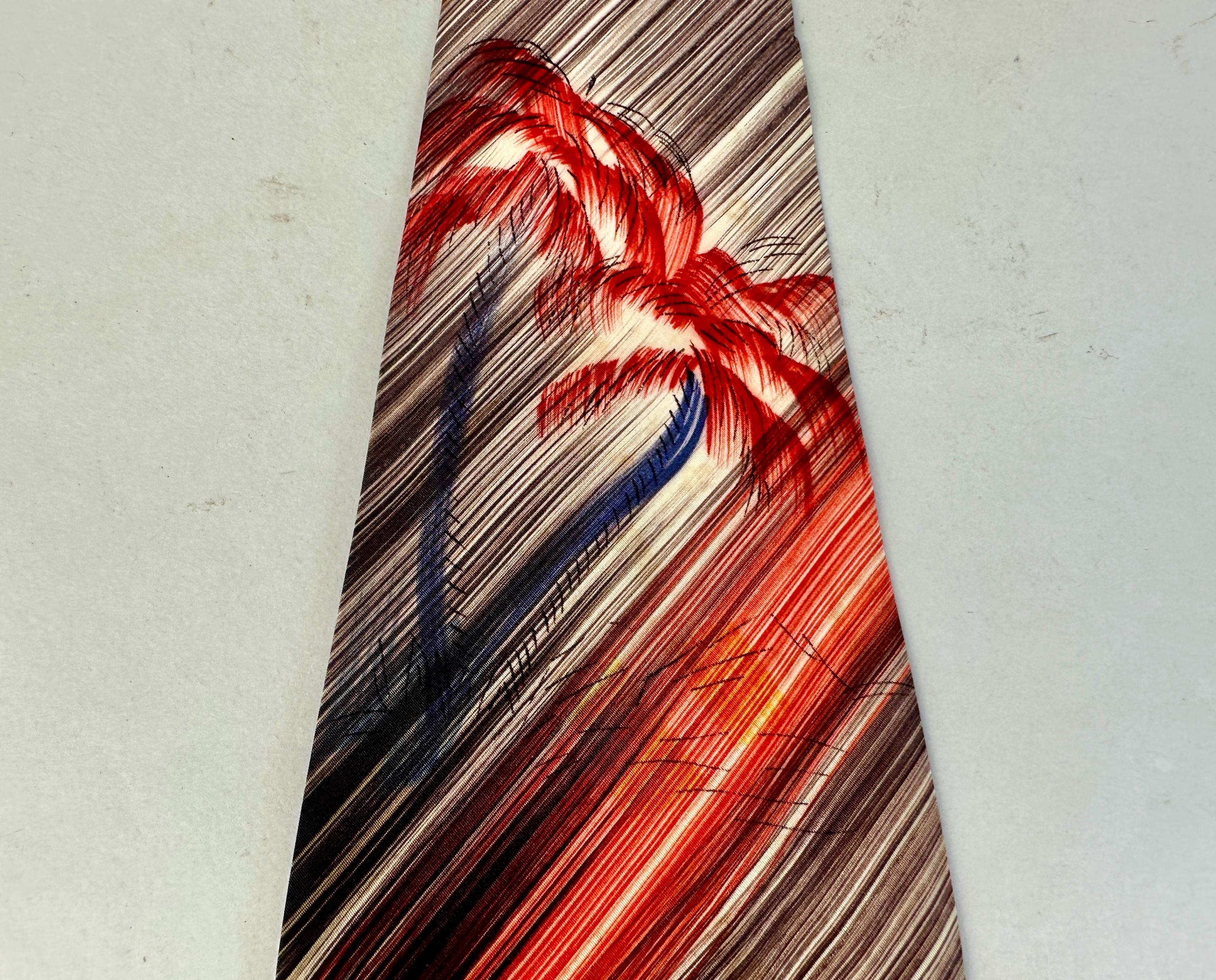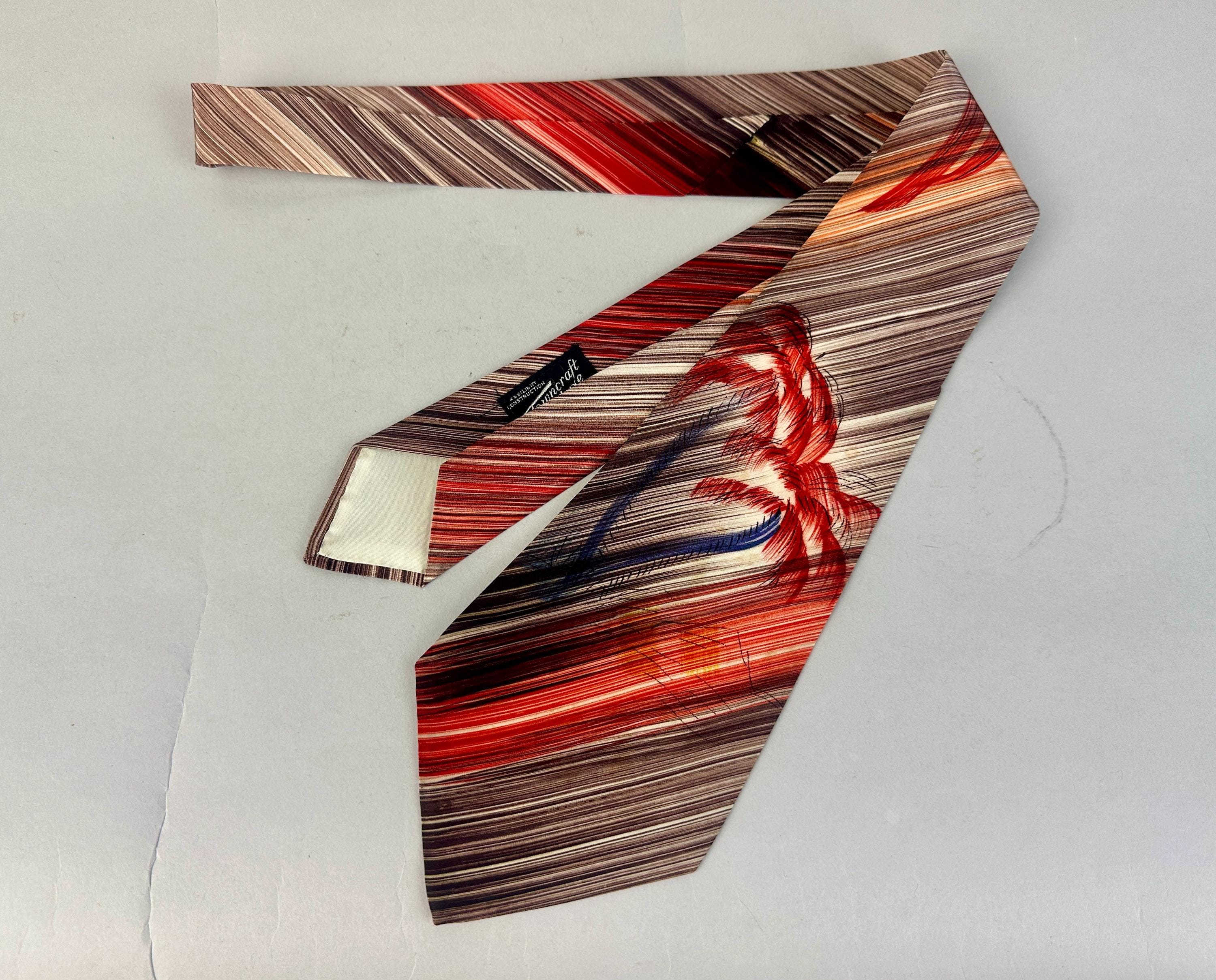 Feel relaxed even in your work attire when you can gaze at palm trees in moody sunrise hues! This wide necktie is rayon and acetate with an artistic print of palm trees accenyted with black pen lines and streaking shades of crimson, tequila sunrise orange, admiral blue, white, and bark brown. Fully lined and labeled "Towncraft DeLuxe". Pairs well with a wide variety of Art Deco and Mid-Century suit colors and fabric types. This tie is in great vintage condition with no flaws found!