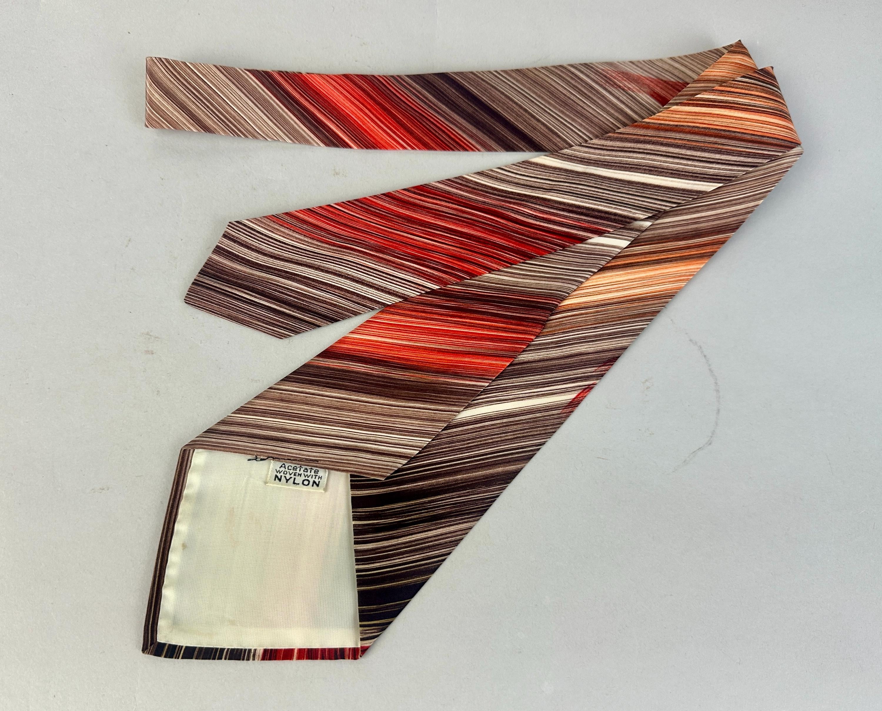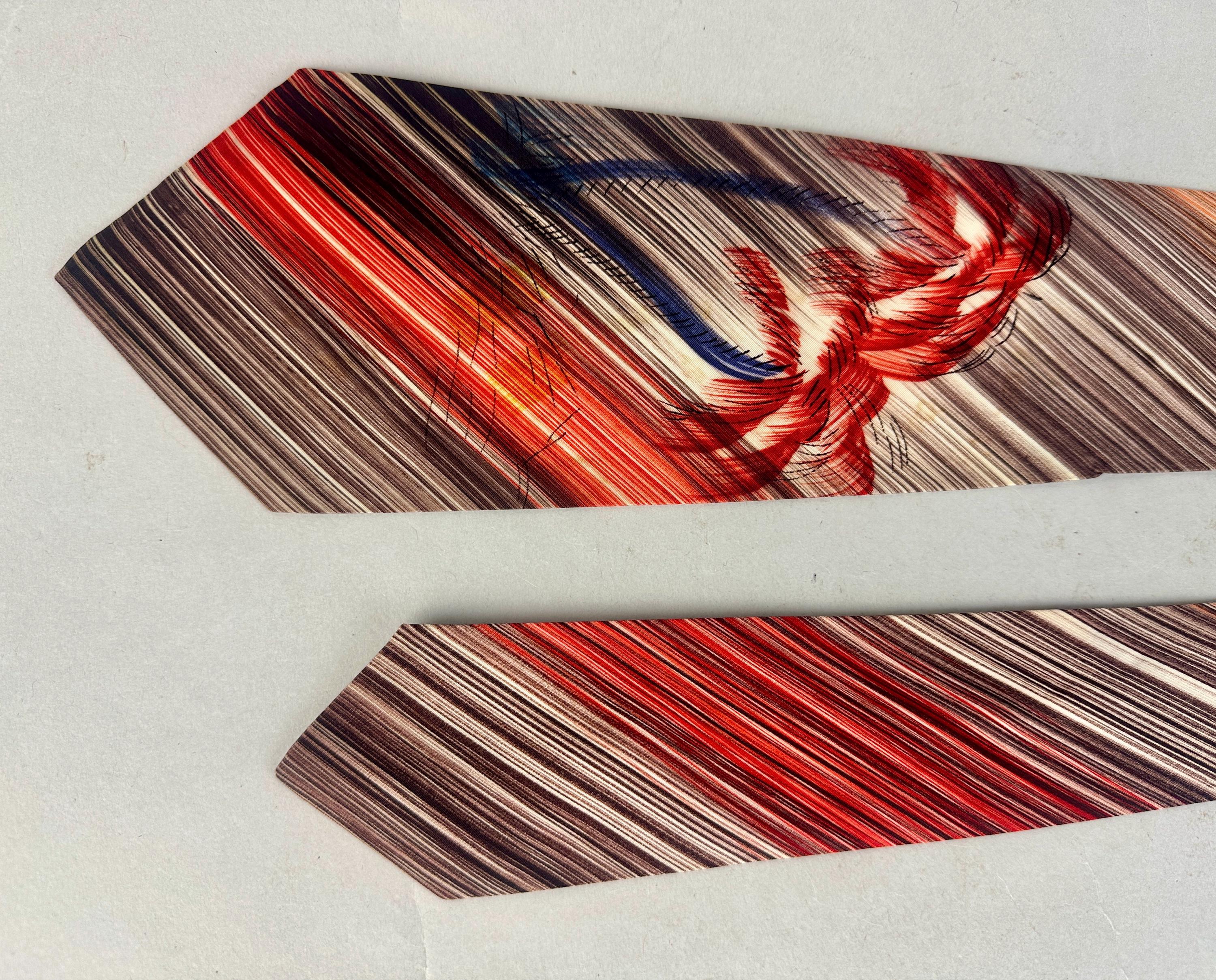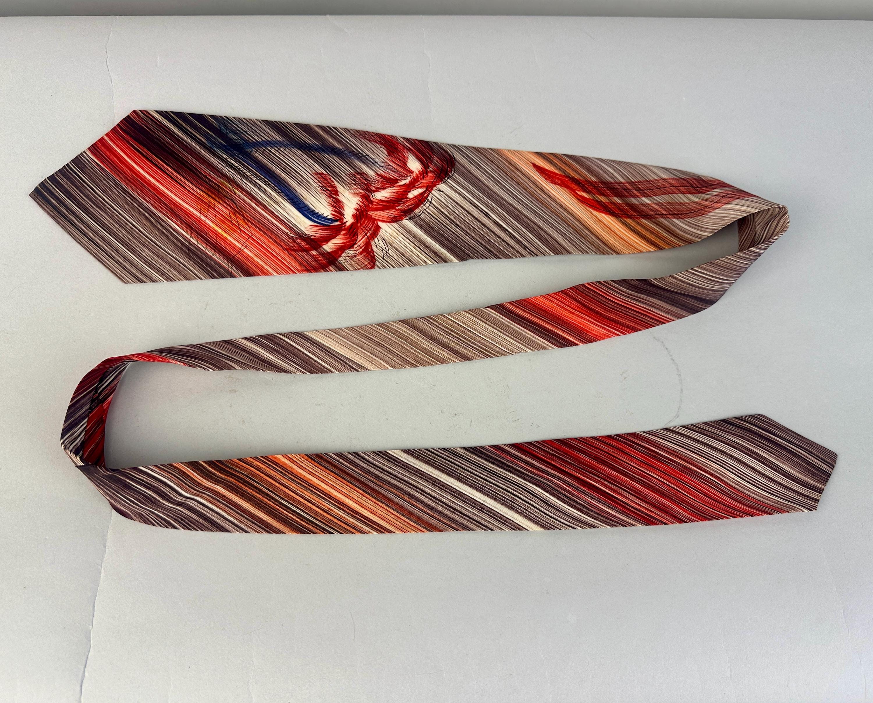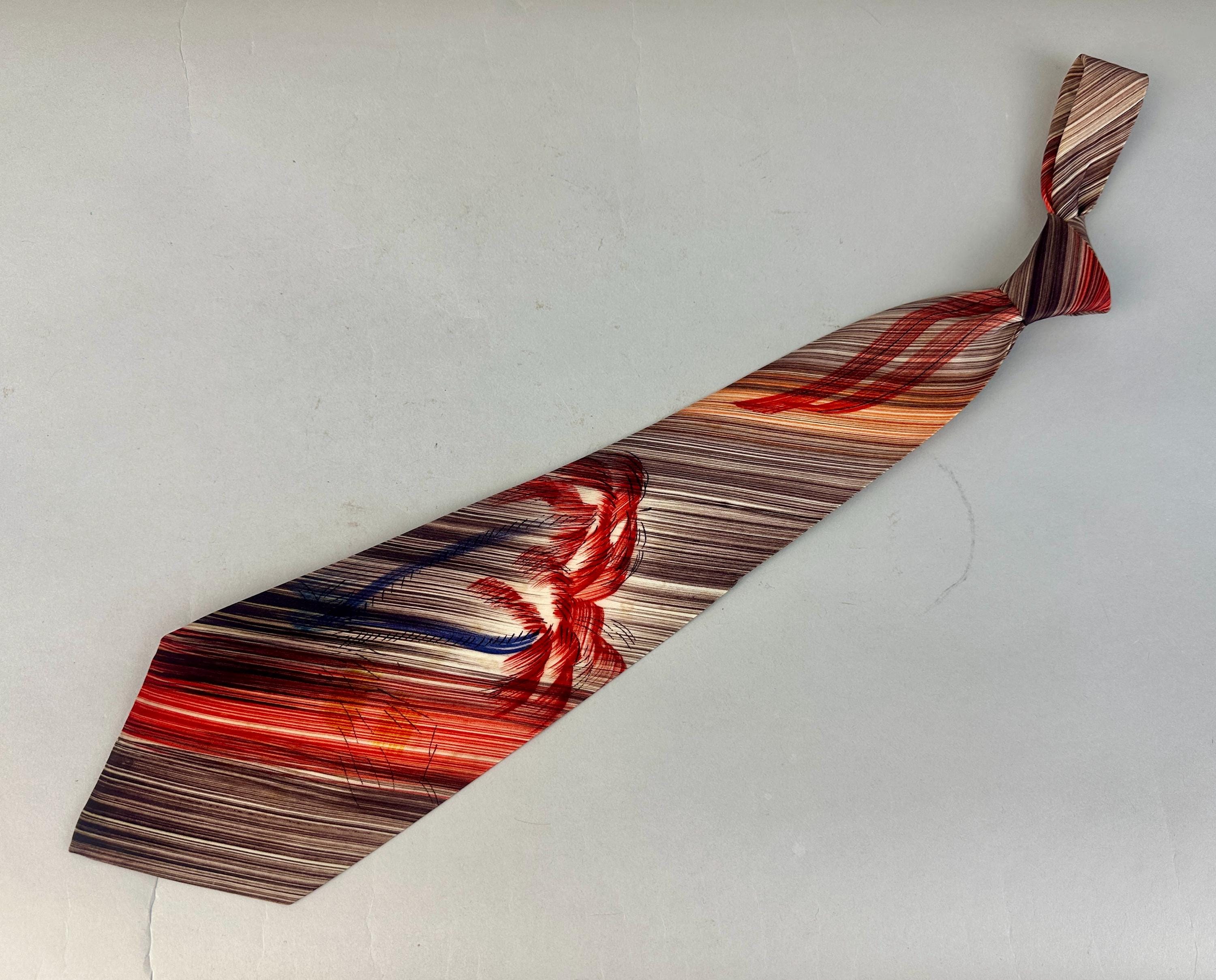 Feel relaxed even in your work attire when you can gaze at palm trees in moody sunrise hues! This wide necktie is rayon and acetate with an artistic print of palm trees accenyted with black pen lines and streaking shades of crimson, tequila sunrise orange, admiral blue, white, and bark brown. Fully lined and labeled "Towncraft DeLuxe". Pairs well with a wide variety of Art Deco and Mid-Century suit colors and fabric types. This tie is in great vintage condition with no flaws found!